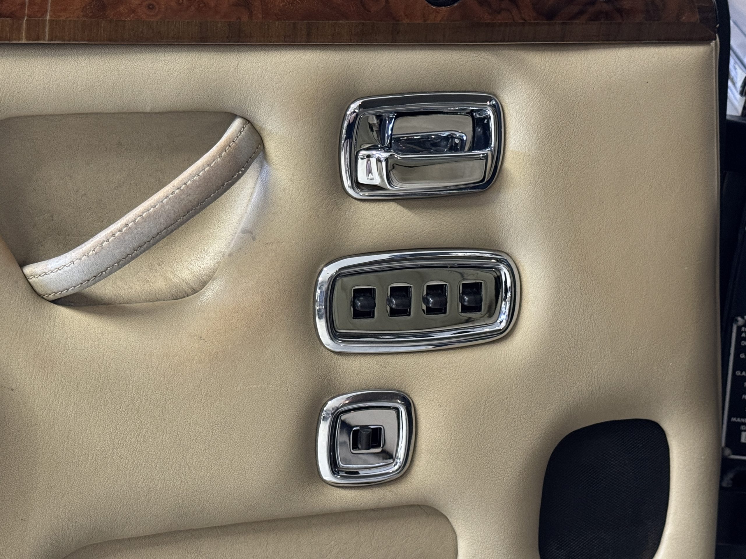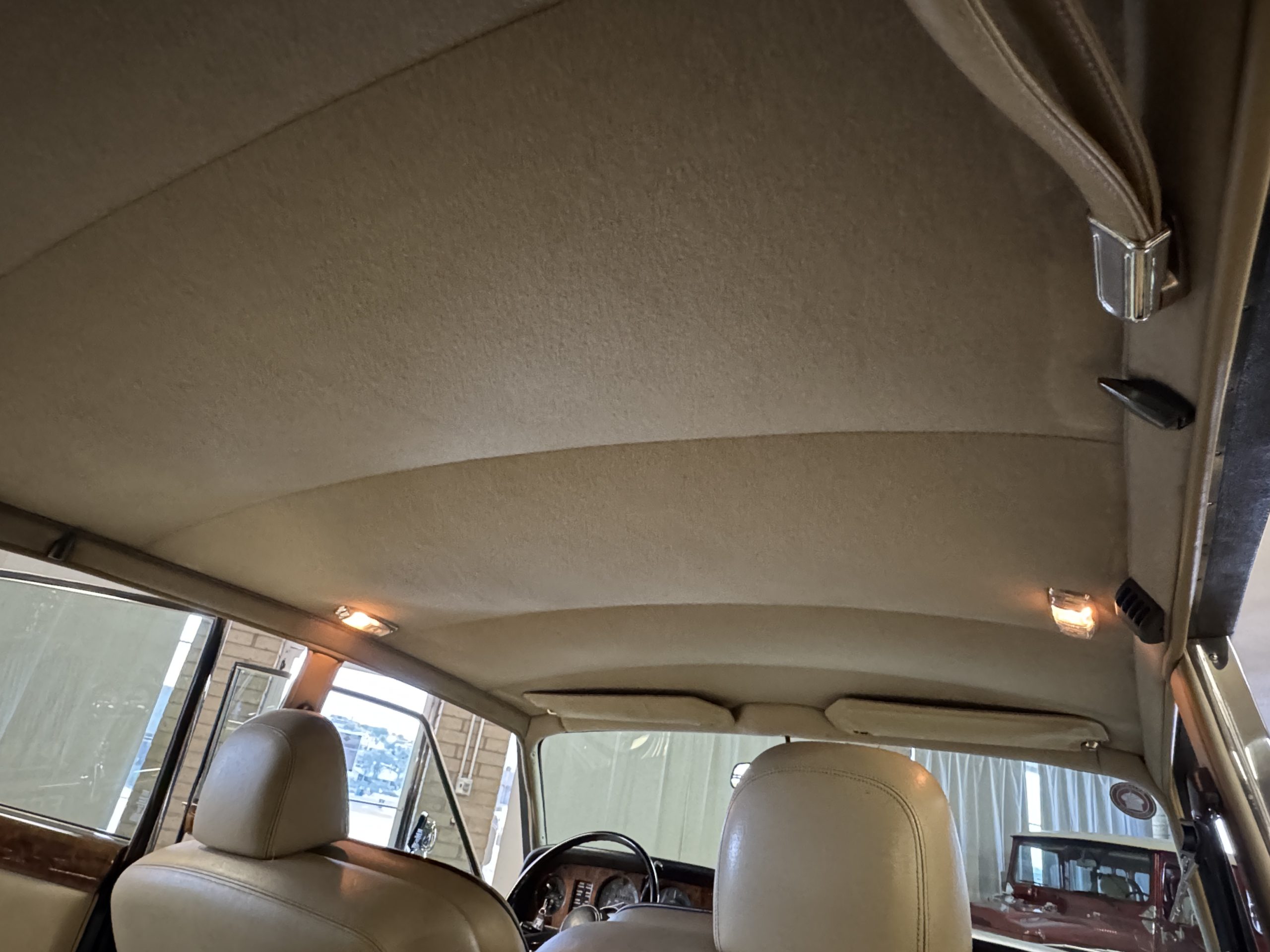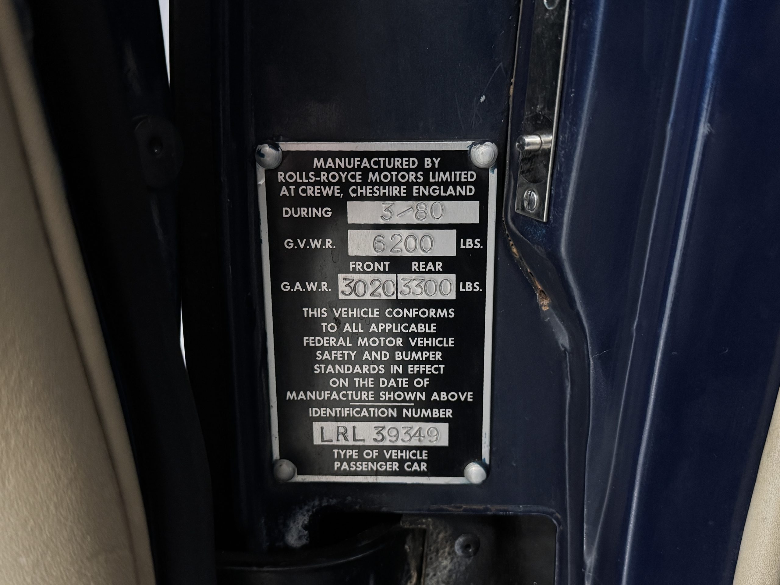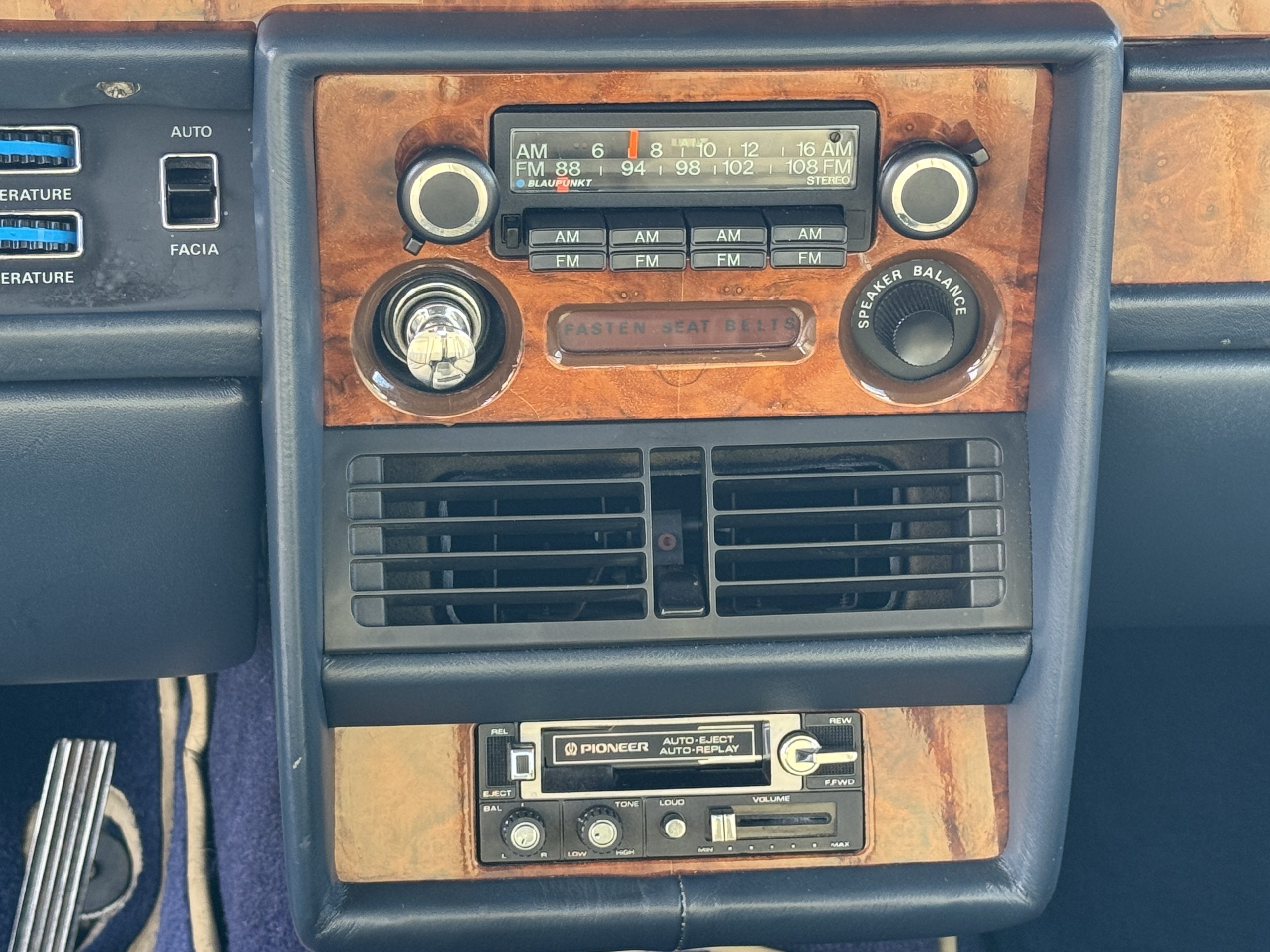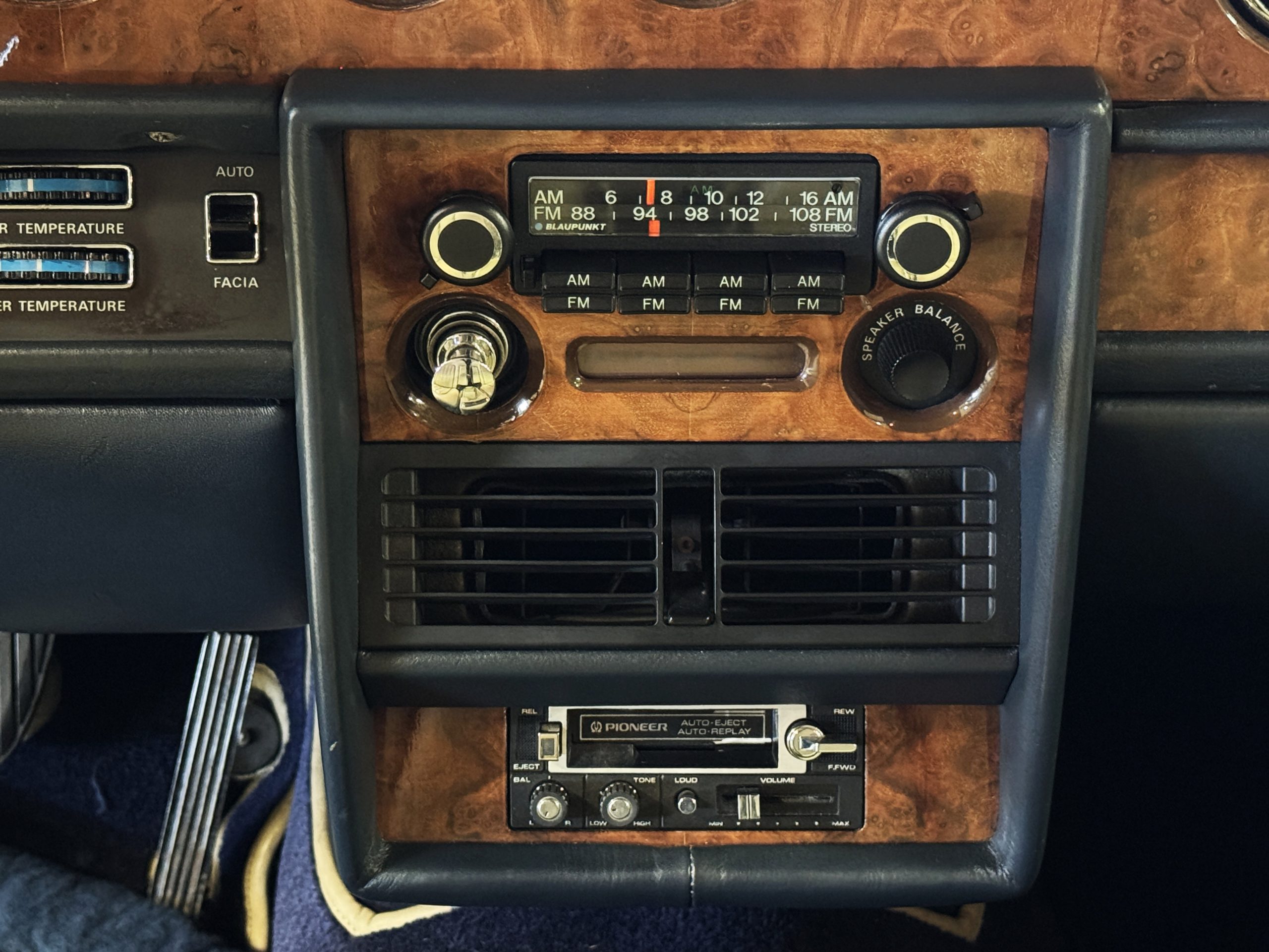 Inside, the Rolls-Royce presents the serene luxury expected of the brand. The cabin features original Beige Connolly hides with Dark Blue piping accents, showing gentle creasing consistent with age, complemented by beautifully preserved rich Lombardy walnut veneers. The Wilton wool carpeting and Dark Blue Mouton lambswool overlays remain in very good condition, reflecting careful ownership. The hides display the rich depth and texture typical of Connolly Vaumol leather with Luxan Grain, a natural, hand-rubbed finish that gives the leather its subtle burnished tones. Soft, supple, and well-preserved, the leather presents with just the slightest, correct patina. Every surface reflects the care of its owners, and the quality craftsmanship Rolls-Royce is known for. Interior amenities include dual-zone automatic climate control with functioning cold air conditioning, a Blaupunkt AM/FM stereo with Pioneer cassette deck, power locks and cruise control. Overall, the interior remains a warm, inviting environment that reflects both craftsmanship and comfort.