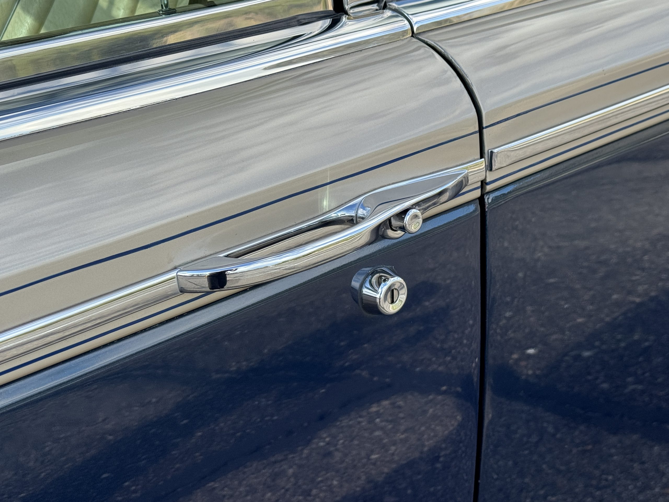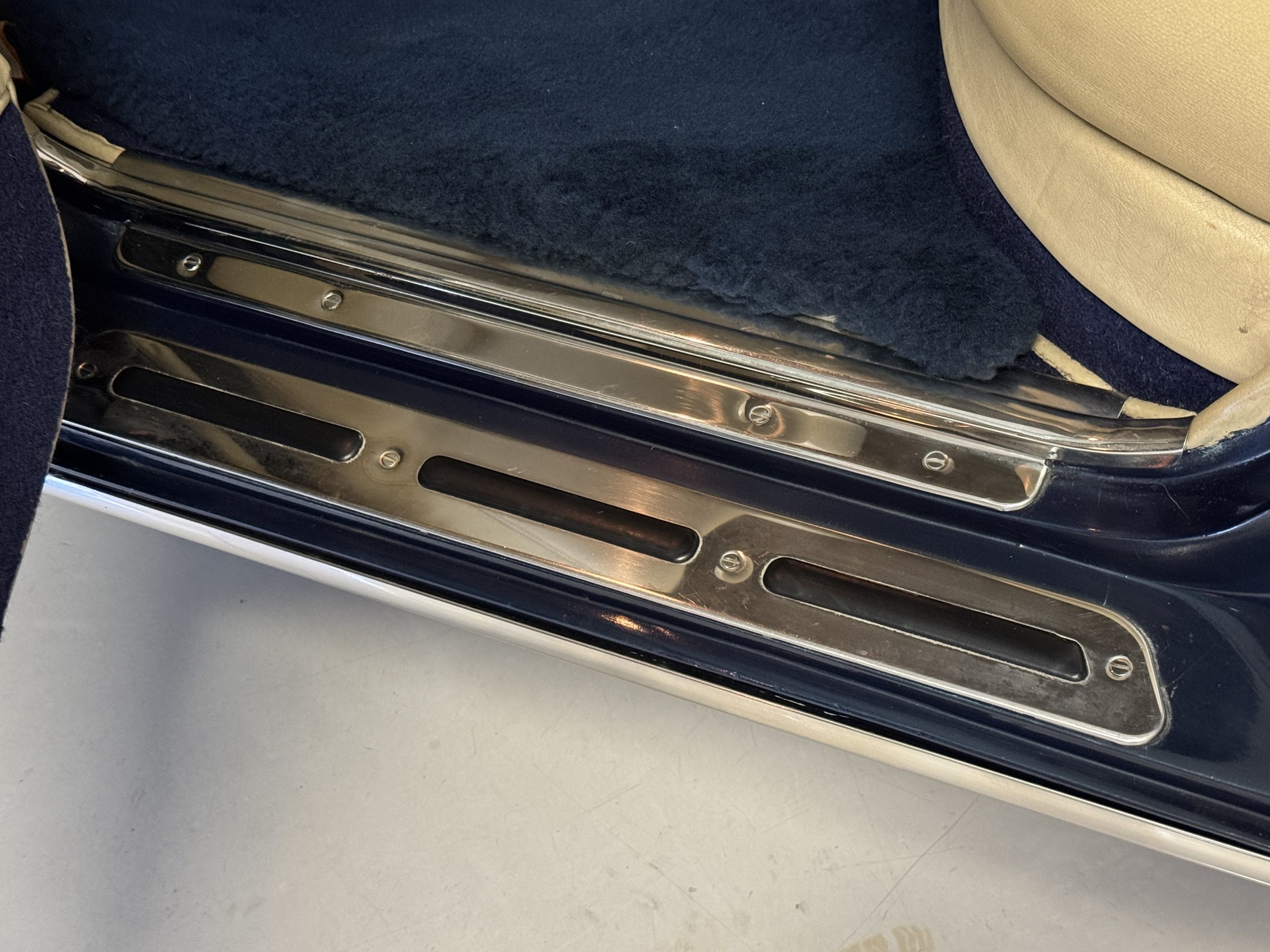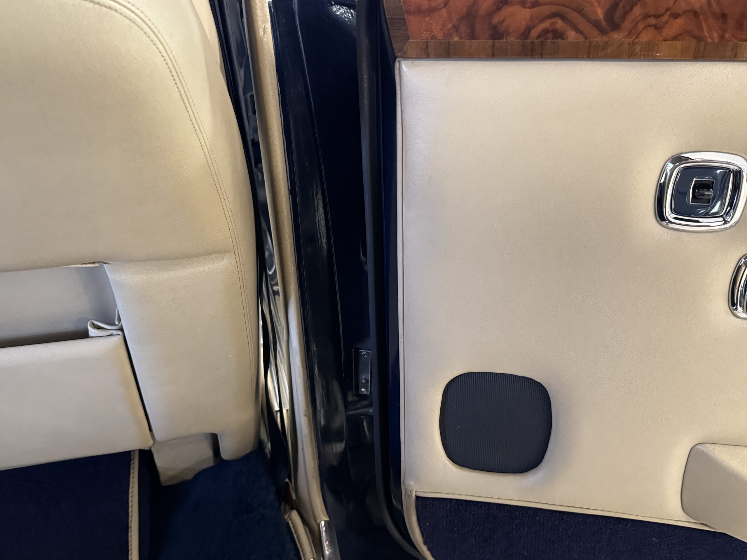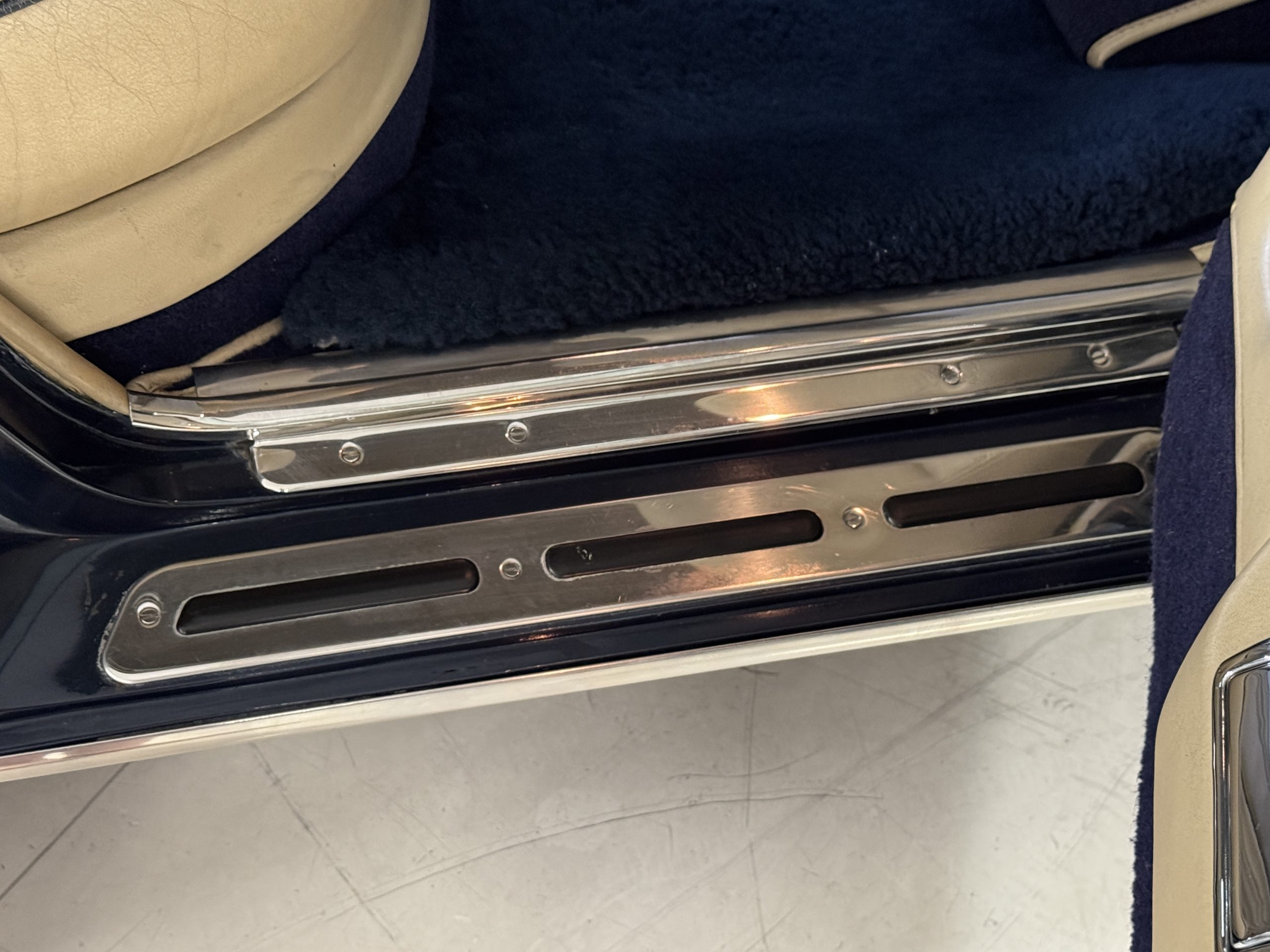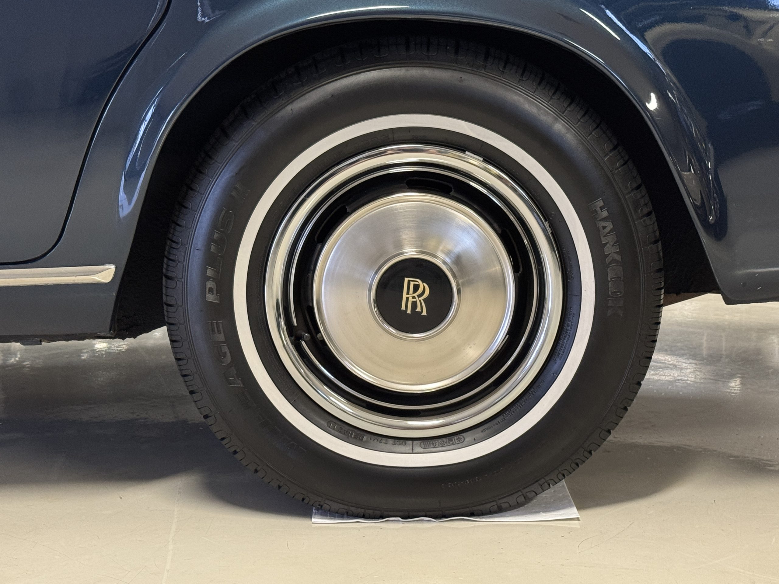 The exterior of the Rolls-Royce Silver Wraith II is two-toned, with Silver Sand upper panels and Athenian Blue lower sections. The paint retains a deep luster, displaying only minimal signs of age such as minor crackling and small touch-up spots. The coordinating Dark Blue Everflex roof is in excellent condition, and fine Royal Blue pinstriping accentuates the coachbuilt contours. The hand-polished brightwork and signature Flying Lady mascot underscore the car’s commanding presence. The coachwork remains impressively straight and the distinctive long-wheelbase proportions are seamlessly integrated, preserving the design balance while adding four inches to rear-seat legroom.