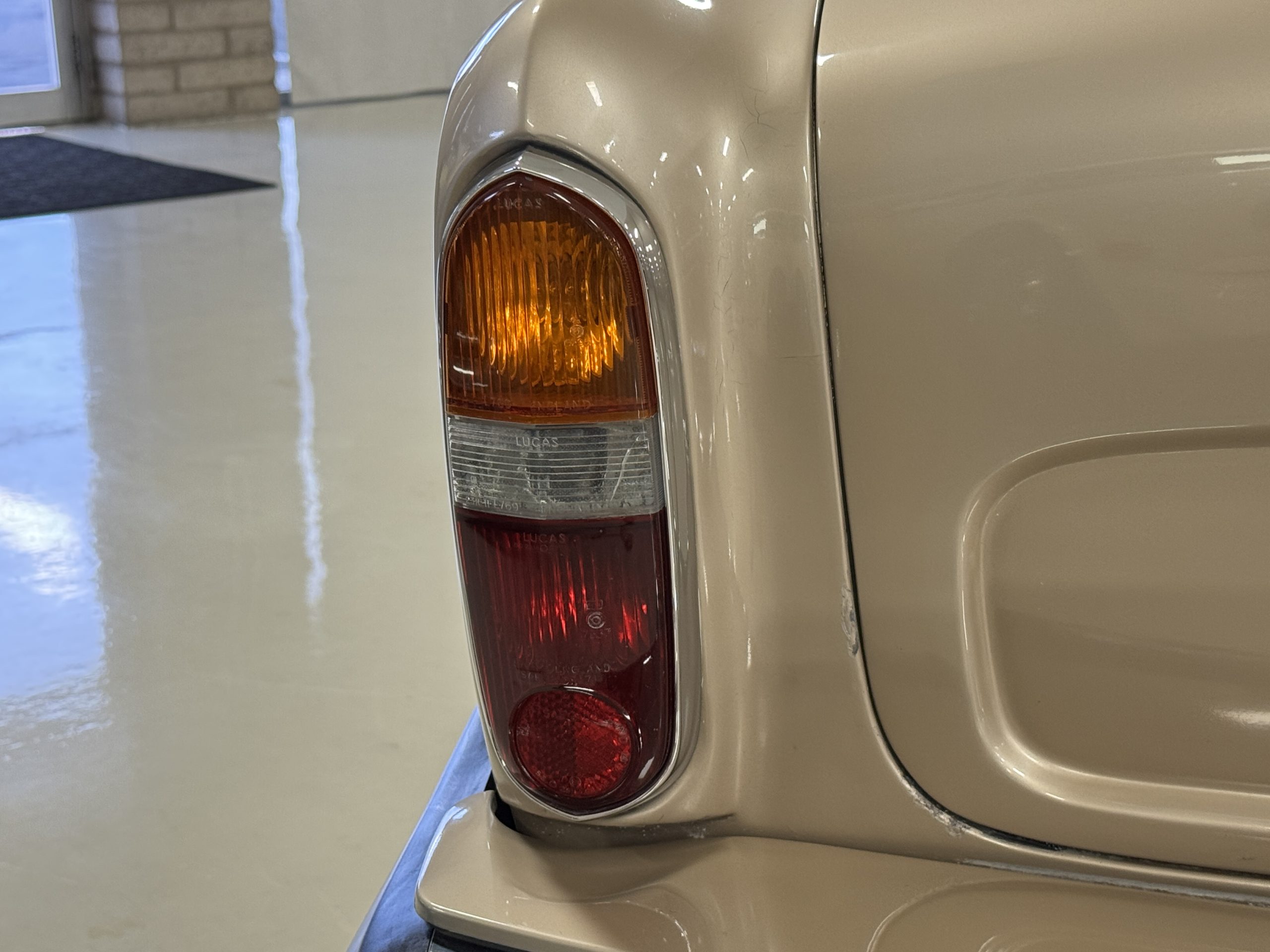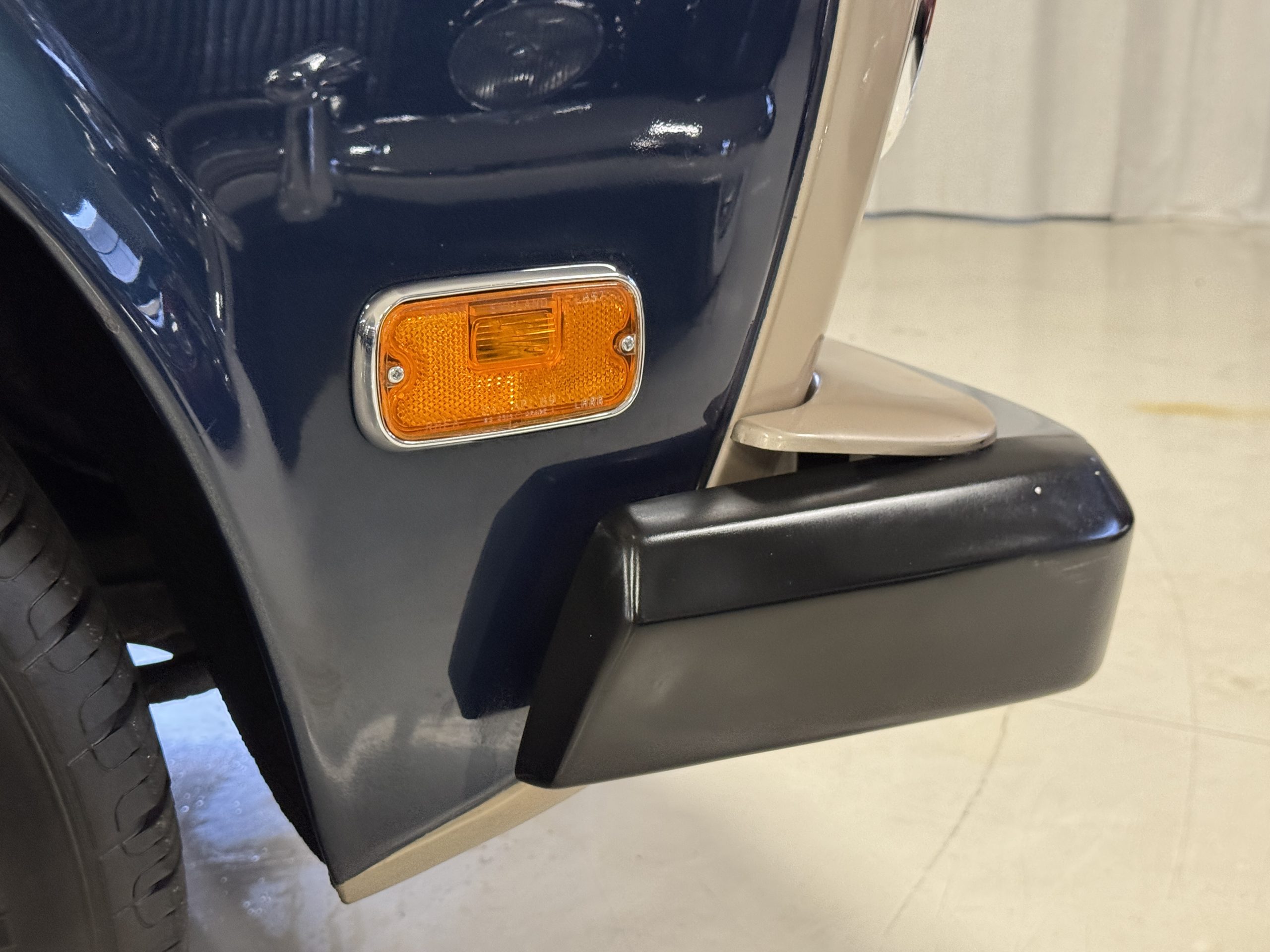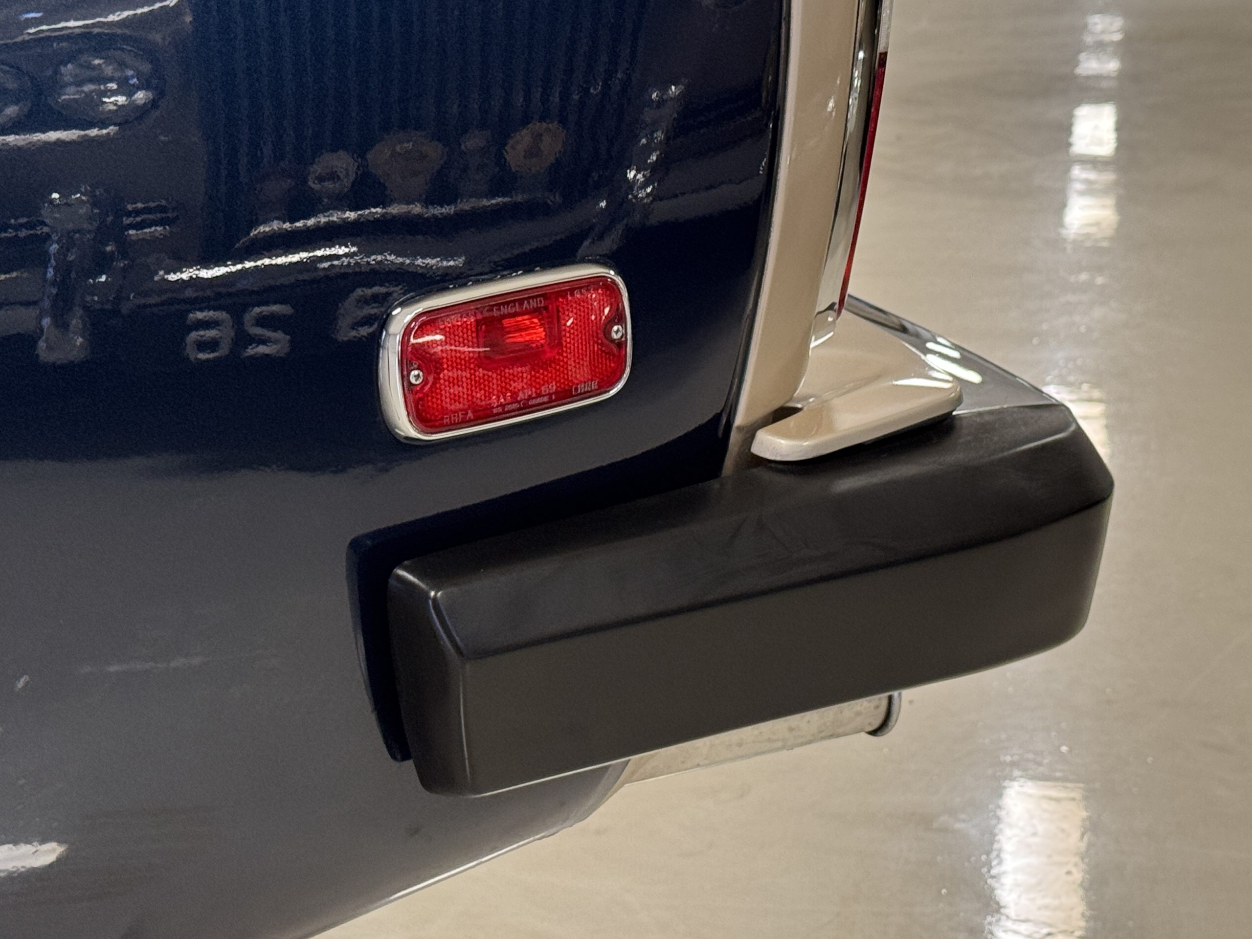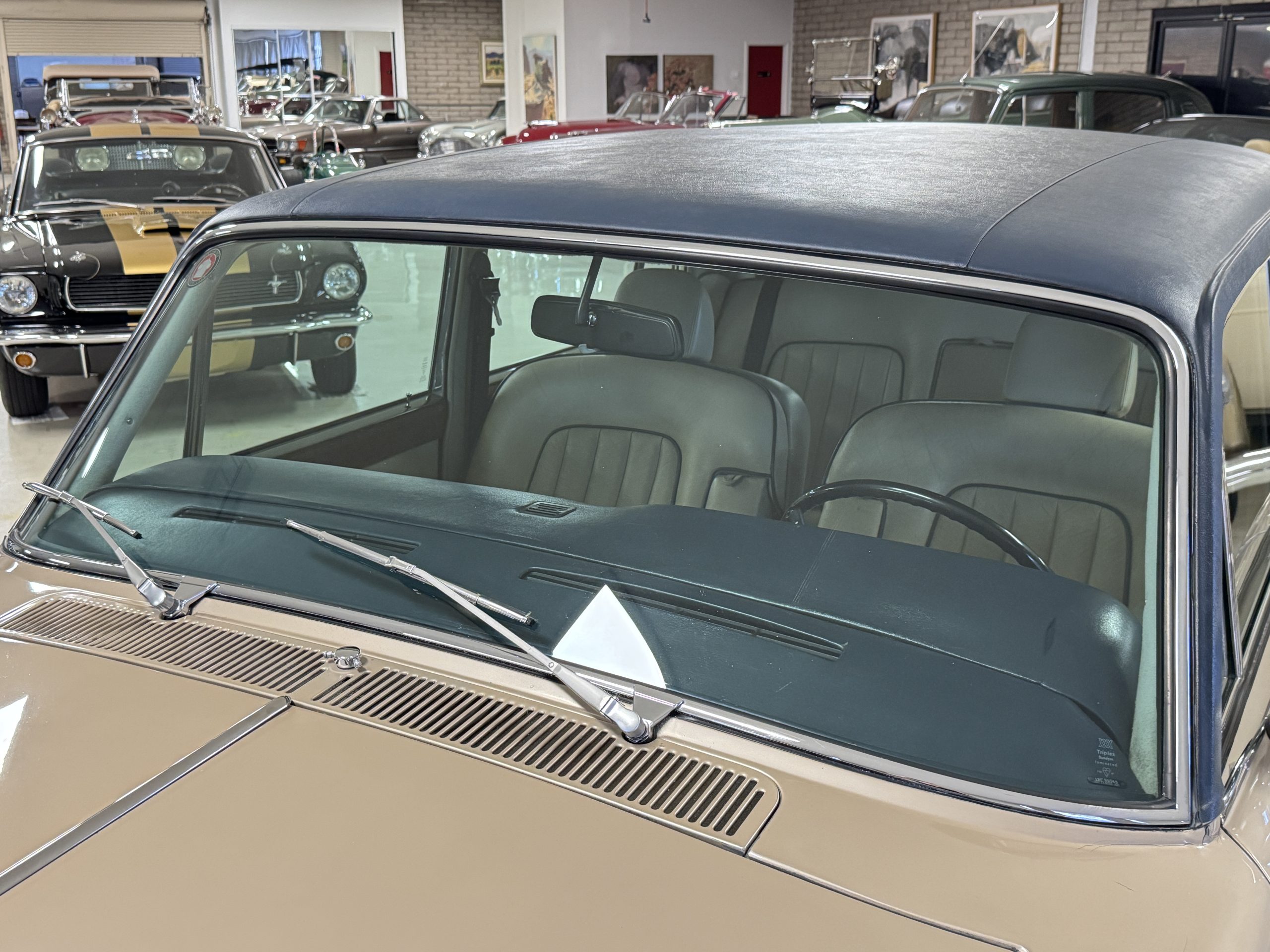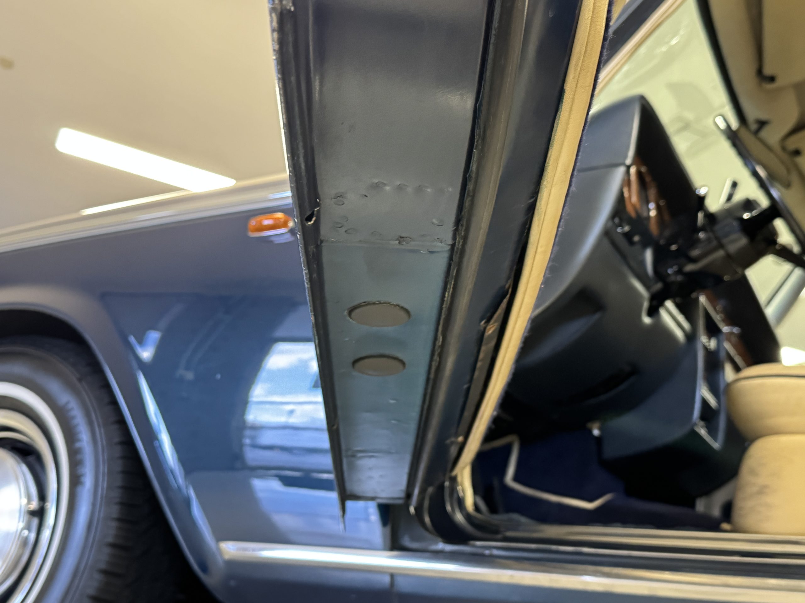 The exterior of the Rolls-Royce Silver Wraith II is two-toned, with Silver Sand upper panels and Athenian Blue lower sections. The paint retains a deep luster, displaying only minimal signs of age such as minor crackling and small touch-up spots. The coordinating Dark Blue Everflex roof is in excellent condition, and fine Royal Blue pinstriping accentuates the coachbuilt contours. The hand-polished brightwork and signature Flying Lady mascot underscore the car’s commanding presence. The coachwork remains impressively straight and the distinctive long-wheelbase proportions are seamlessly integrated, preserving the design balance while adding four inches to rear-seat legroom.