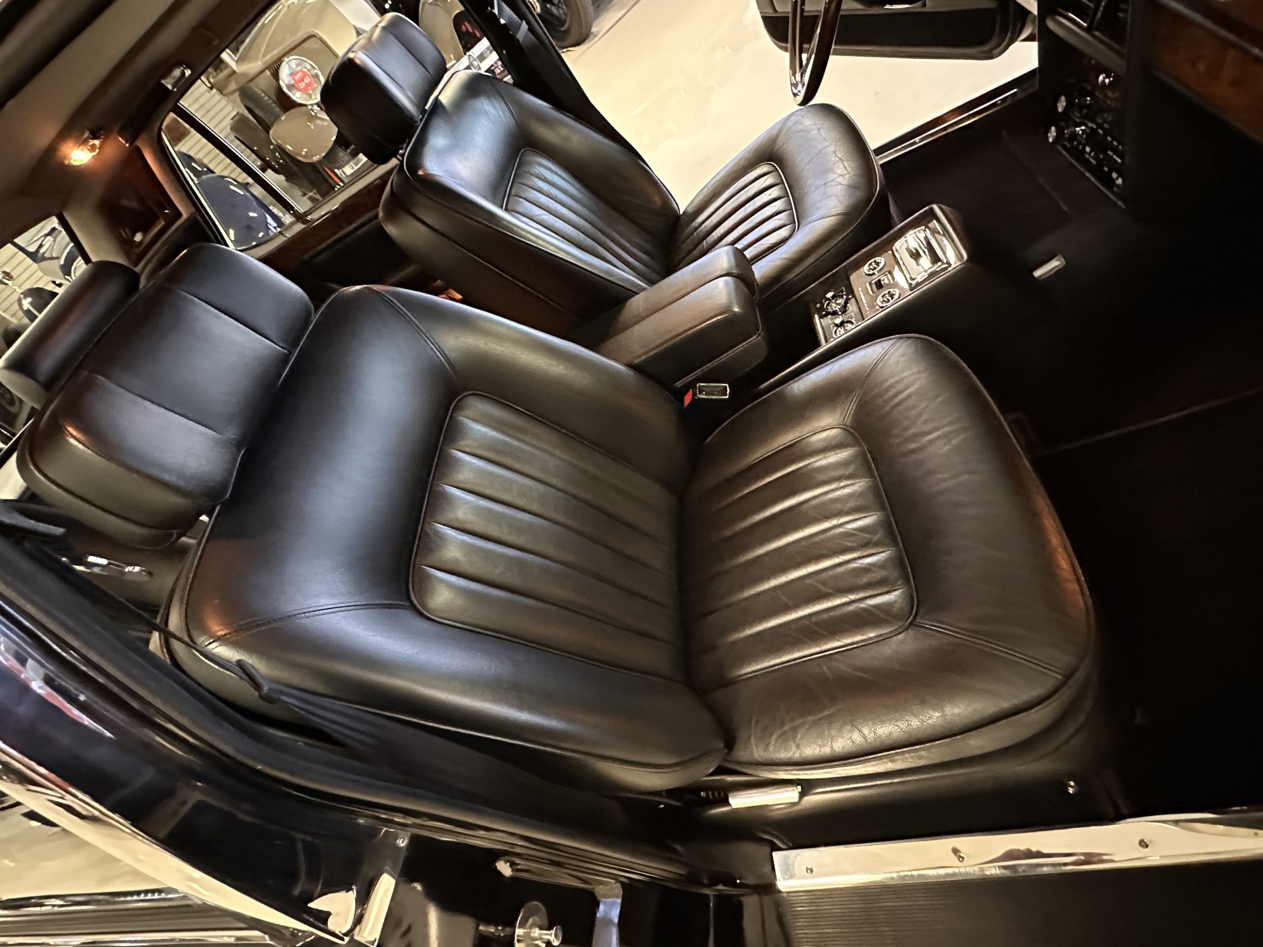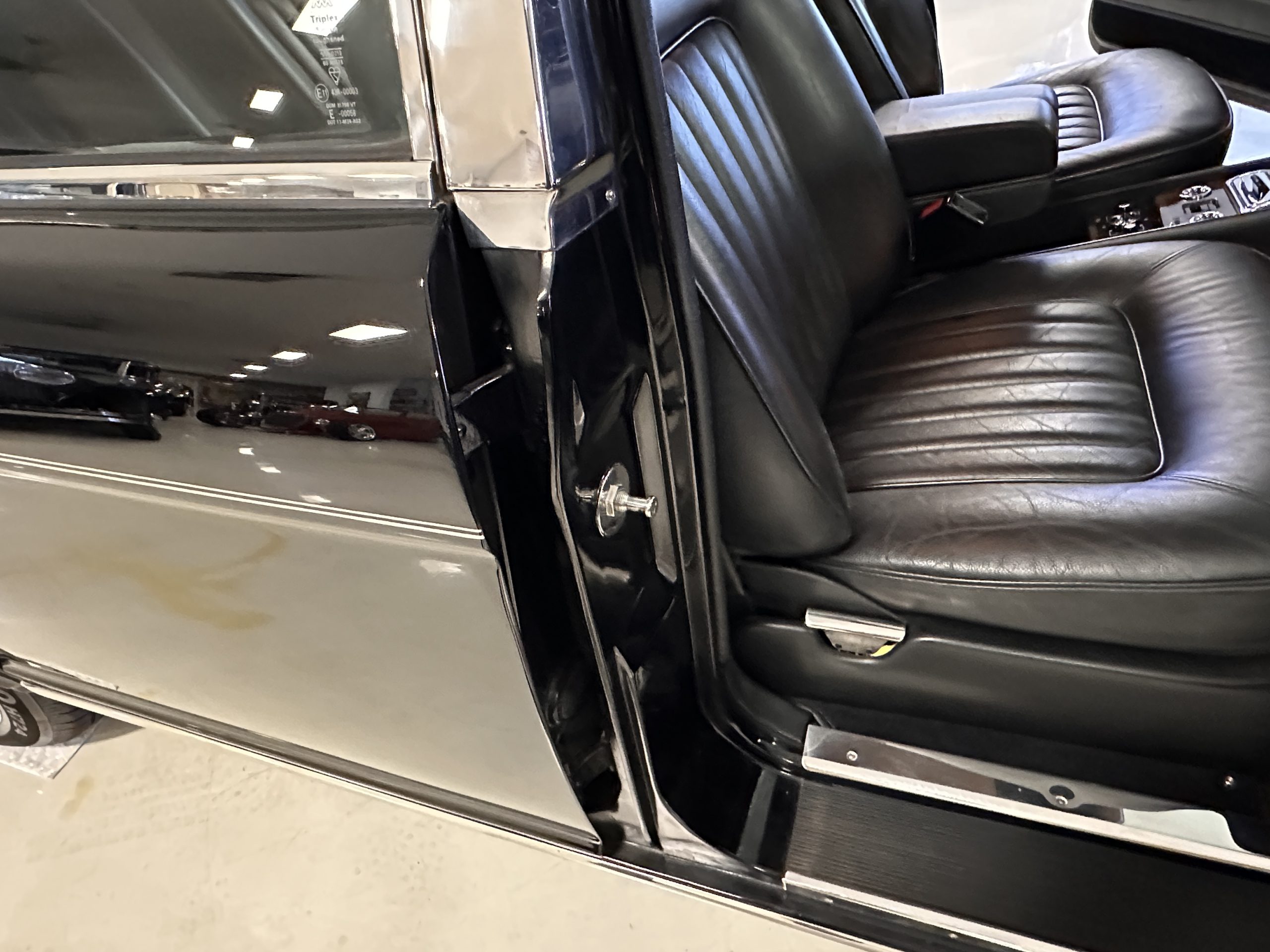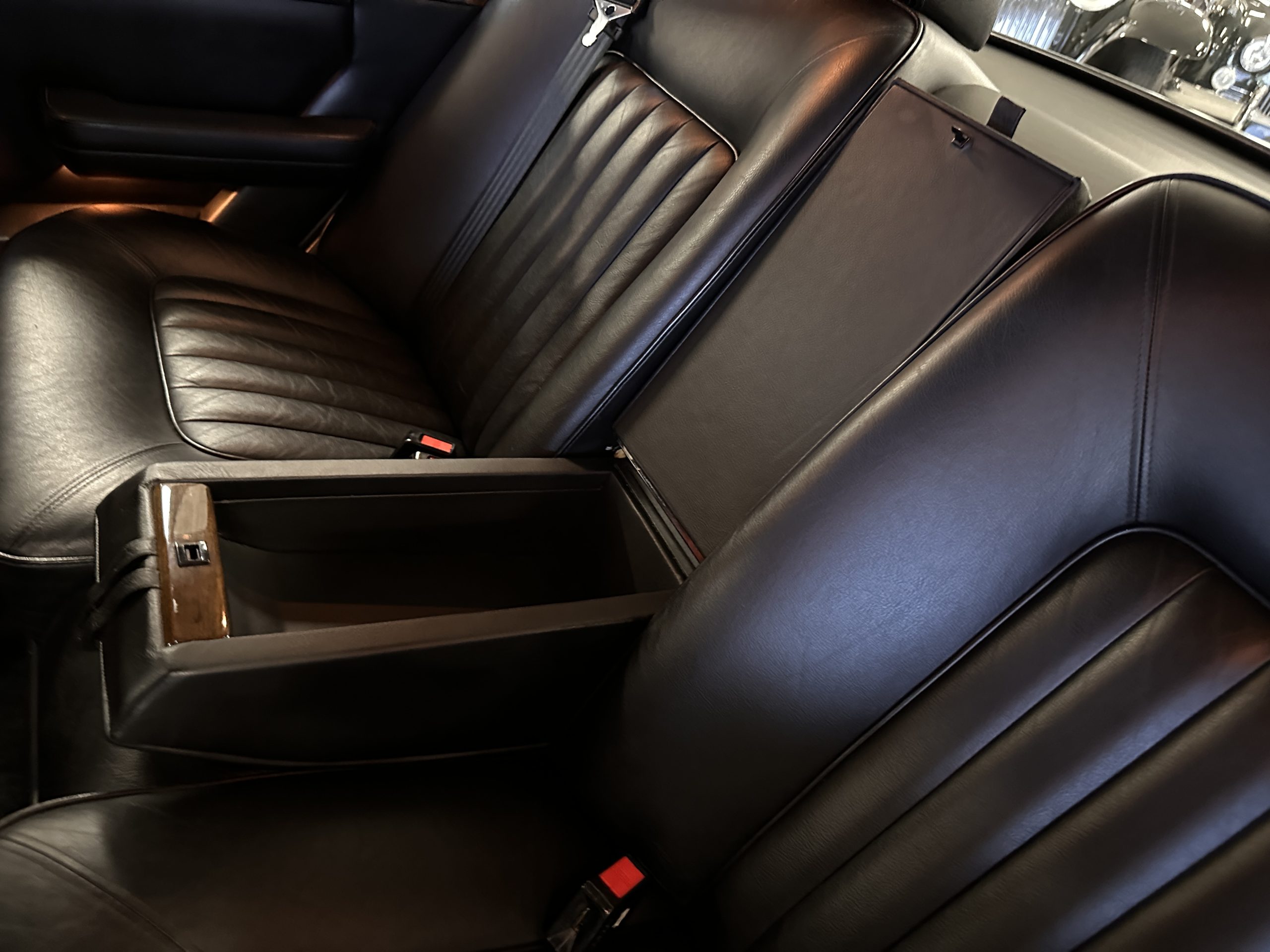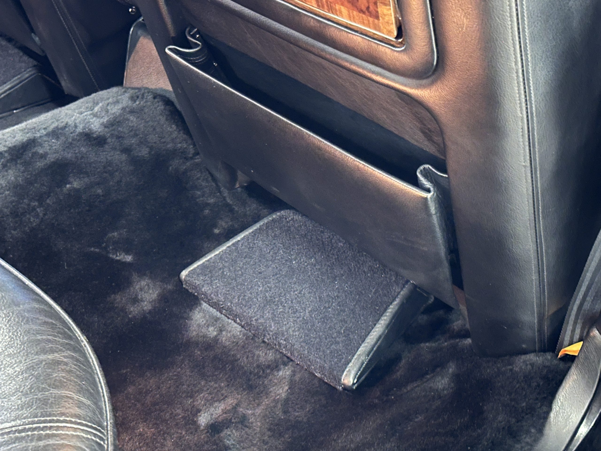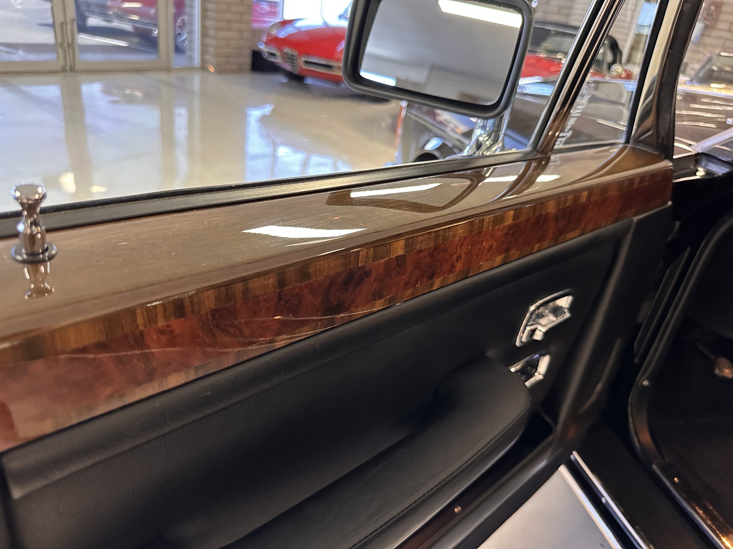 The Black leather interior is in excellent condition with only very minimal creasing and without tears. The leather is also fairly soft and truly exceptional for original 40-year-old leather. The Black Wilton wool carpeting is bound with black leather and has its black mouton sheepskin overlays. The gorgeous burl walnut wood has been refinished and looks perfect. The steering wheel has been upgraded to a wood and alloy Nardi wheel in perfect condition and the original wheel is included in the sale. The picnic tables have also been beautifully refinished, and the often-missing footrests are present for the rear seat passengers. The two rear mirrored vanities were not refinished and have the normal cracking present. Other than the wood, all of the interior is original and exceptional.