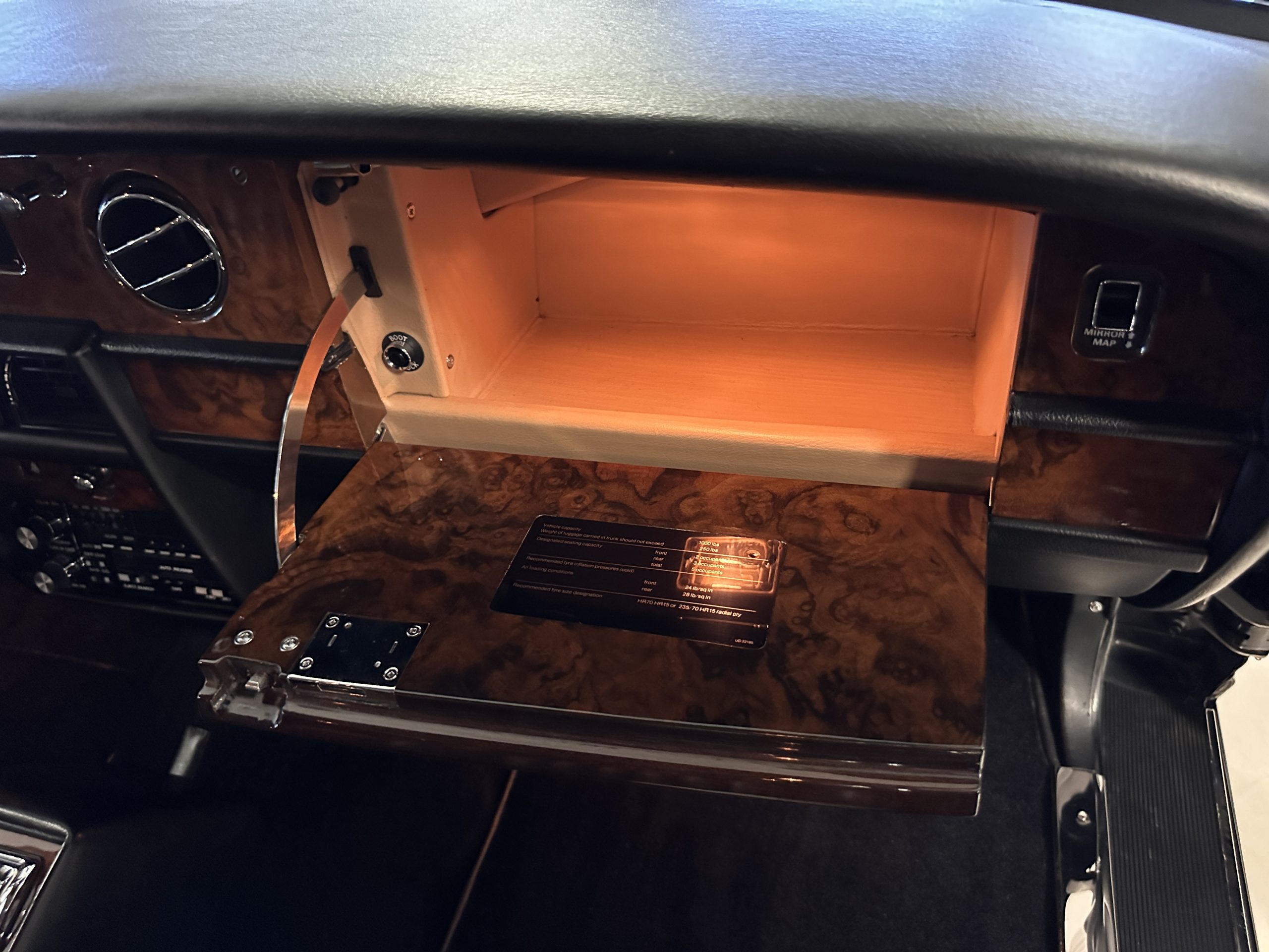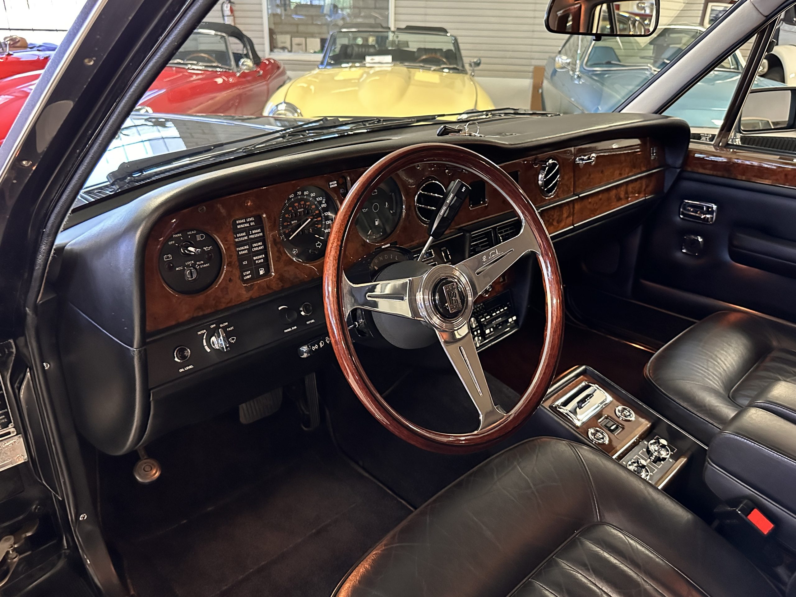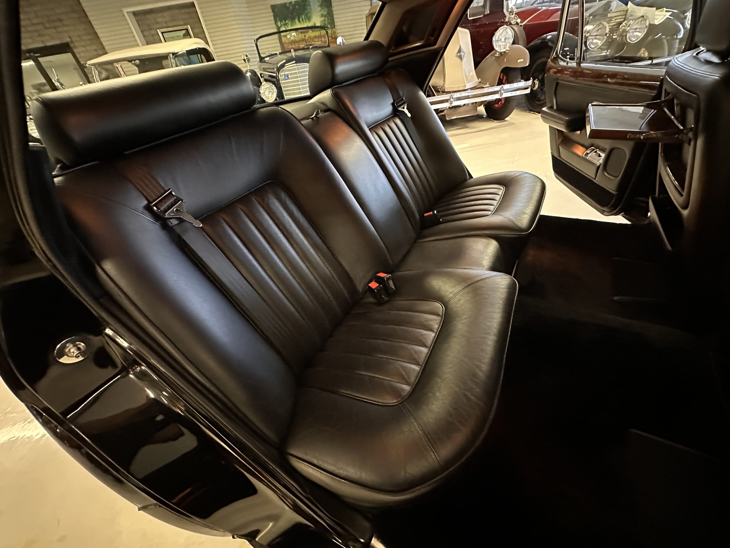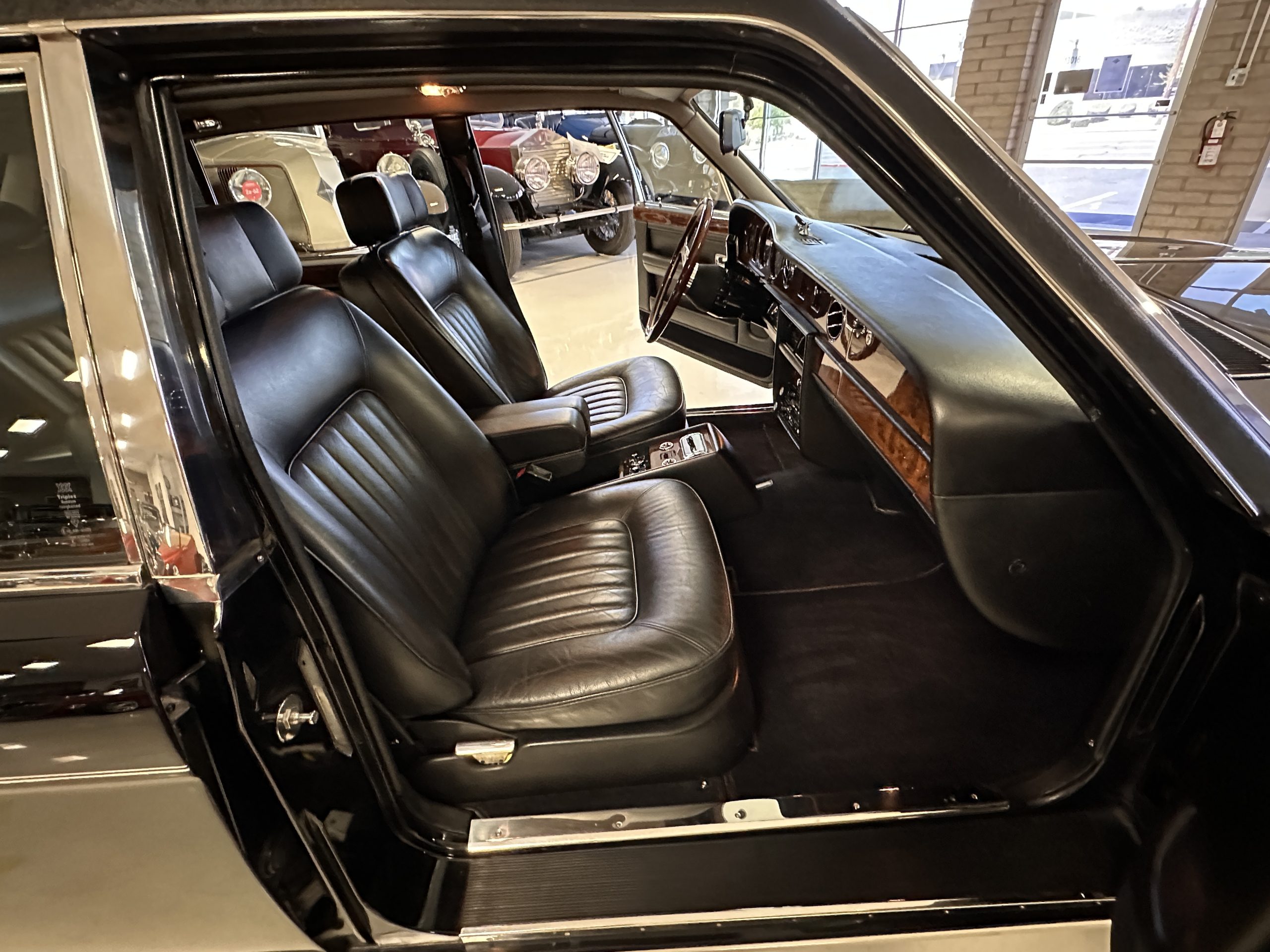 The Black leather interior is in excellent condition with only very minimal creasing and without tears. The leather is also fairly soft and truly exceptional for original 40-year-old leather. The Black Wilton wool carpeting is bound with black leather and has its black mouton sheepskin overlays. The gorgeous burl walnut wood has been refinished and looks perfect. The steering wheel has been upgraded to a wood and alloy Nardi wheel in perfect condition and the original wheel is included in the sale. The picnic tables have also been beautifully refinished, and the often-missing footrests are present for the rear seat passengers. The two rear mirrored vanities were not refinished and have the normal cracking present. Other than the wood, all of the interior is original and exceptional.