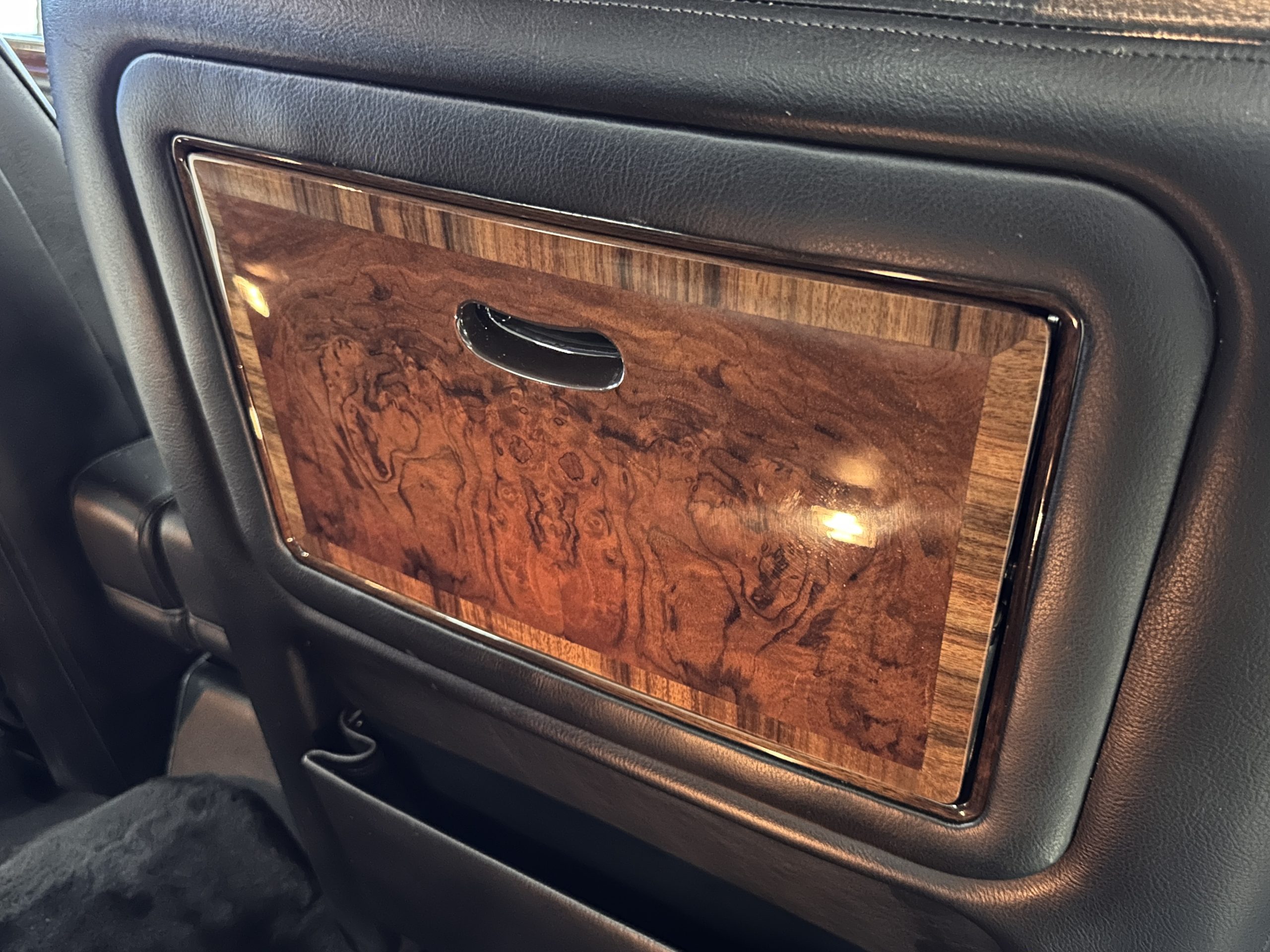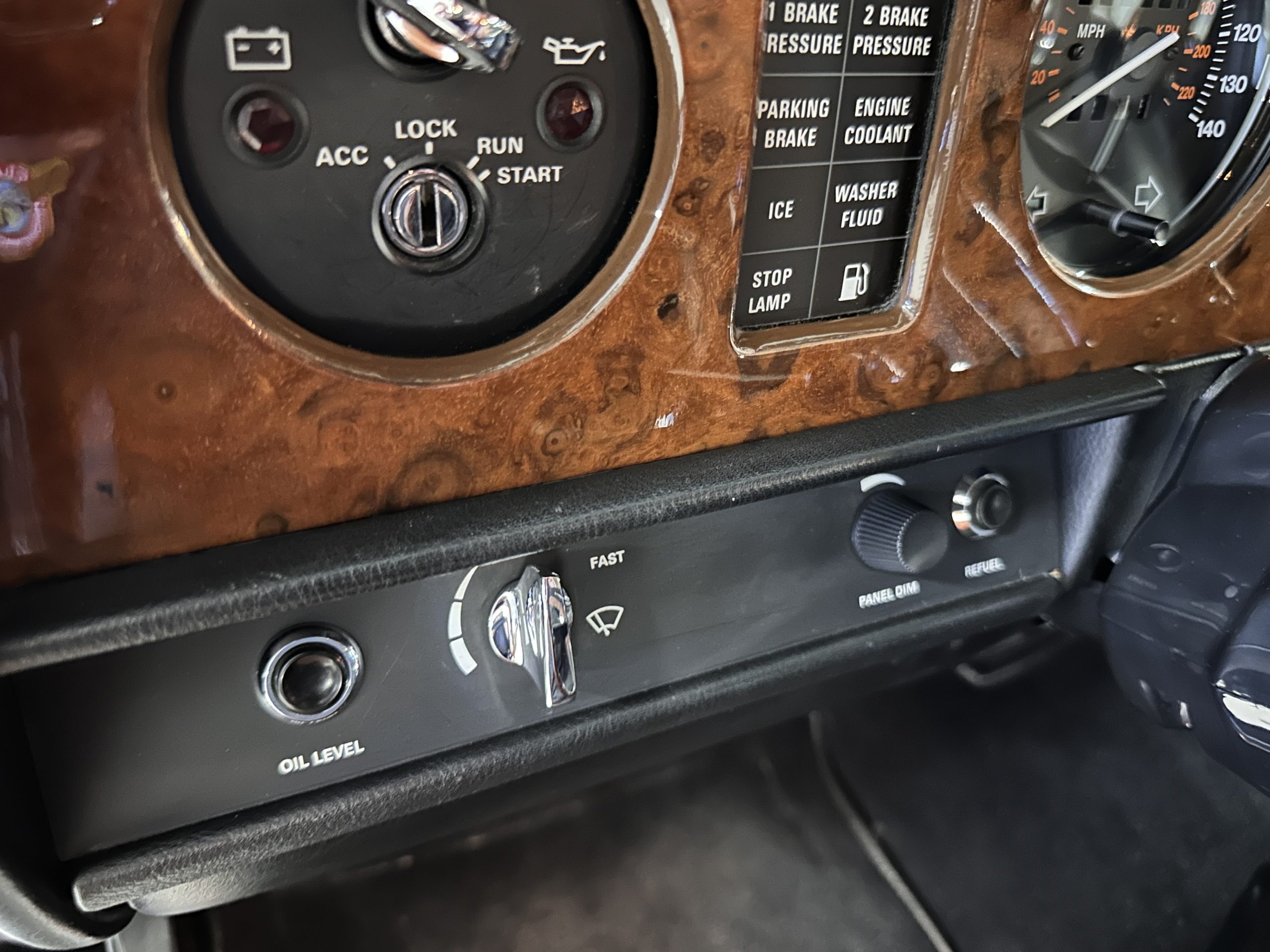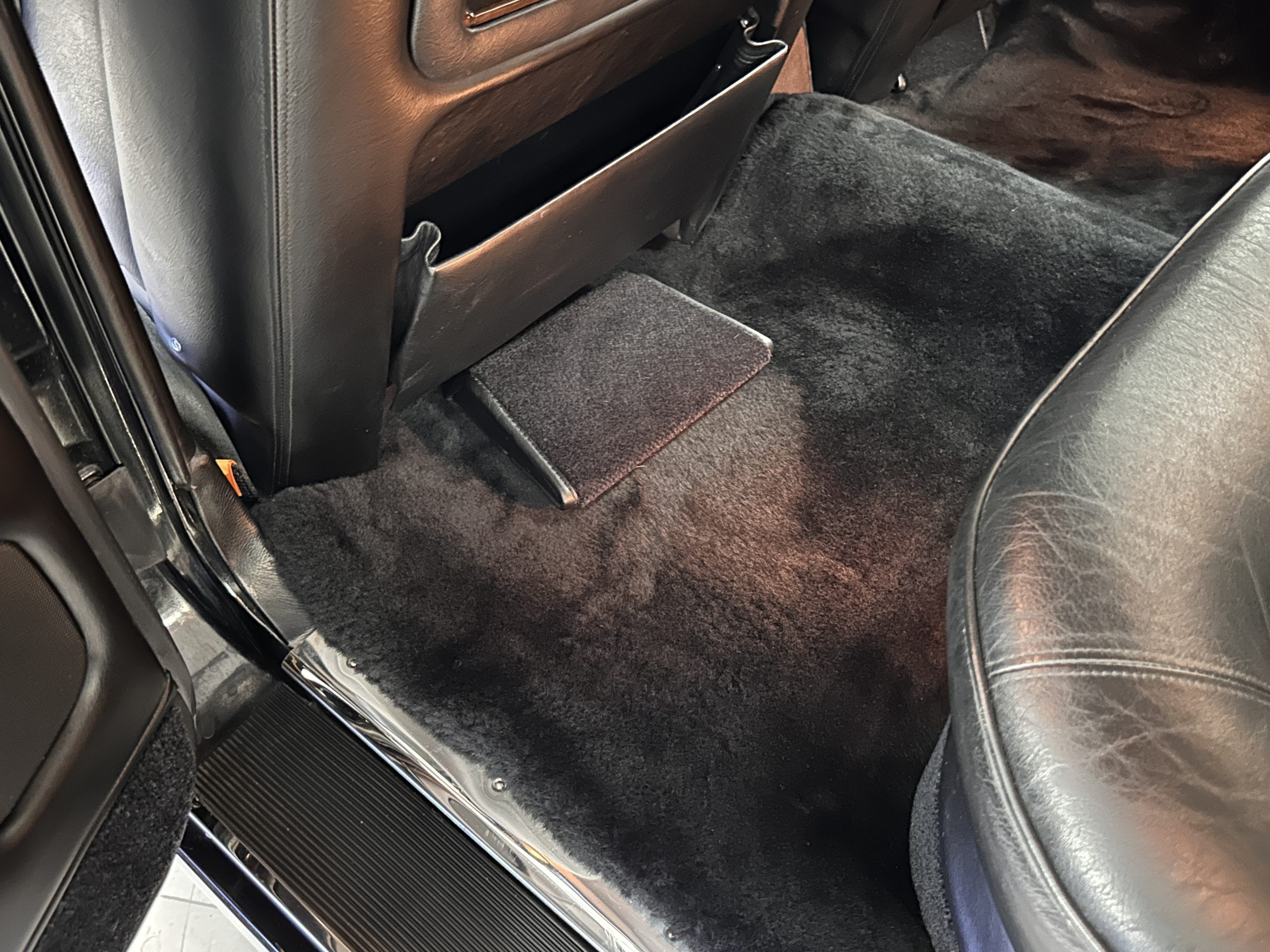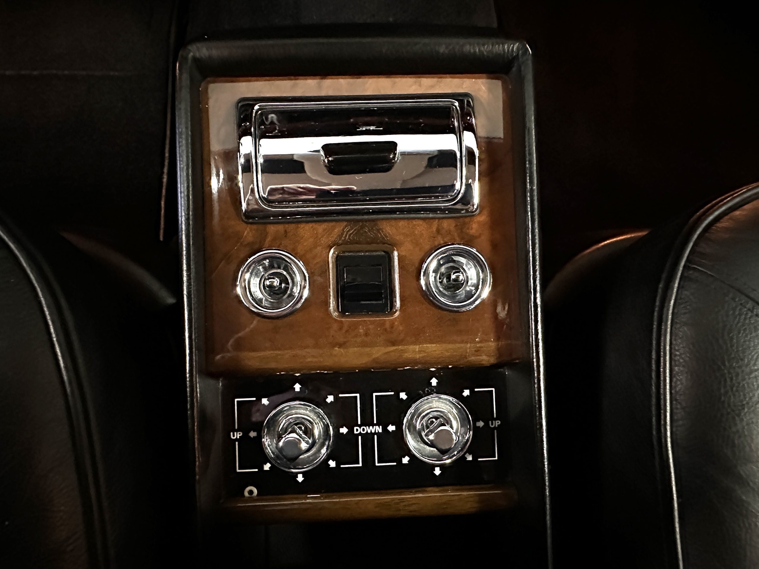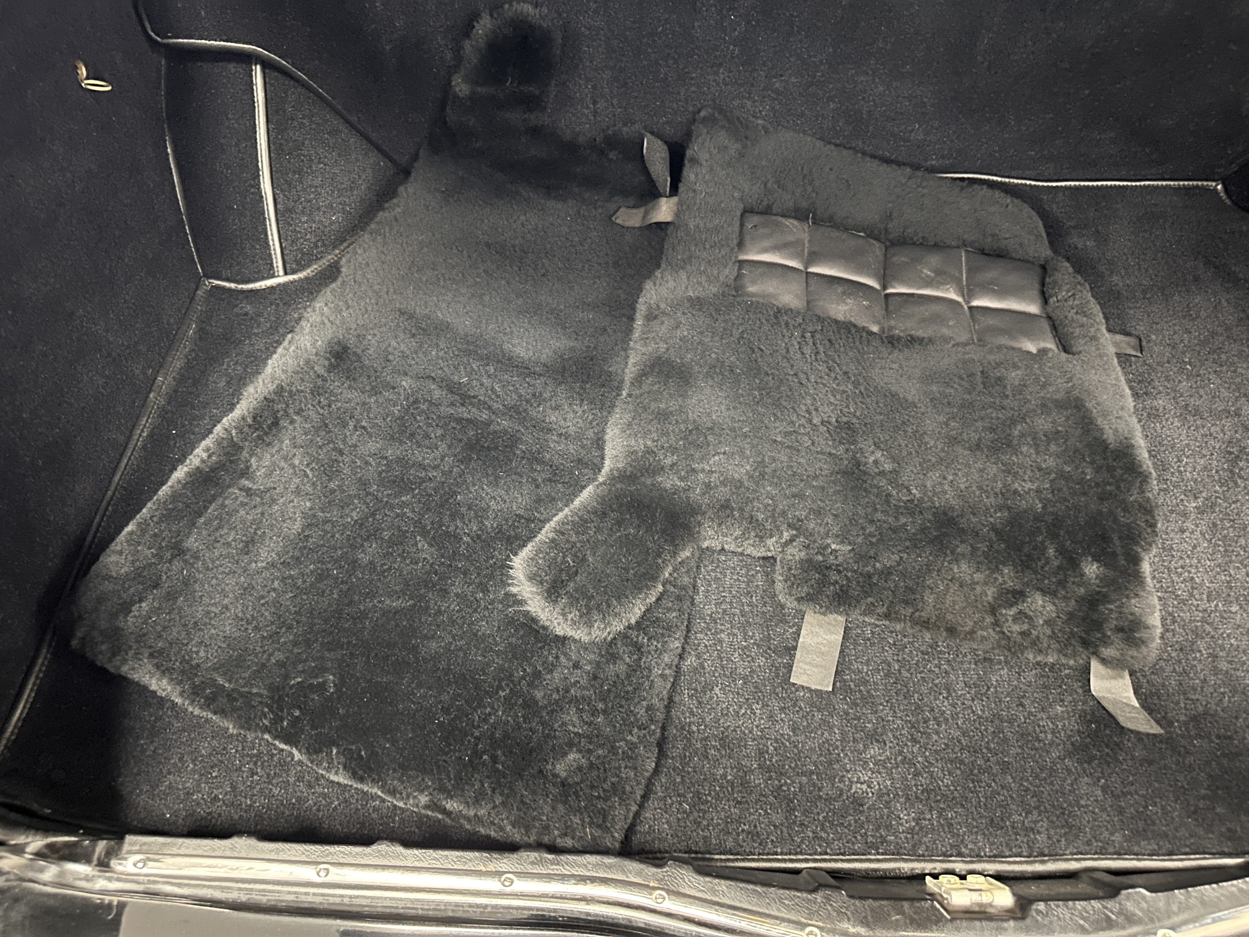 The Black leather interior is in excellent condition with only very minimal creasing and without tears. The leather is also fairly soft and truly exceptional for original 40-year-old leather. The Black Wilton wool carpeting is bound with black leather and has its black mouton sheepskin overlays. The gorgeous burl walnut wood has been refinished and looks perfect. The steering wheel has been upgraded to a wood and alloy Nardi wheel in perfect condition and the original wheel is included in the sale. The picnic tables have also been beautifully refinished, and the often-missing footrests are present for the rear seat passengers. The two rear mirrored vanities were not refinished and have the normal cracking present. Other than the wood, all of the interior is original and exceptional.