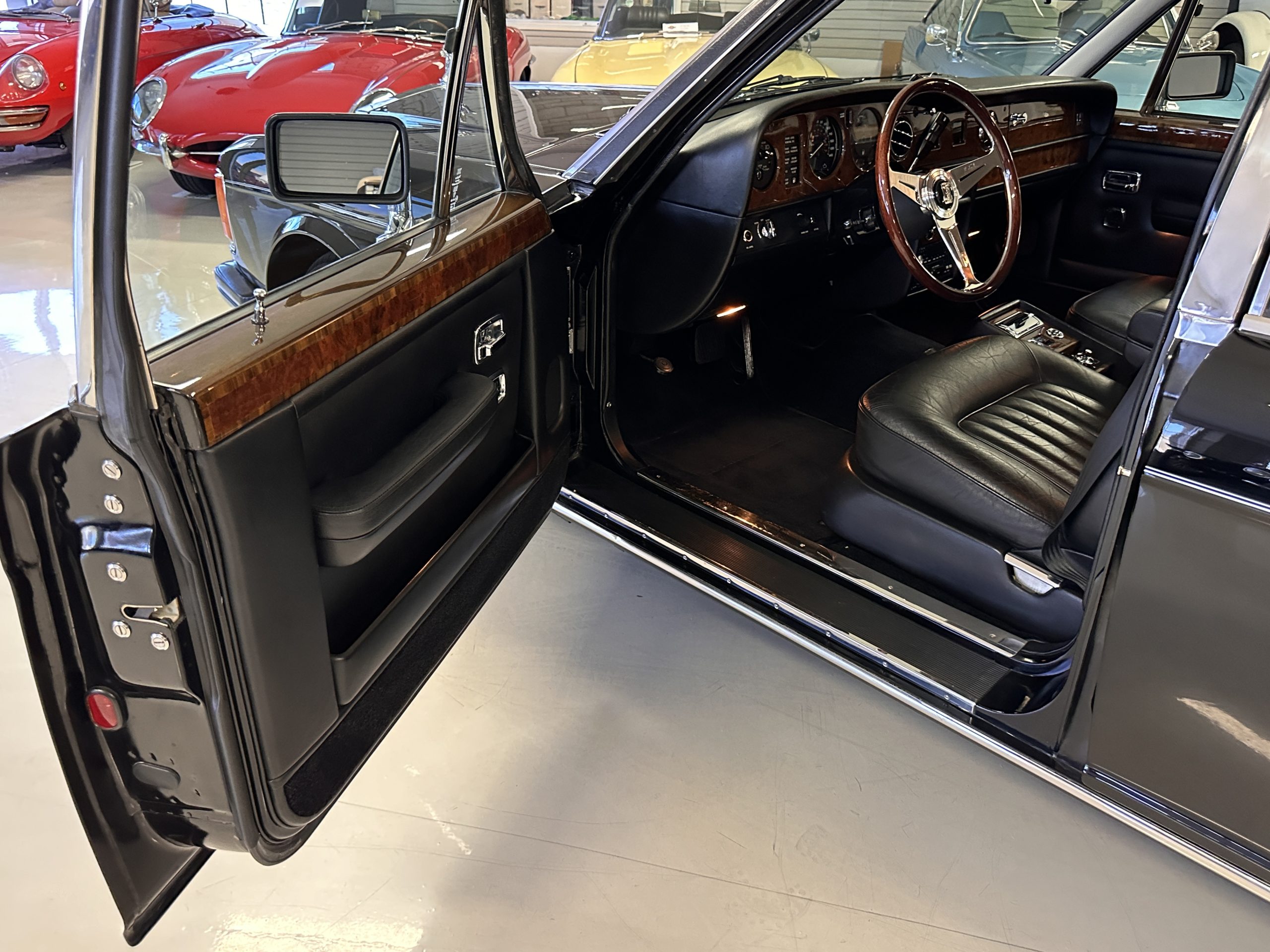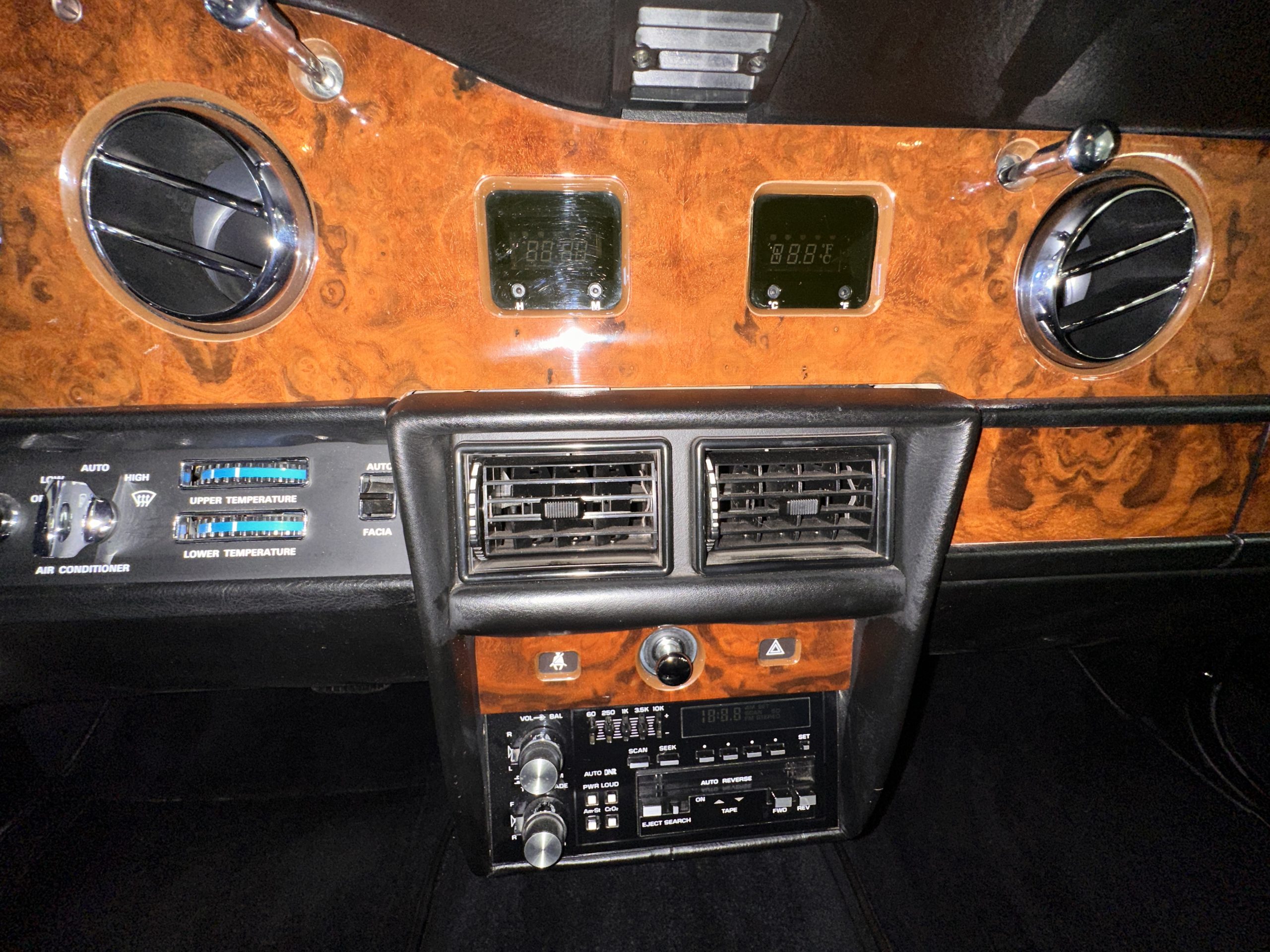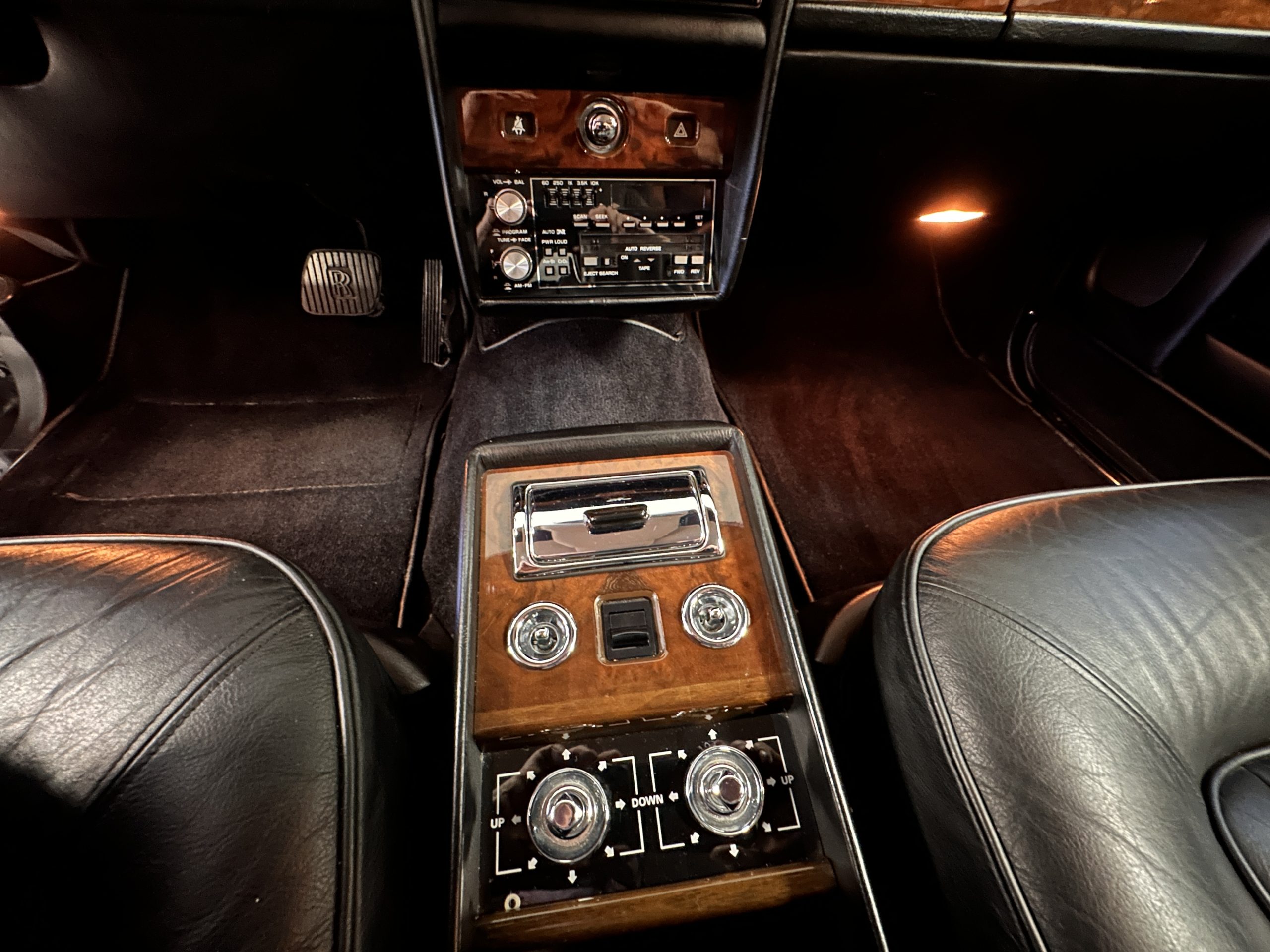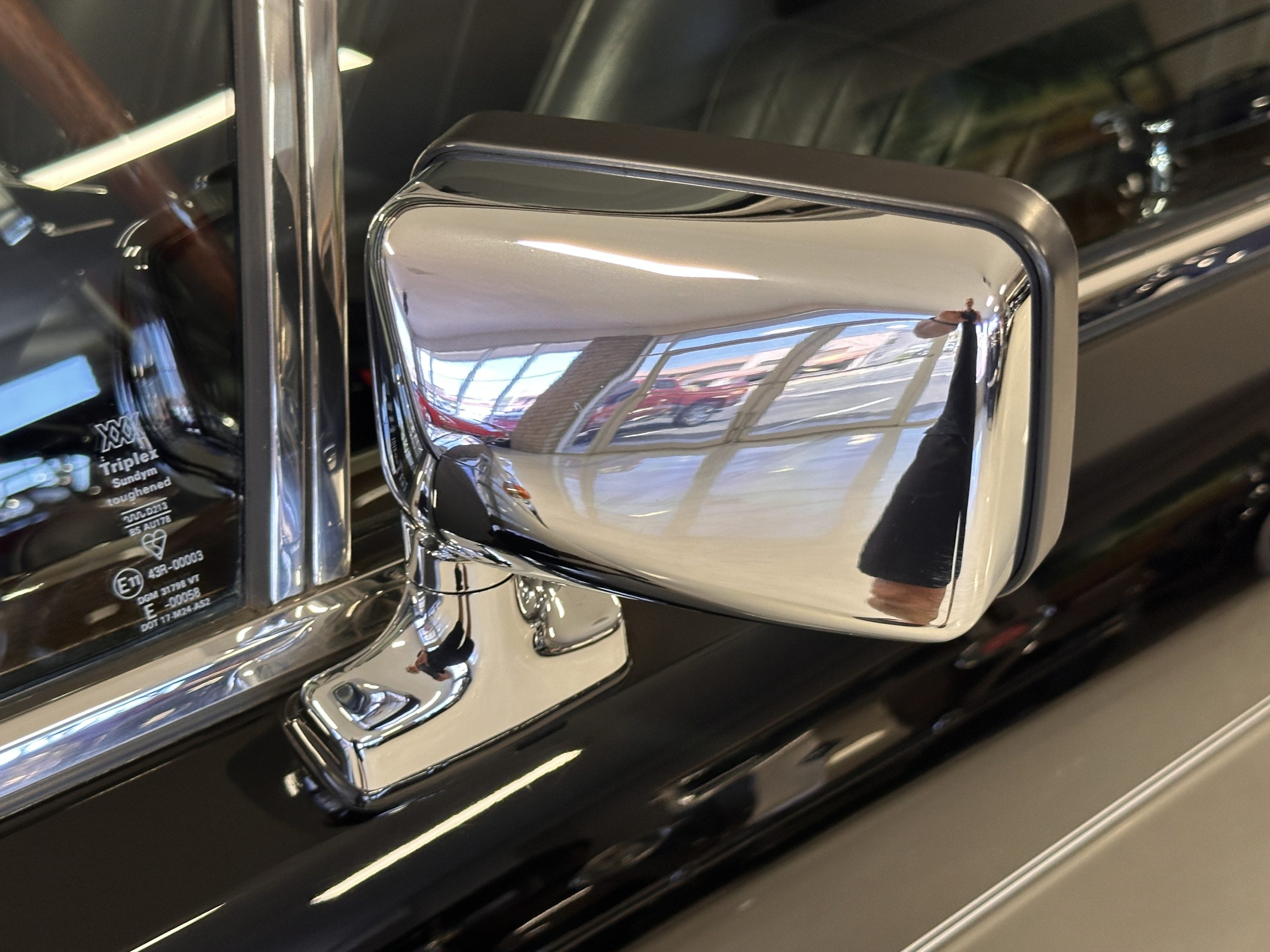 The Black leather interior is in excellent condition with only very minimal creasing and without tears. The leather is also fairly soft and truly exceptional for original 40-year-old leather. The Black Wilton wool carpeting is bound with black leather and has its black mouton sheepskin overlays. The gorgeous burl walnut wood has been refinished and looks perfect. The steering wheel has been upgraded to a wood and alloy Nardi wheel in perfect condition and the original wheel is included in the sale. The picnic tables have also been beautifully refinished, and the often-missing footrests are present for the rear seat passengers. The two rear mirrored vanities were not refinished and have the normal cracking present. Other than the wood, all of the interior is original and exceptional.