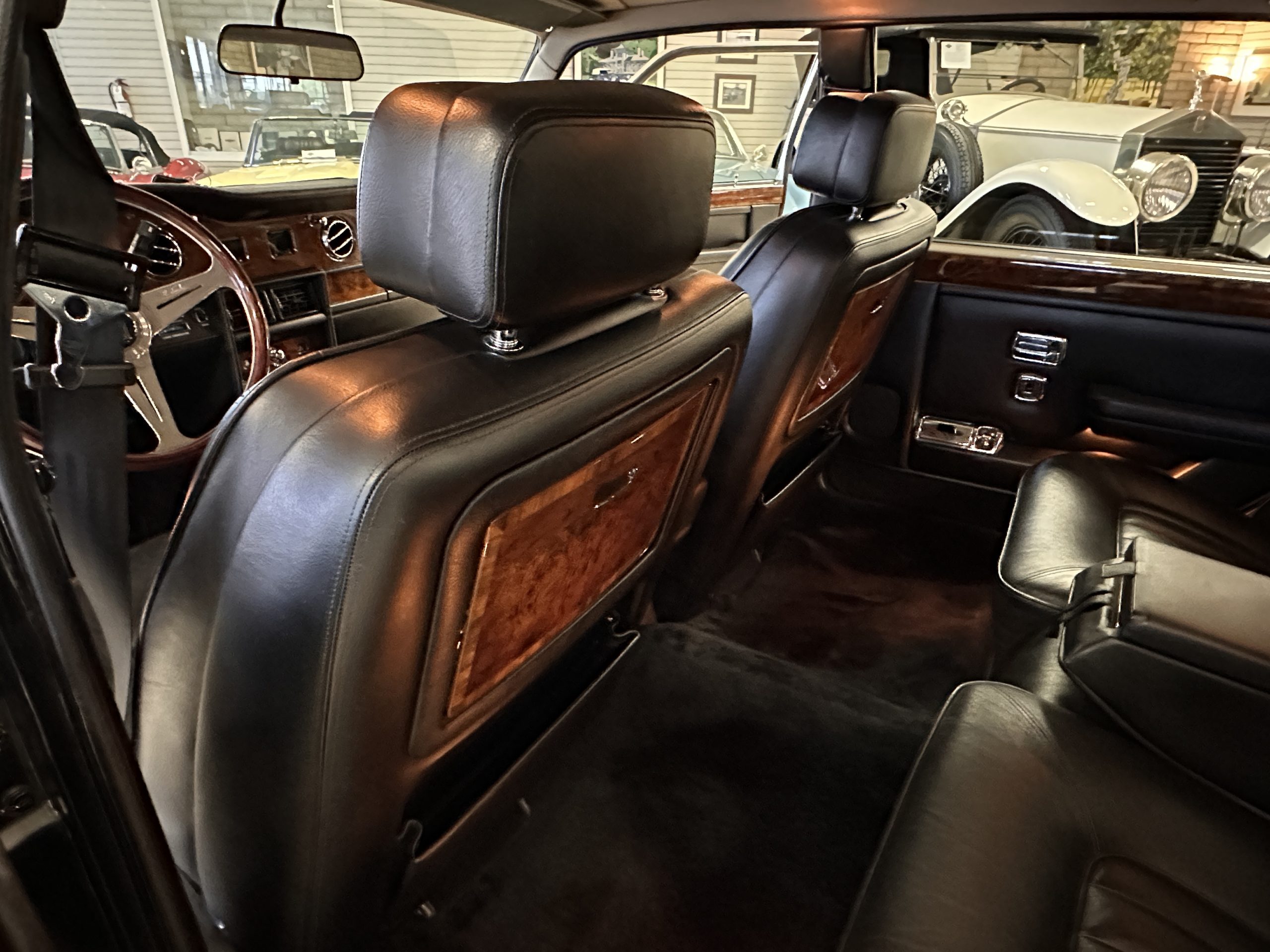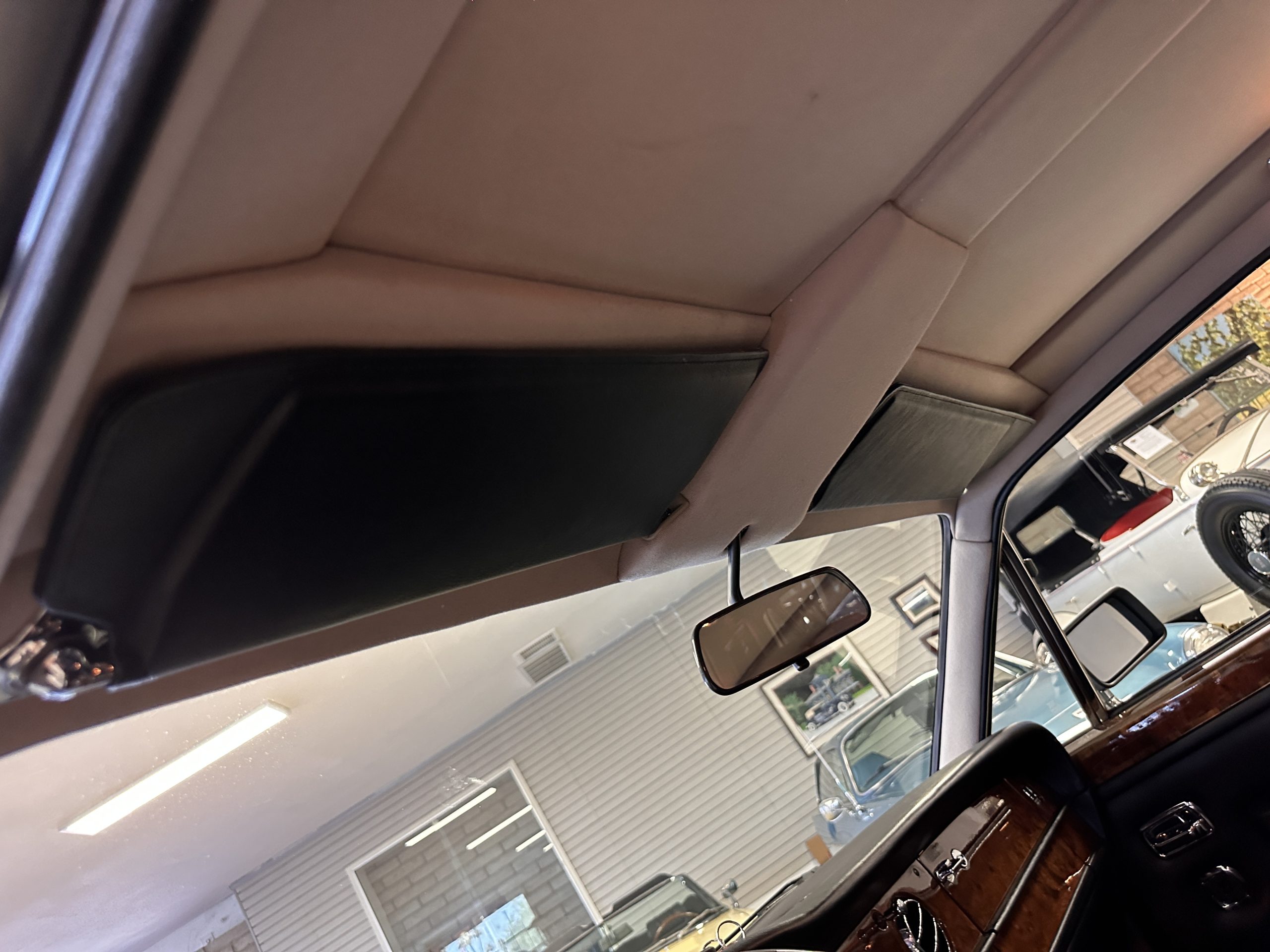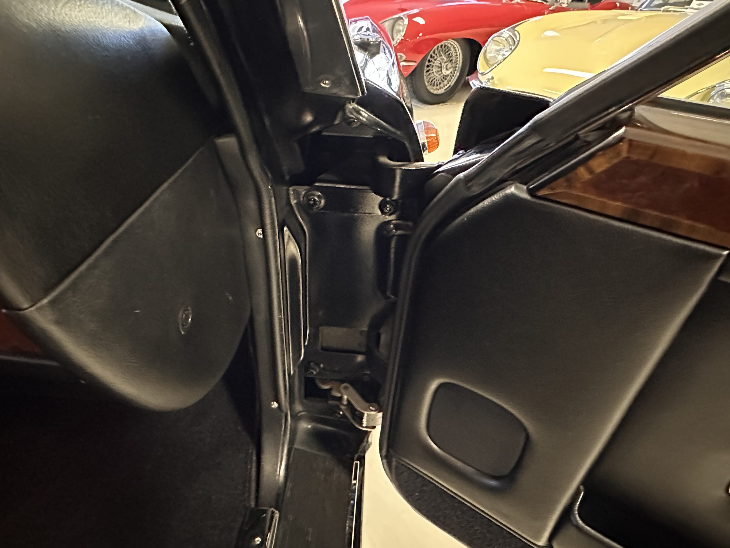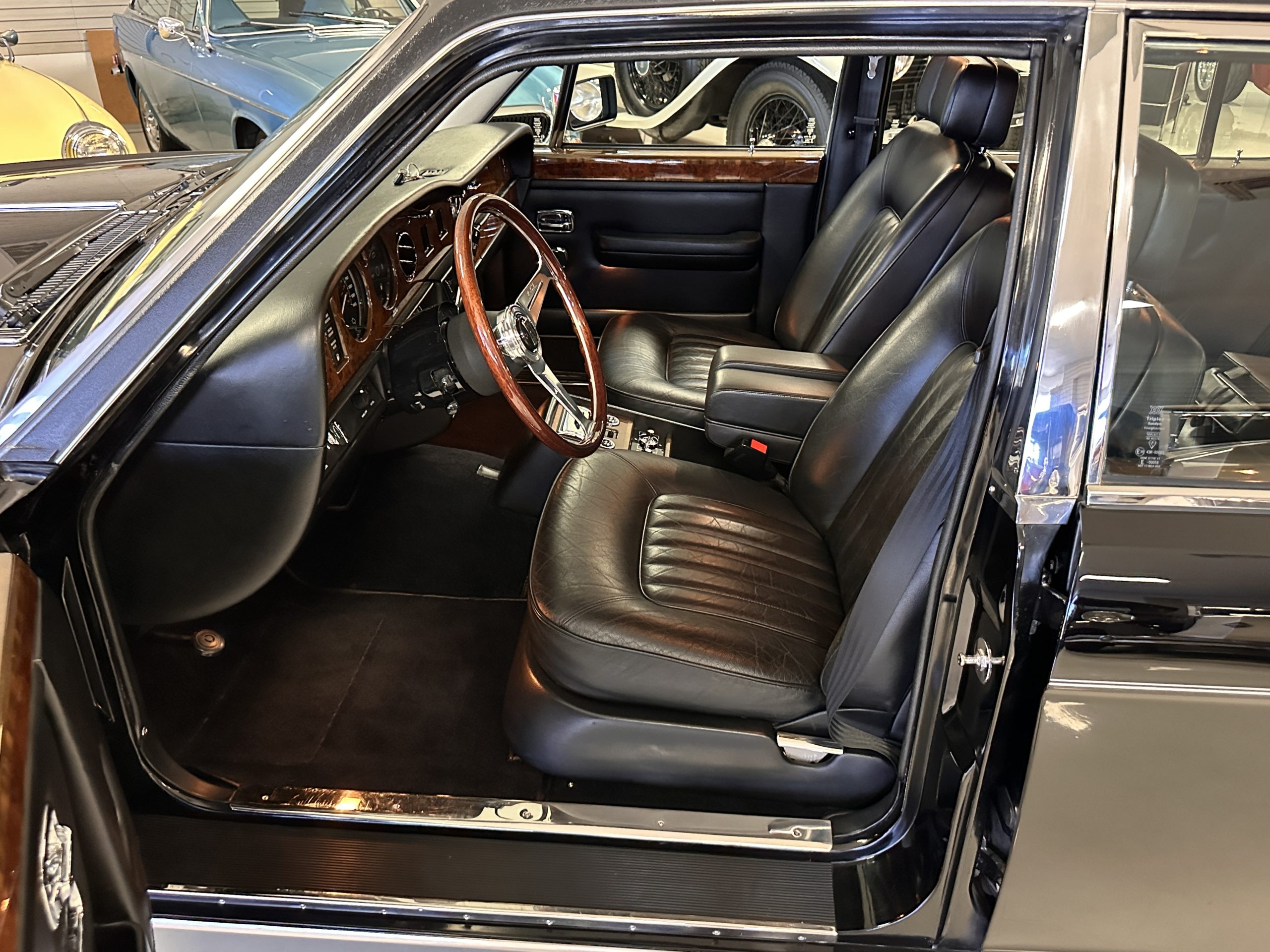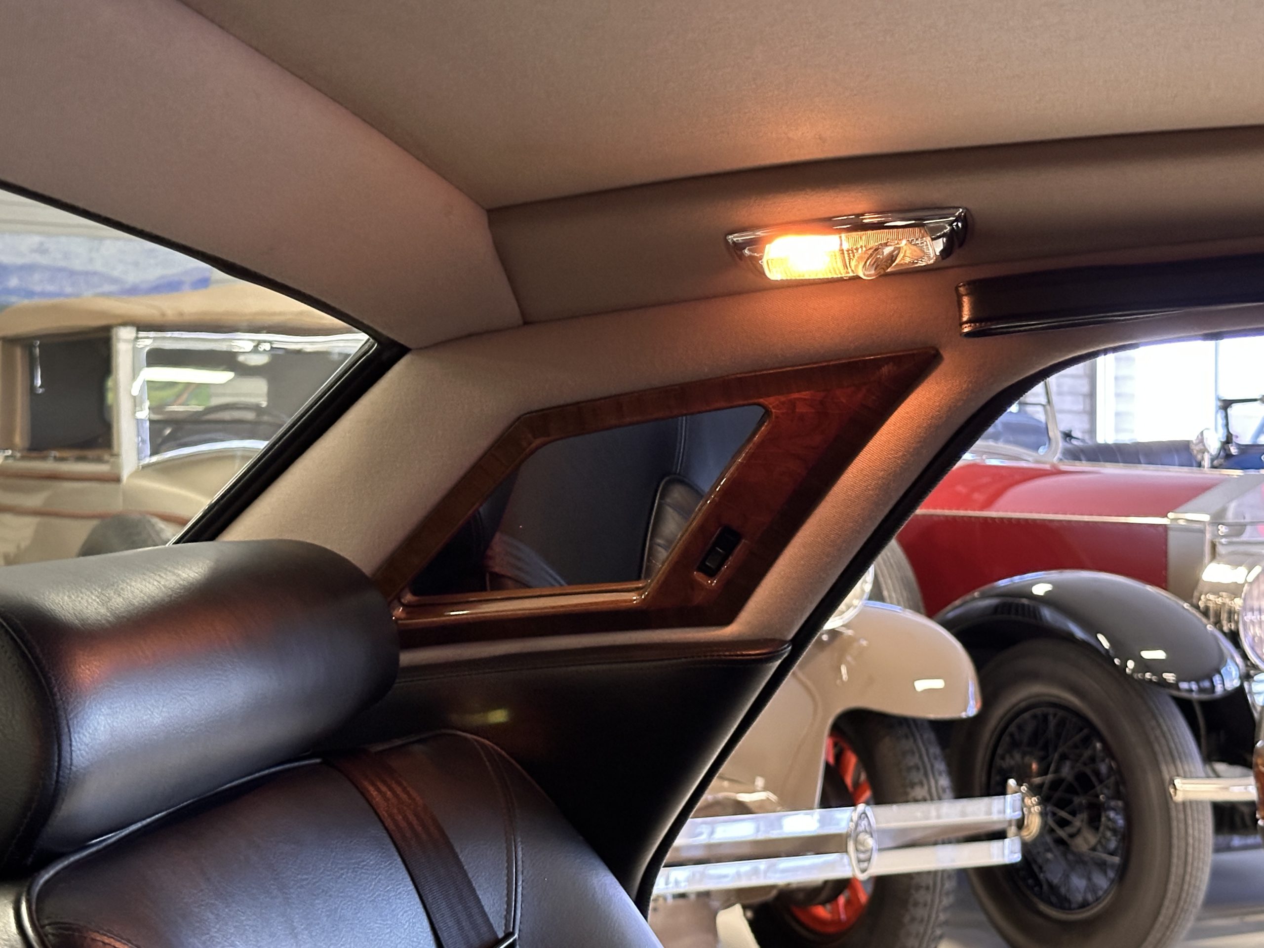 The Black leather interior is in excellent condition with only very minimal creasing and without tears. The leather is also fairly soft and truly exceptional for original 40-year-old leather. The Black Wilton wool carpeting is bound with black leather and has its black mouton sheepskin overlays. The gorgeous burl walnut wood has been refinished and looks perfect. The steering wheel has been upgraded to a wood and alloy Nardi wheel in perfect condition and the original wheel is included in the sale. The picnic tables have also been beautifully refinished, and the often-missing footrests are present for the rear seat passengers. The two rear mirrored vanities were not refinished and have the normal cracking present. Other than the wood, all of the interior is original and exceptional.