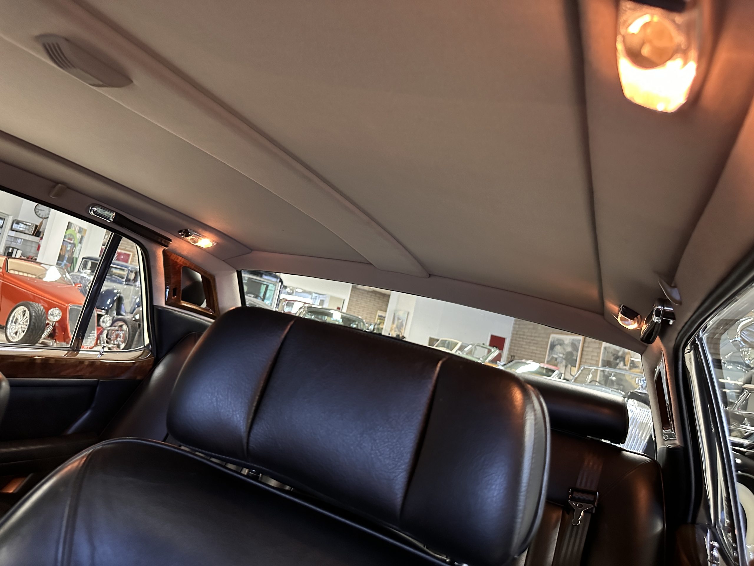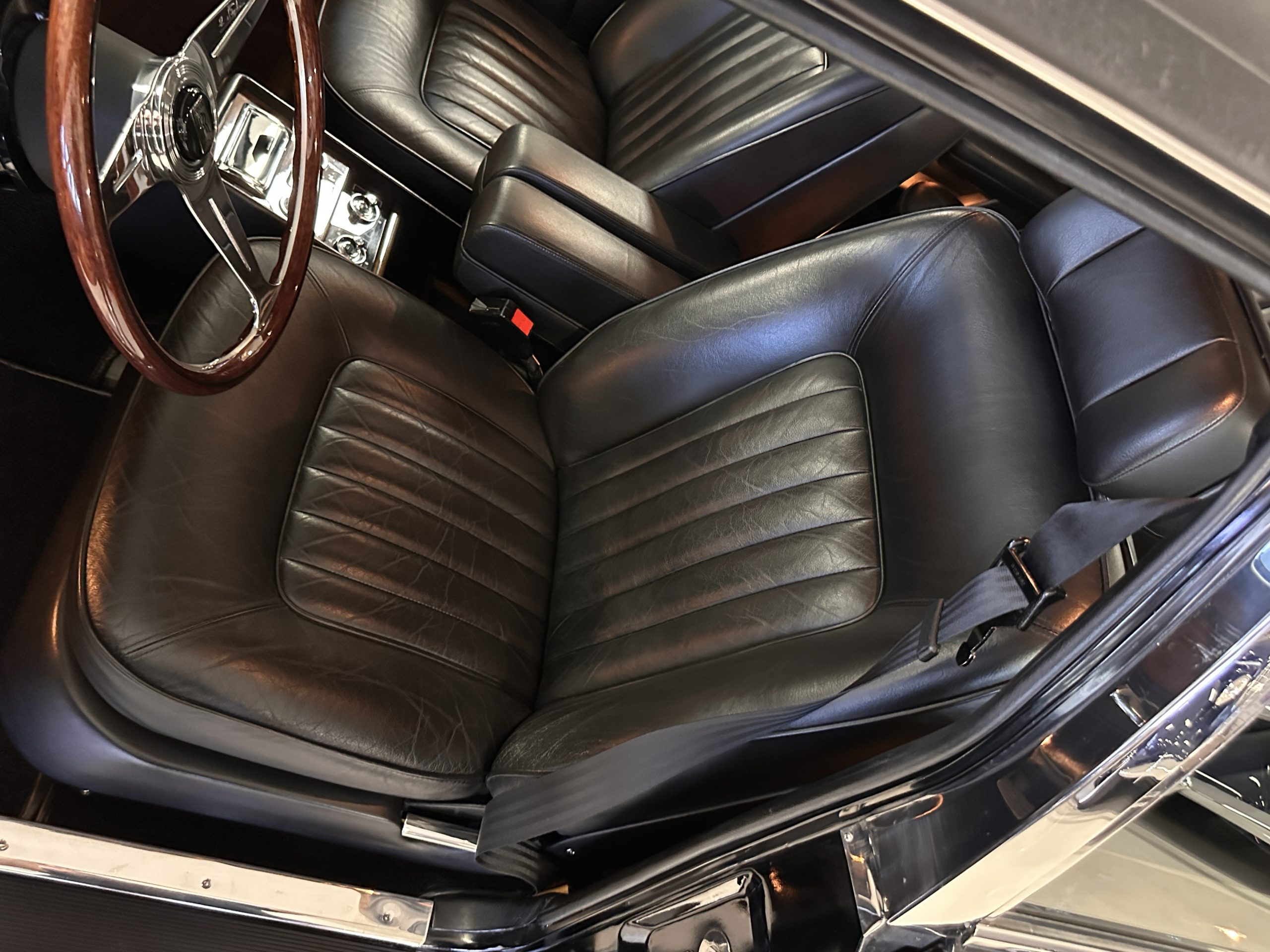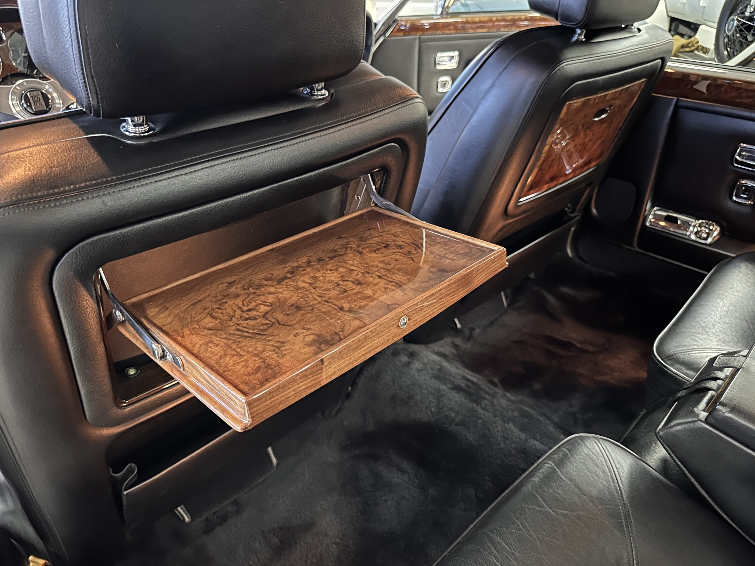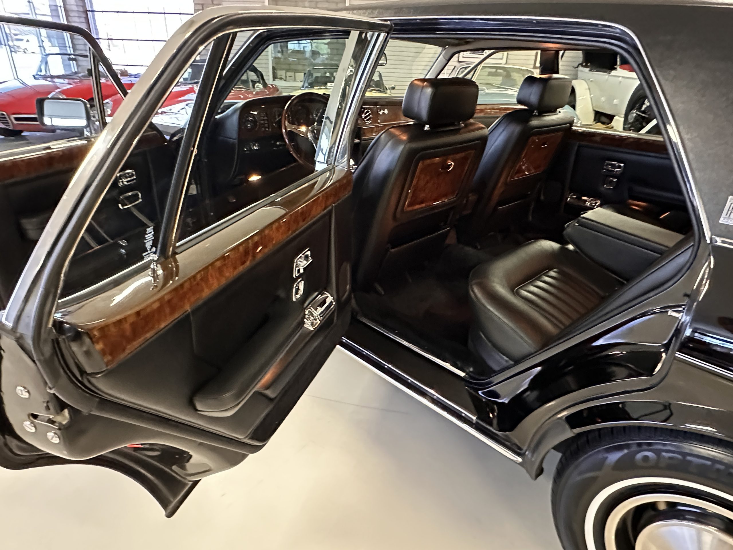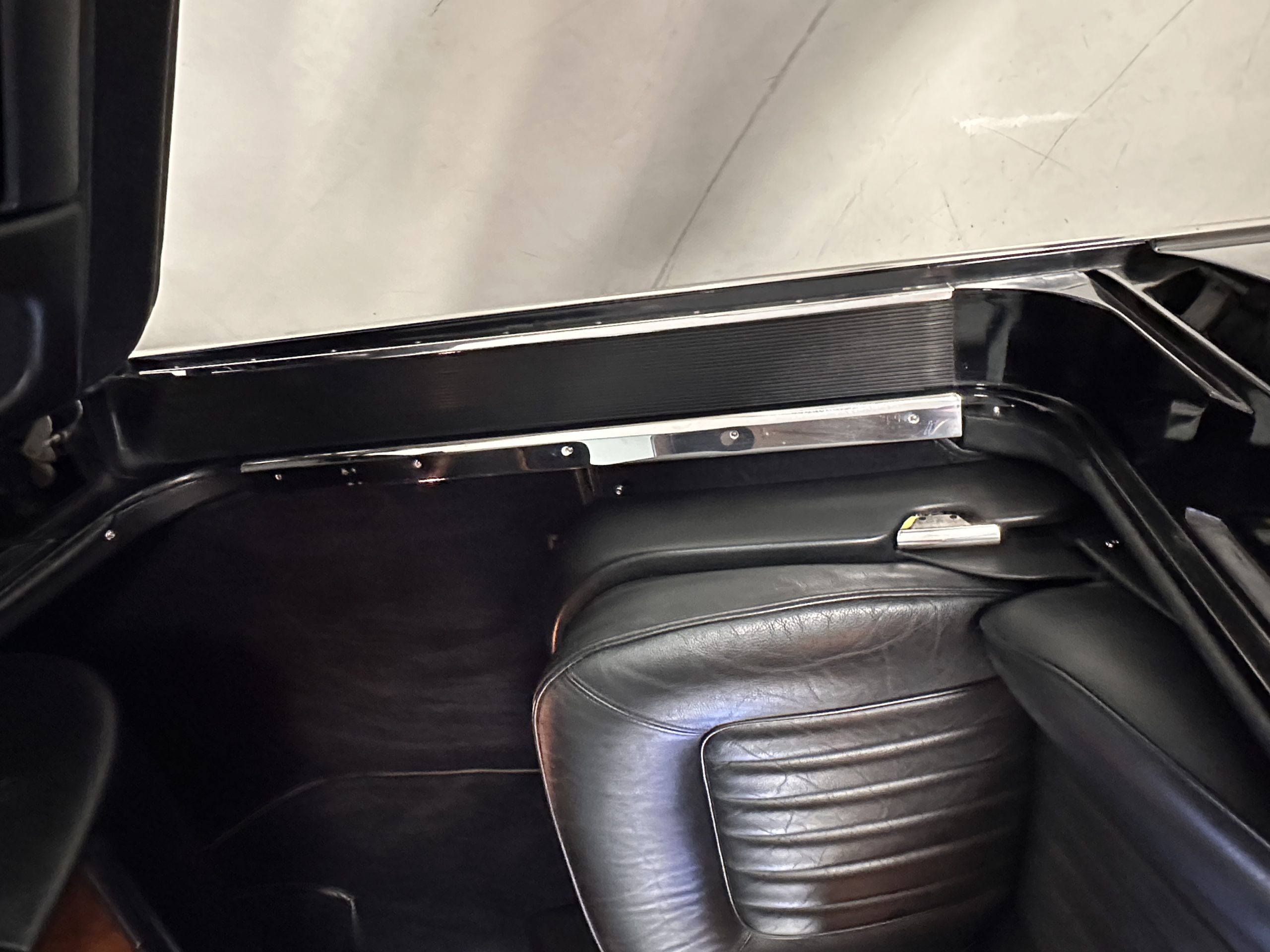 The Black leather interior is in excellent condition with only very minimal creasing and without tears. The leather is also fairly soft and truly exceptional for original 40-year-old leather. The Black Wilton wool carpeting is bound with black leather and has its black mouton sheepskin overlays. The gorgeous burl walnut wood has been refinished and looks perfect. The steering wheel has been upgraded to a wood and alloy Nardi wheel in perfect condition and the original wheel is included in the sale. The picnic tables have also been beautifully refinished, and the often-missing footrests are present for the rear seat passengers. The two rear mirrored vanities were not refinished and have the normal cracking present. Other than the wood, all of the interior is original and exceptional.