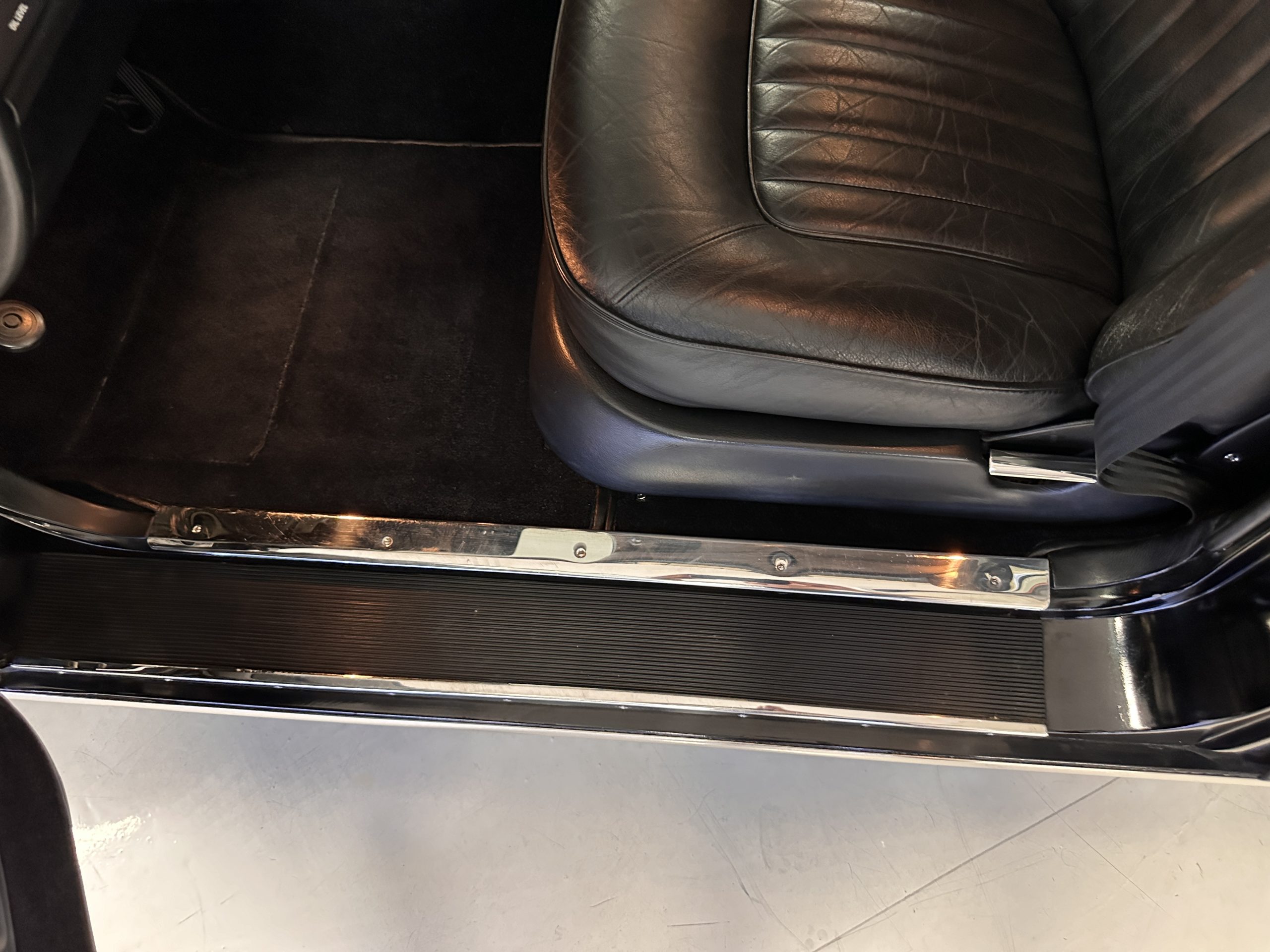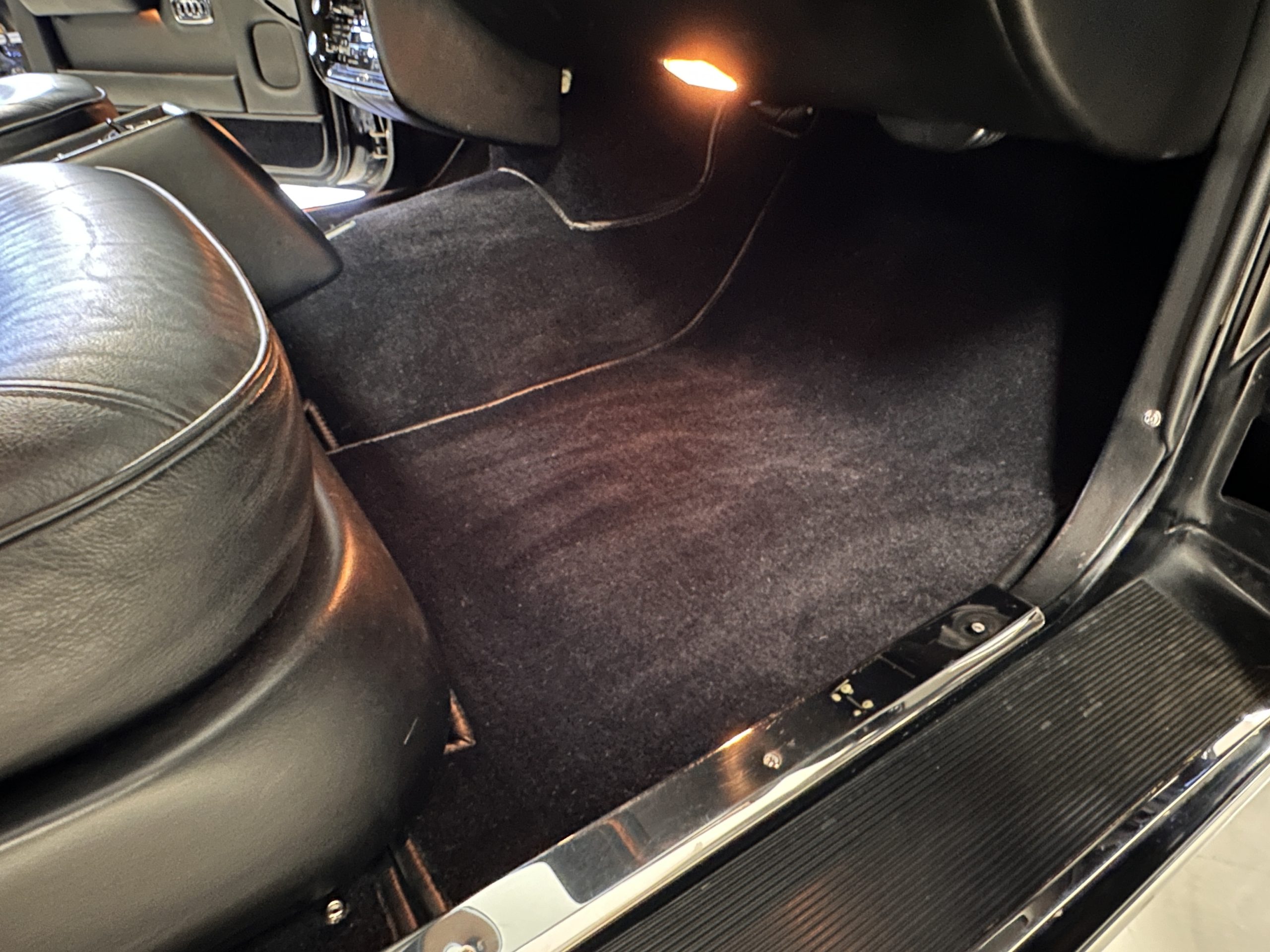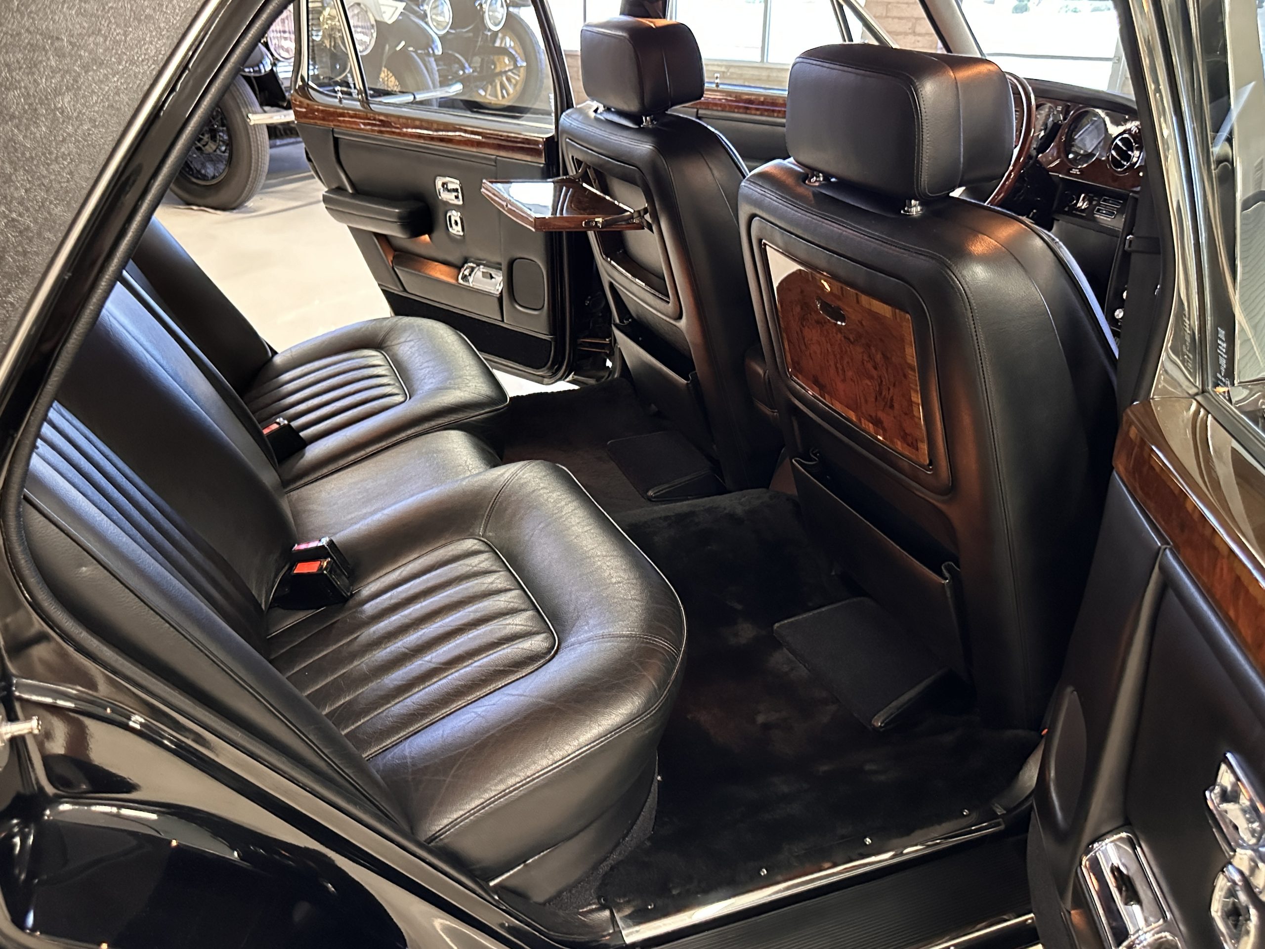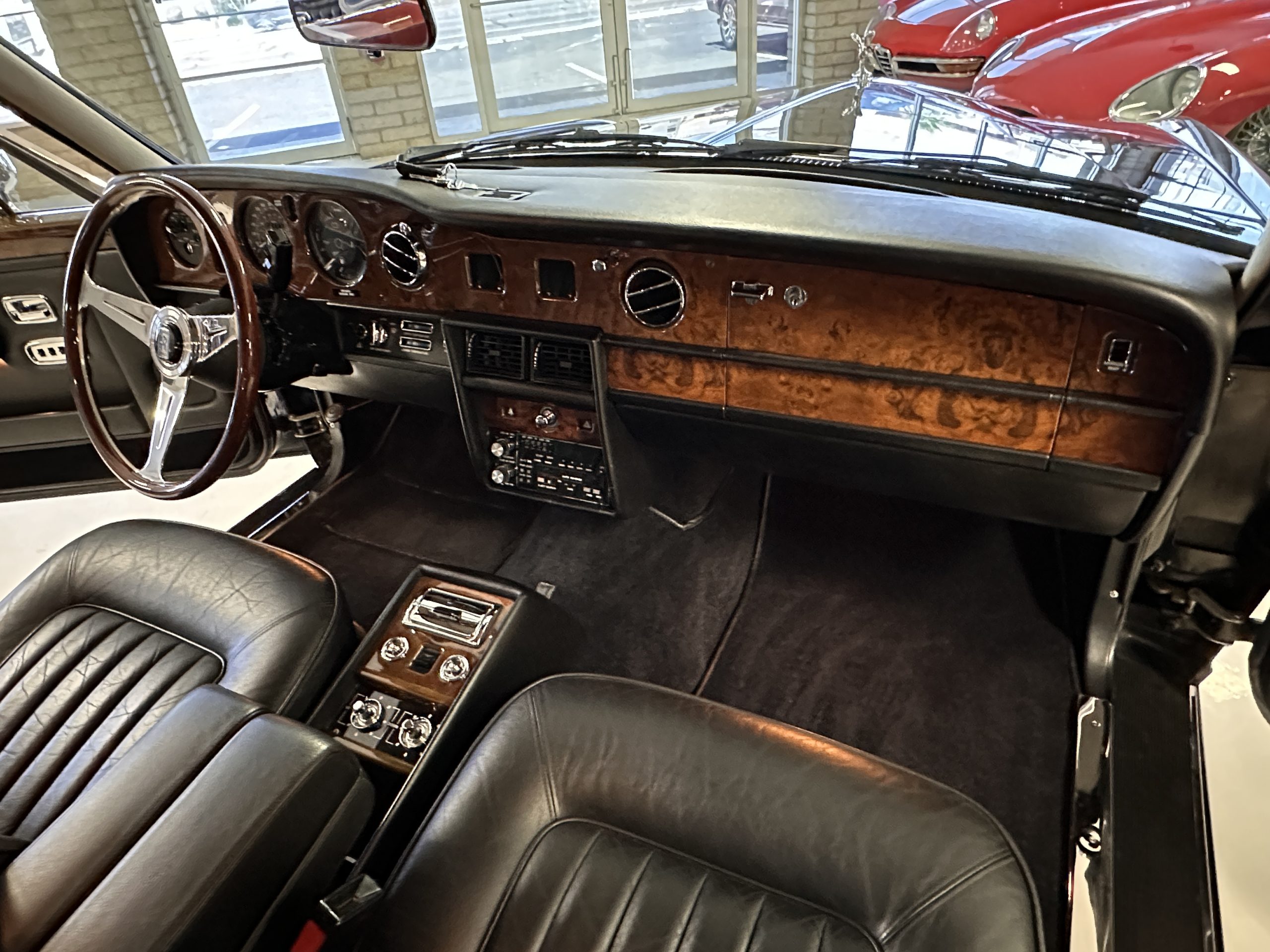 The Black leather interior is in excellent condition with only very minimal creasing and without tears. The leather is also fairly soft and truly exceptional for original 40-year-old leather. The Black Wilton wool carpeting is bound with black leather and has its black mouton sheepskin overlays. The gorgeous burl walnut wood has been refinished and looks perfect. The steering wheel has been upgraded to a wood and alloy Nardi wheel in perfect condition and the original wheel is included in the sale. The picnic tables have also been beautifully refinished, and the often-missing footrests are present for the rear seat passengers. The two rear mirrored vanities were not refinished and have the normal cracking present. Other than the wood, all of the interior is original and exceptional.