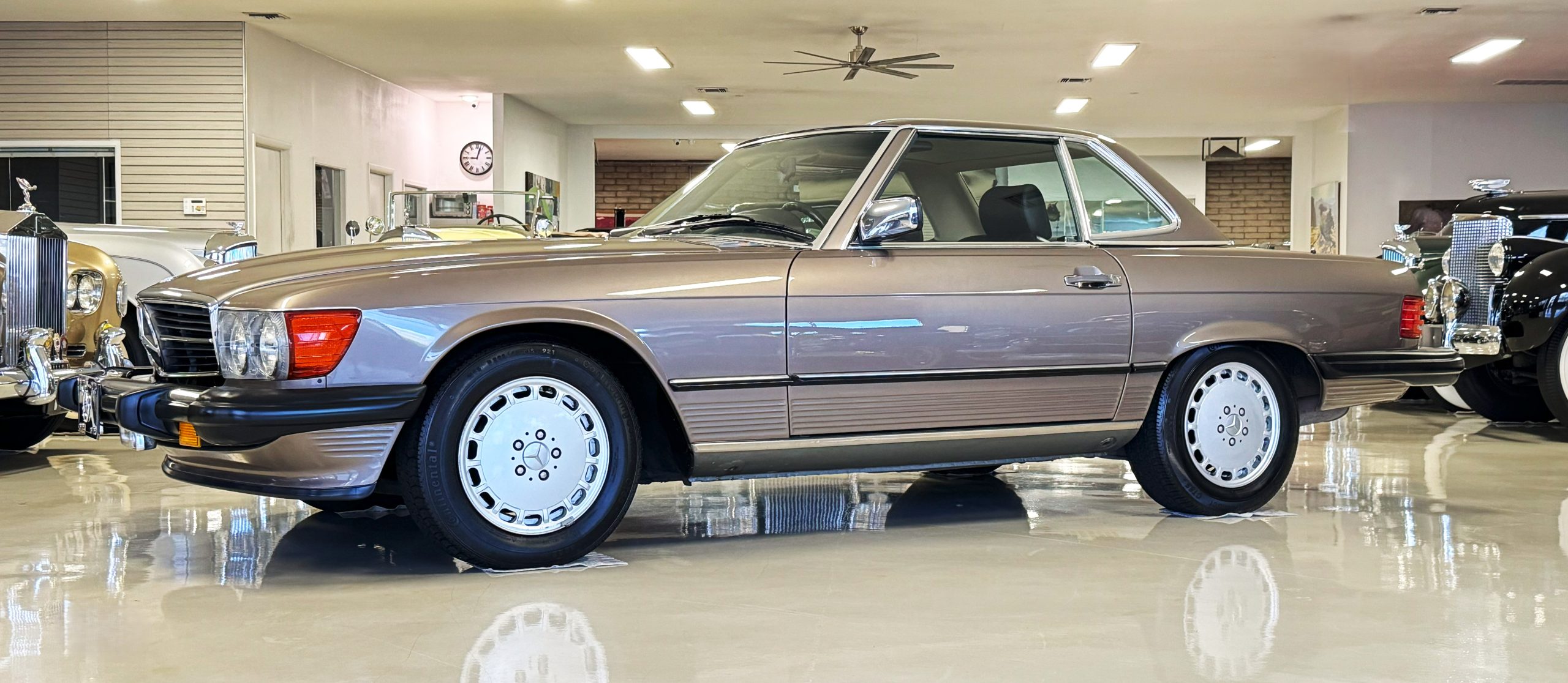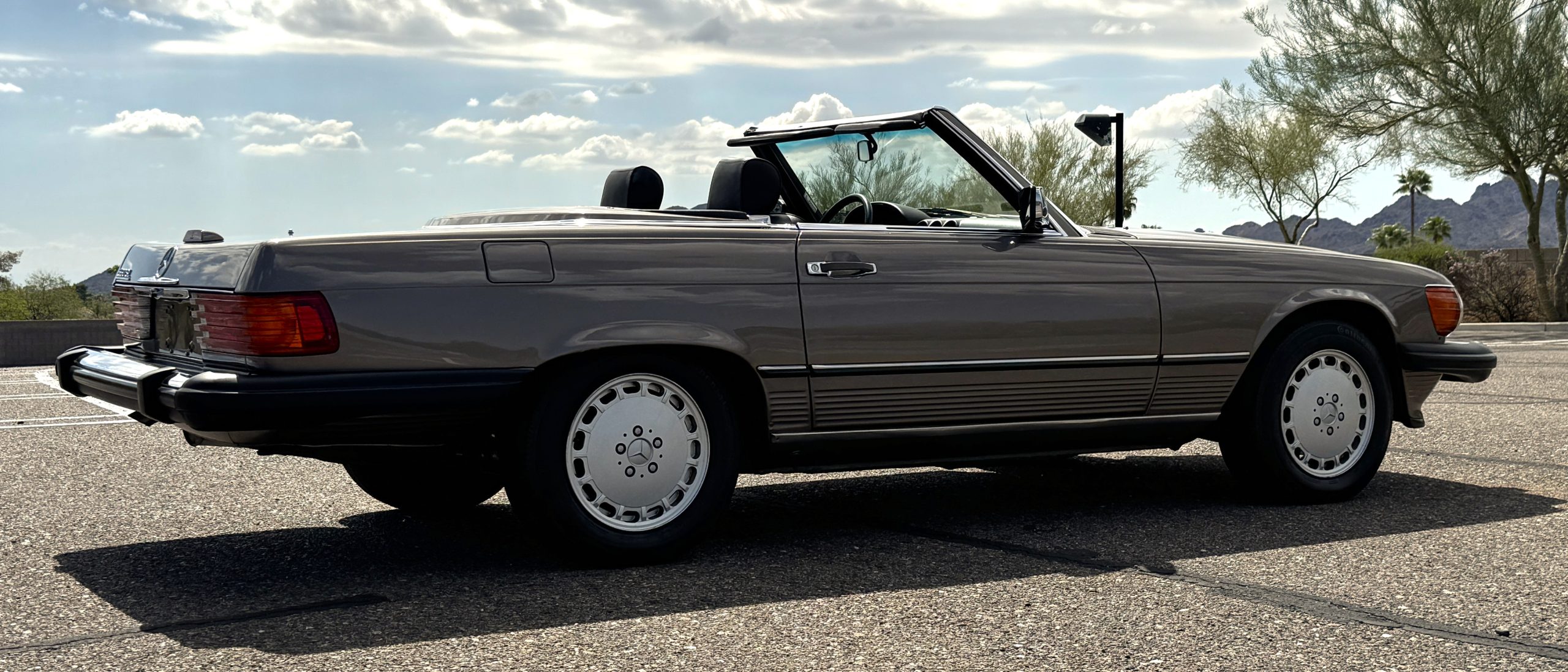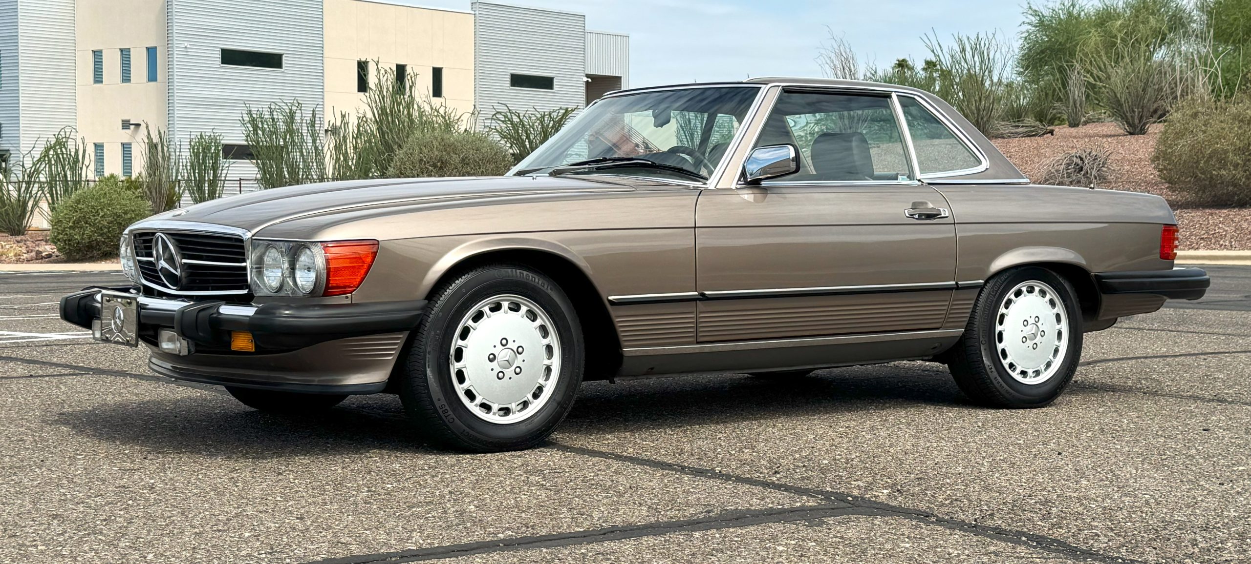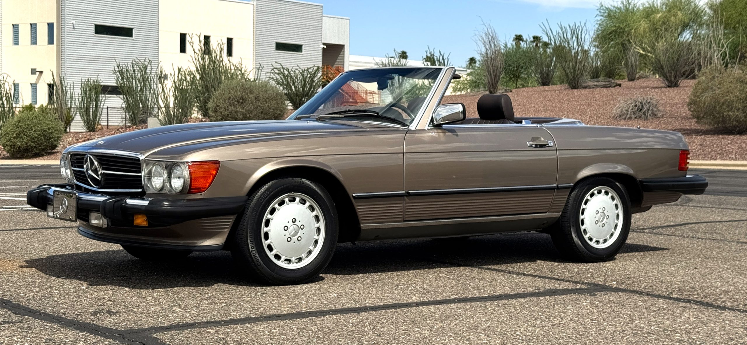 Offered in very good cosmetic and mechanical condition, this 1989 Mercedes-Benz 560SL is a last-year R107 with documented mileage of 84,000 miles, service log, and desirable factory color combination. The 1989 Mercedes-Benz 560SL represents the final year of production for the celebrated R107 series. Finished in Desert Taupe Metallic, (code 441) with Brazil Brown leather, and complete with both soft and hard tops, this well-preserved roadster is equally suited for relaxed touring or classic daily use.