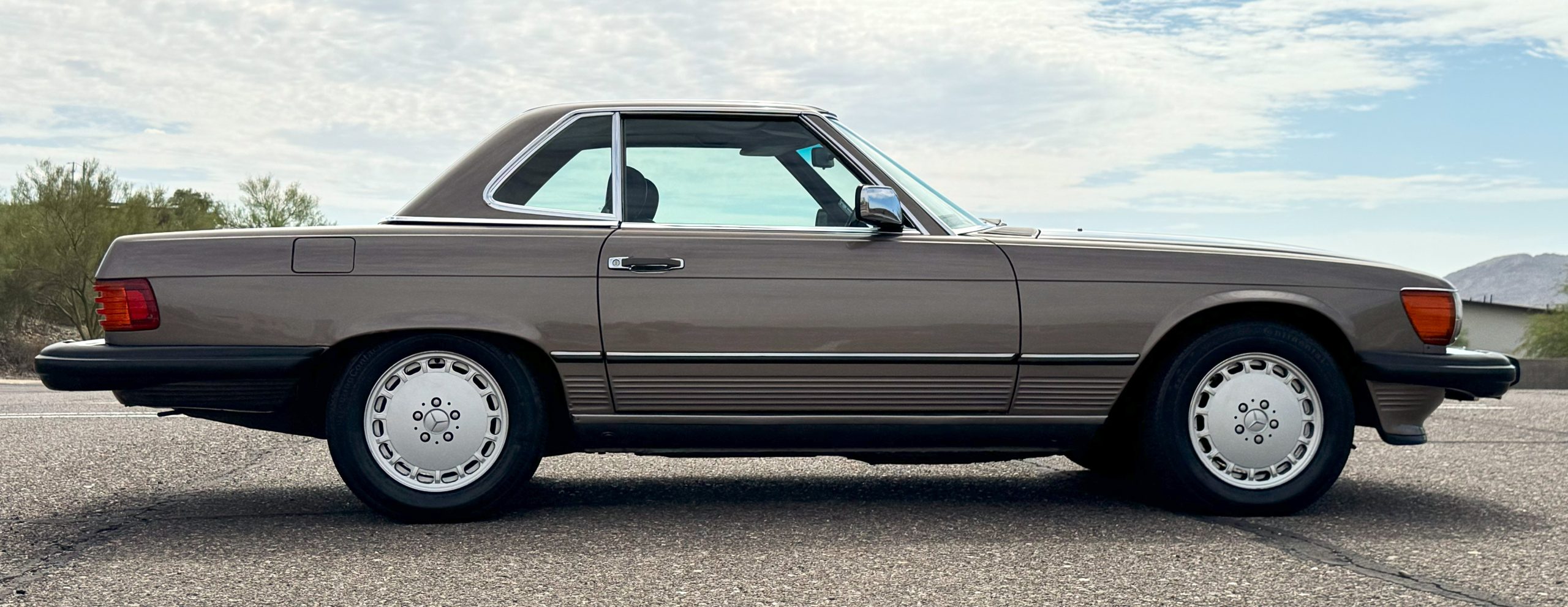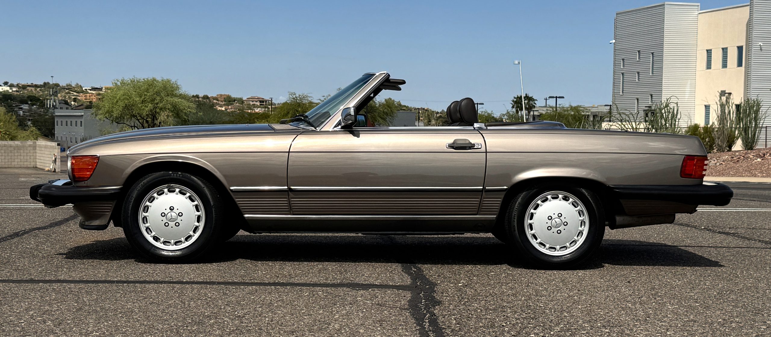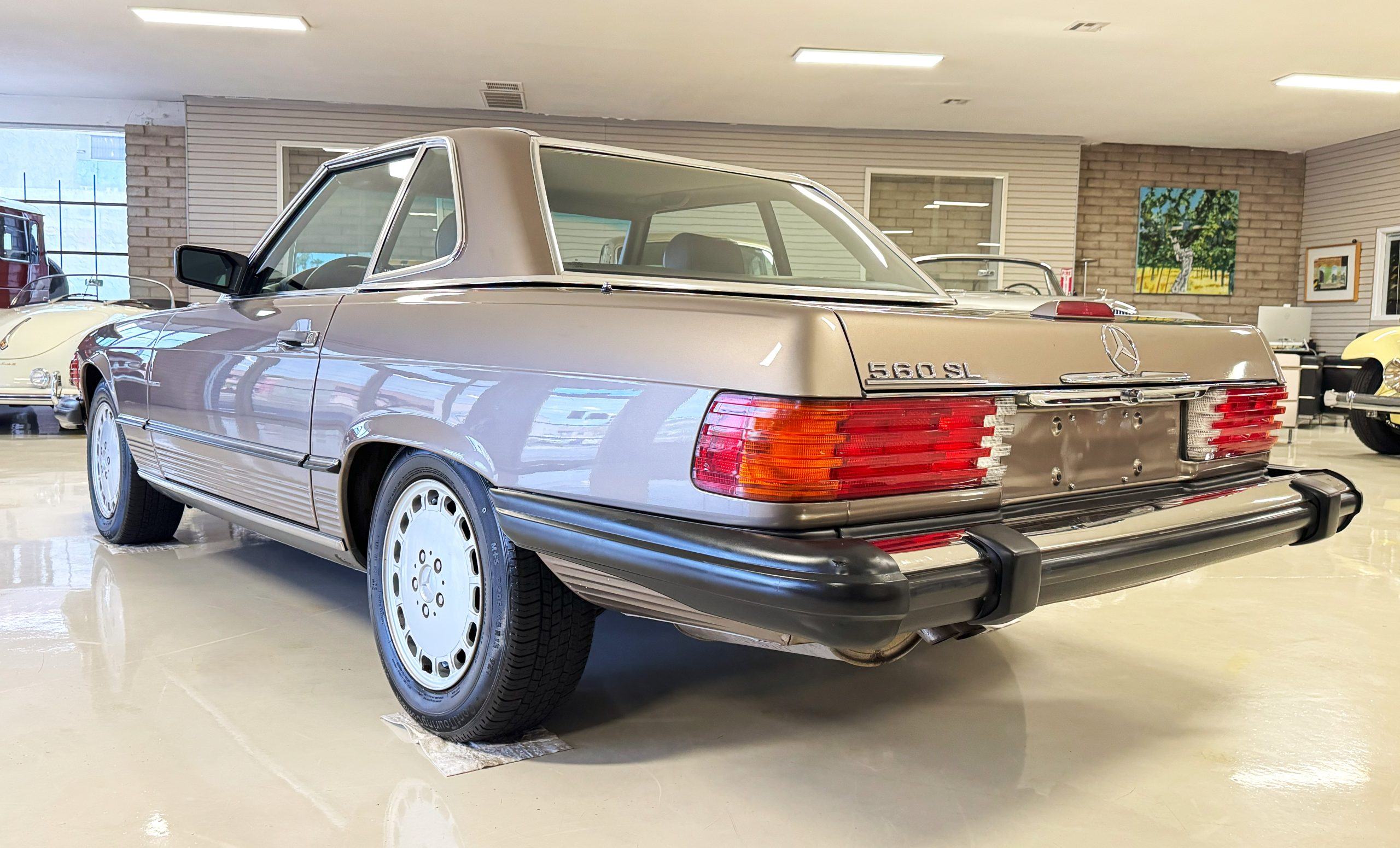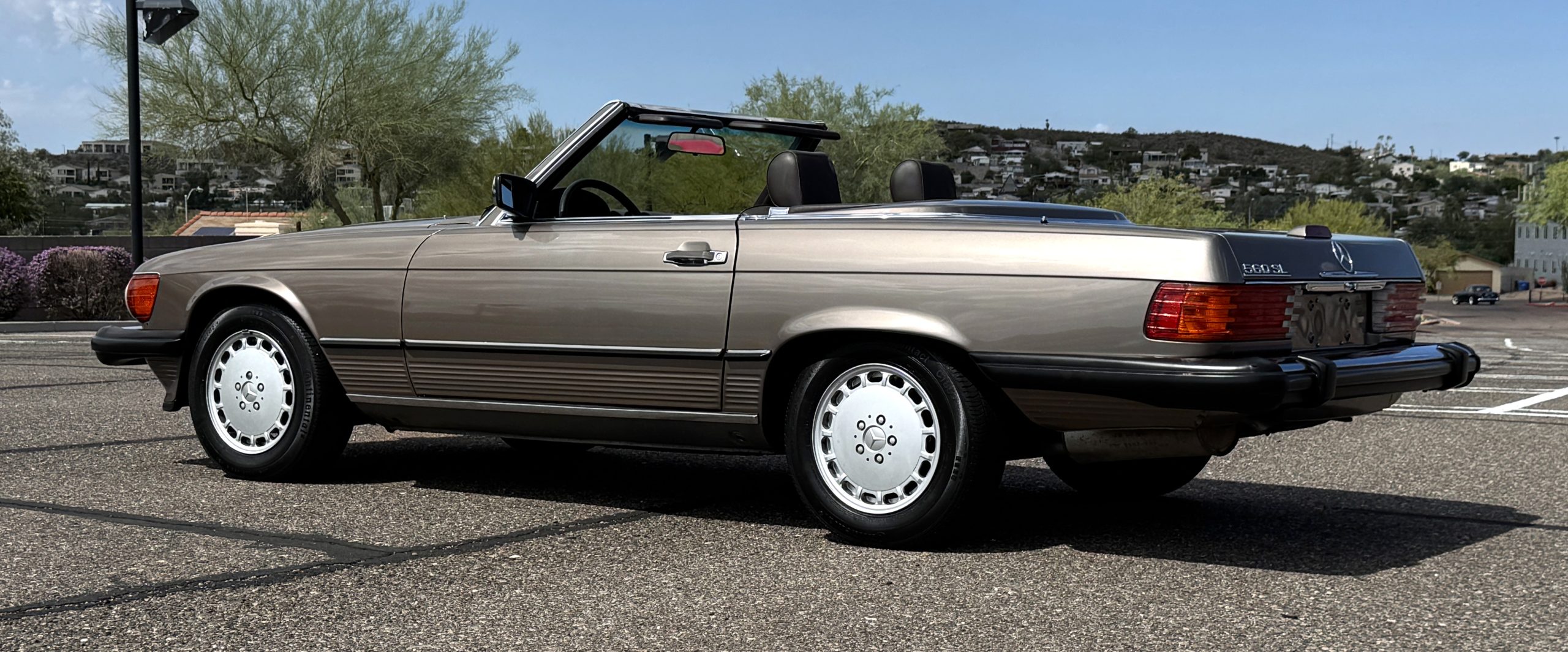 Offered in very good cosmetic and mechanical condition, this 1989 Mercedes-Benz 560SL is a last-year R107 with documented mileage of 84,000 miles, service log, and desirable factory color combination. The 1989 Mercedes-Benz 560SL represents the final year of production for the celebrated R107 series. Finished in Desert Taupe Metallic, (code 441) with Brazil Brown leather, and complete with both soft and hard tops, this well-preserved roadster is equally suited for relaxed touring or classic daily use.