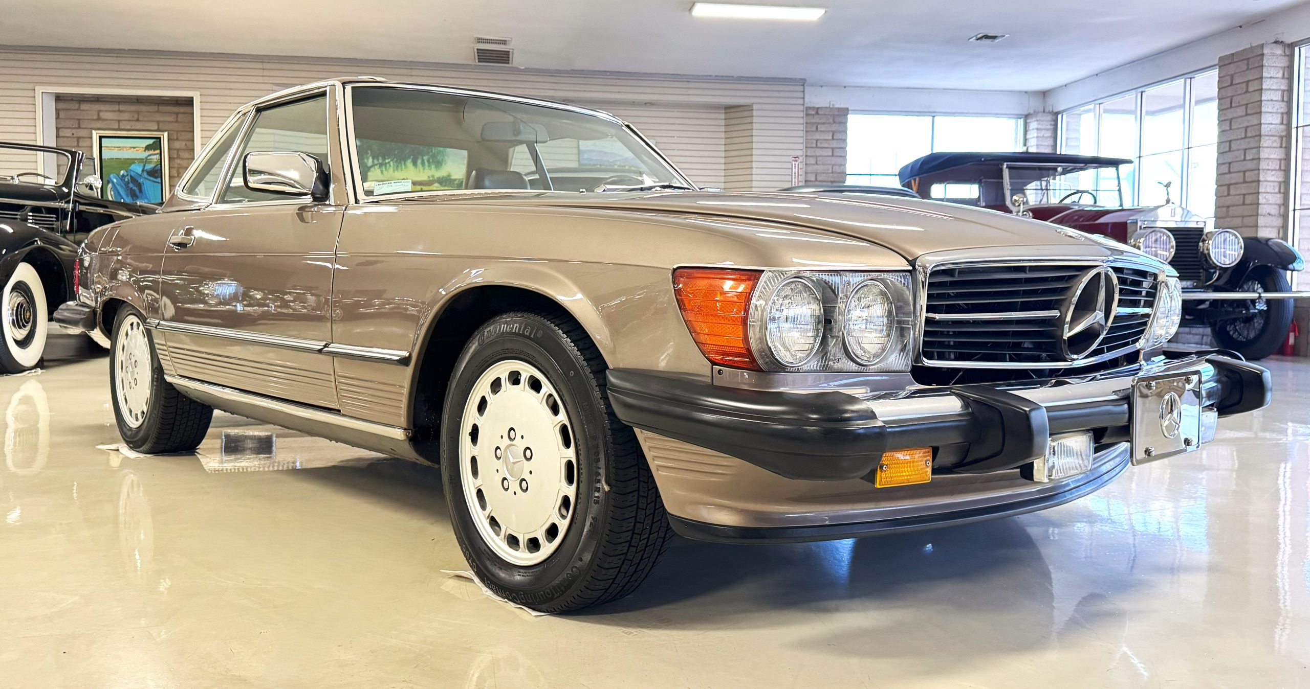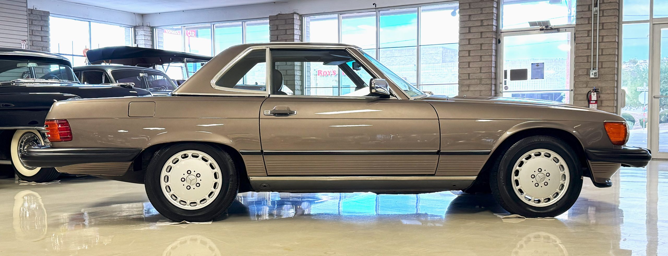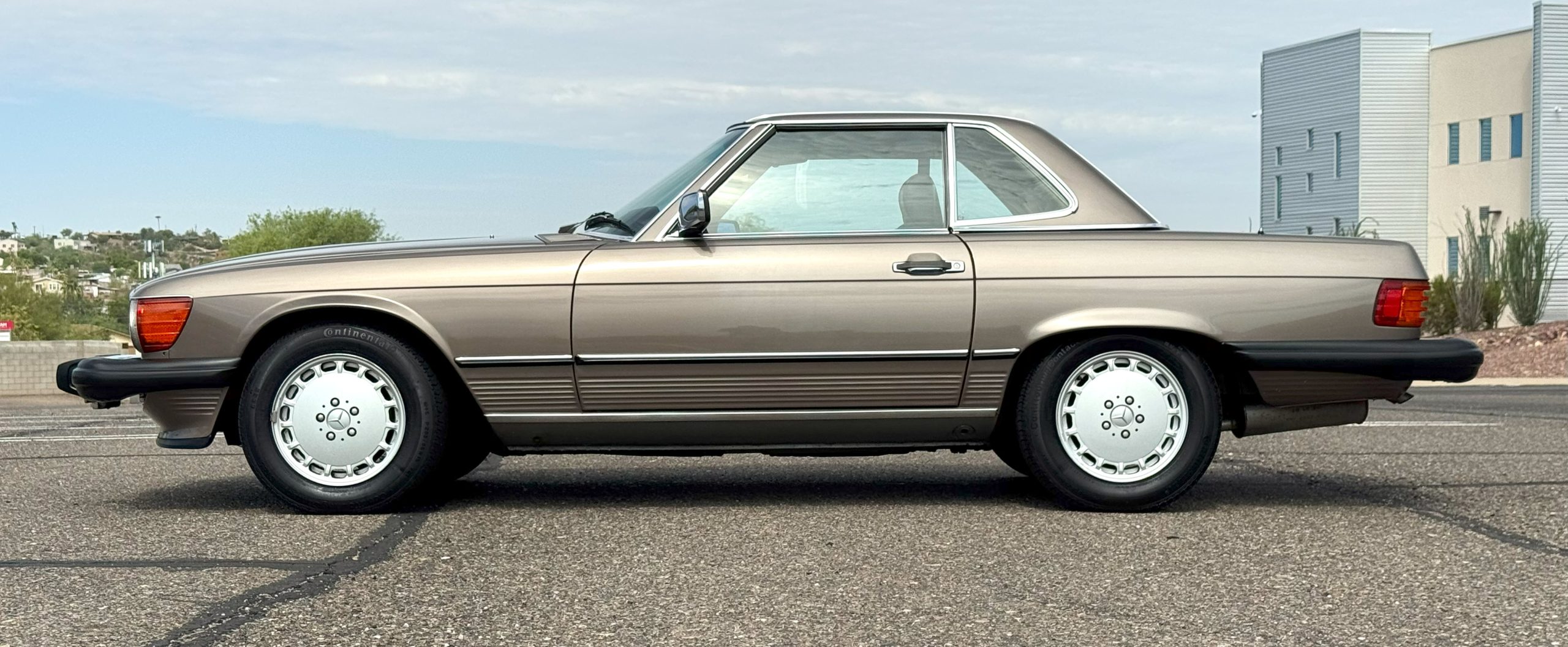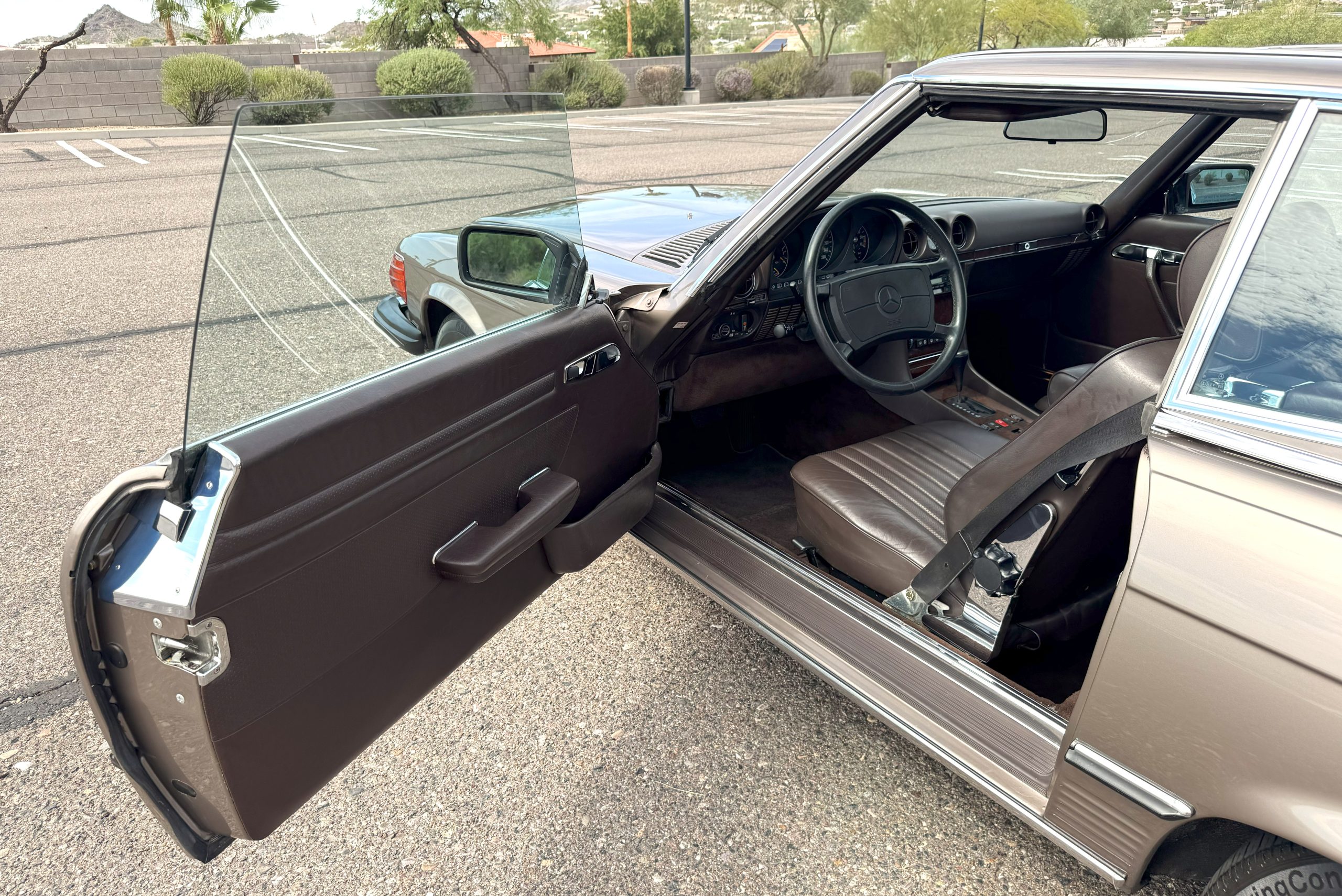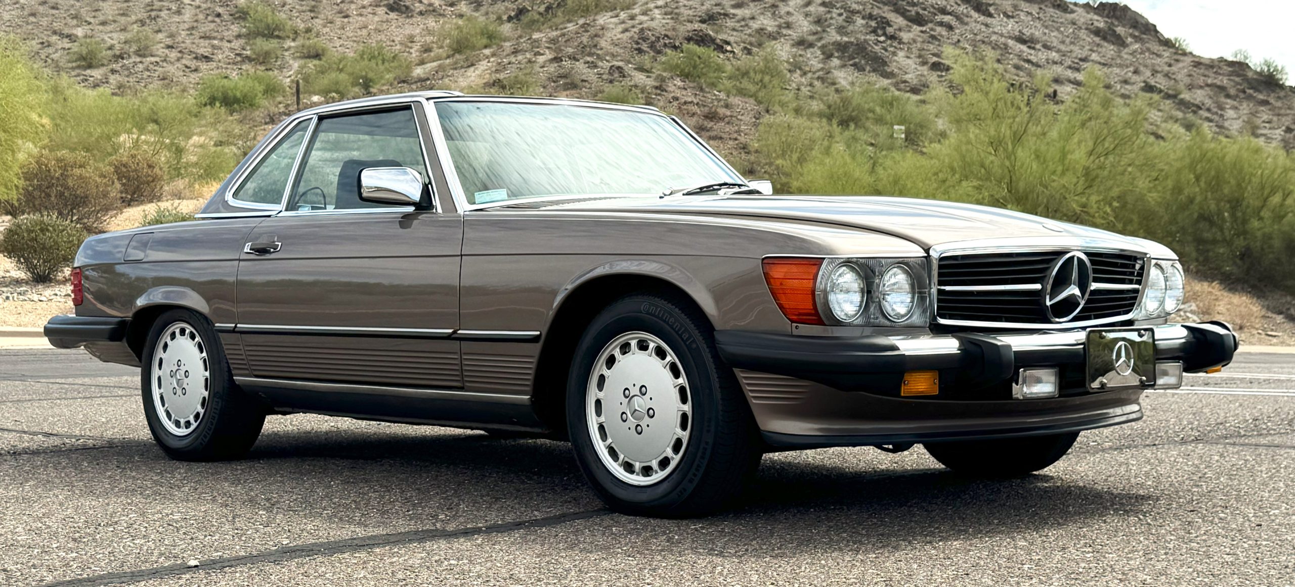 Offered in very good cosmetic and mechanical condition, this 1989 Mercedes-Benz 560SL is a last-year R107 with documented mileage of 84,000 miles, service log, and desirable factory color combination. The 1989 Mercedes-Benz 560SL represents the final year of production for the celebrated R107 series. Finished in Desert Taupe Metallic, (code 441) with Brazil Brown leather, and complete with both soft and hard tops, this well-preserved roadster is equally suited for relaxed touring or classic daily use.
