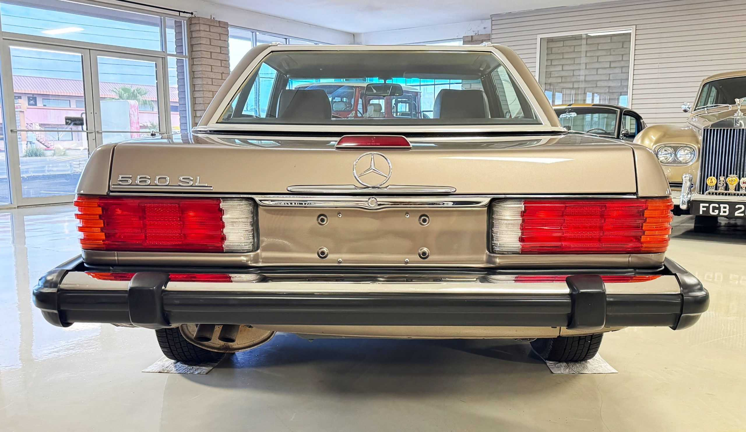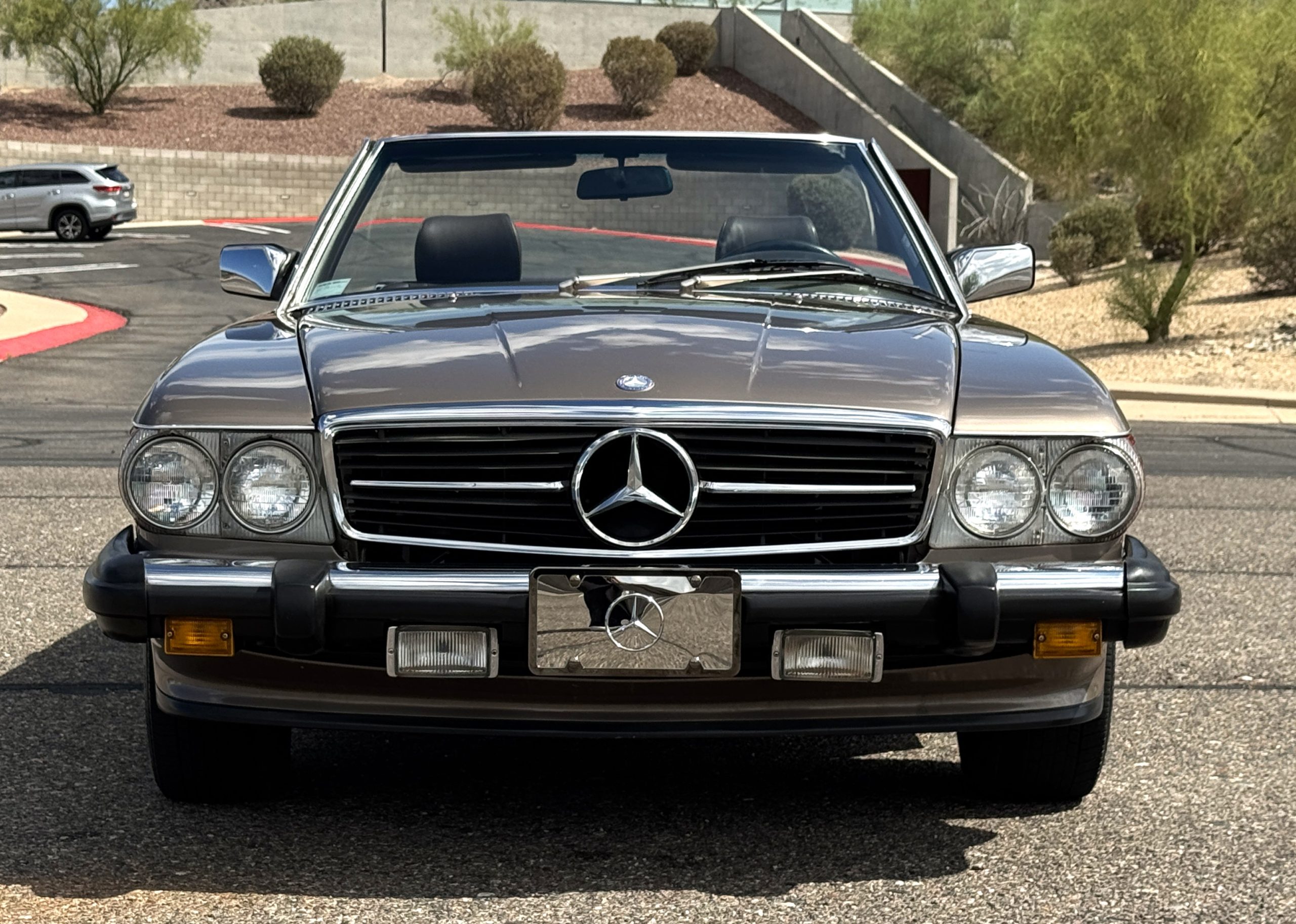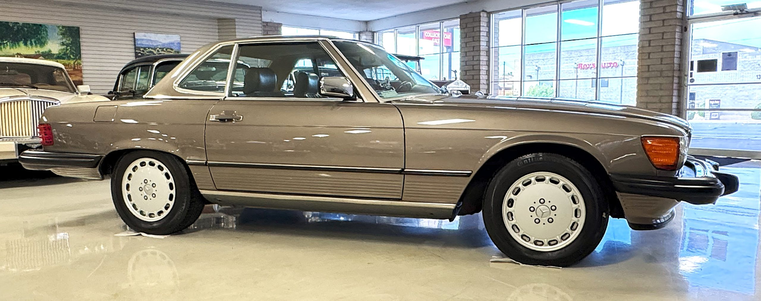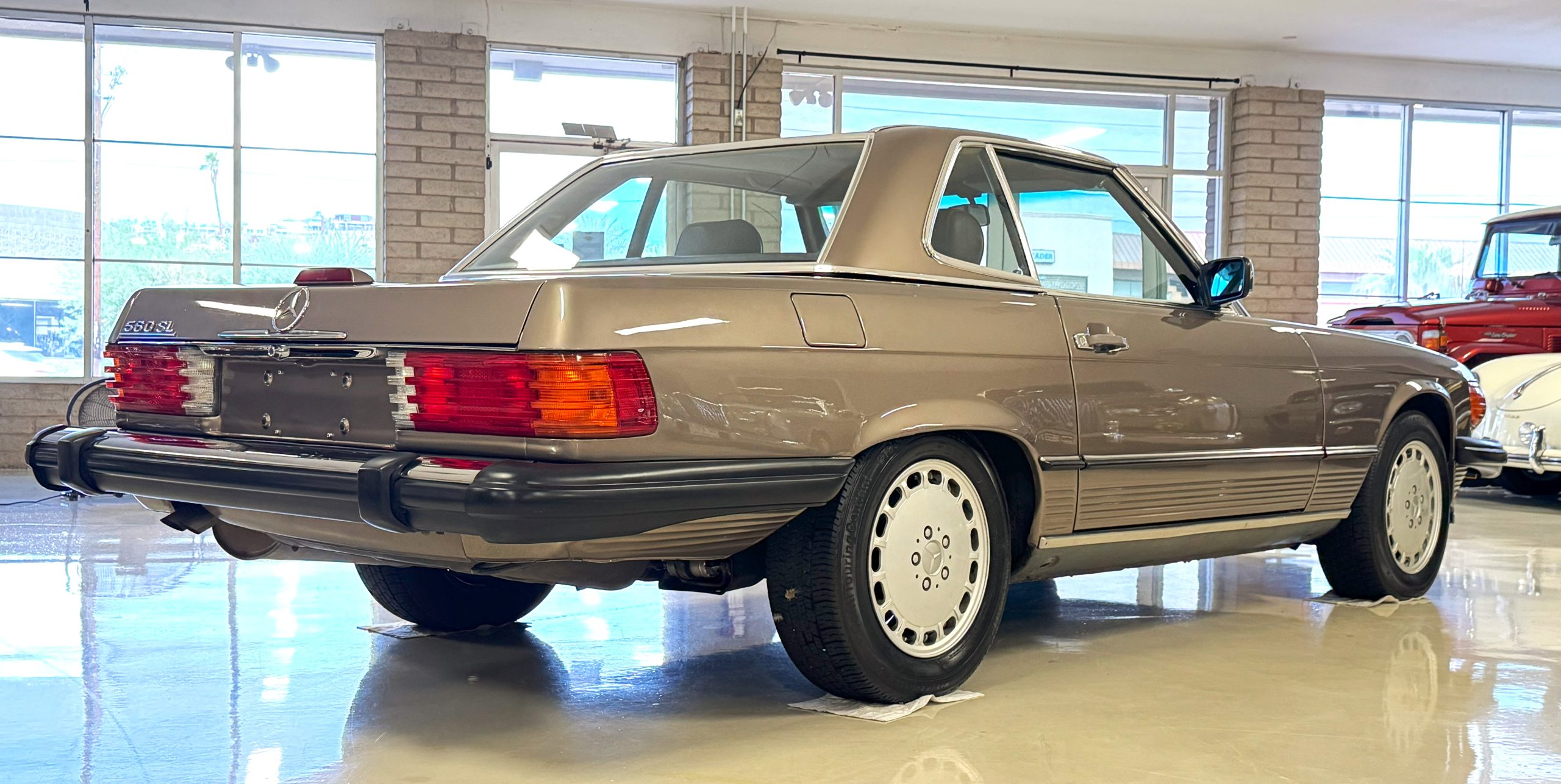Offered in very good cosmetic and mechanical condition, this 1989 Mercedes-Benz 560SL is a last-year R107 with documented mileage of 84,000 miles, service log, and desirable factory color combination. The 1989 Mercedes-Benz 560SL represents the final year of production for the celebrated R107 series. Finished in Desert Taupe Metallic, (code 441) with Brazil Brown leather, and complete with both soft and hard tops, this well-preserved roadster is equally suited for relaxed touring or classic daily use.