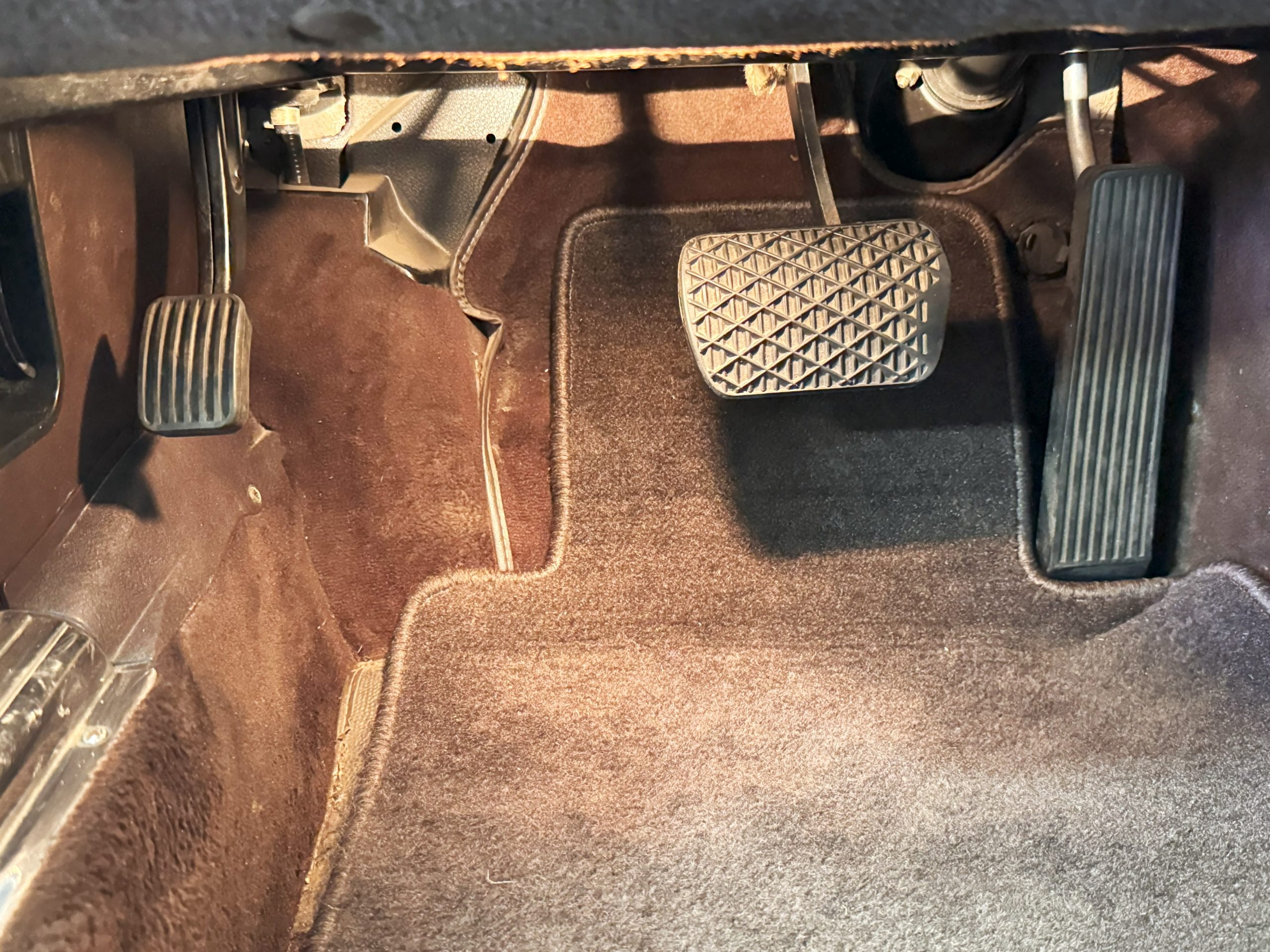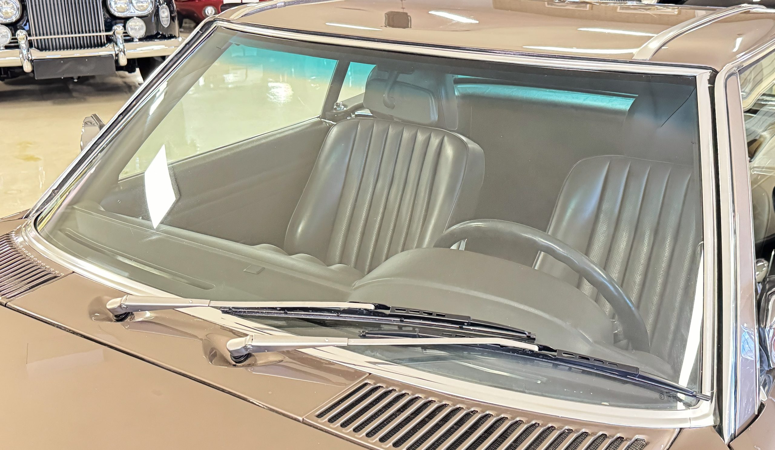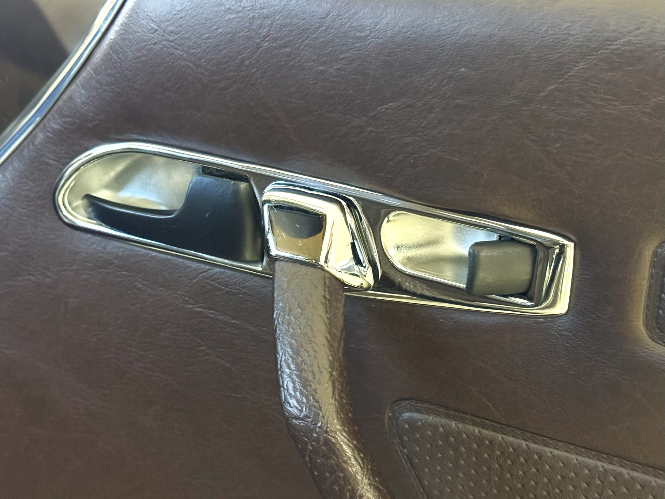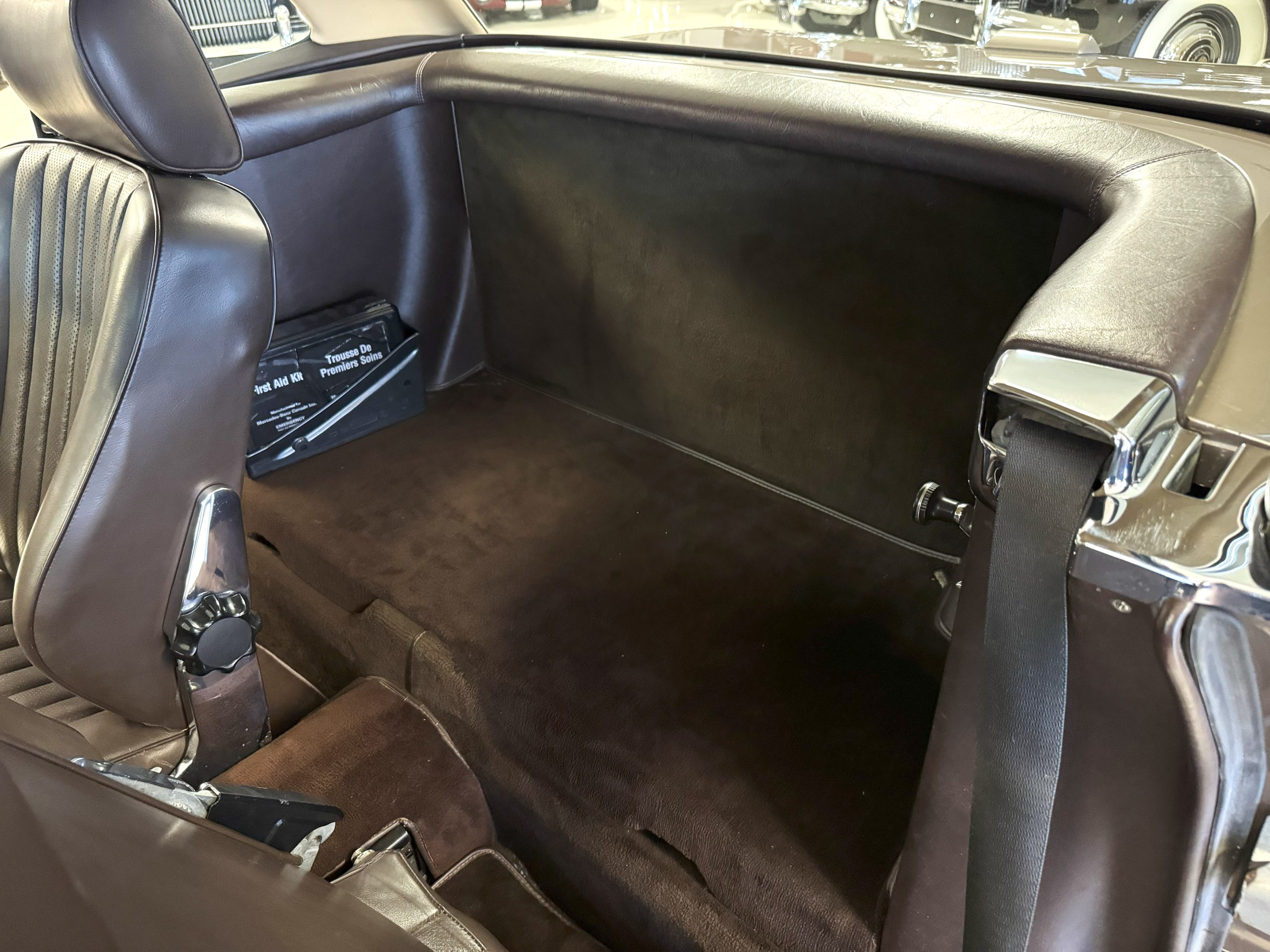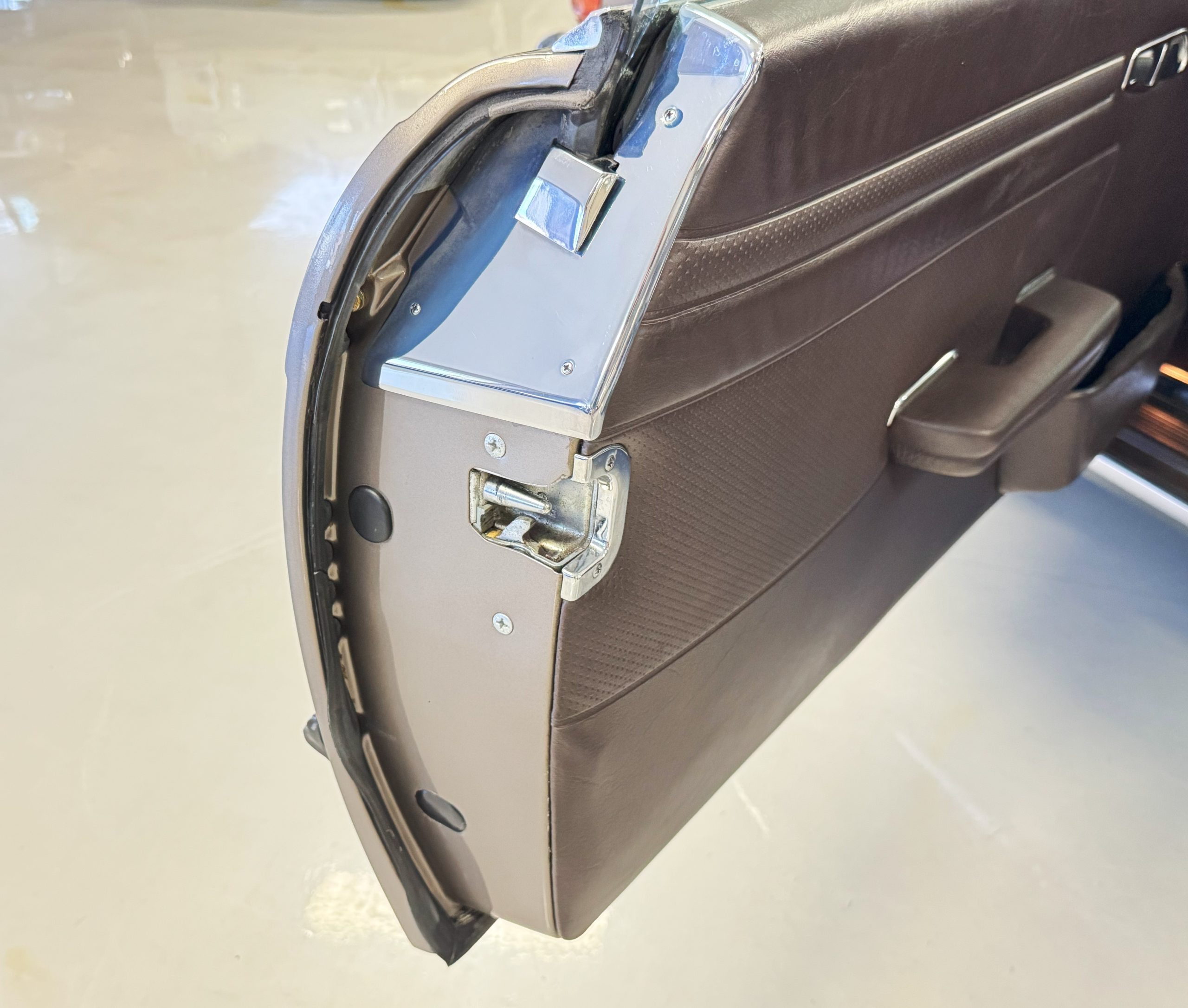 The exterior is presented in Impala Brown, a rich metallic shade marketed in the U.S. as Desert Taupe Metallic. The paint retains an attractive luster overall in great condition, with a couple small touched-up spots on the hood visible under close inspection. The chrome trim is in great condition with some wear showing in high use areas. The Brown convertible soft top and the Impala Brown hard tops are present and in great condition. The exterior presents in great condition overall.