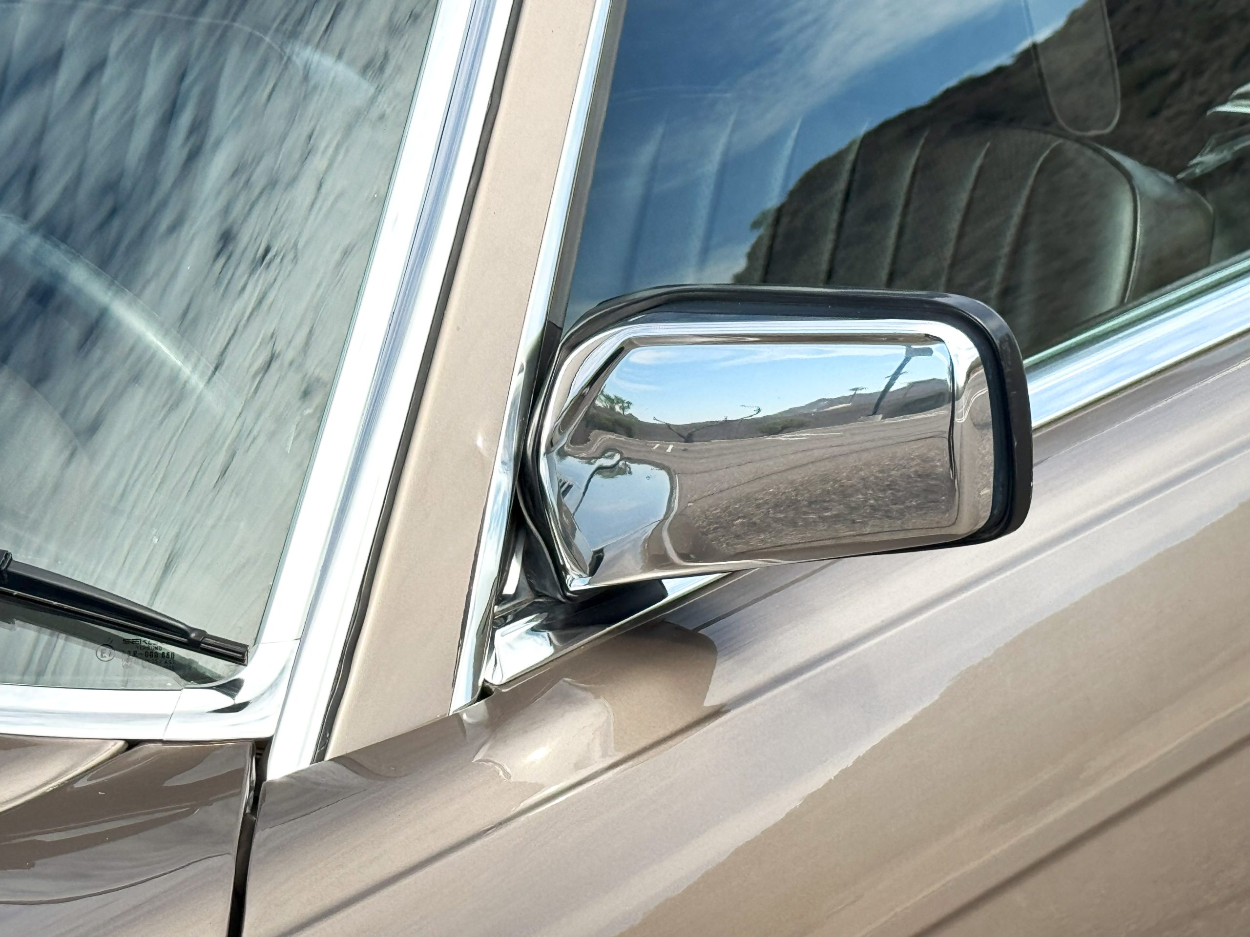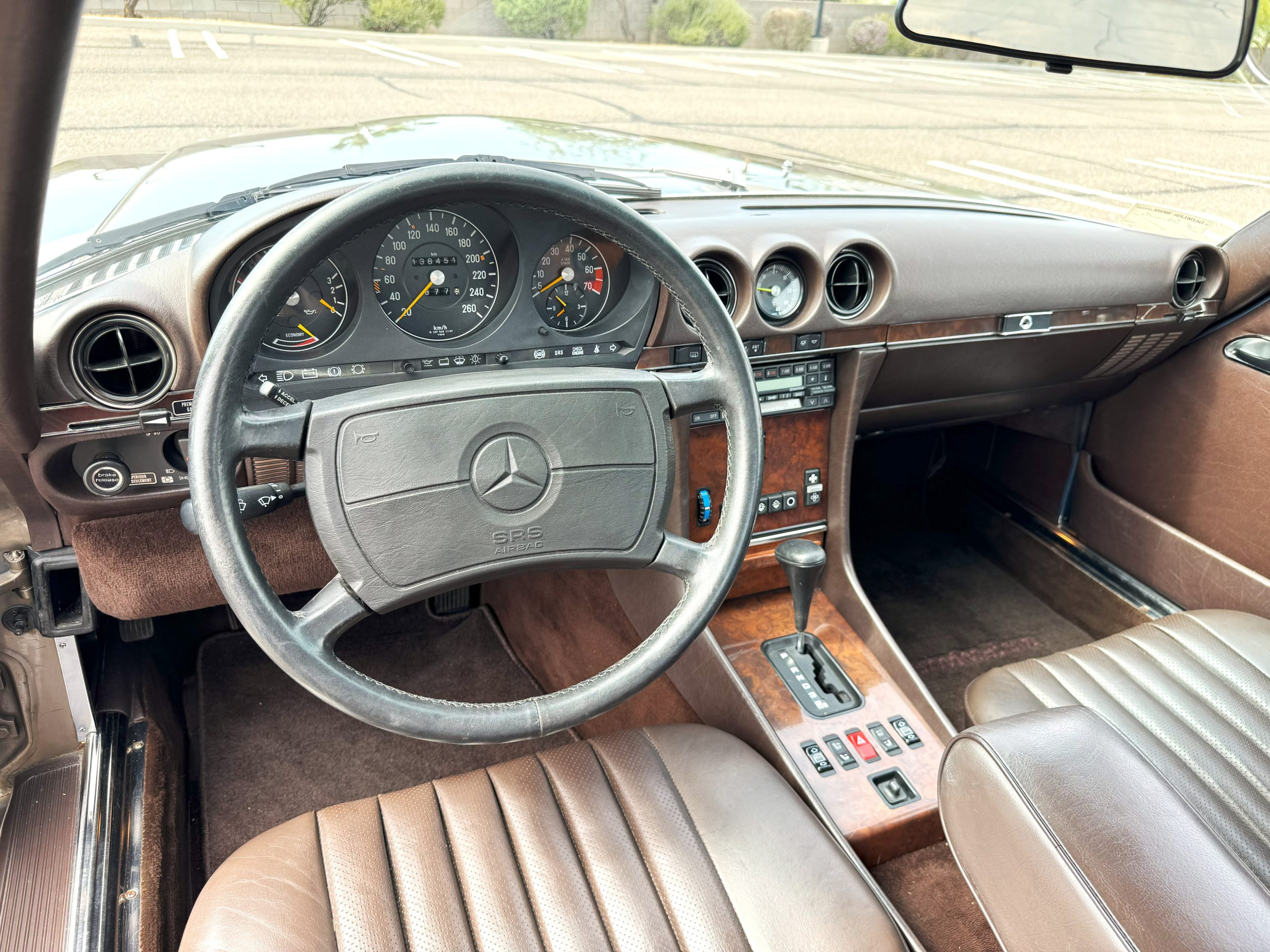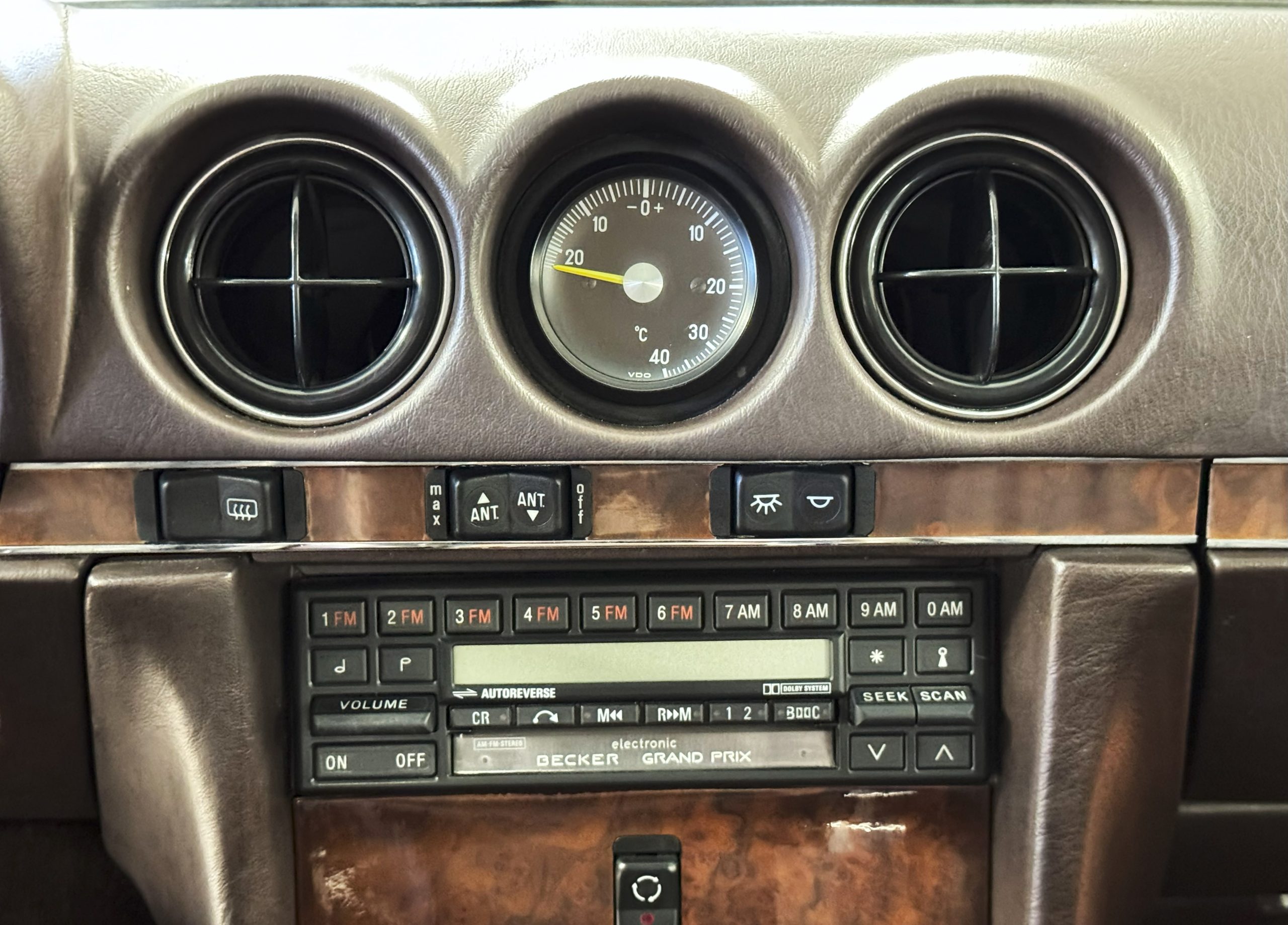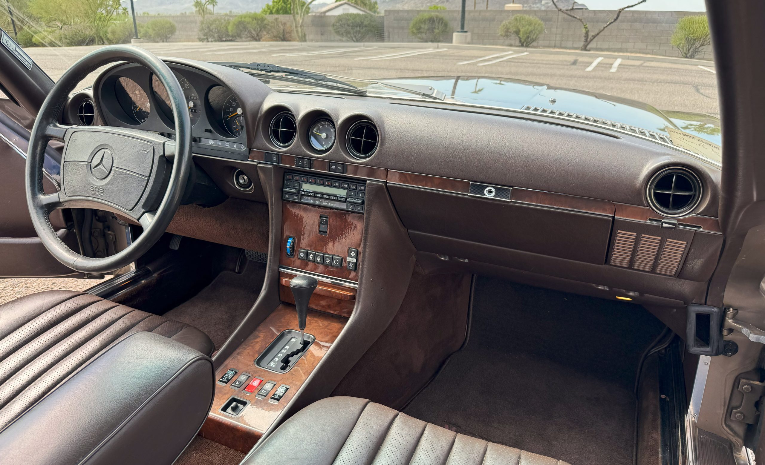 Inside, the Mercedes-Benz features Brazil Brown leather upholstery with matching carpets and mats, all in great condition. The driver’s headrest shows light wear and discoloration on one side, but otherwise the seats remain supple and free of damage. The Mercedes-Benz includes automatic climate control with functioning air conditioning, Becker Grand Prix AM/FM cassette stereo, electric windows, central locking, heated seats, cruise control, and a driver’s airbag. The dashboard, trim, and controls present well and are in great condition. The interior remains highly original, reflecting the understated luxury for which the 560SL is admired.
