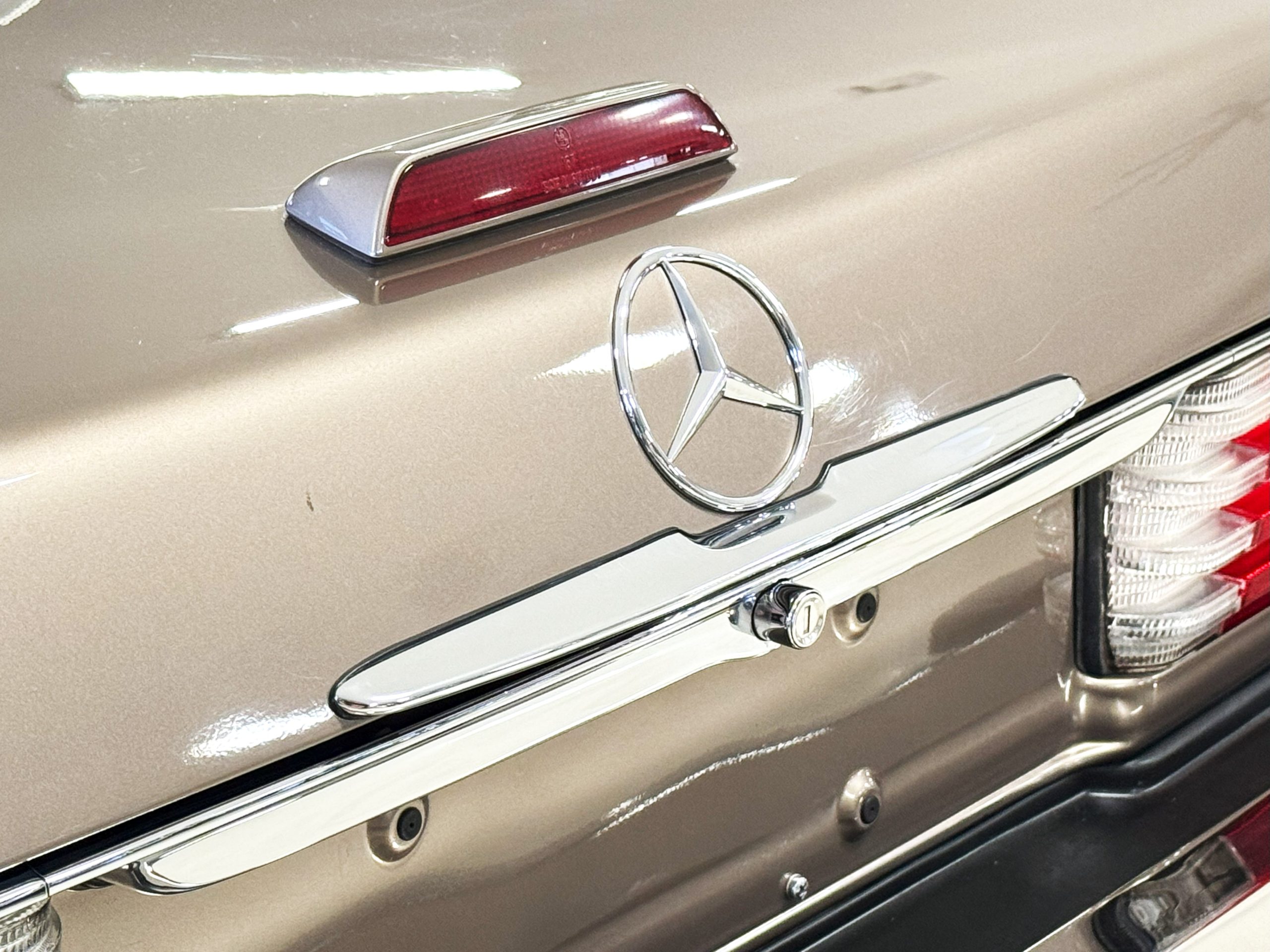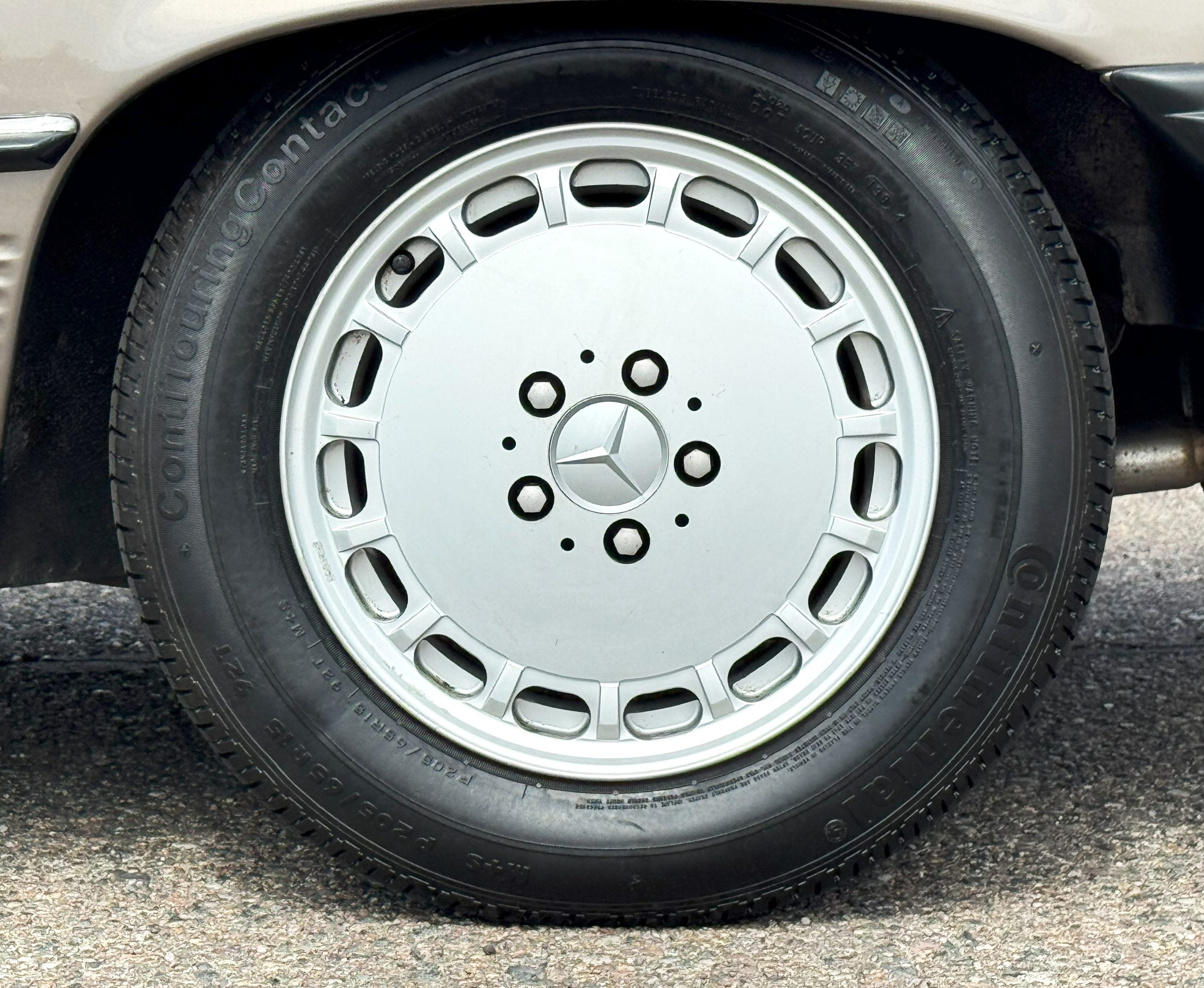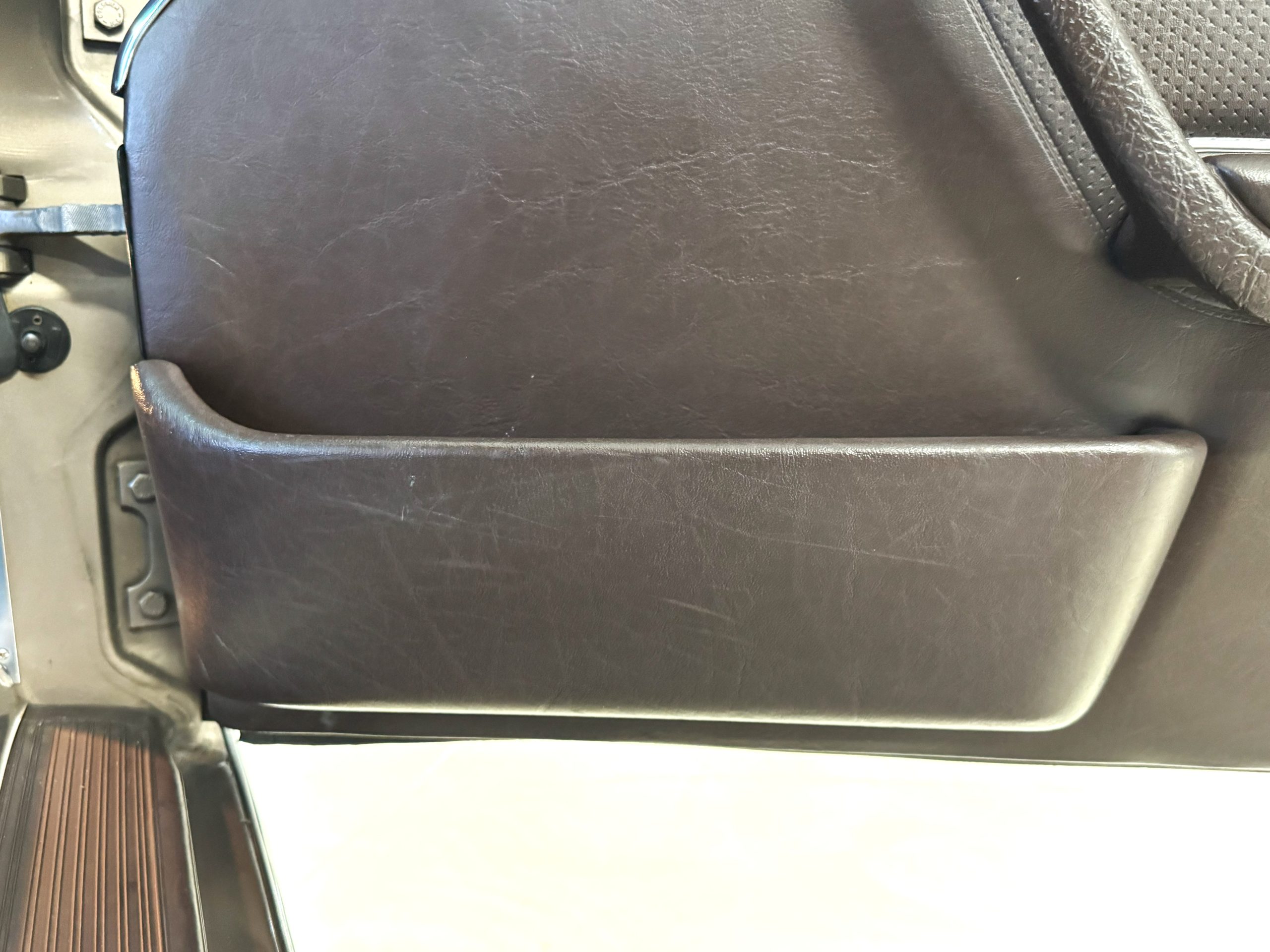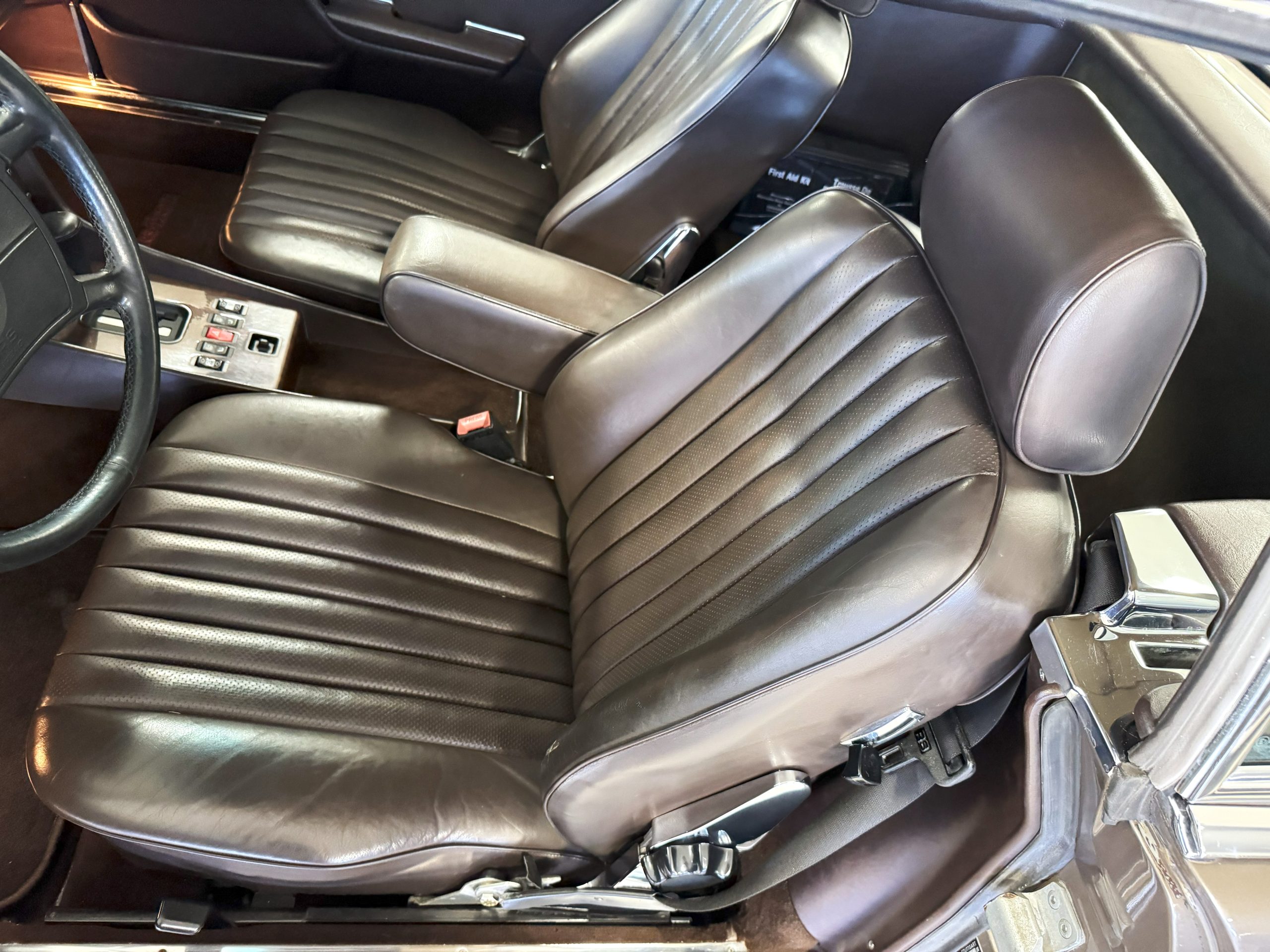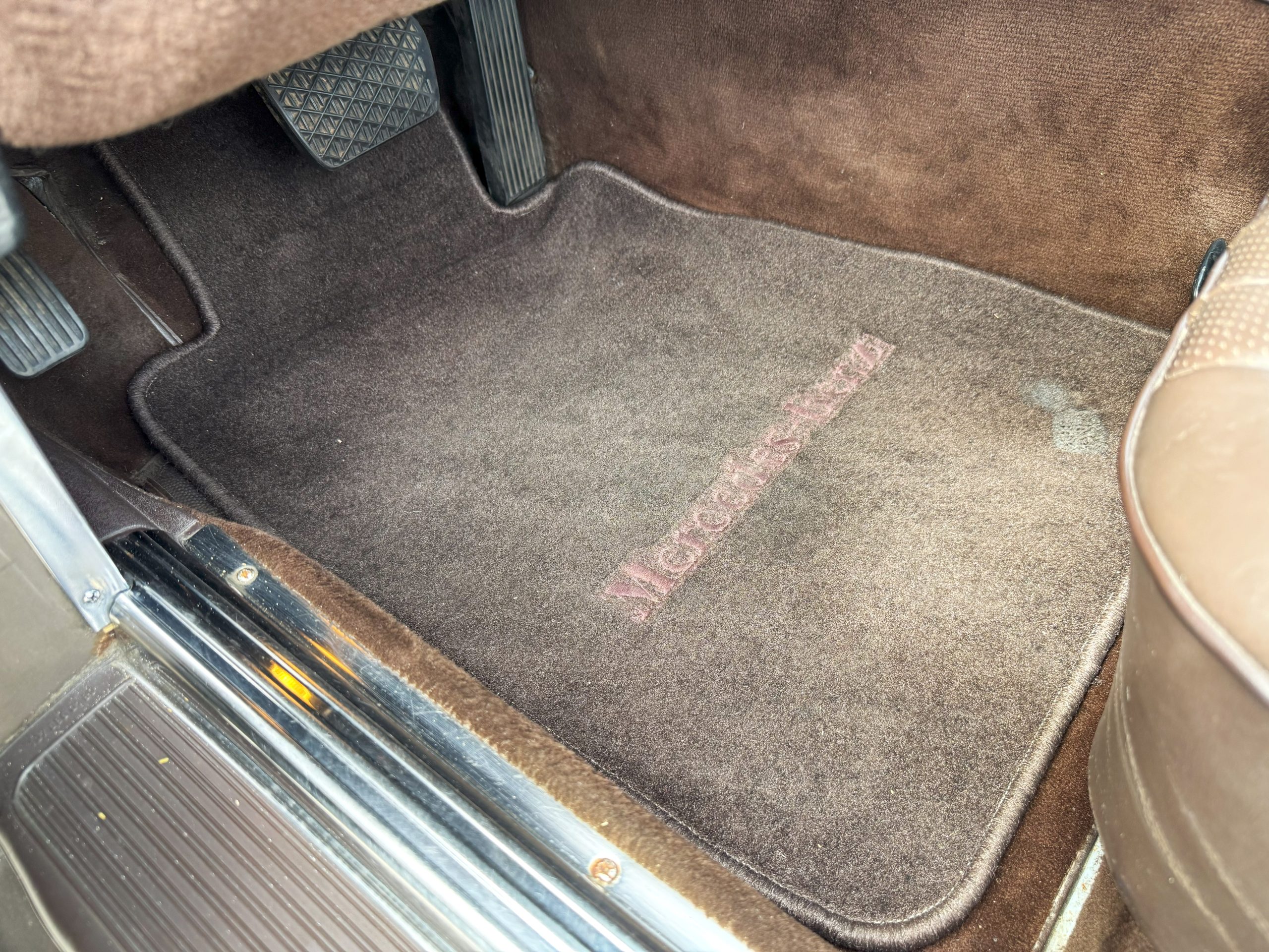 Inside, the Mercedes-Benz features Brazil Brown leather upholstery with matching carpets and mats, all in great condition. The driver’s headrest shows light wear and discoloration on one side, but otherwise the seats remain supple and free of damage. The Mercedes-Benz includes automatic climate control with functioning air conditioning, Becker Grand Prix AM/FM cassette stereo, electric windows, central locking, heated seats, cruise control, and a driver’s airbag. The dashboard, trim, and controls present well and are in great condition. The interior remains highly original, reflecting the understated luxury for which the 560SL is admired.