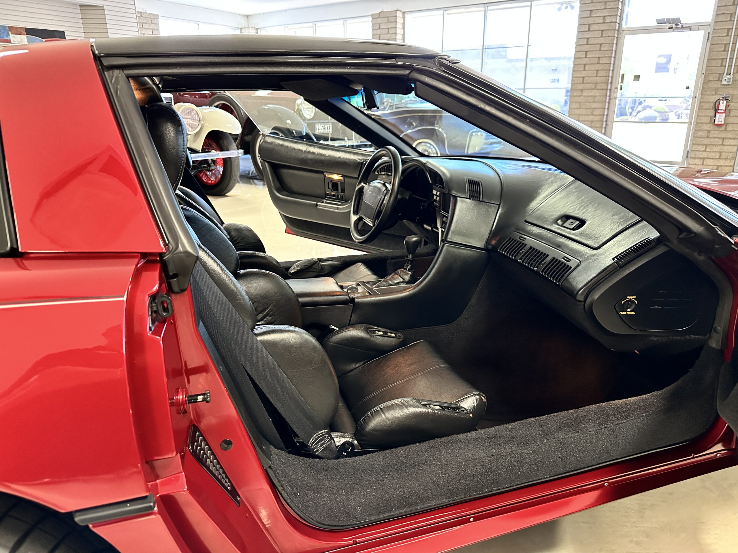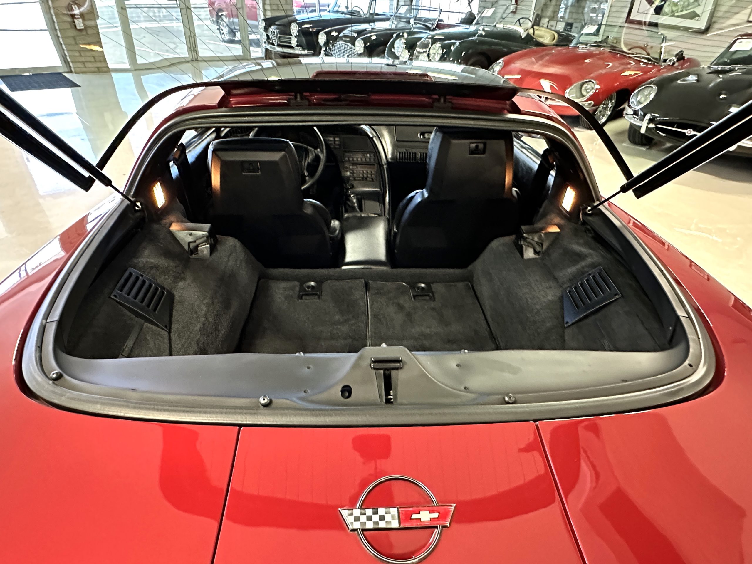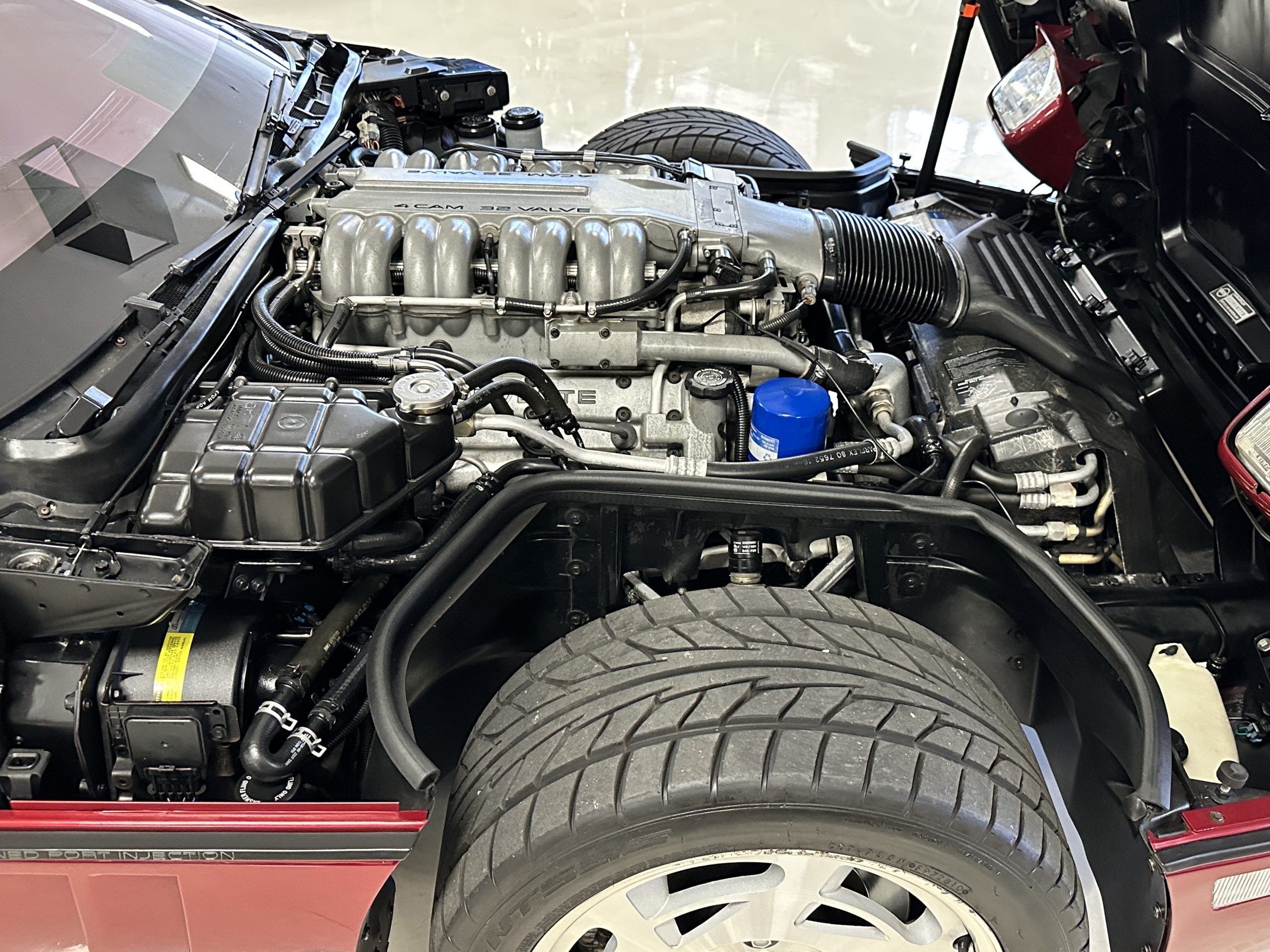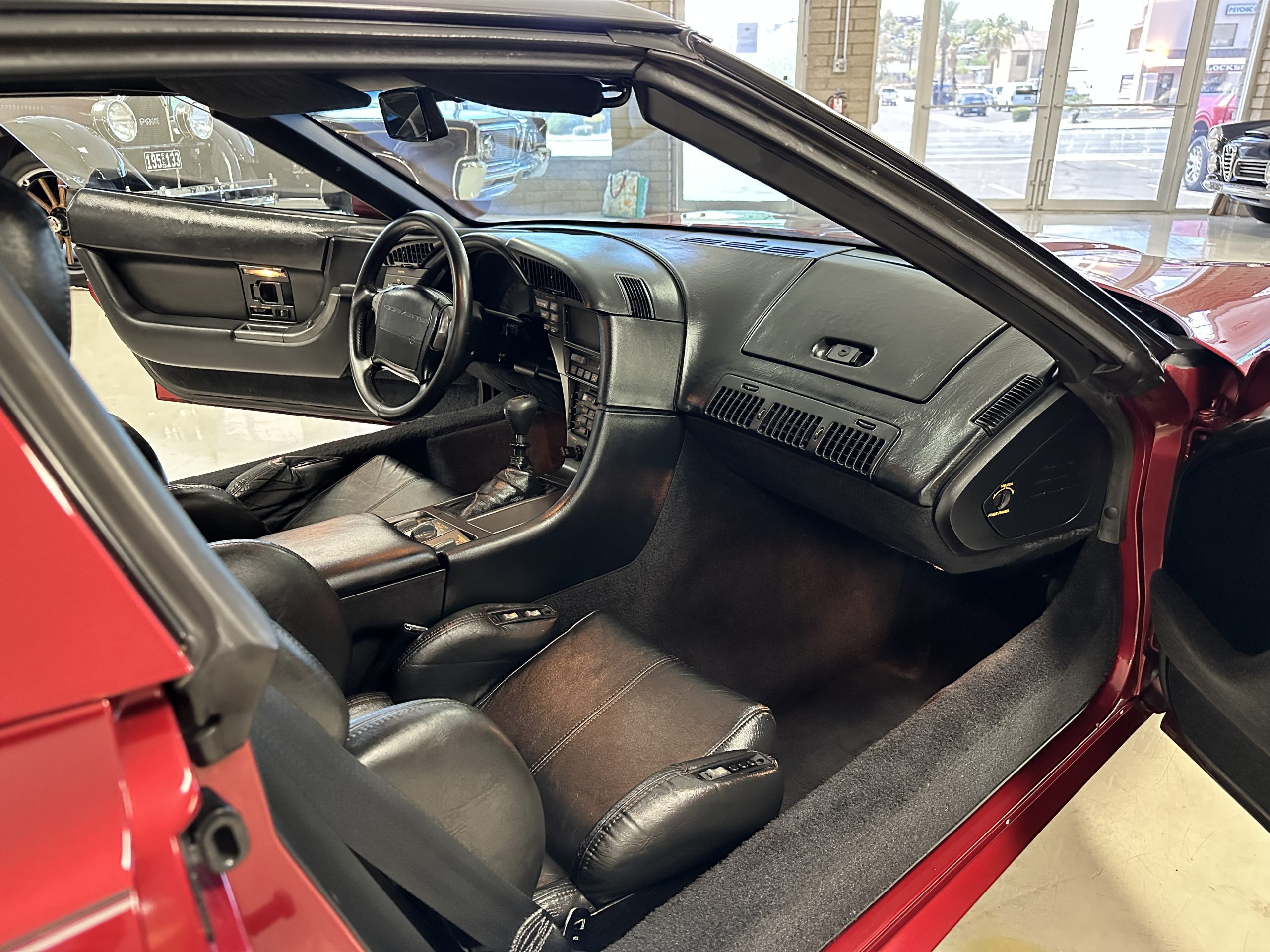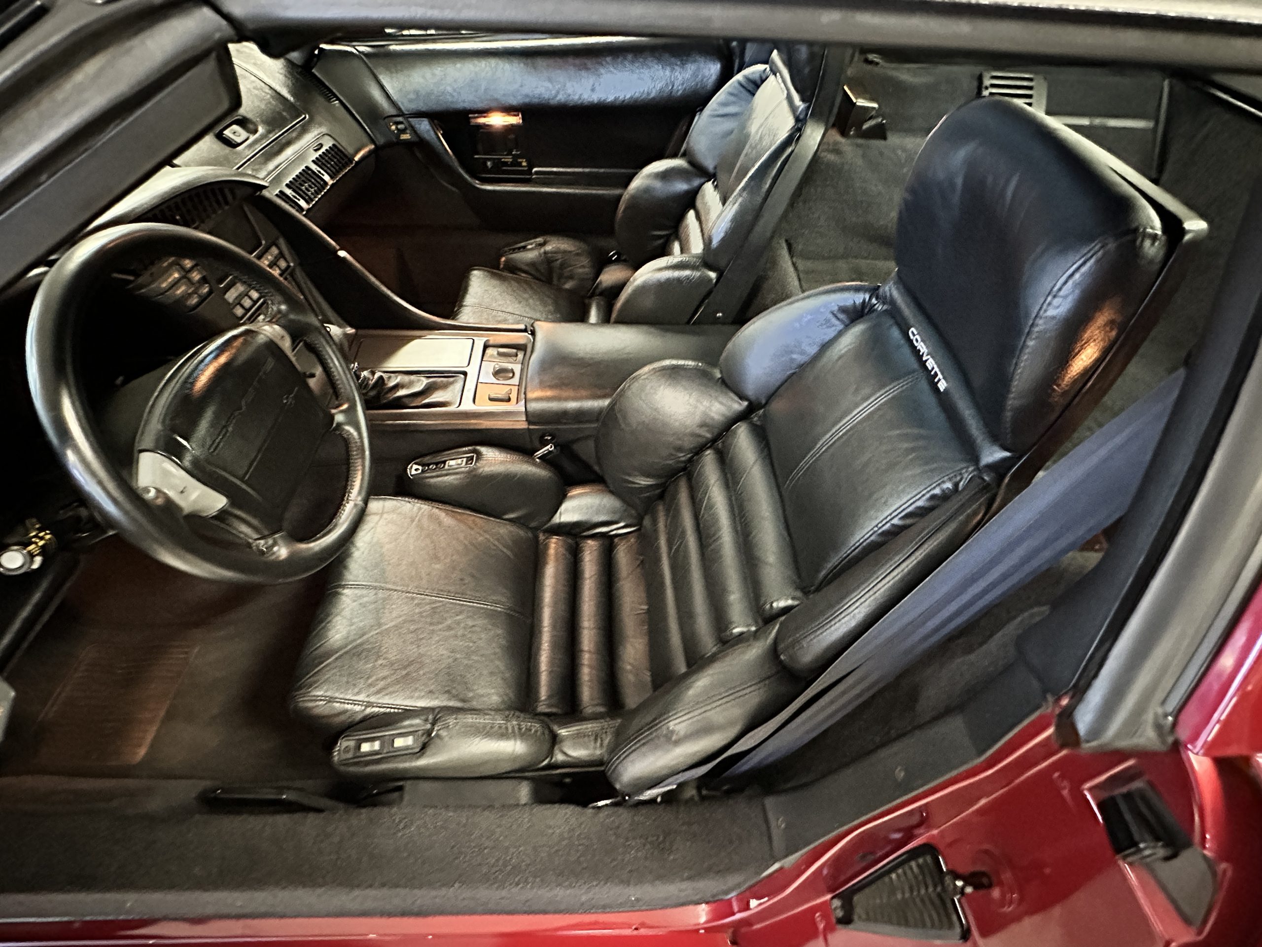 The livery is Dark Red Metallic with beautiful luster and shine. The paint shows very well overall with very few minor imperfections that are nearly unnoticeable and only visible upon very close inspection. The ZR-1 body is unique from the base Corvette in that the body work widens beginning at the leading edge of the doors and culminates in a tail that is 3” broader with a convex rear facia complete with square-lensed taillamps. The ZR-1 moniker is located on the lower right of the facia and will be visible to other drivers as you zoom past them. This additional rear width accommodates the Good Year Eagle P315/35ZR-17 Gatorback tires made specifically for the ZR-1. The cast aluminum “saw blade” wheels are in very nice condition, as is the optional removable roof panel. The ZR-1’s exterior is in beautiful overall condition and shows very well.
