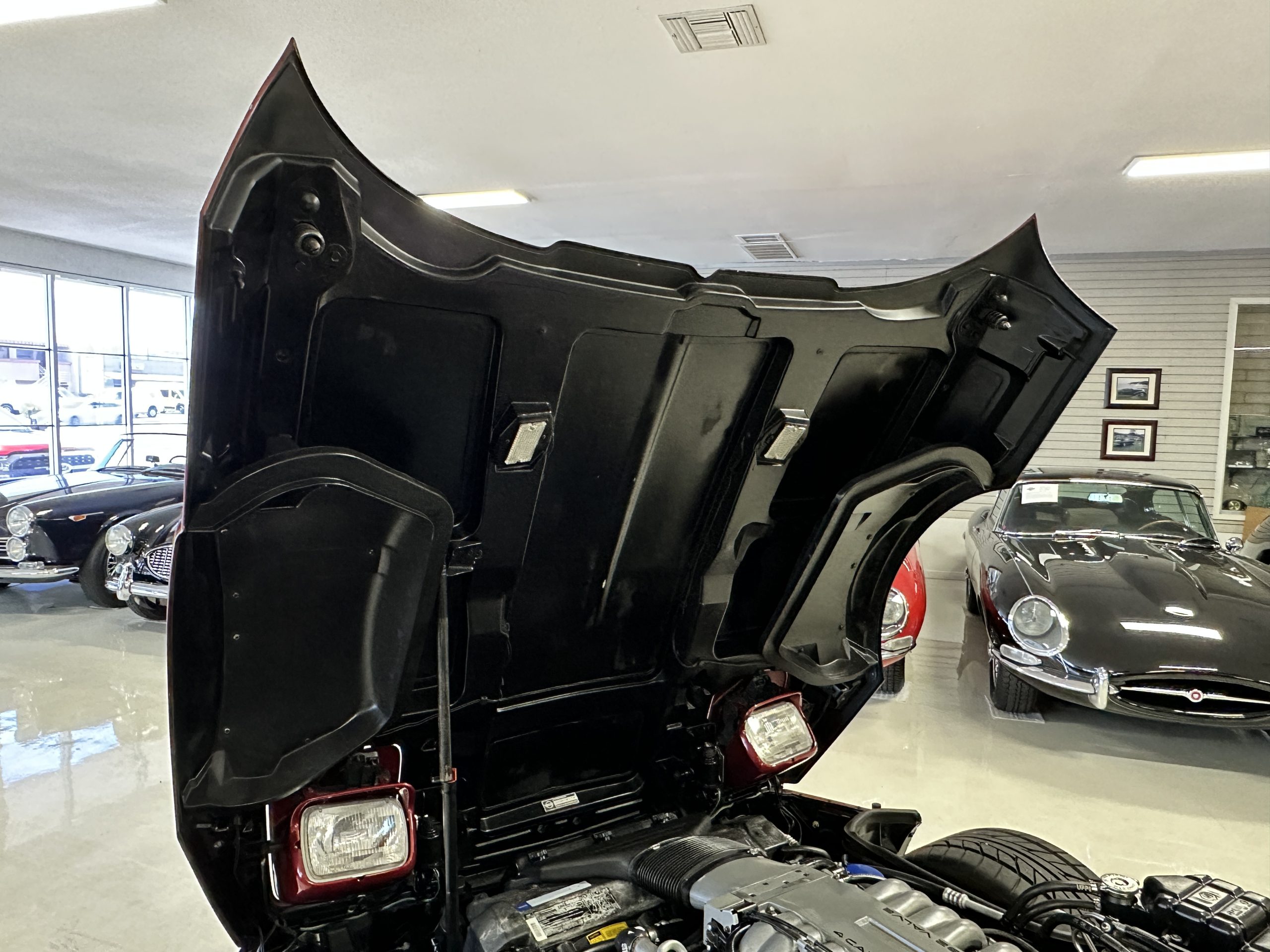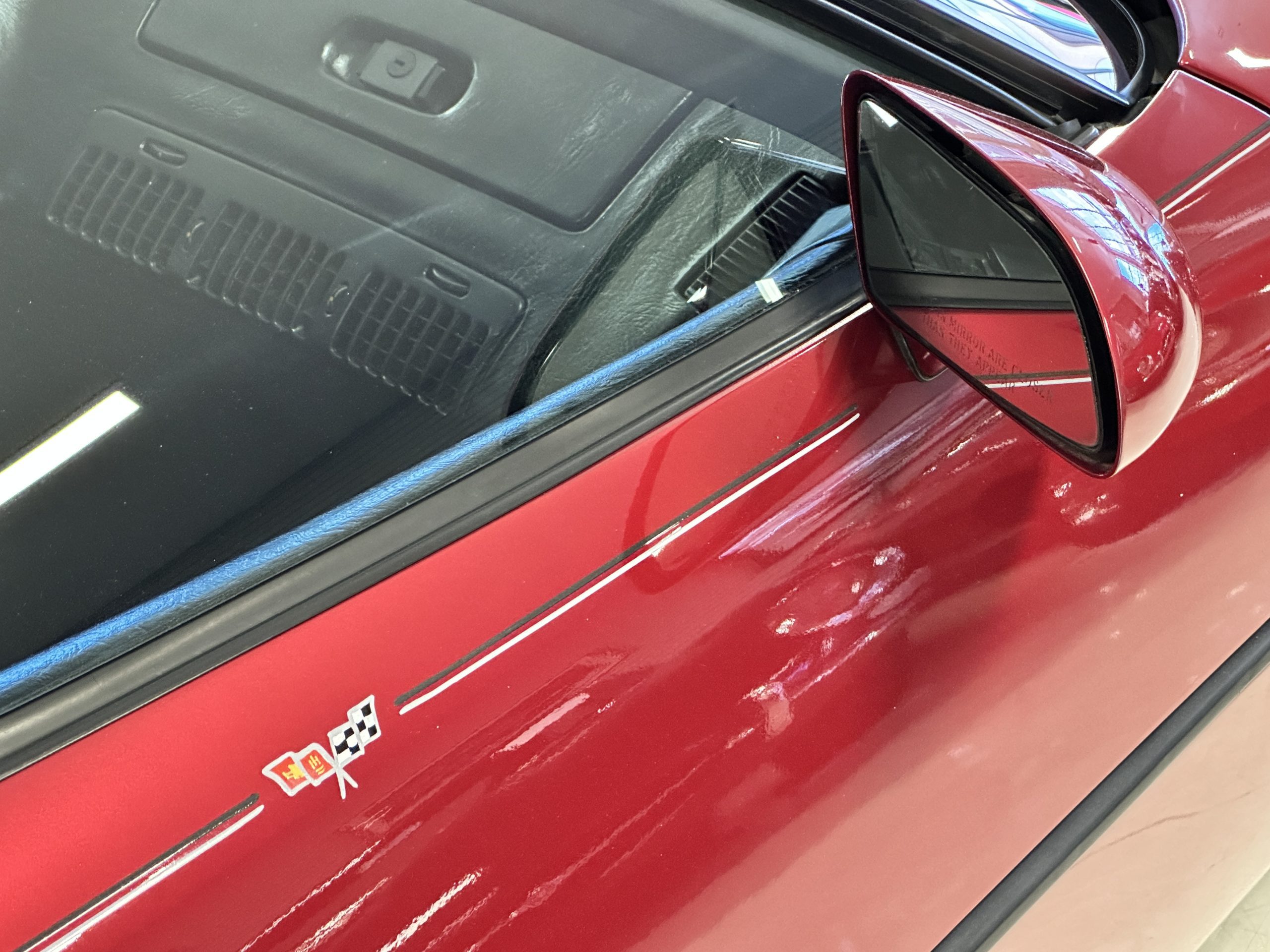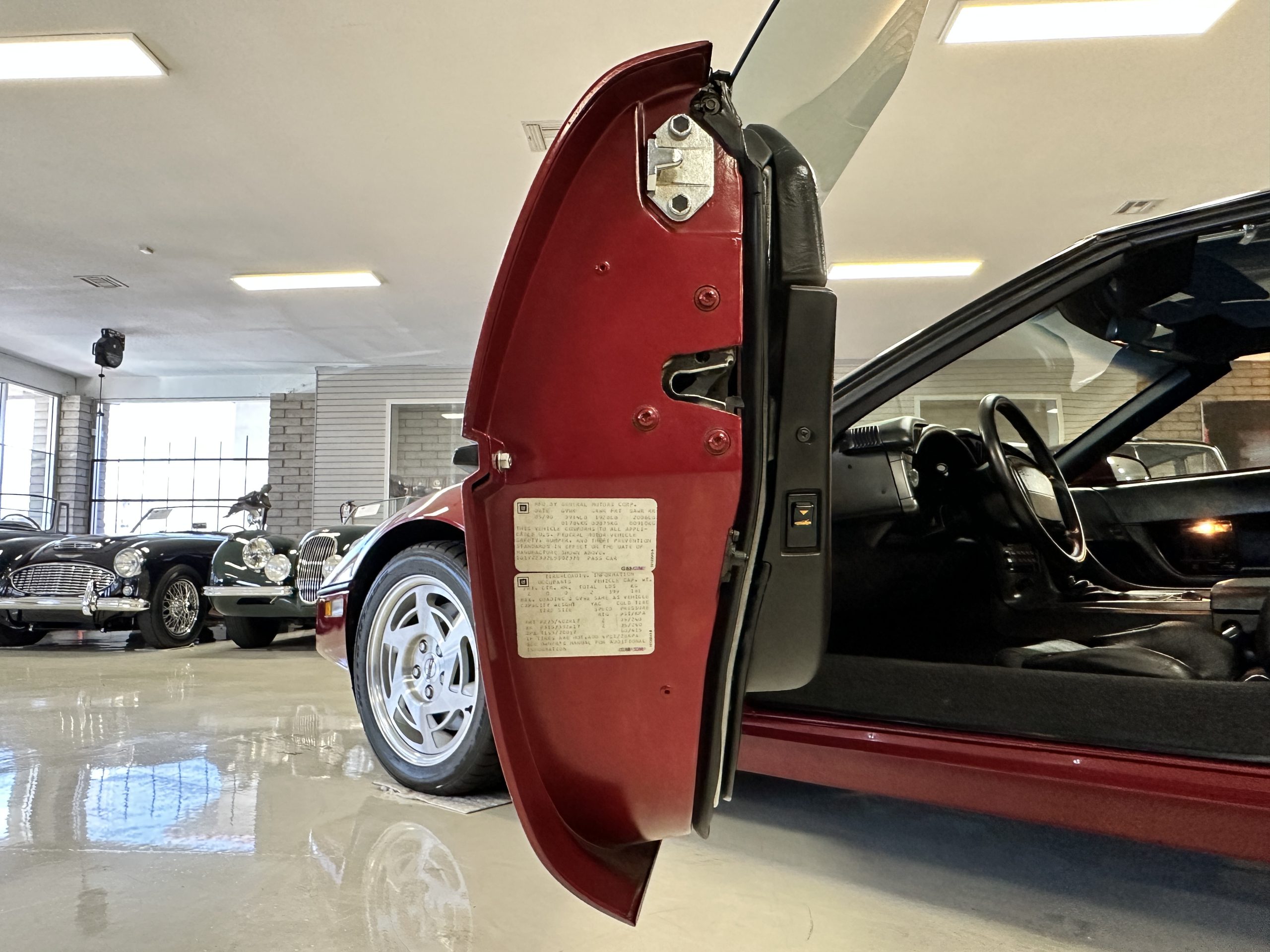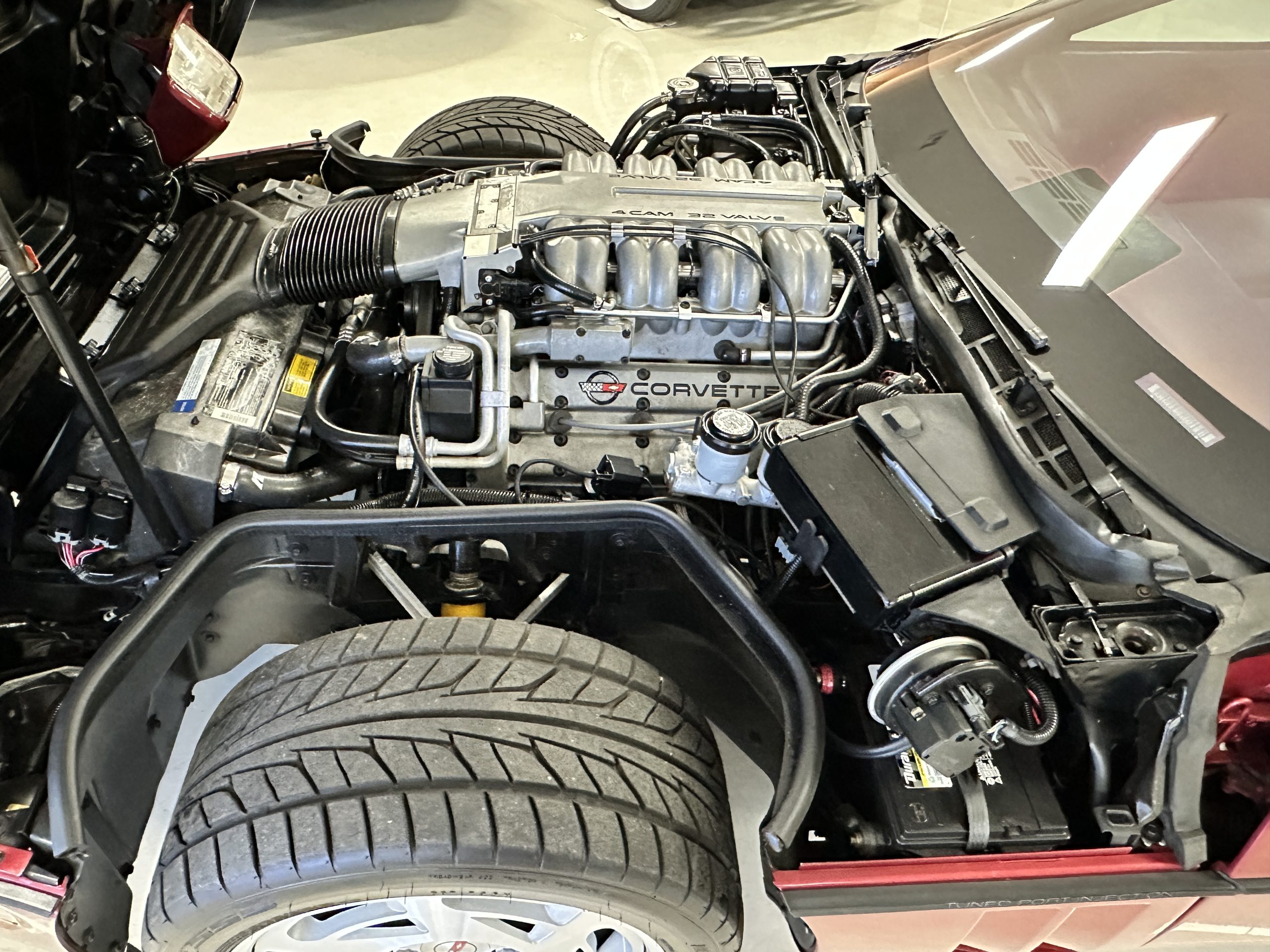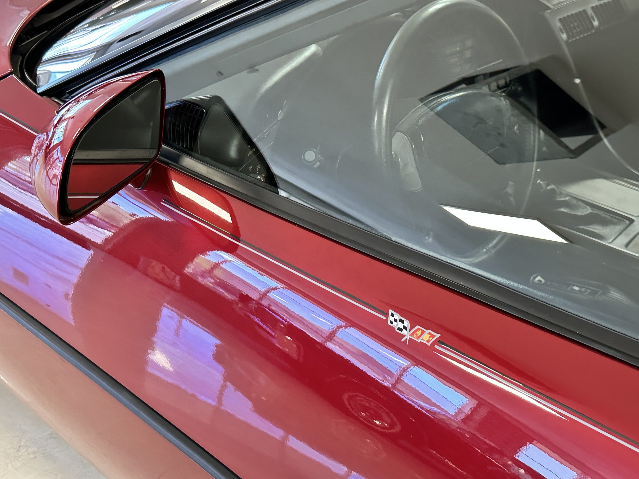 The livery is Dark Red Metallic with beautiful luster and shine. The paint shows very well overall with very few minor imperfections that are nearly unnoticeable and only visible upon very close inspection. The ZR-1 body is unique from the base Corvette in that the body work widens beginning at the leading edge of the doors and culminates in a tail that is 3” broader with a convex rear facia complete with square-lensed taillamps. The ZR-1 moniker is located on the lower right of the facia and will be visible to other drivers as you zoom past them. This additional rear width accommodates the Good Year Eagle P315/35ZR-17 Gatorback tires made specifically for the ZR-1. The cast aluminum “saw blade” wheels are in very nice condition, as is the optional removable roof panel. The ZR-1’s exterior is in beautiful overall condition and shows very well.