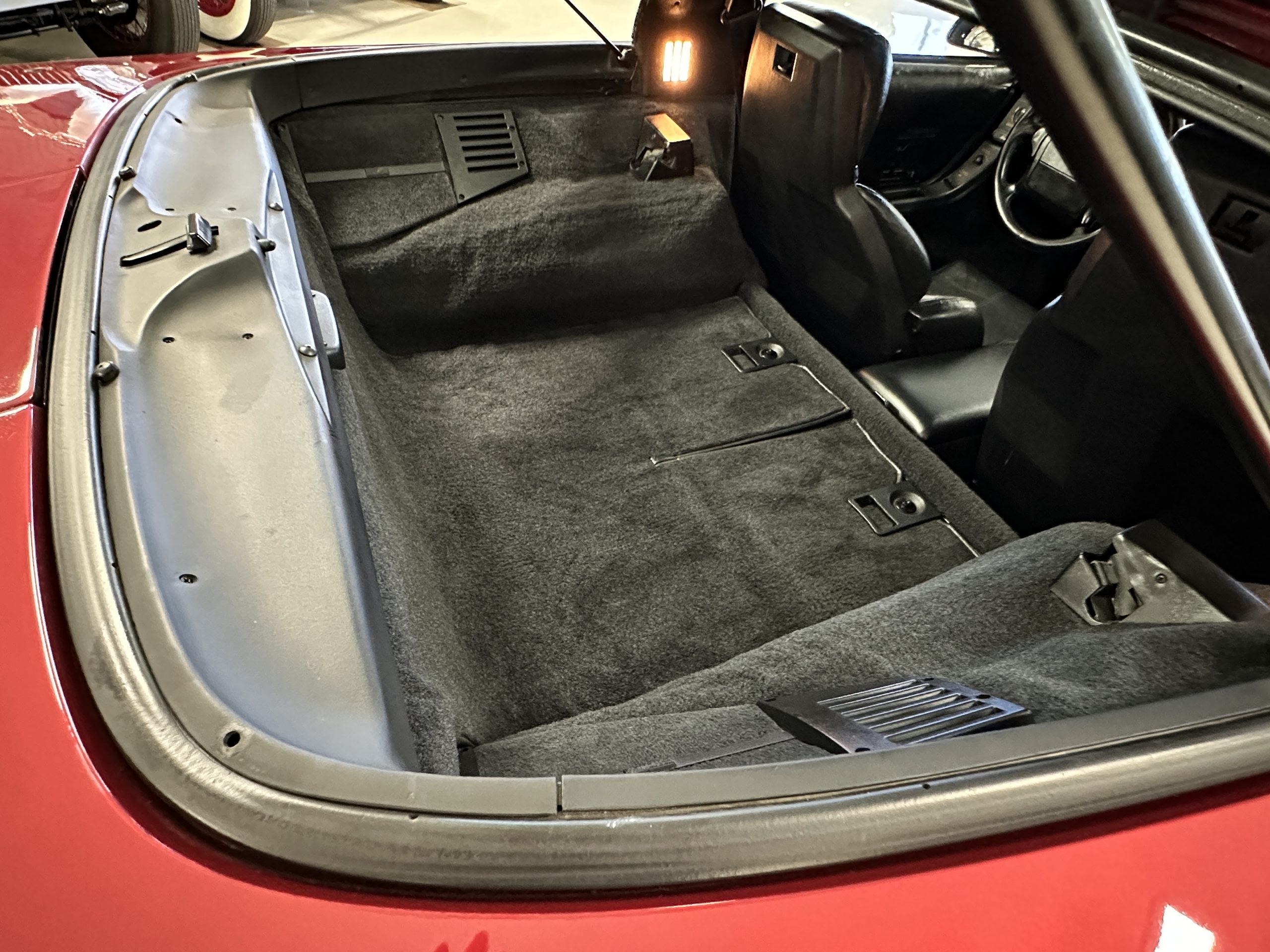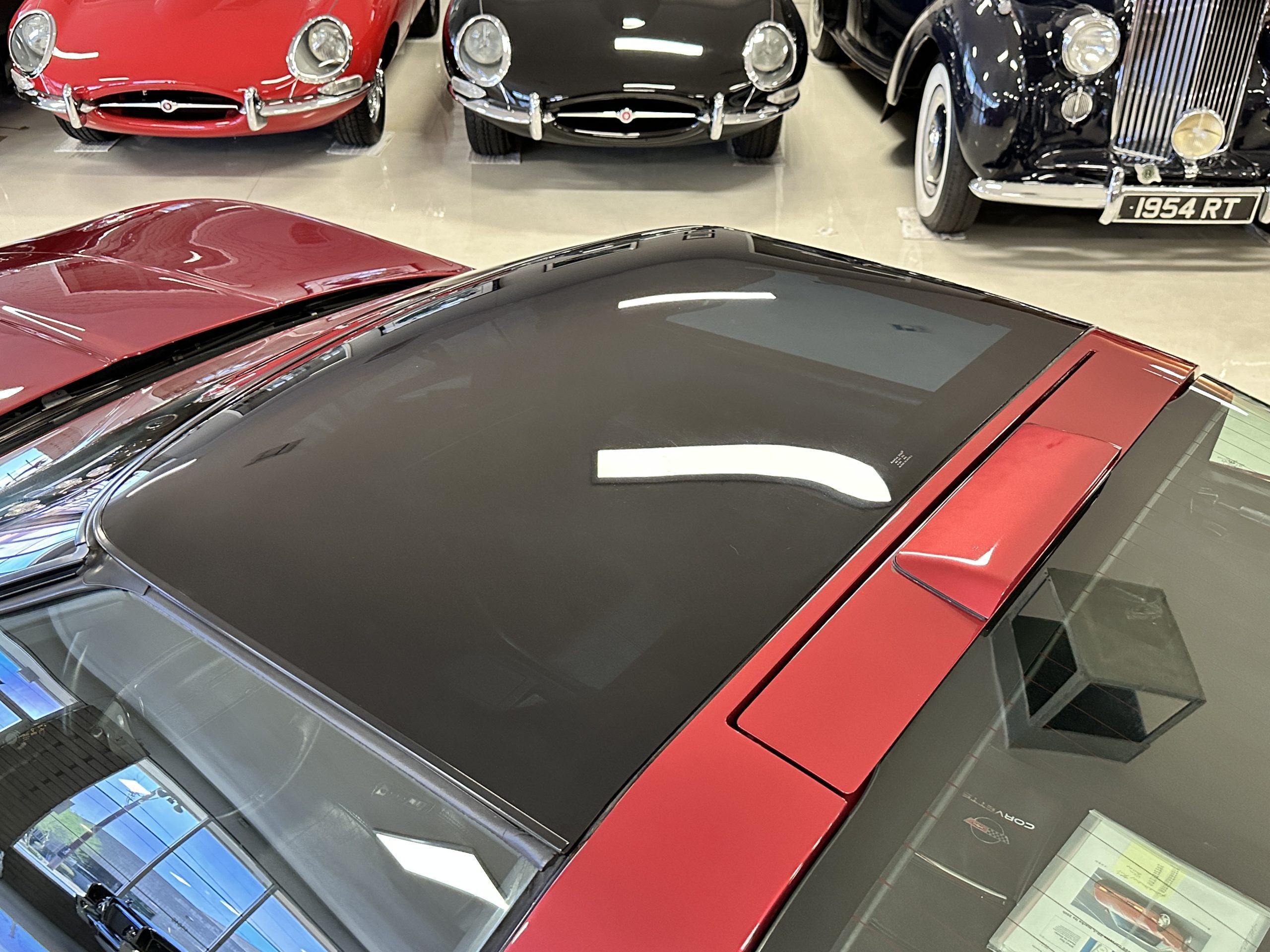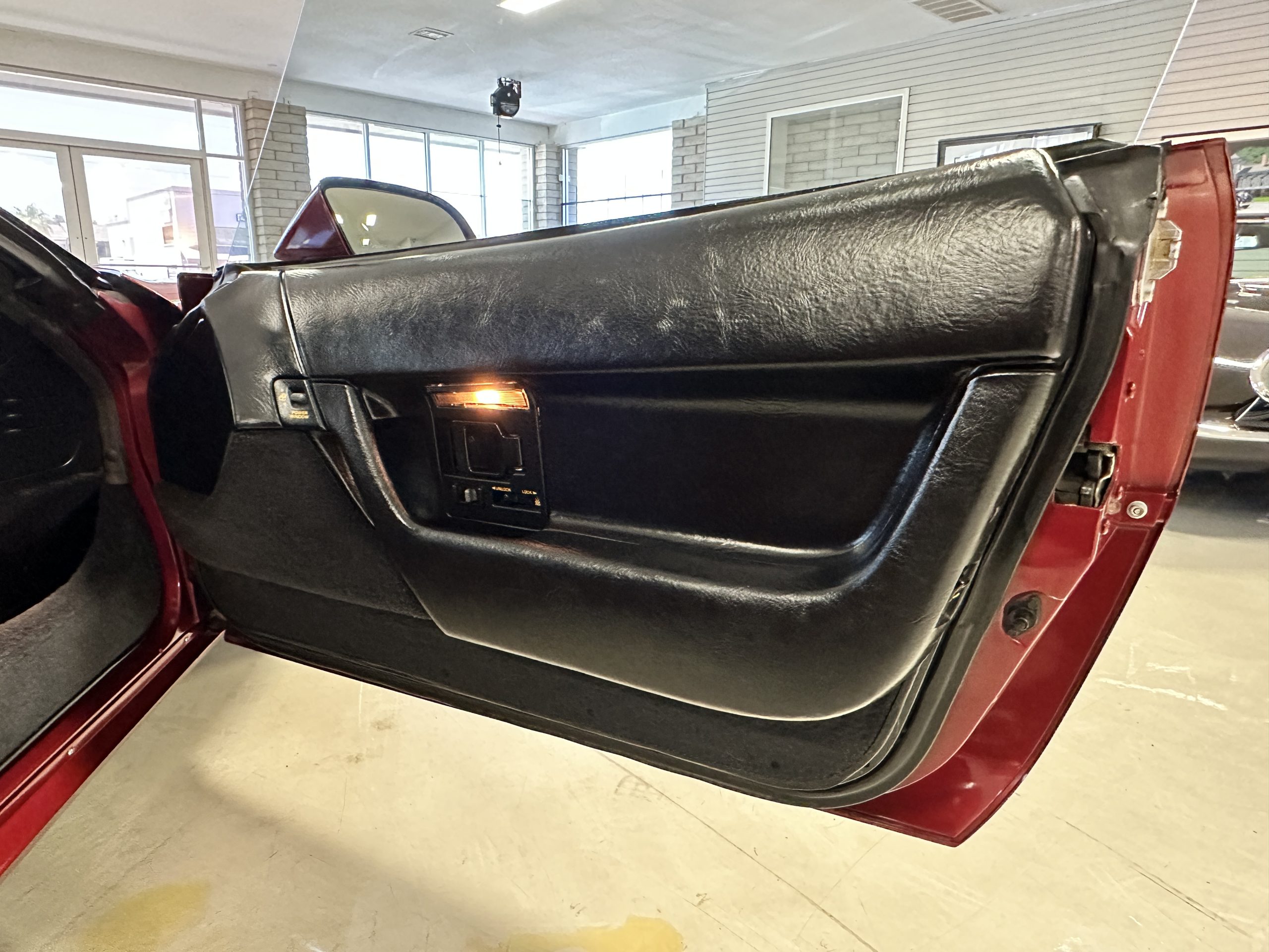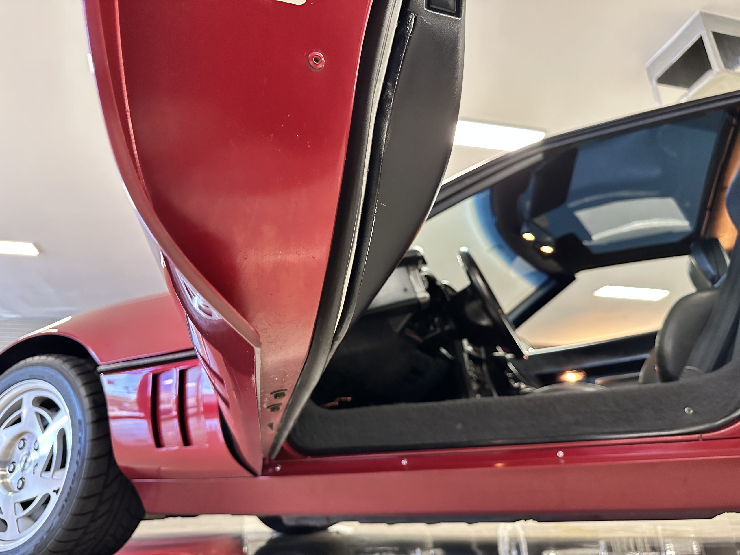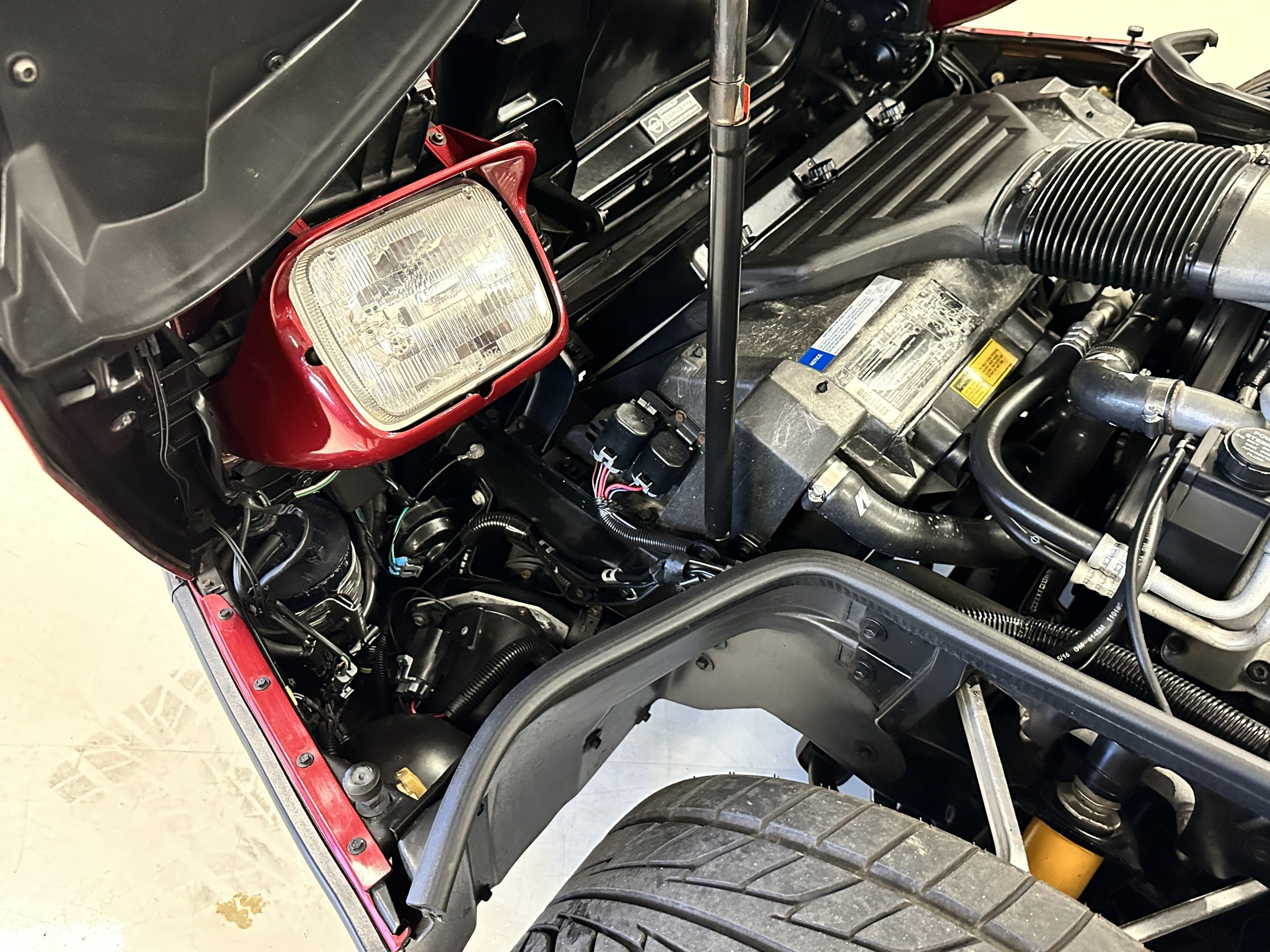 The livery is Dark Red Metallic with beautiful luster and shine. The paint shows very well overall with very few minor imperfections that are nearly unnoticeable and only visible upon very close inspection. The ZR-1 body is unique from the base Corvette in that the body work widens beginning at the leading edge of the doors and culminates in a tail that is 3” broader with a convex rear facia complete with square-lensed taillamps. The ZR-1 moniker is located on the lower right of the facia and will be visible to other drivers as you zoom past them. This additional rear width accommodates the Good Year Eagle P315/35ZR-17 Gatorback tires made specifically for the ZR-1. The cast aluminum “saw blade” wheels are in very nice condition, as is the optional removable roof panel. The ZR-1’s exterior is in beautiful overall condition and shows very well.