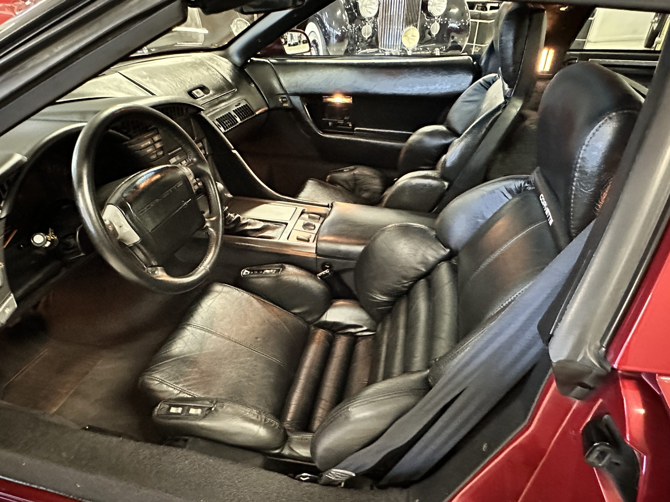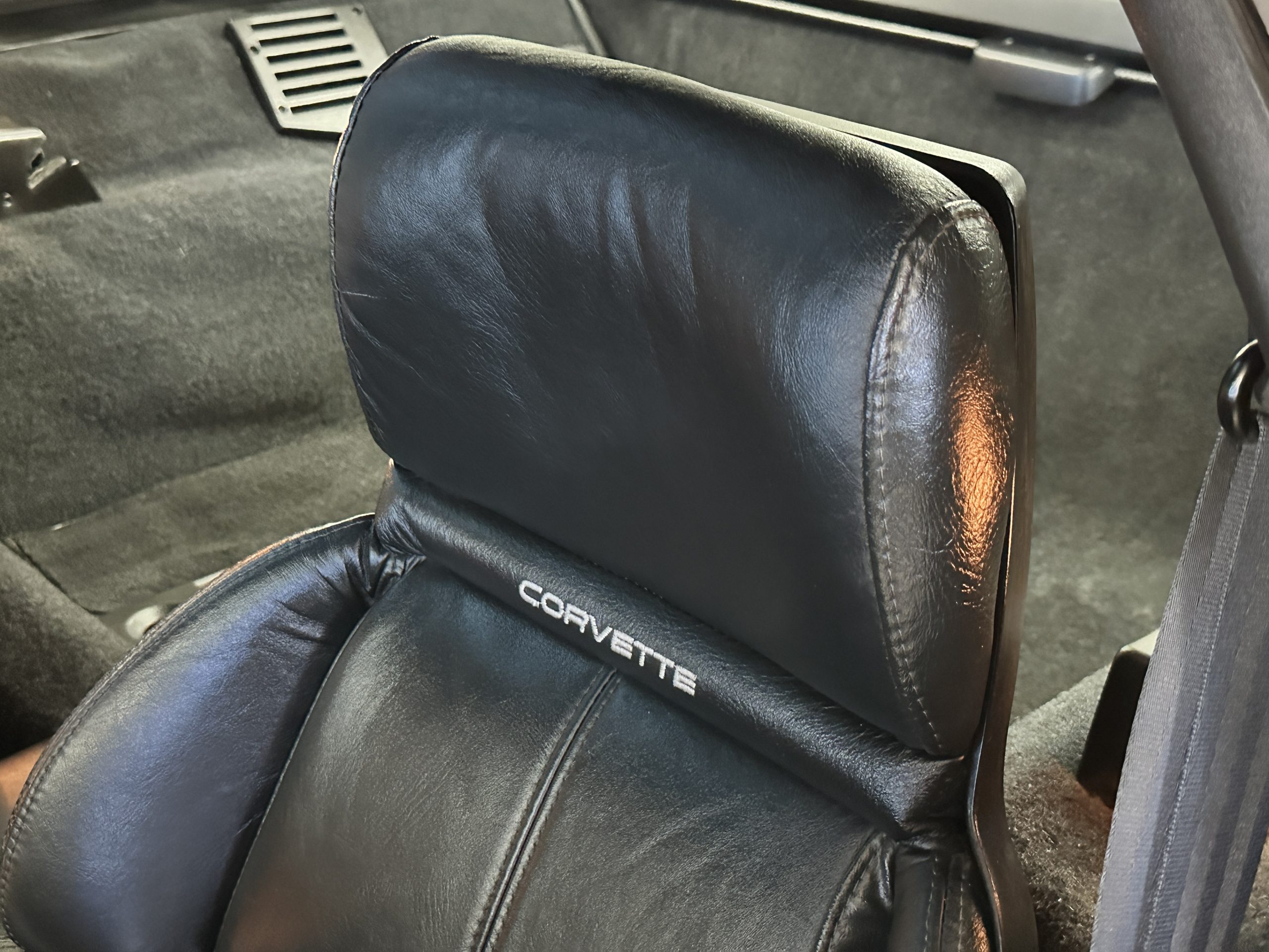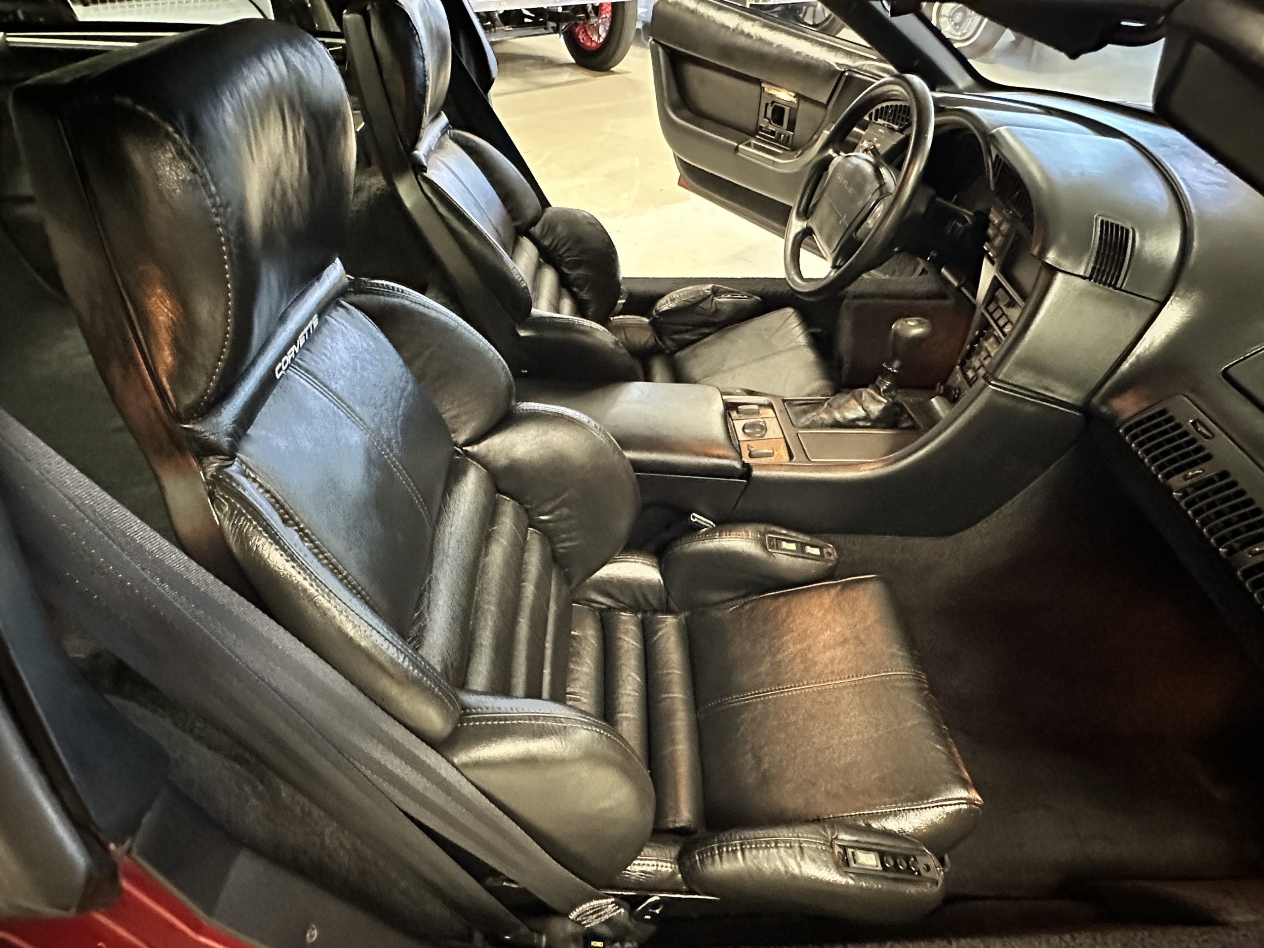 The interior is finished in black leather upholstered sport seats that show little wear and are in nice overall condition. The 6-way passenger and driver sport seats adjustable sport seats can be adjusted to an almost limitless number of driving positions. Even the seat wings and lumbar supports are power controlled. The dash shows well, and the instruments all function as designed. The black carpet is in nice condition, showing minimal wear. The interior is in nice condition reflecting the low mileage and care taken with this ZR-1.