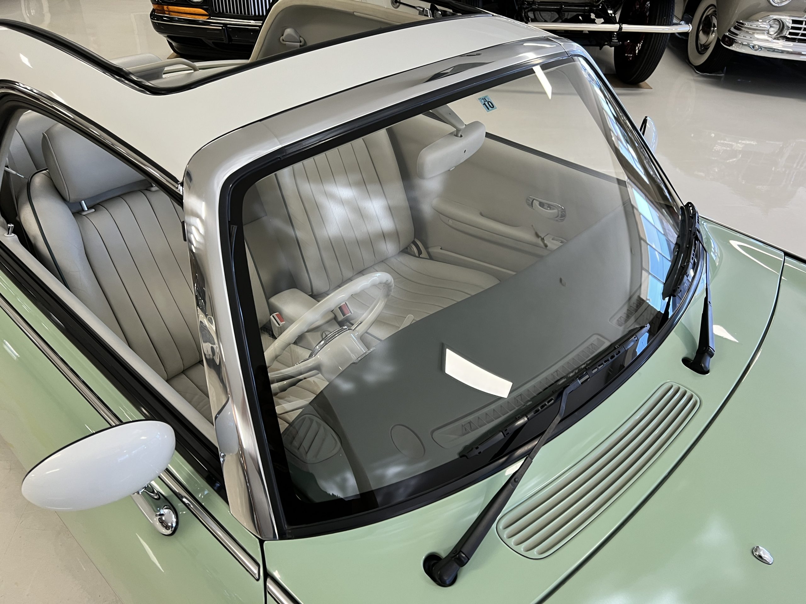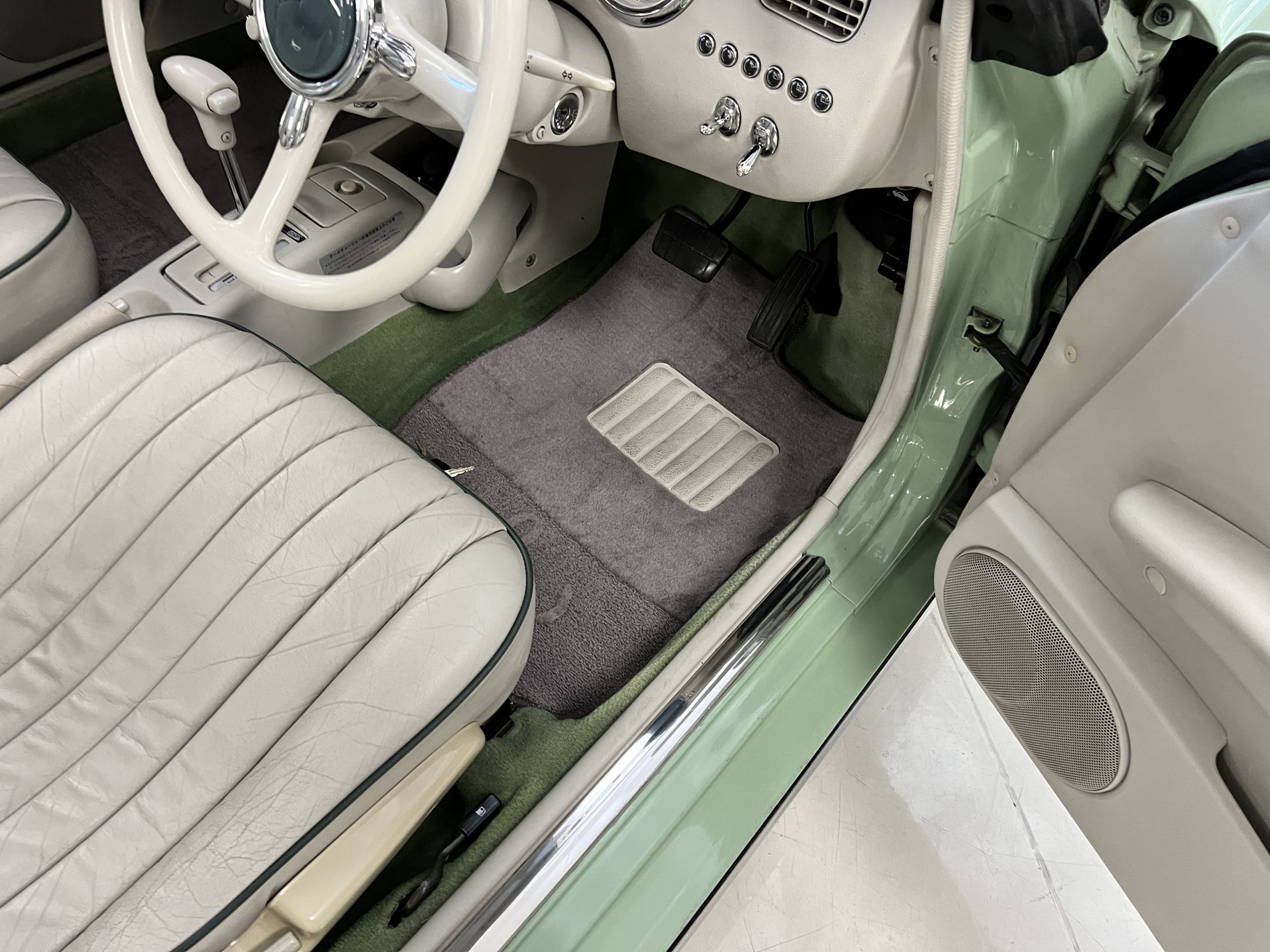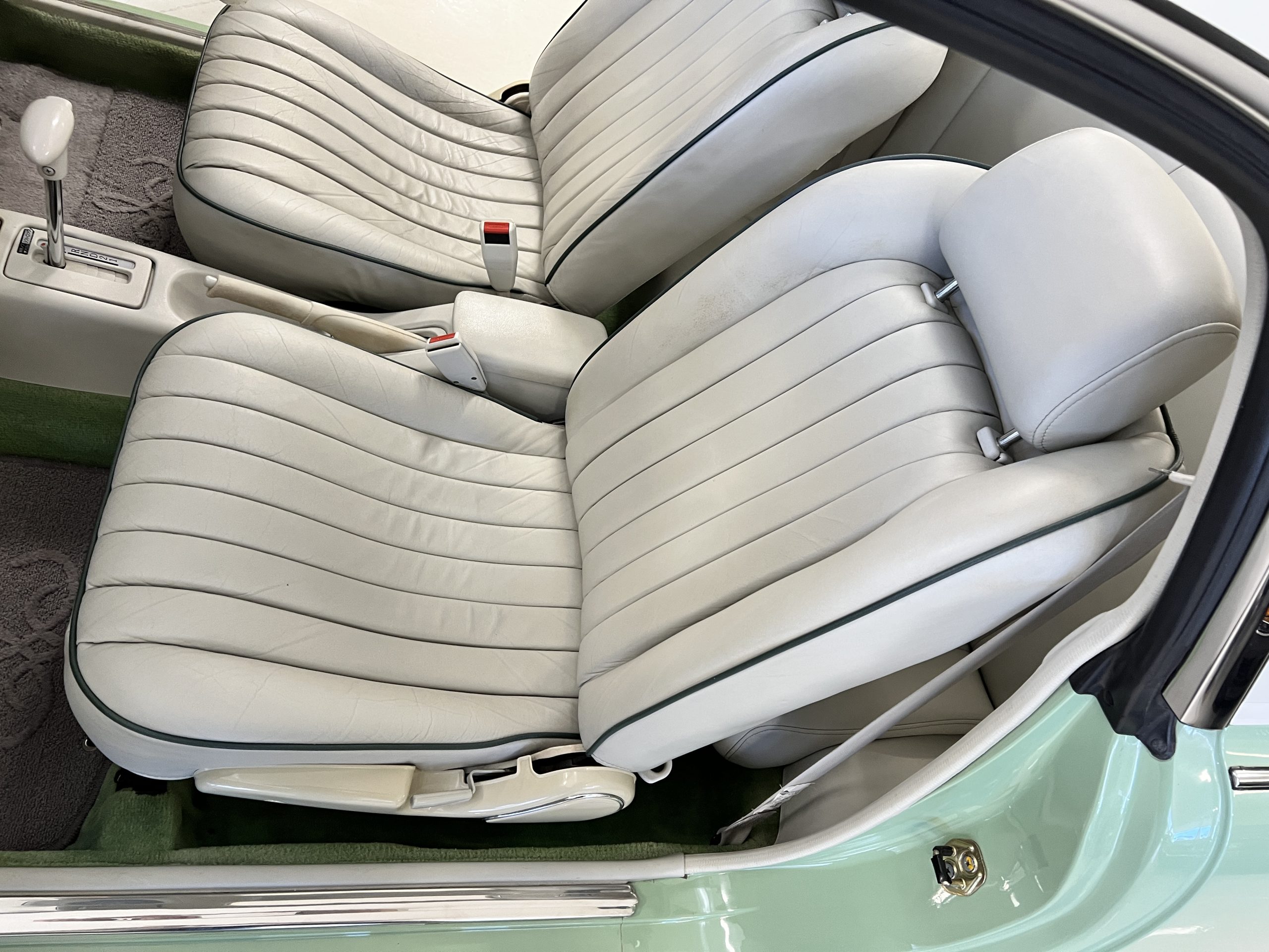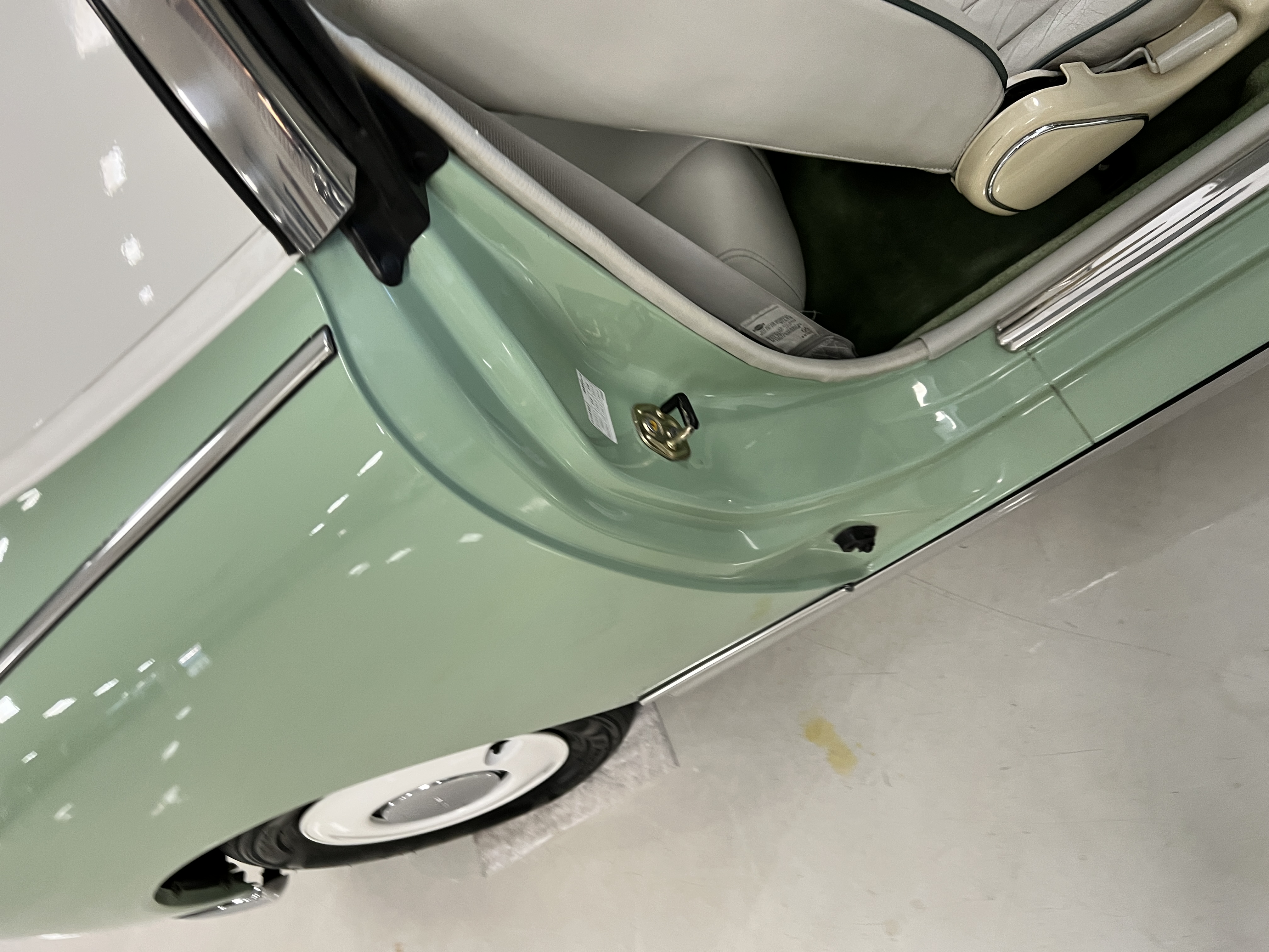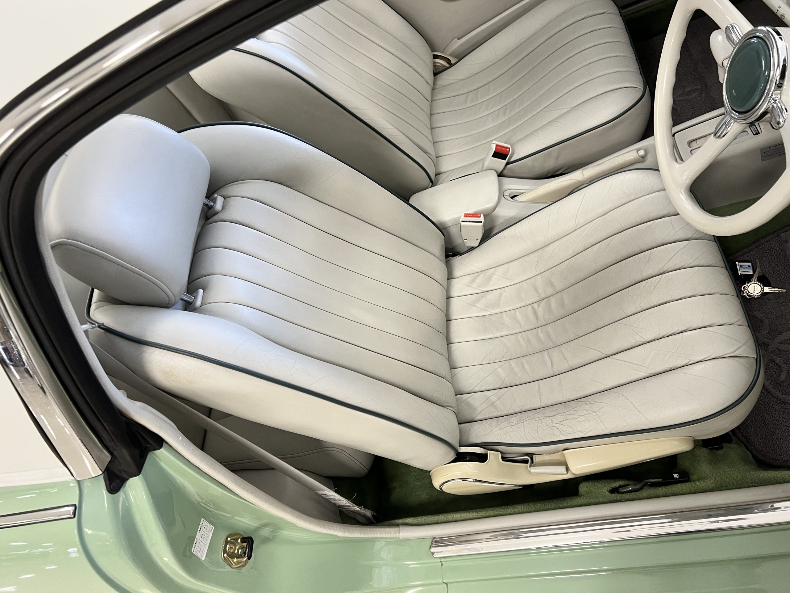 The Figaro’s were offered in a four seasons theme with each season having its own color. This Figaro is offered in its original Spring Green with the white painted top and white convertible roll back soft top. The 12-inch wheels are accented with a complimentary white wheel cover and Figaro hub caps. The dual side mirrors are also trimmed in white. Overall, this is about as cute as a car can get! The front features a very human looking headlight and grill design which instantly creates smiles on any onlookers. This example is in beautiful original condition. There is a small ding in the passenger side B-pillar which is barely noticeable.