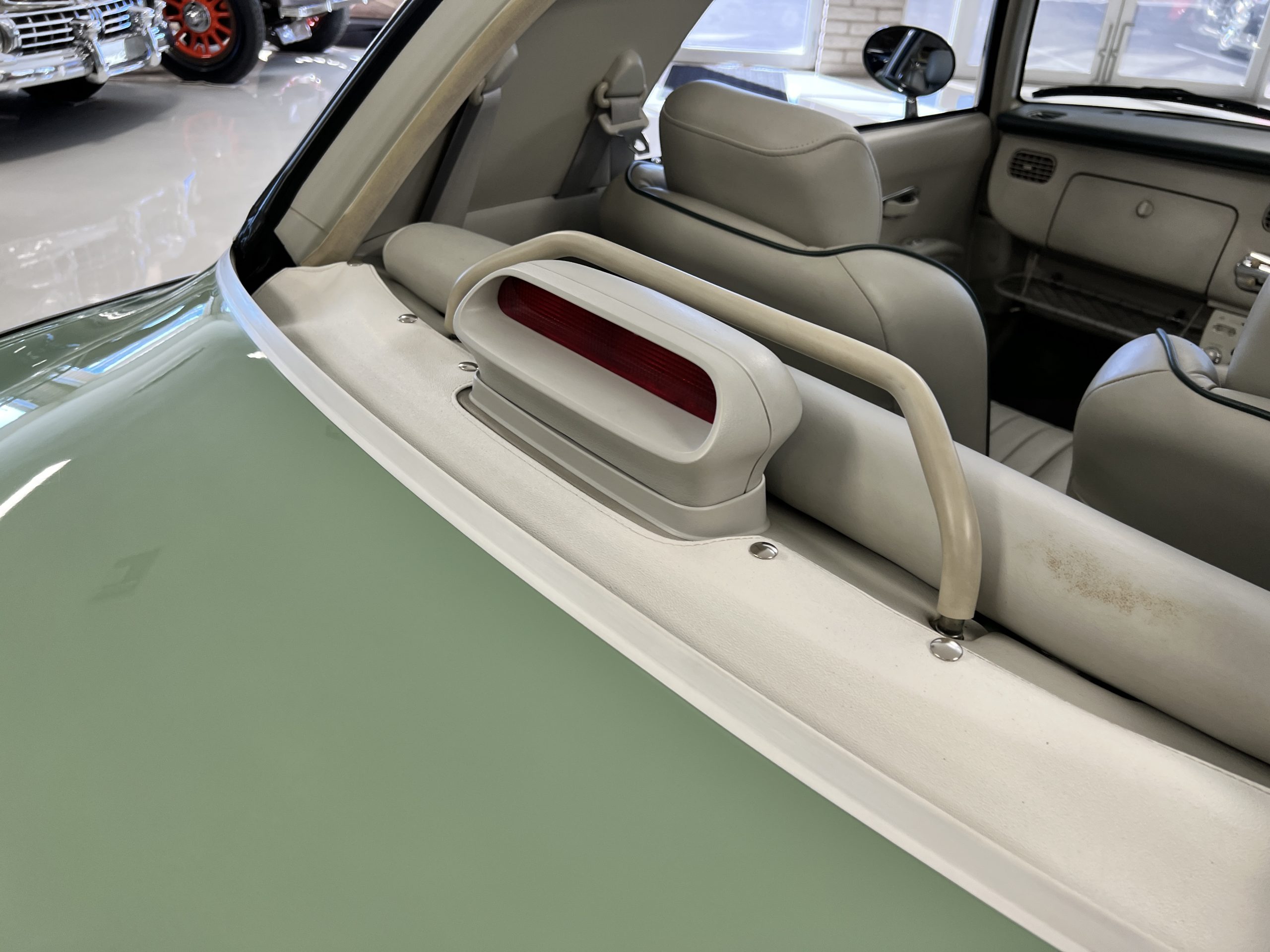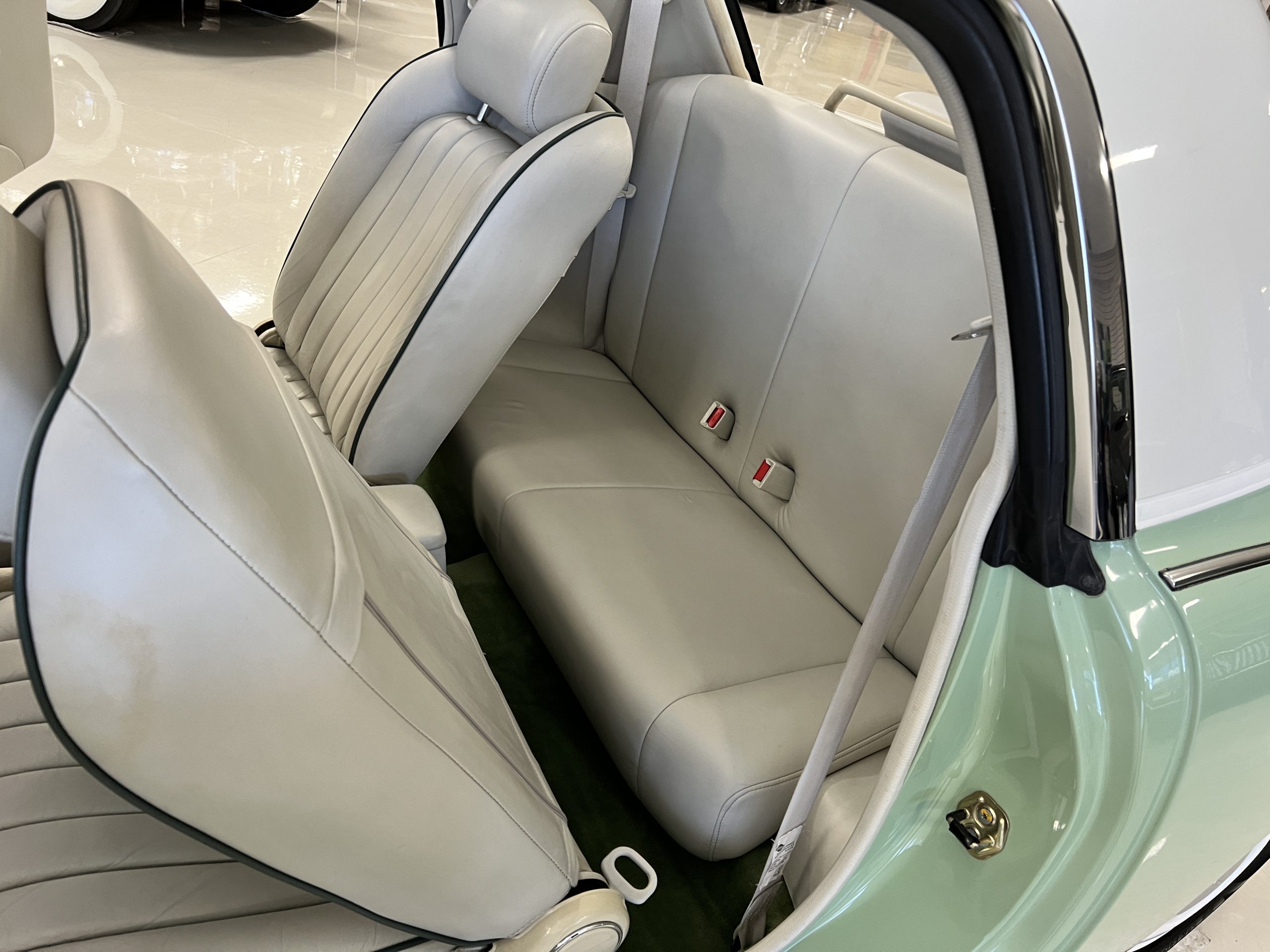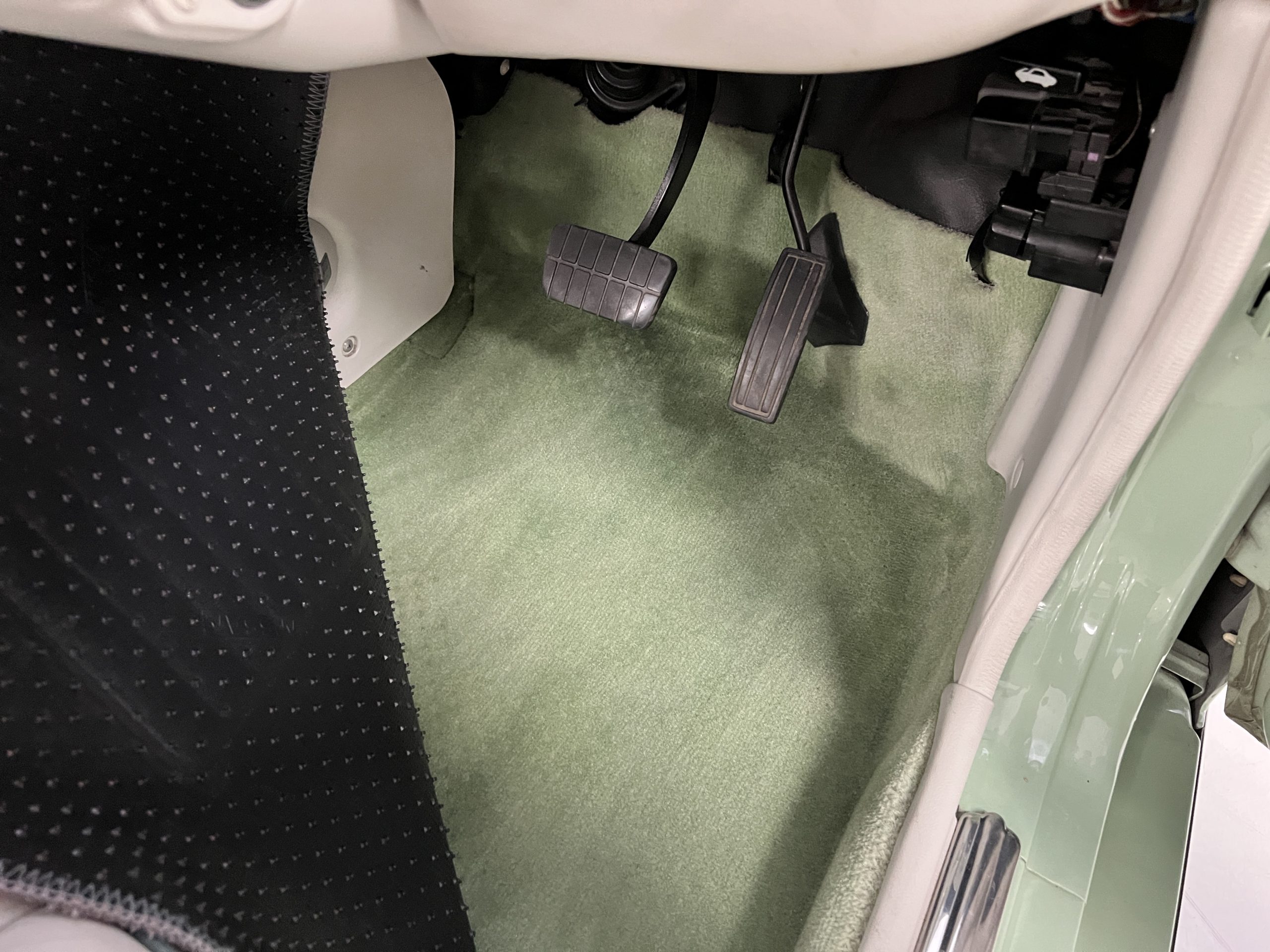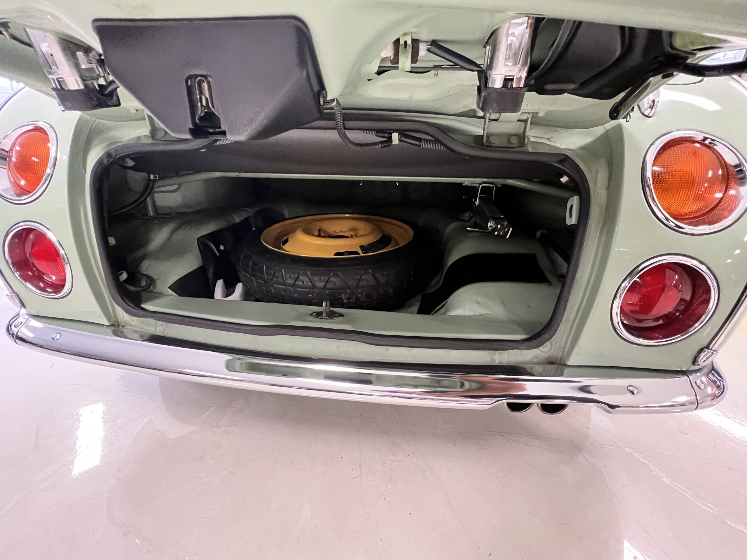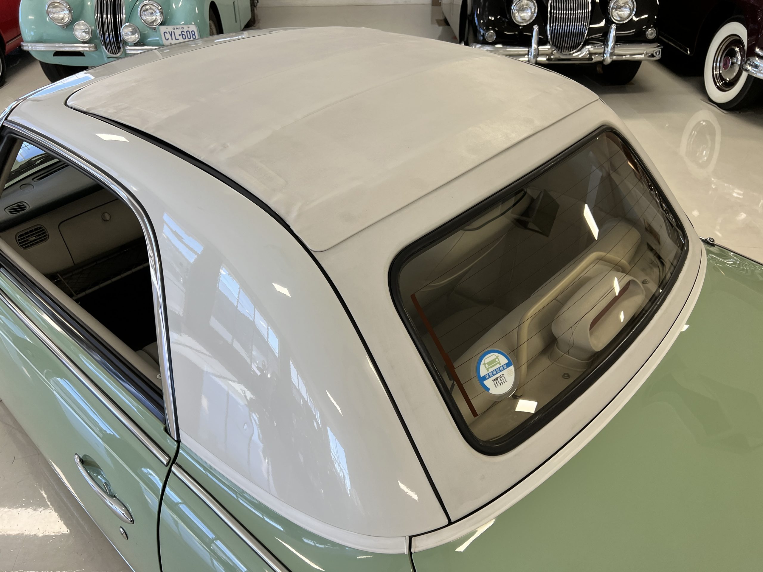 The Figaro’s were offered in a four seasons theme with each season having its own color. This Figaro is offered in its original Spring Green with the white painted top and white convertible roll back soft top. The 12-inch wheels are accented with a complimentary white wheel cover and Figaro hub caps. The dual side mirrors are also trimmed in white. Overall, this is about as cute as a car can get! The front features a very human looking headlight and grill design which instantly creates smiles on any onlookers. This example is in beautiful original condition. There is a small ding in the passenger side B-pillar which is barely noticeable.