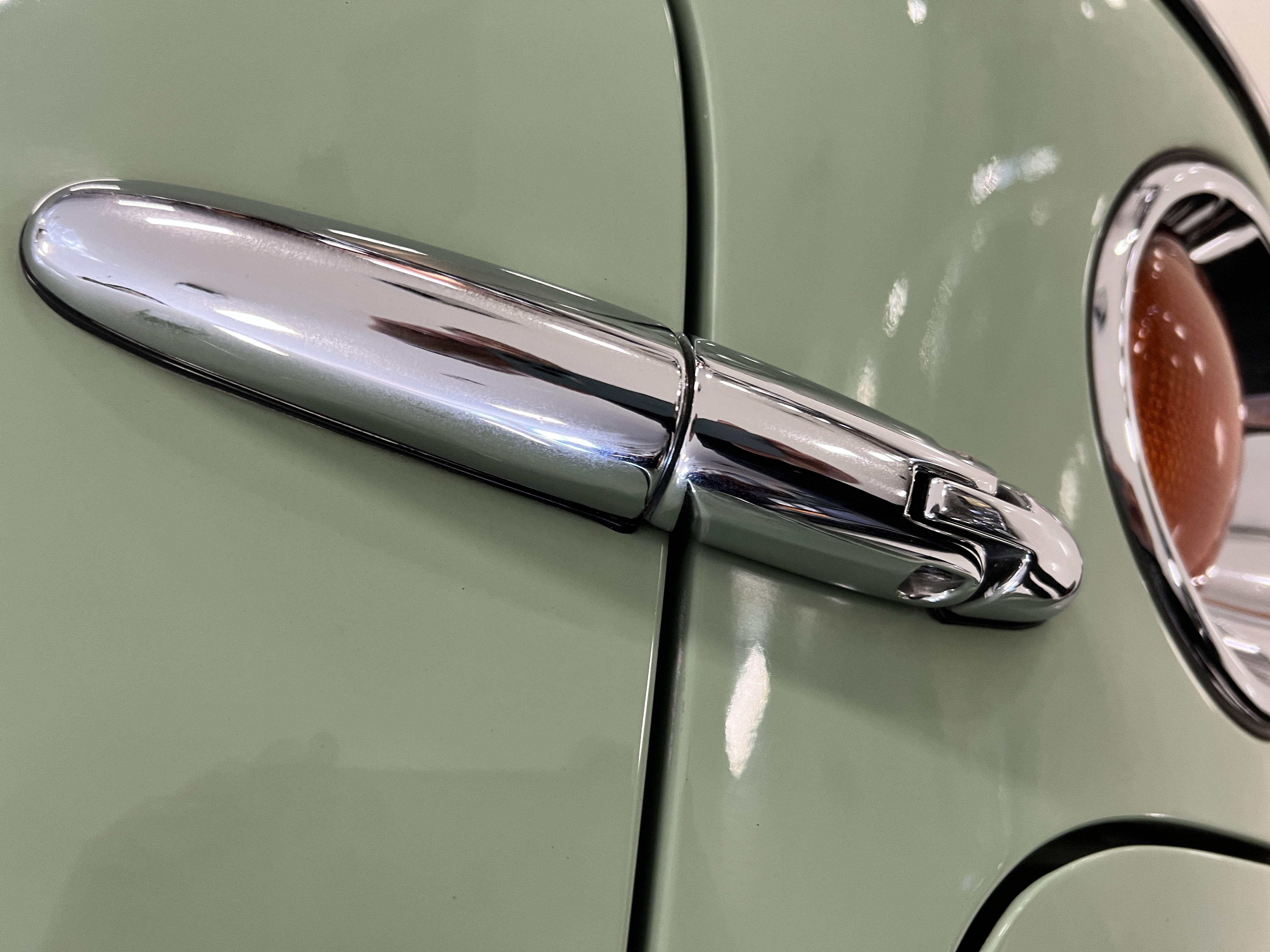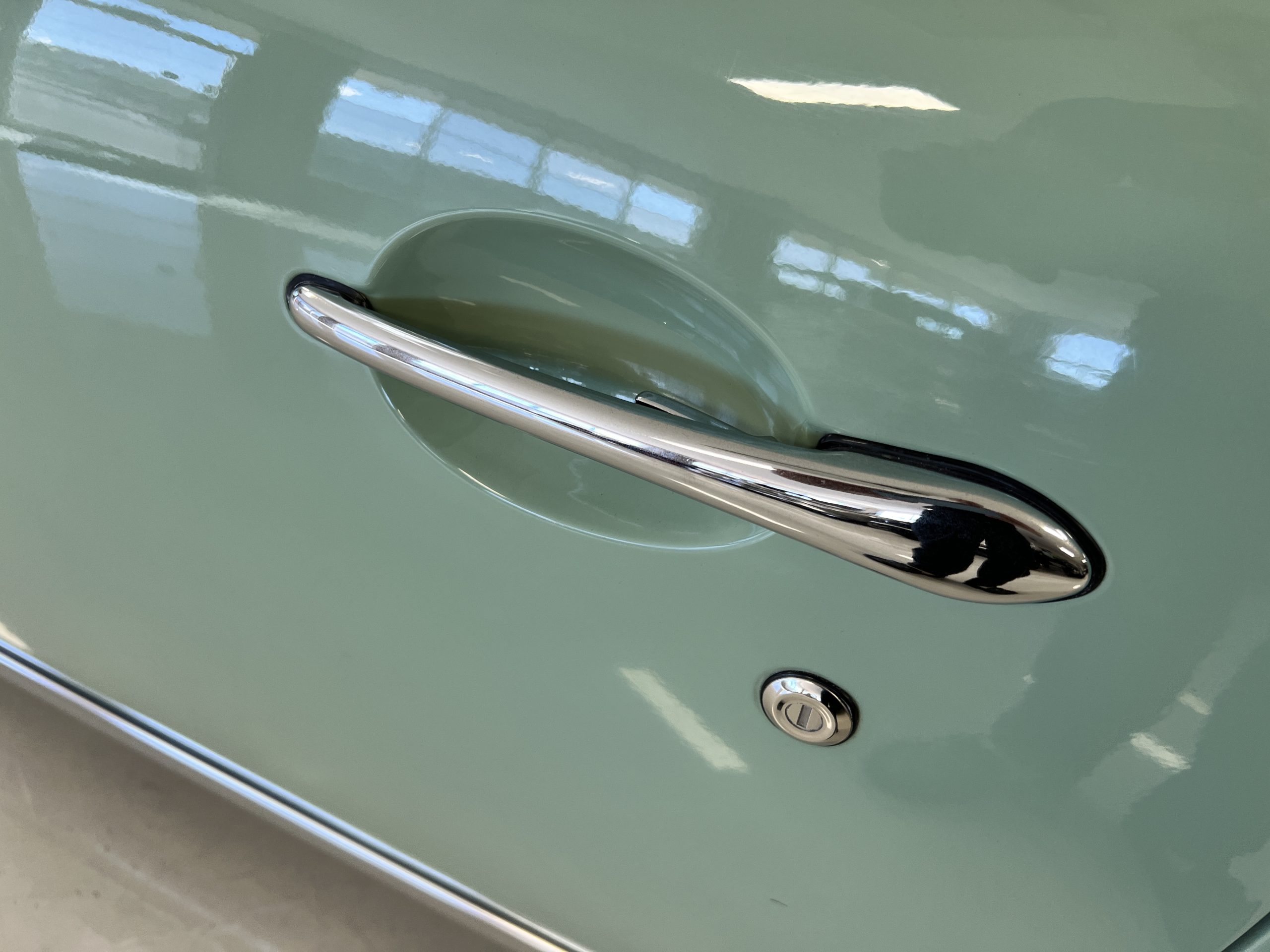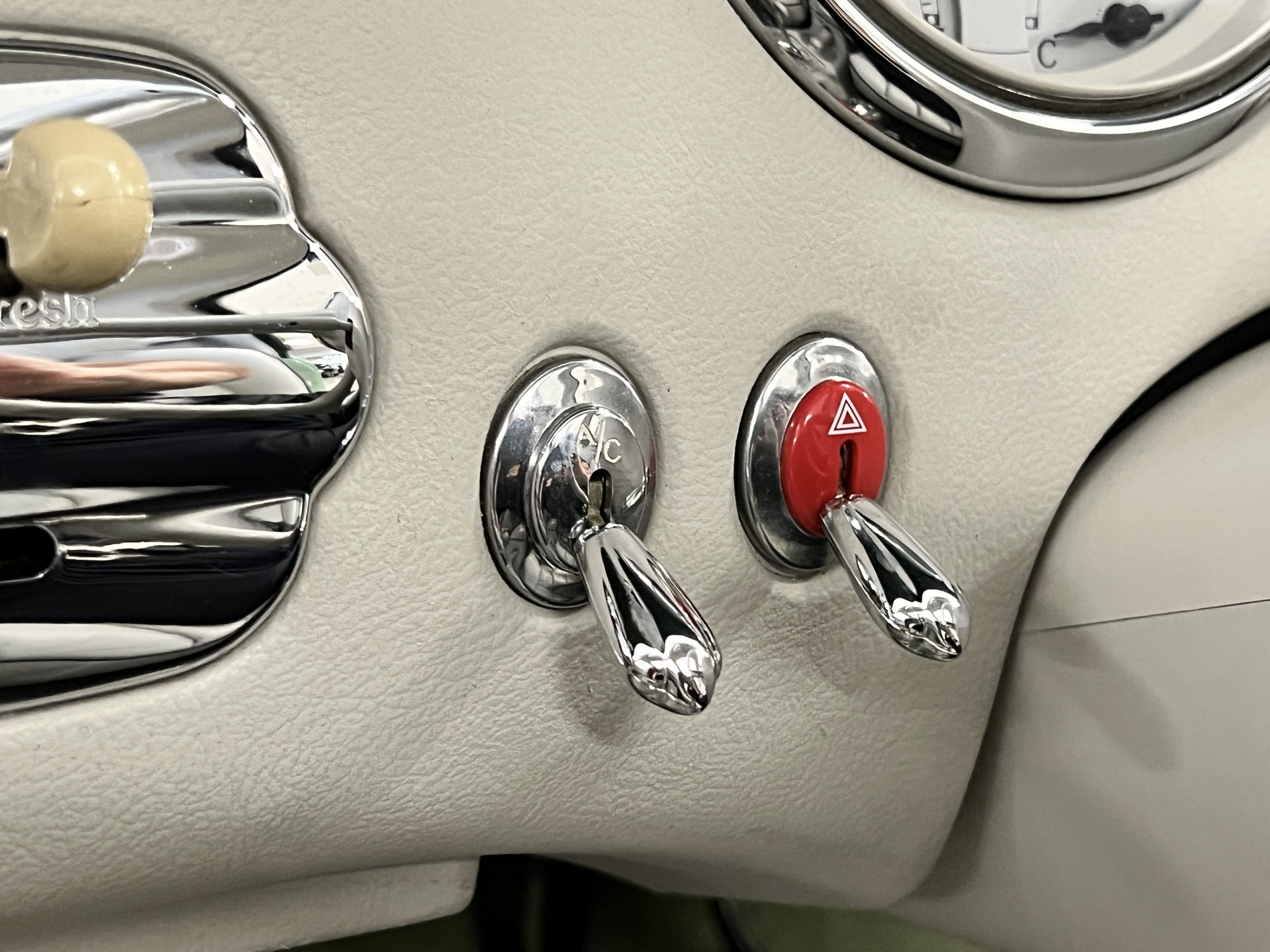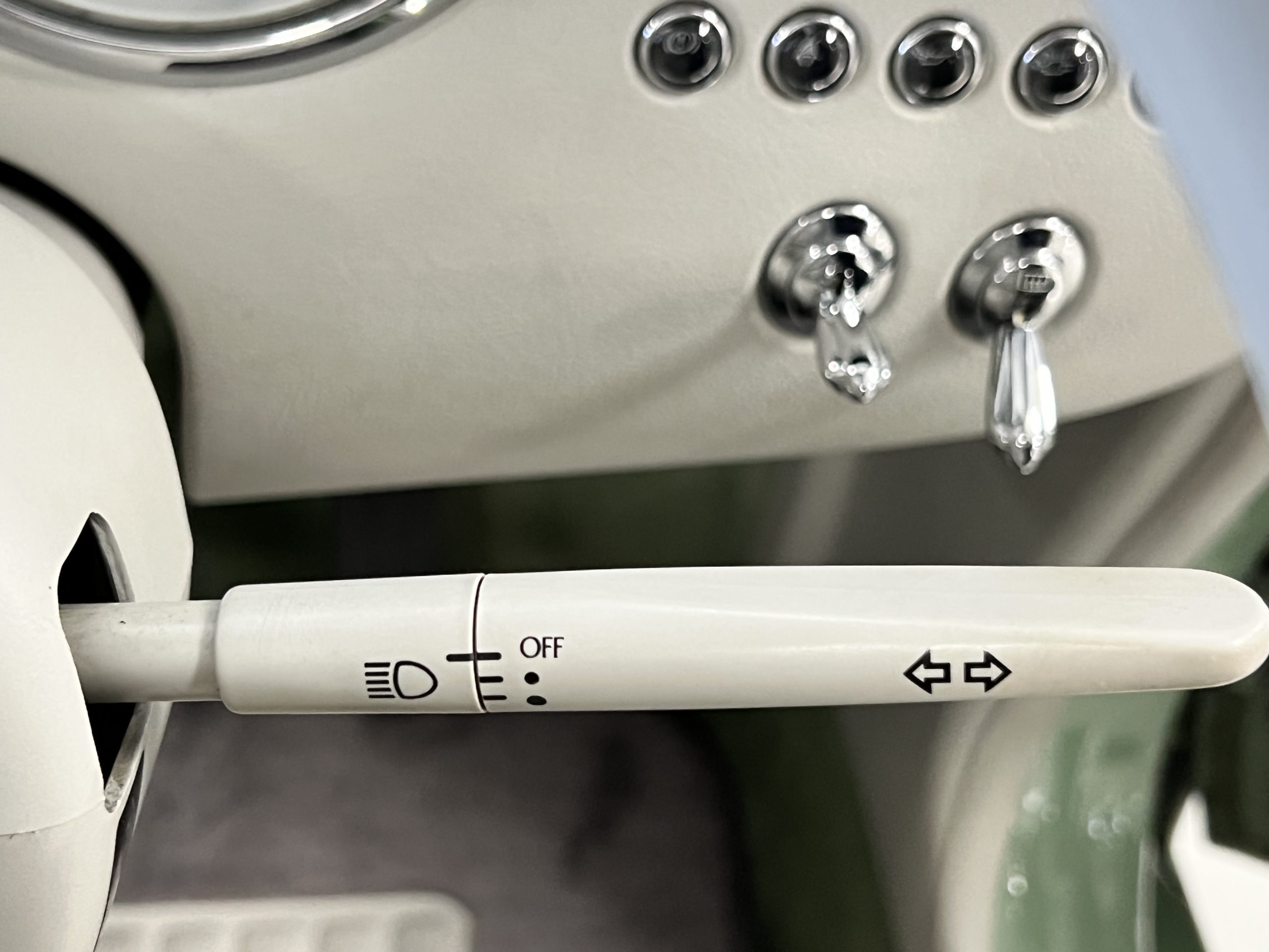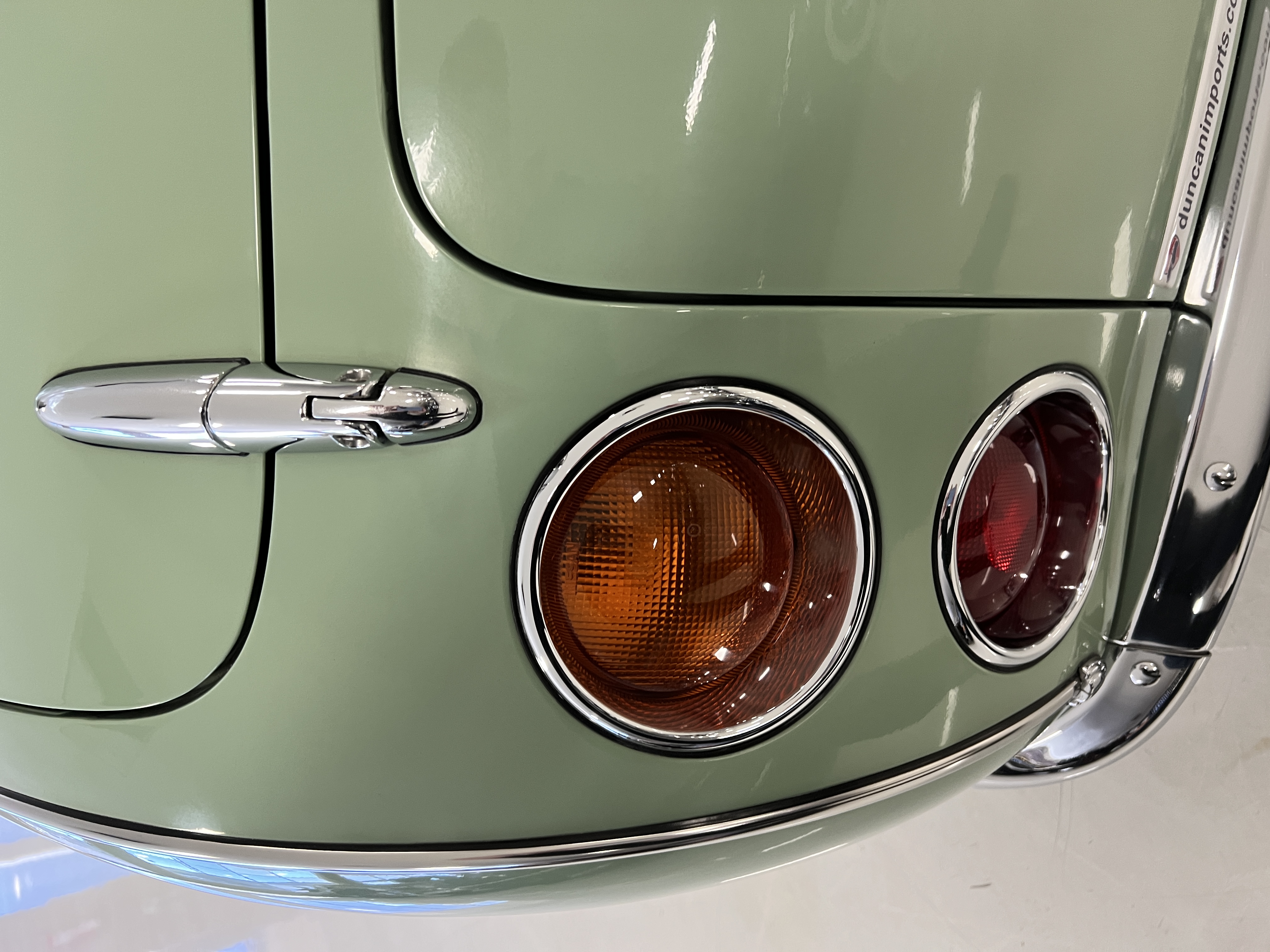 The Figaro’s were offered in a four seasons theme with each season having its own color. This Figaro is offered in its original Spring Green with the white painted top and white convertible roll back soft top. The 12-inch wheels are accented with a complimentary white wheel cover and Figaro hub caps. The dual side mirrors are also trimmed in white. Overall, this is about as cute as a car can get! The front features a very human looking headlight and grill design which instantly creates smiles on any onlookers. This example is in beautiful original condition. There is a small ding in the passenger side B-pillar which is barely noticeable.