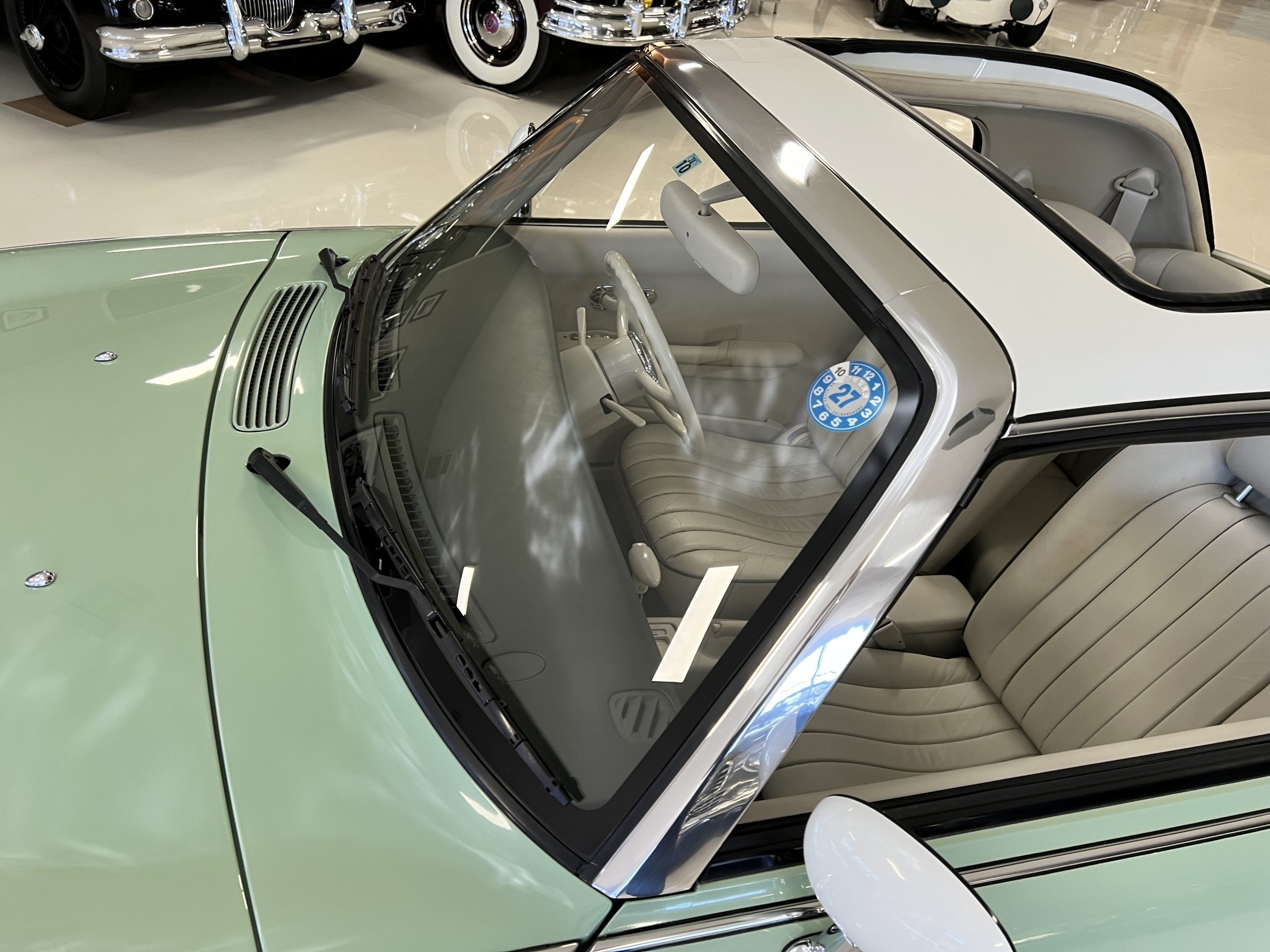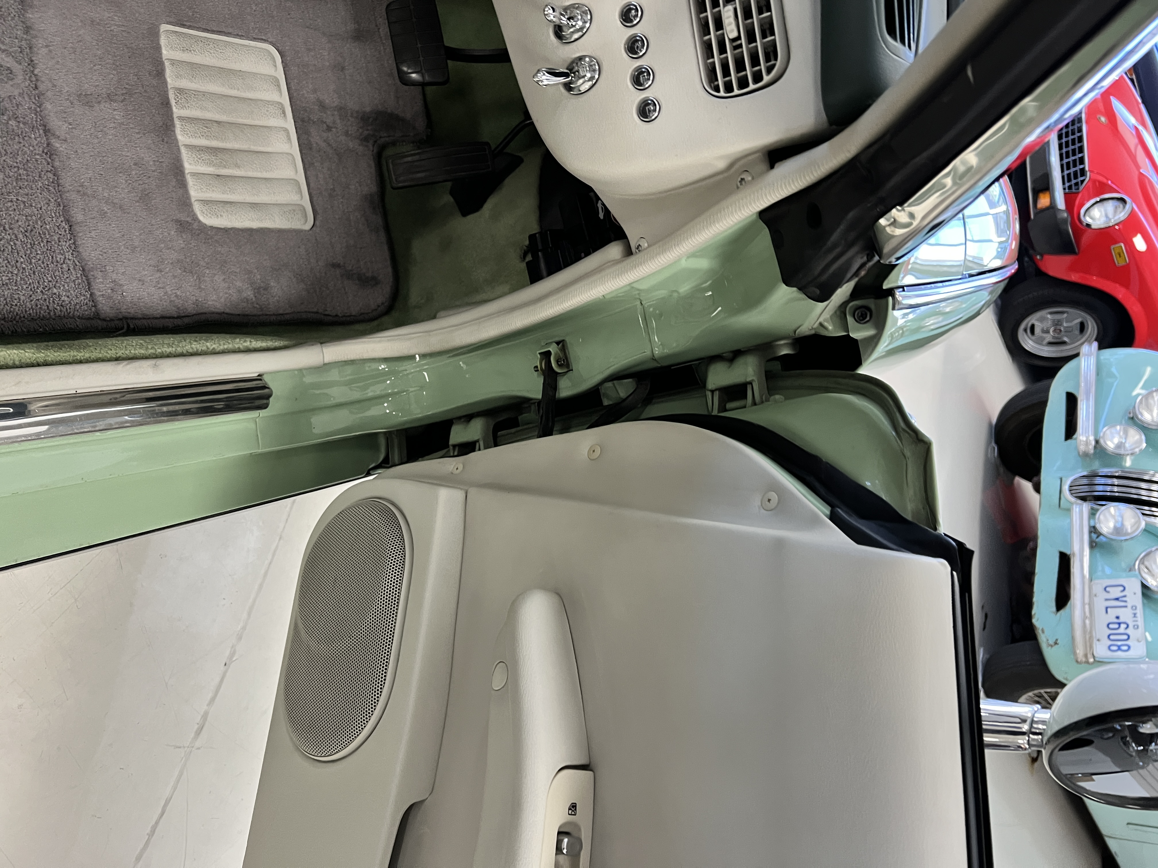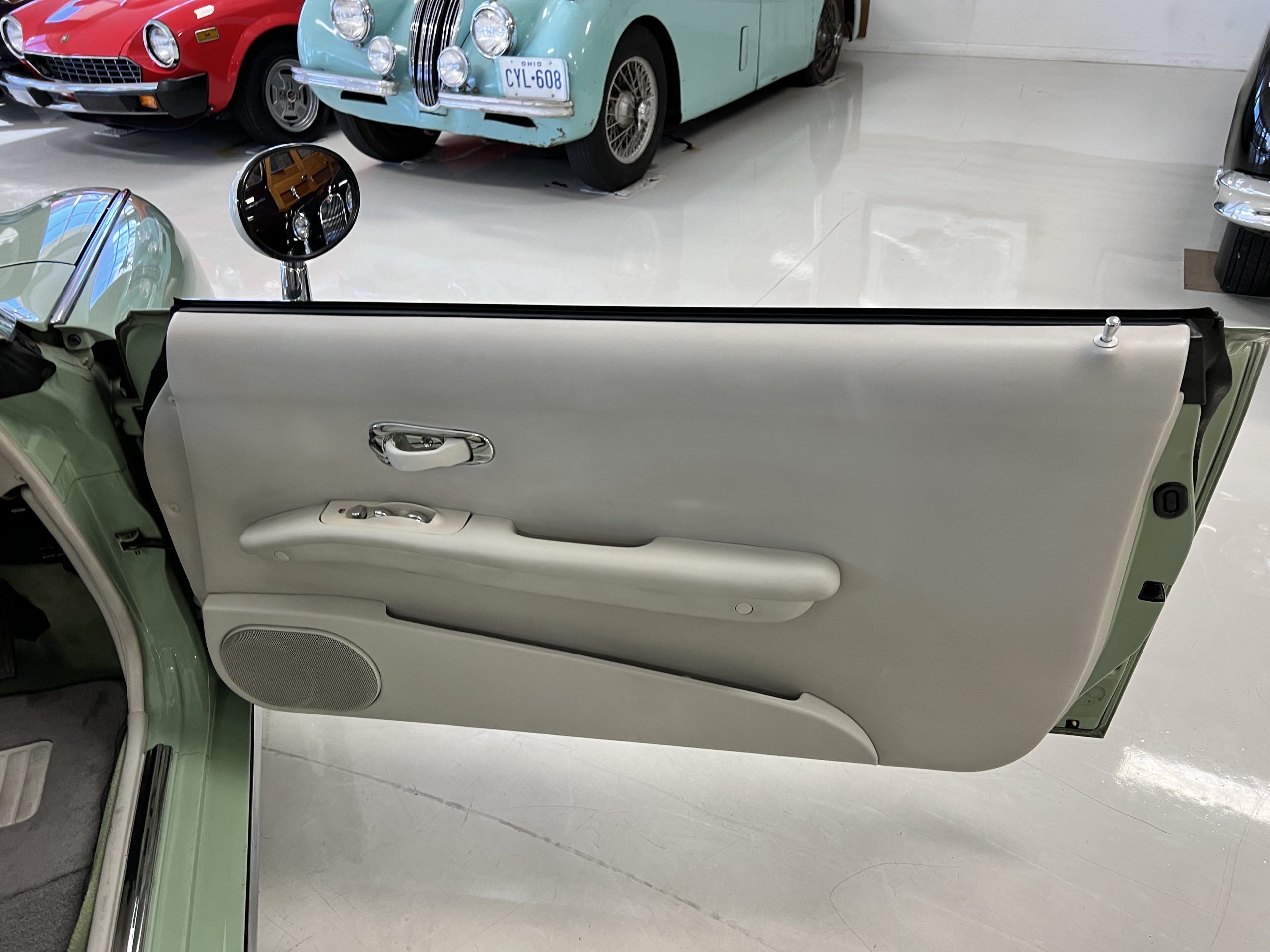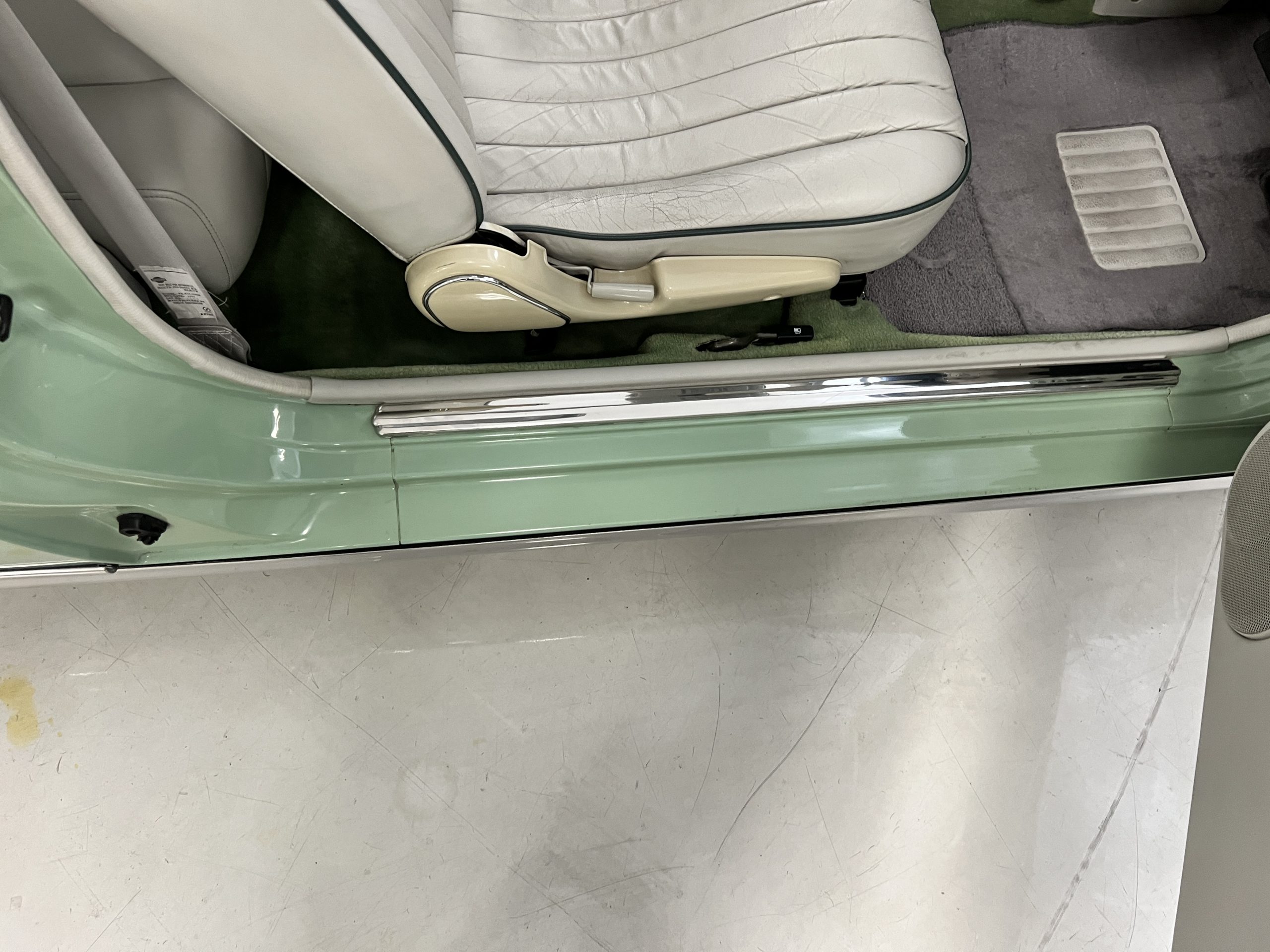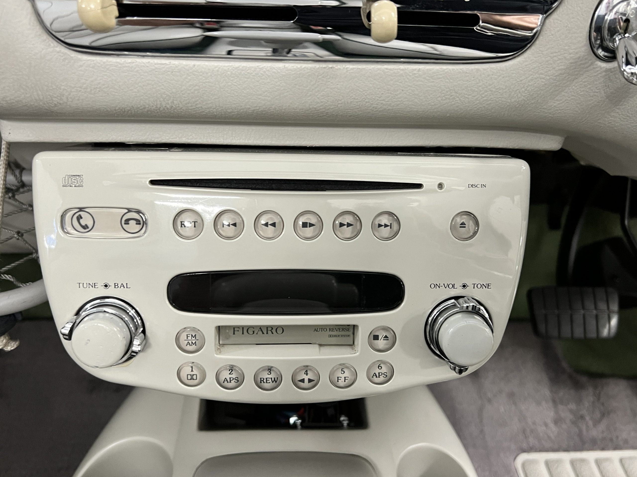 The interior is in very nice condition in its original crème leather with green piping. The leather is soft and supple with only slight wear on the driver’s seat. The Spring Green carpeting is in excellent condition being protected by the gray Figaro branded carpeted floor mats. The dash is in excellent condition in crème and the instrumentation works well with the crème-colored faces. The soft top retracts in seconds and is easily handled by one person. The soft top is in excellent condition and this Figaro includes a spare top in the sale. The Clarion stereo has been upgraded to UK and USA radio tuning and also features a CD player and Bluetooth compatibility.