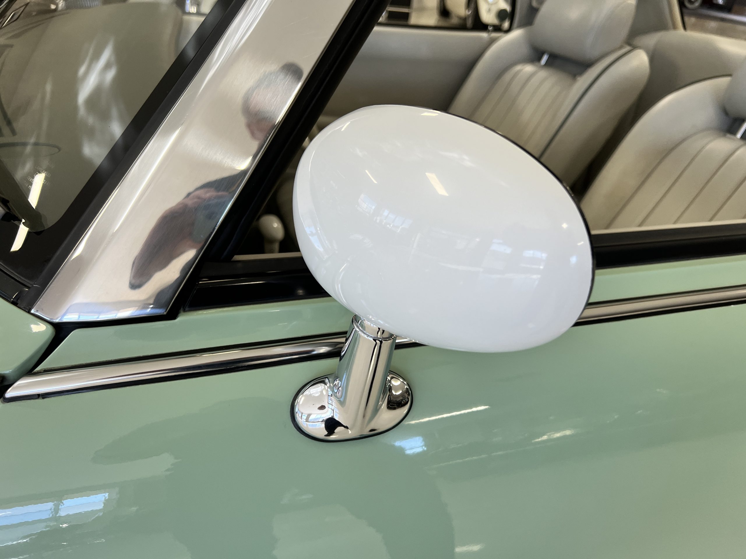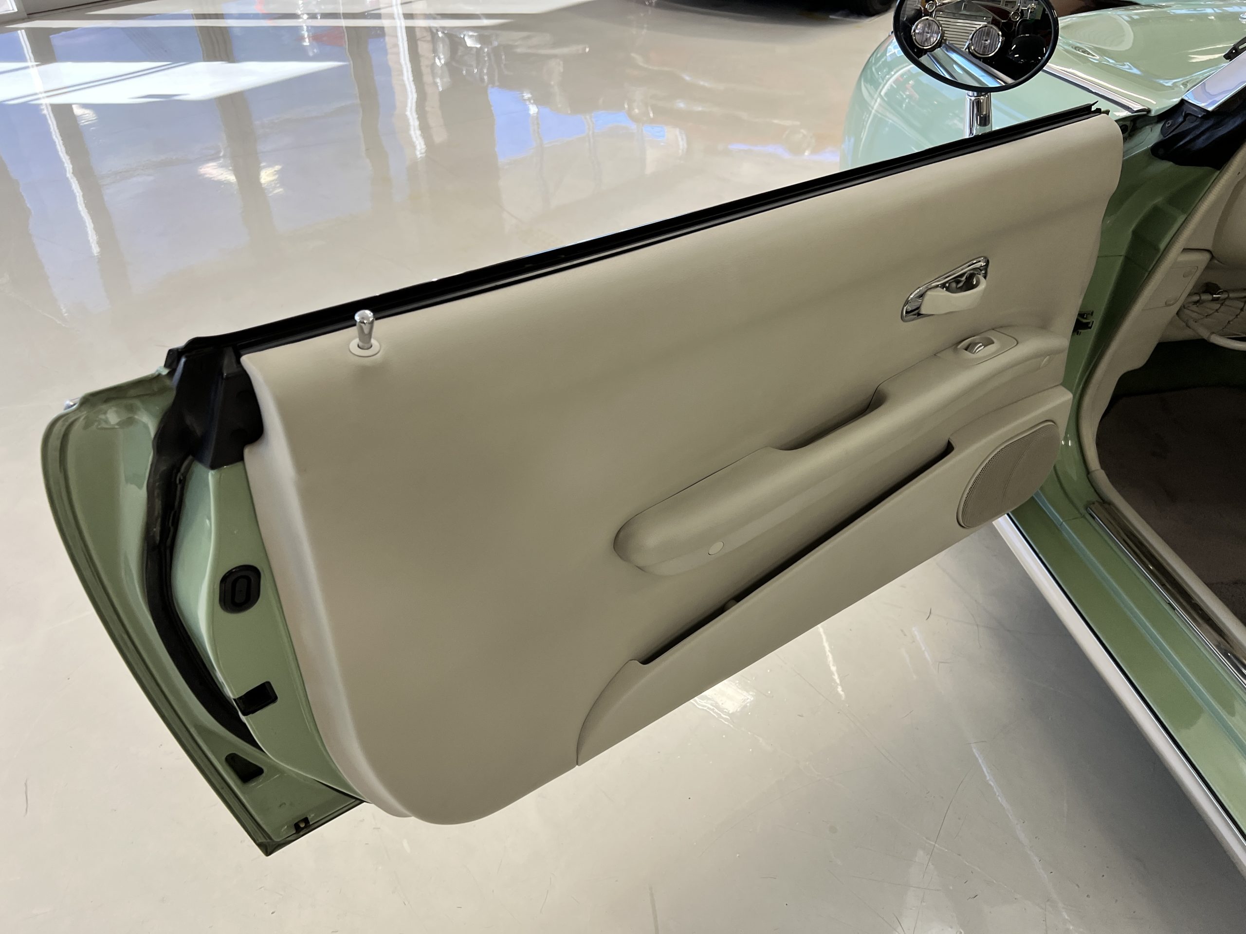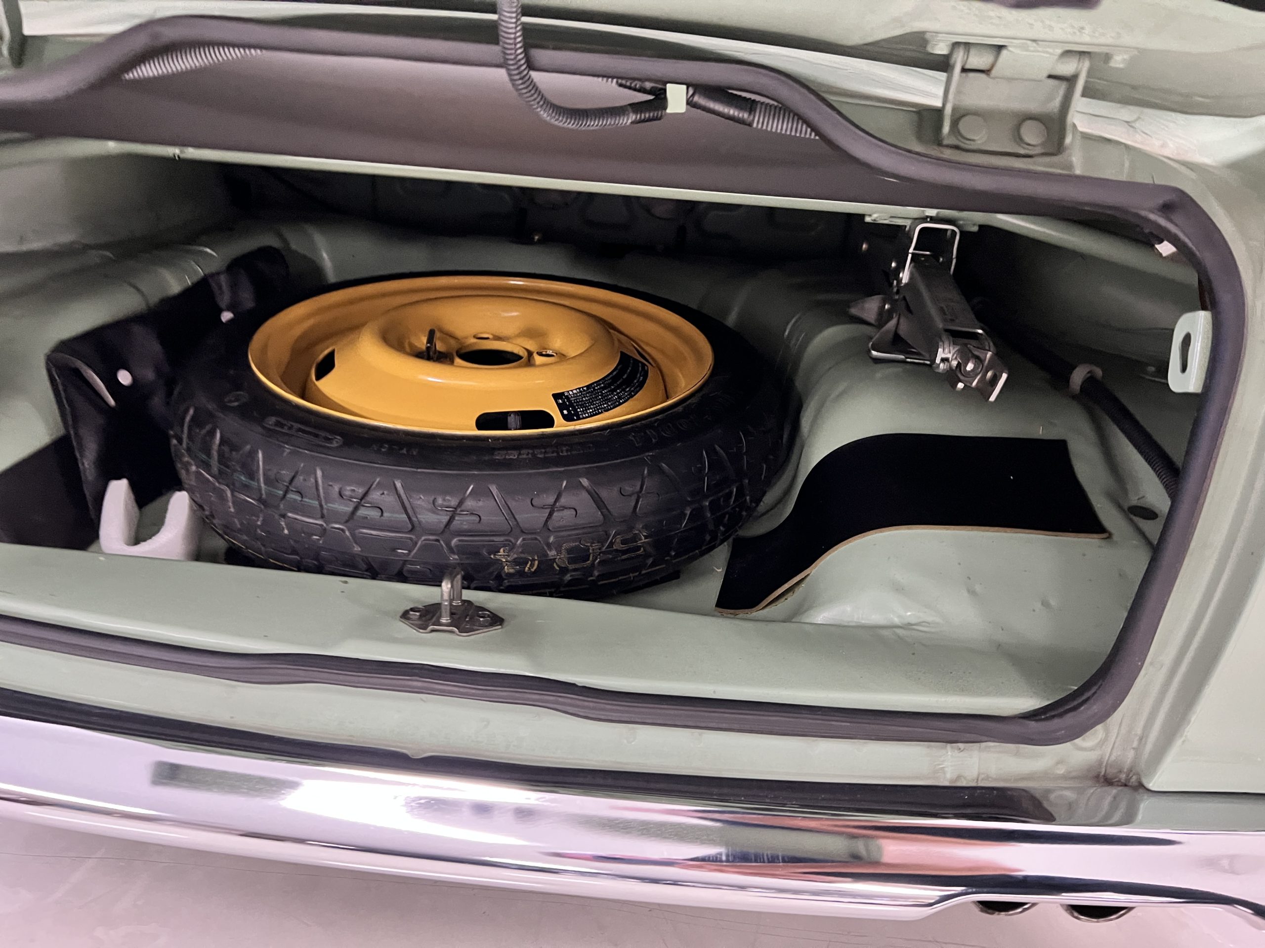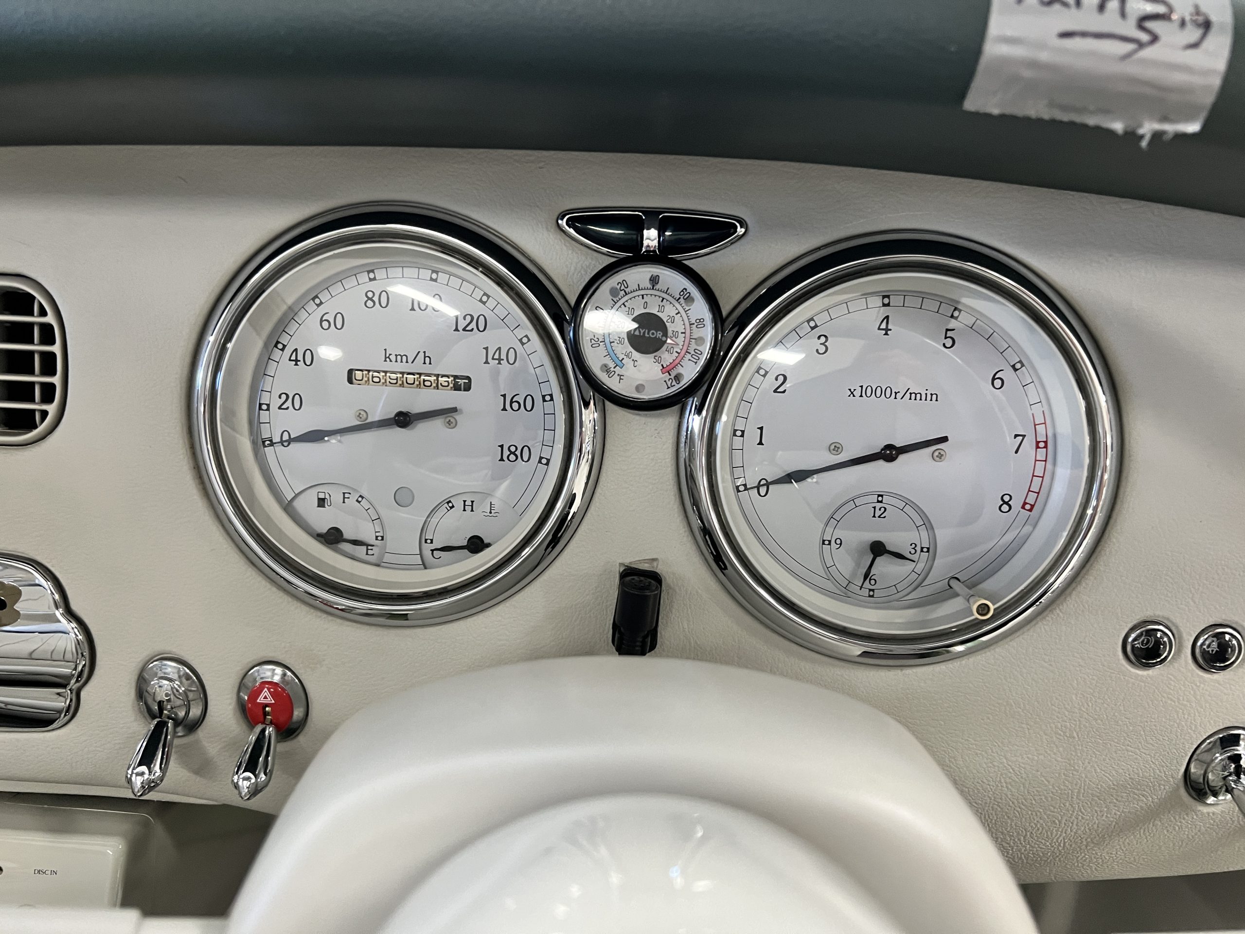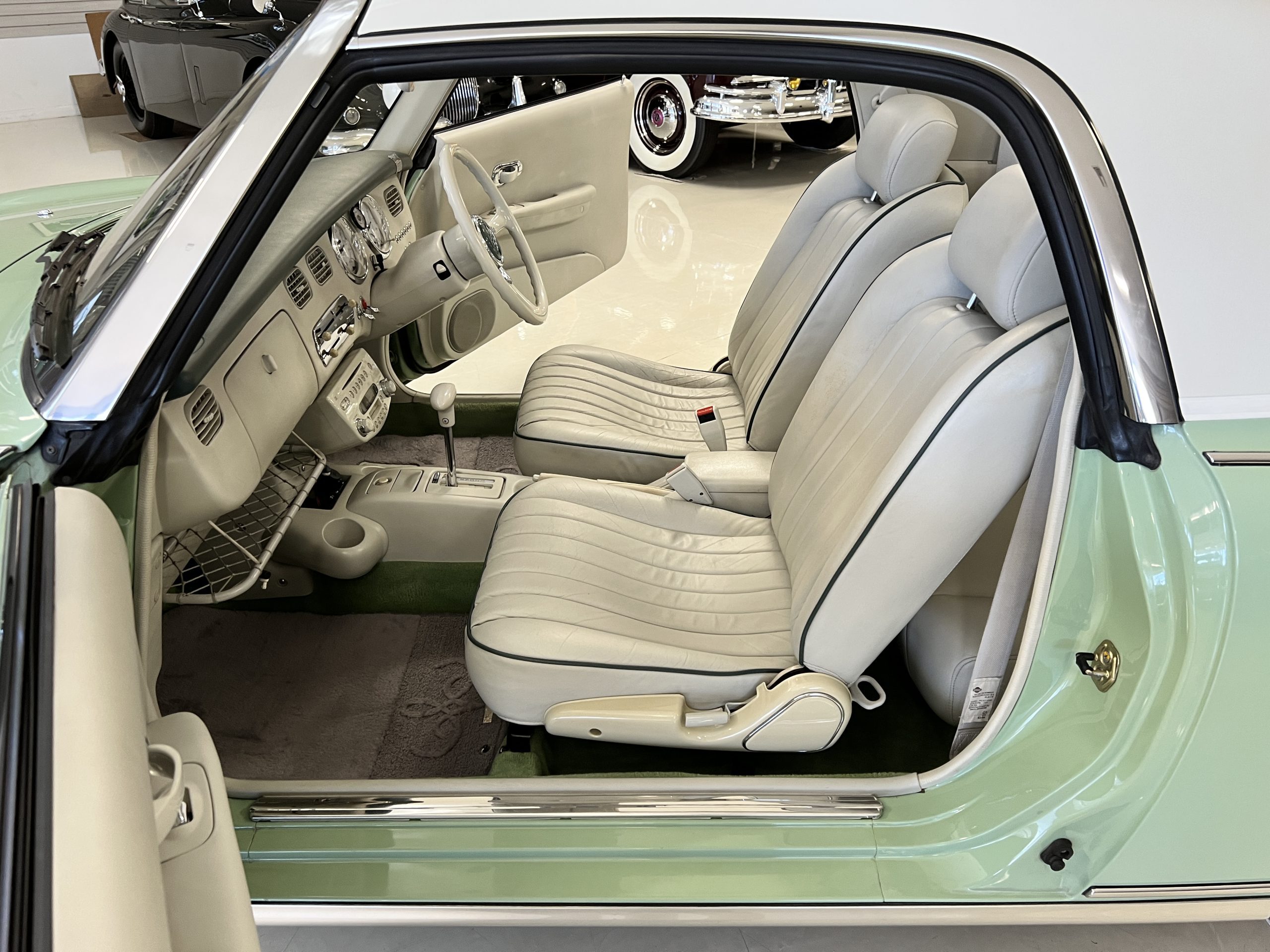 The interior is in very nice condition in its original crème leather with green piping. The leather is soft and supple with only slight wear on the driver’s seat. The Spring Green carpeting is in excellent condition being protected by the gray Figaro branded carpeted floor mats. The dash is in excellent condition in crème and the instrumentation works well with the crème-colored faces. The soft top retracts in seconds and is easily handled by one person. The soft top is in excellent condition and this Figaro includes a spare top in the sale. The Clarion stereo has been upgraded to UK and USA radio tuning and also features a CD player and Bluetooth compatibility.