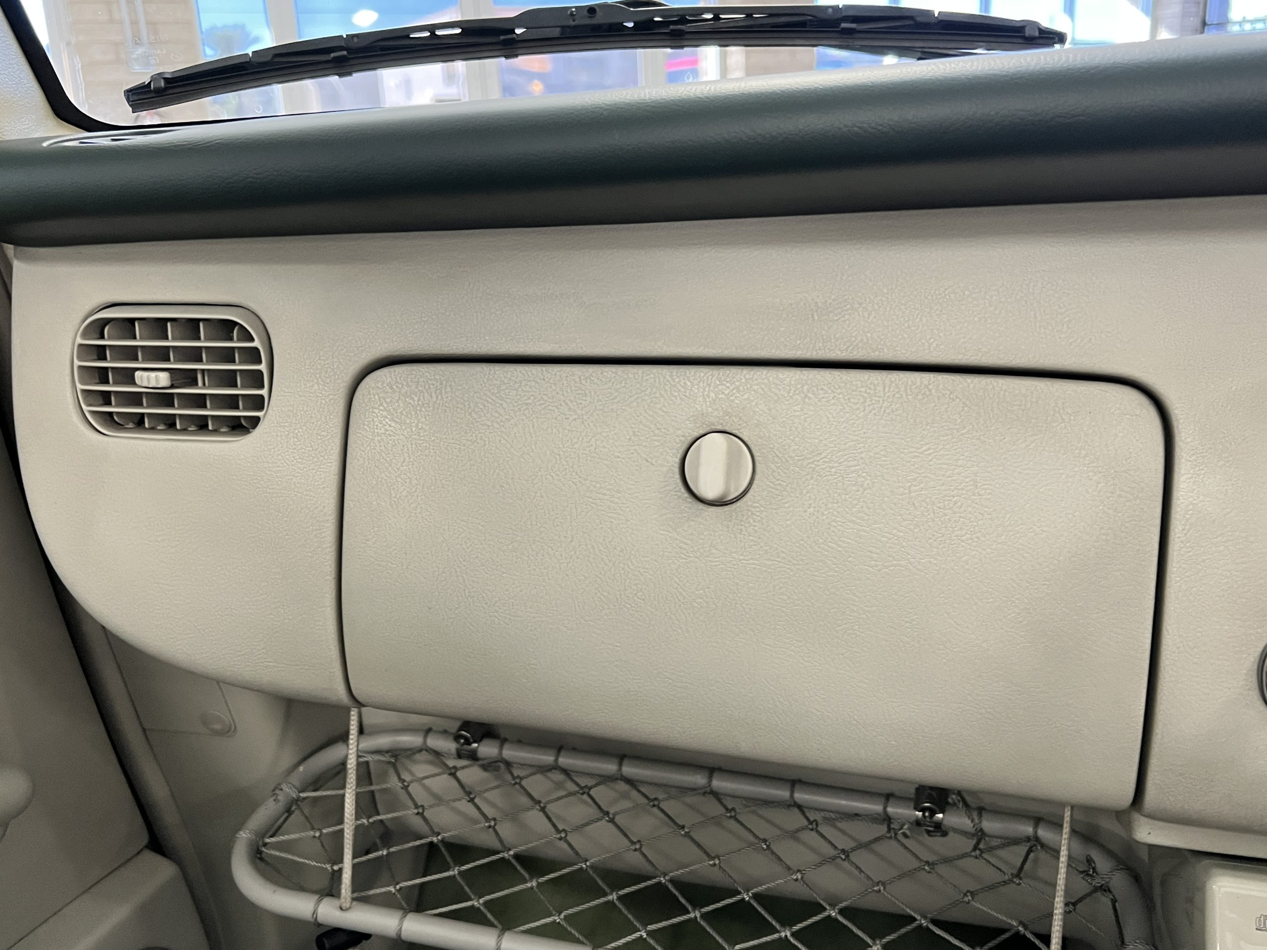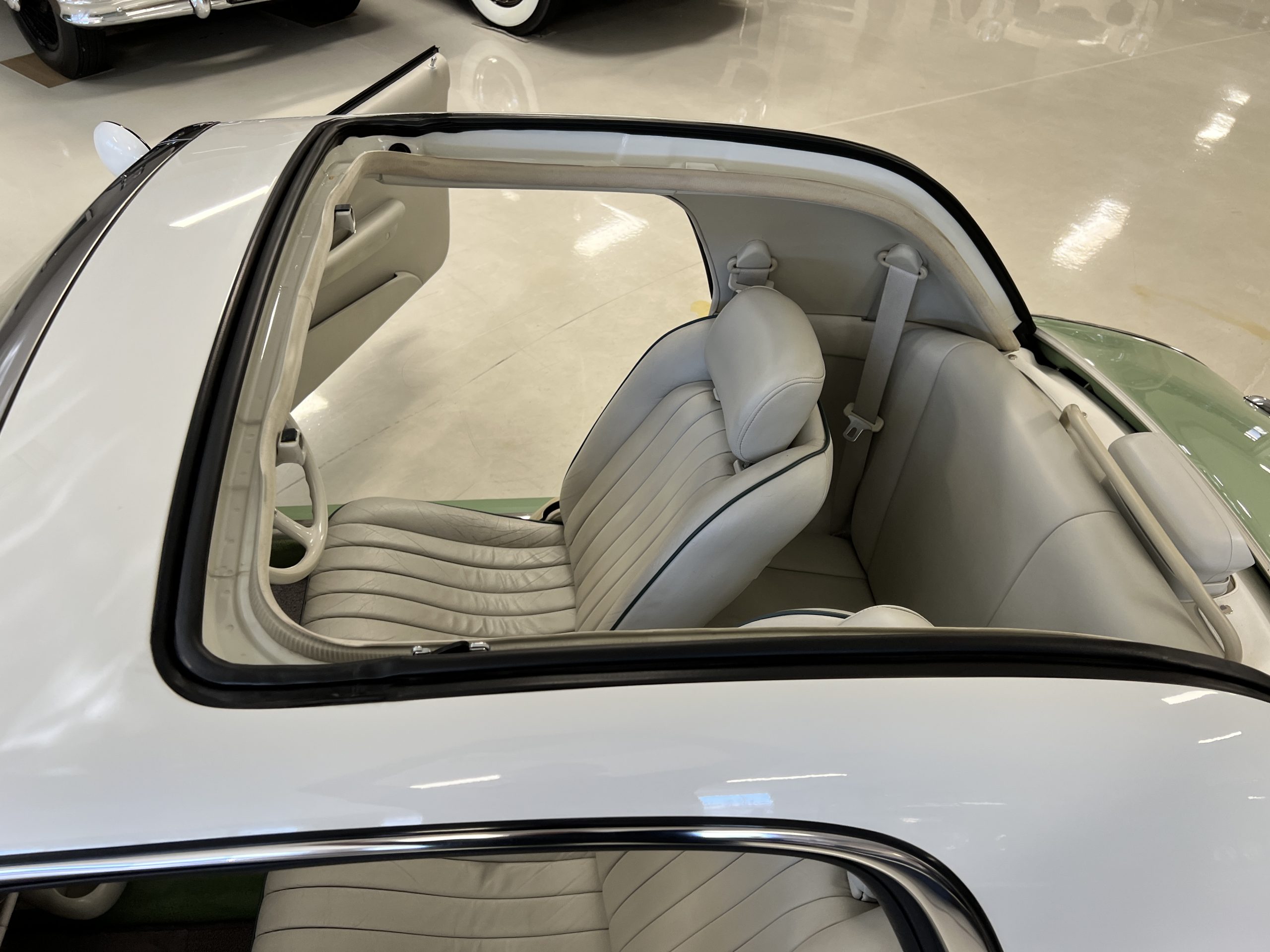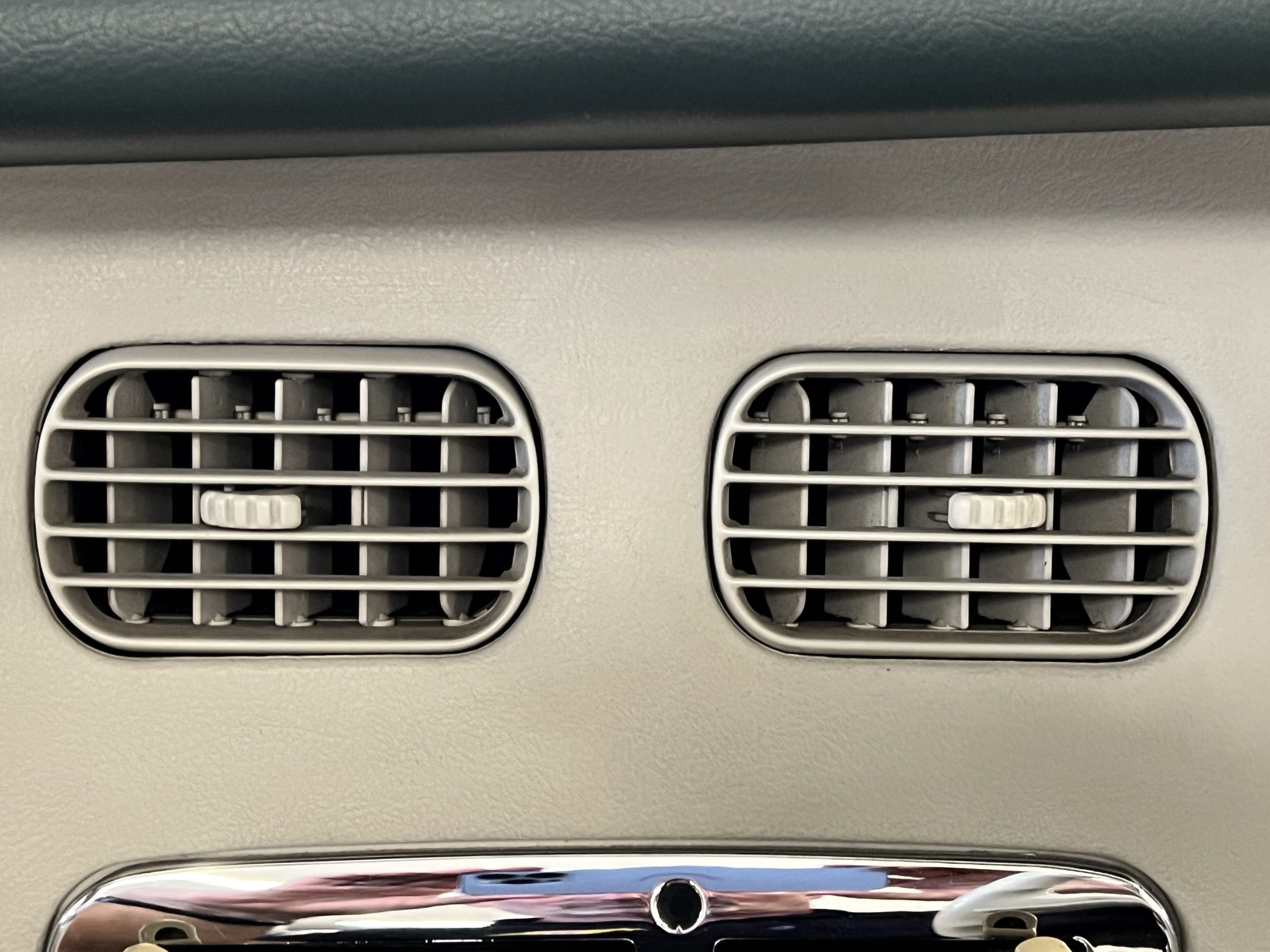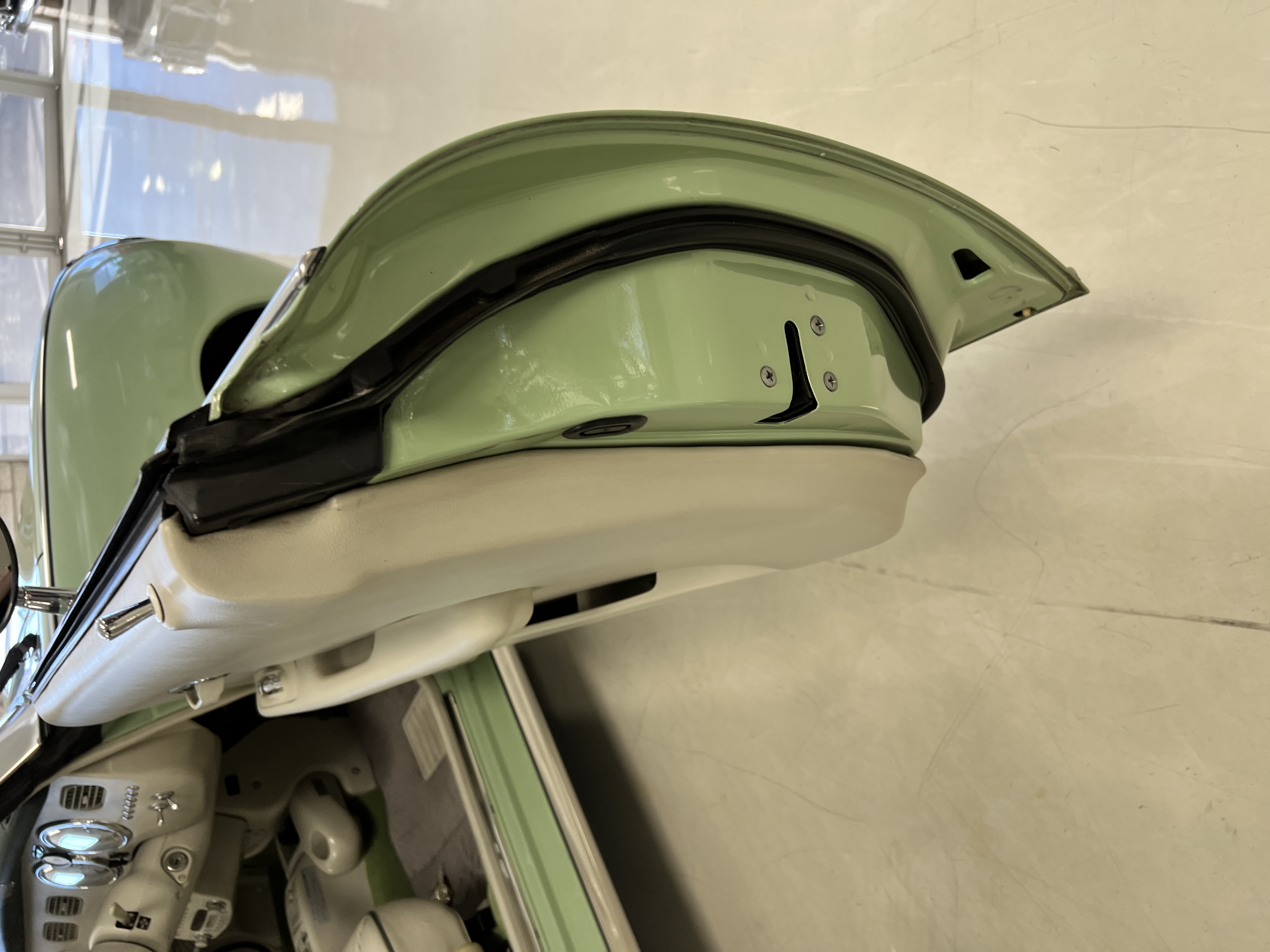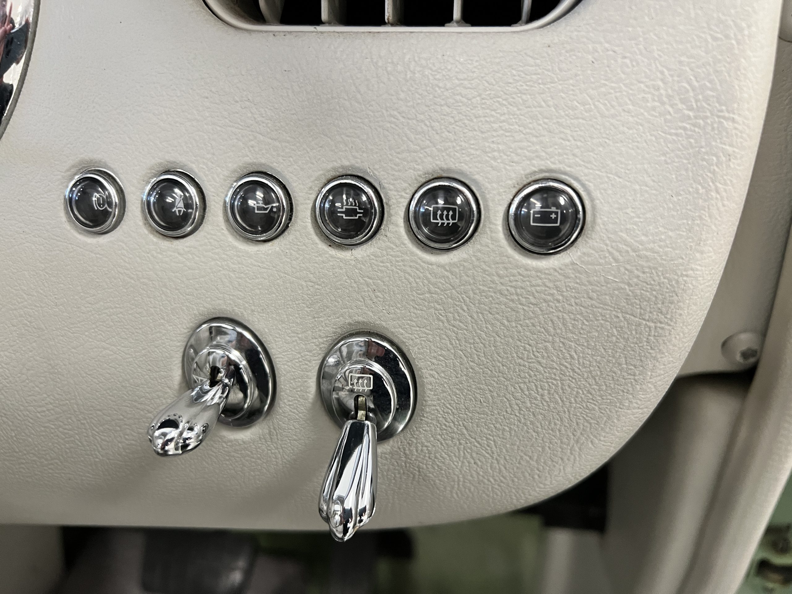 The interior is in very nice condition in its original crème leather with green piping. The leather is soft and supple with only slight wear on the driver’s seat. The Spring Green carpeting is in excellent condition being protected by the gray Figaro branded carpeted floor mats. The dash is in excellent condition in crème and the instrumentation works well with the crème-colored faces. The soft top retracts in seconds and is easily handled by one person. The soft top is in excellent condition and this Figaro includes a spare top in the sale. The Clarion stereo has been upgraded to UK and USA radio tuning and also features a CD player and Bluetooth compatibility.