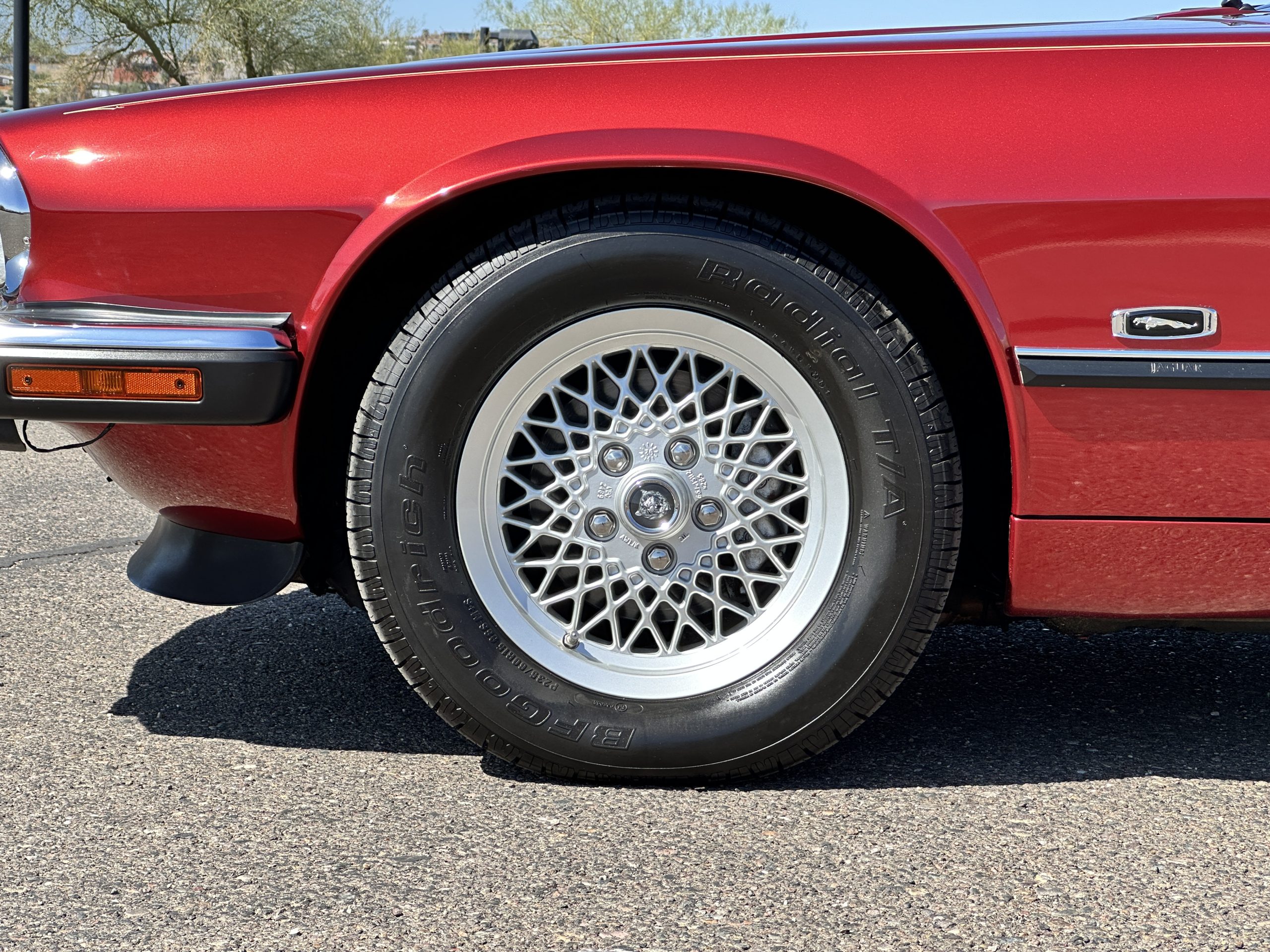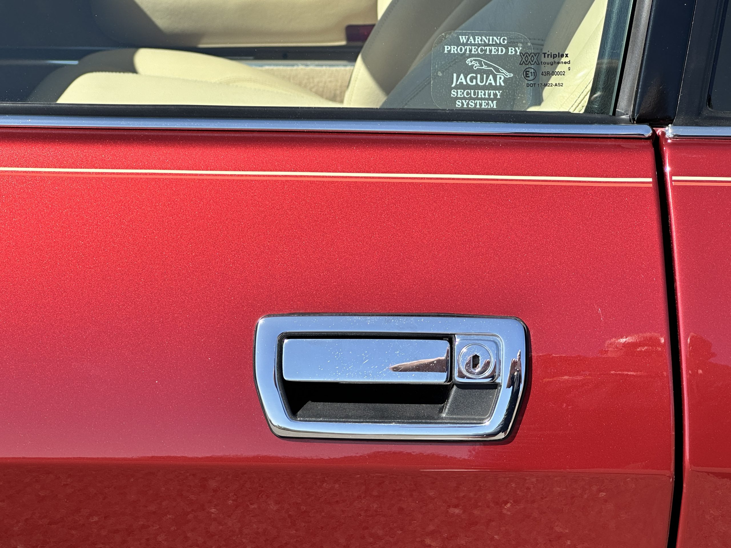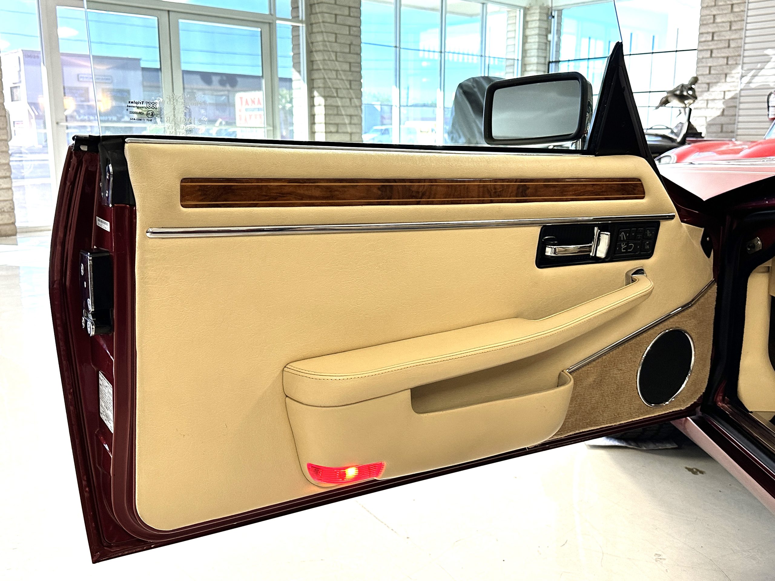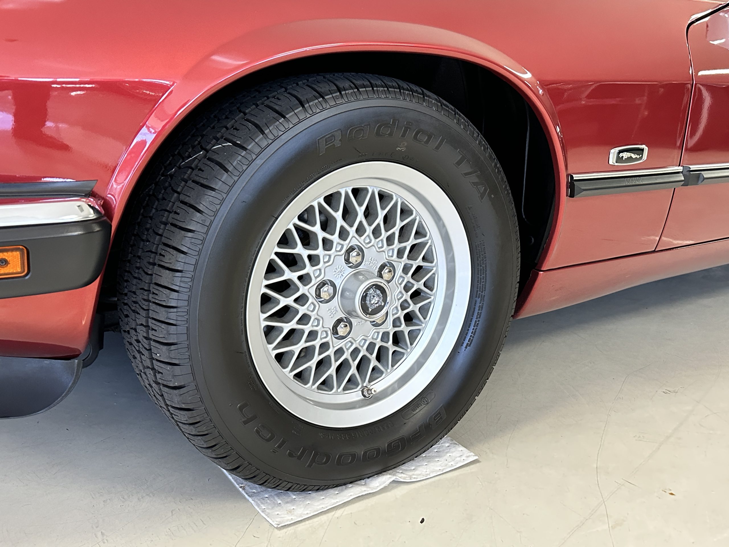 The gorgeous livery of this Jaguar is finished in Flamenco Metallic (Paint Code CFH) which has beautiful luster and shine which comes alive in daylight.  In the shade or evening light the paint is a darker Bordeaux yet in the sunlight the paint lights up brilliantly.  This era Jaguar was highly regarded for their gorgeous paint colors, and this is no exception.  The livery is nearly flawless in appearance with the exception of very few very small imperfections which are only noticeable upon close inspection. The livery is accented with red and tan pinstripes which really accentuate the sexy body lines of the XJS. The chrome and bright work show well throughout as do the cast aluminum wheels which are wrapped in new BF Goodrich T/A radial tires. The Flamenco color and finish really accentuates the stunning design of this gorgeous Jaguar XJS.
