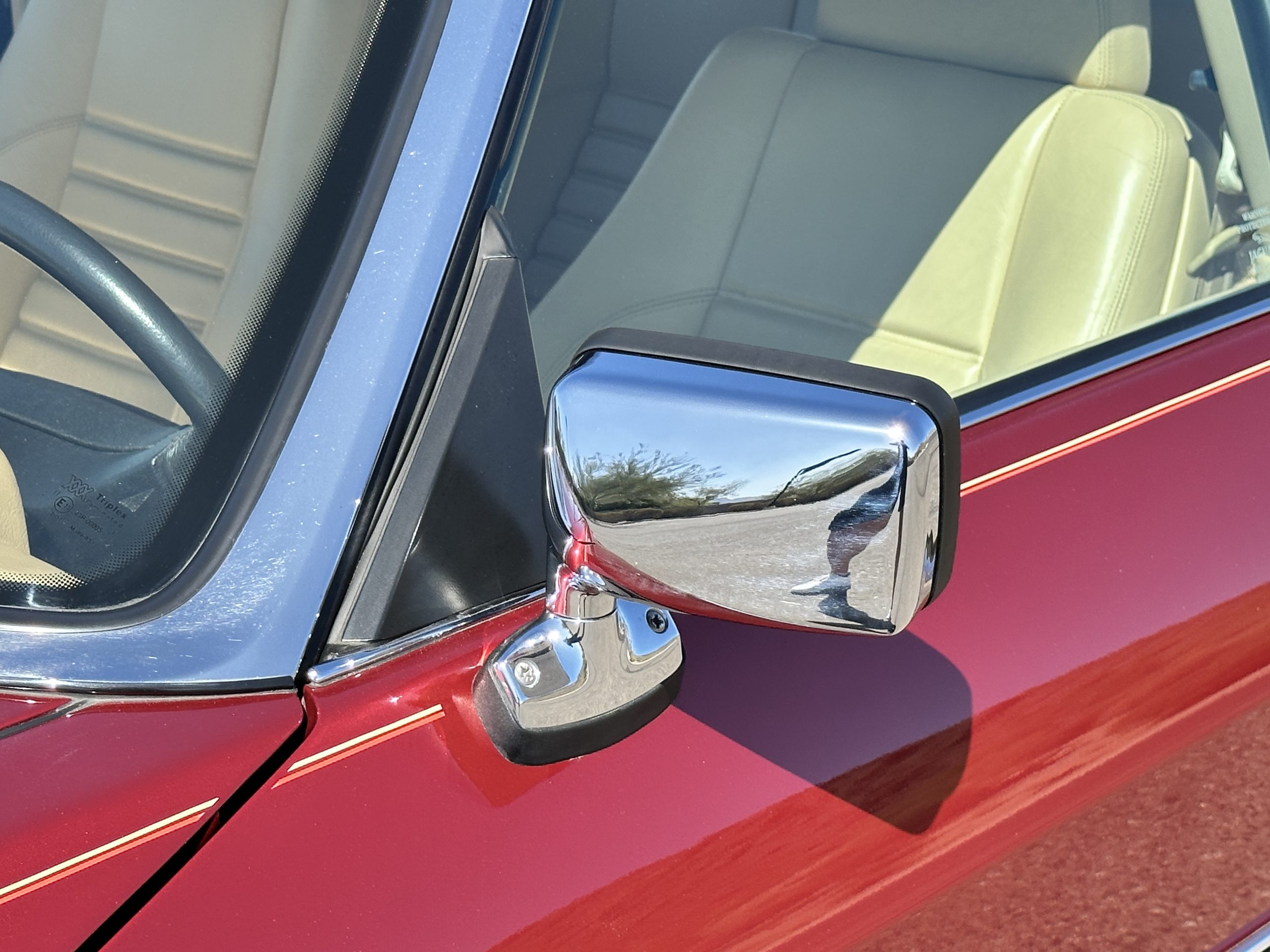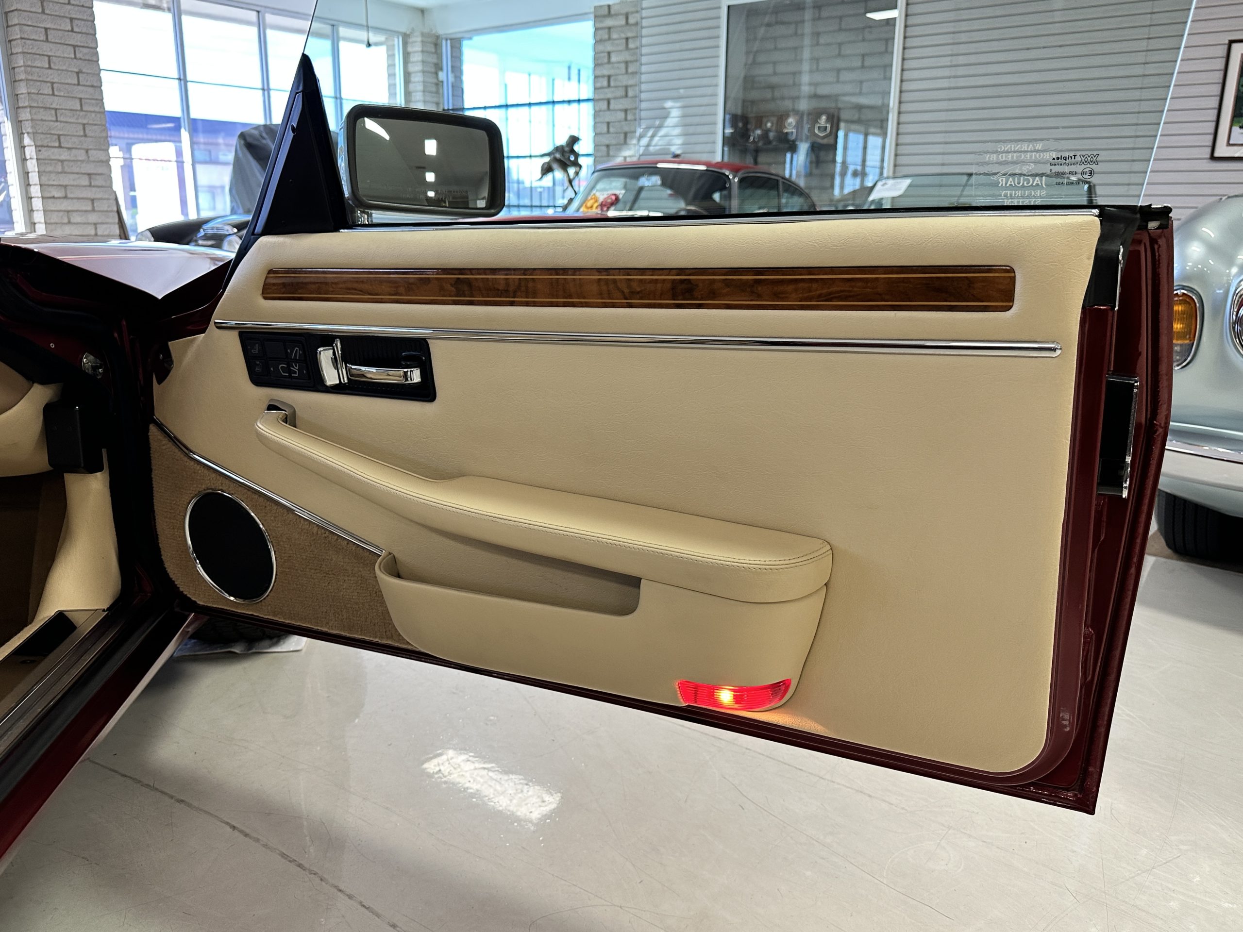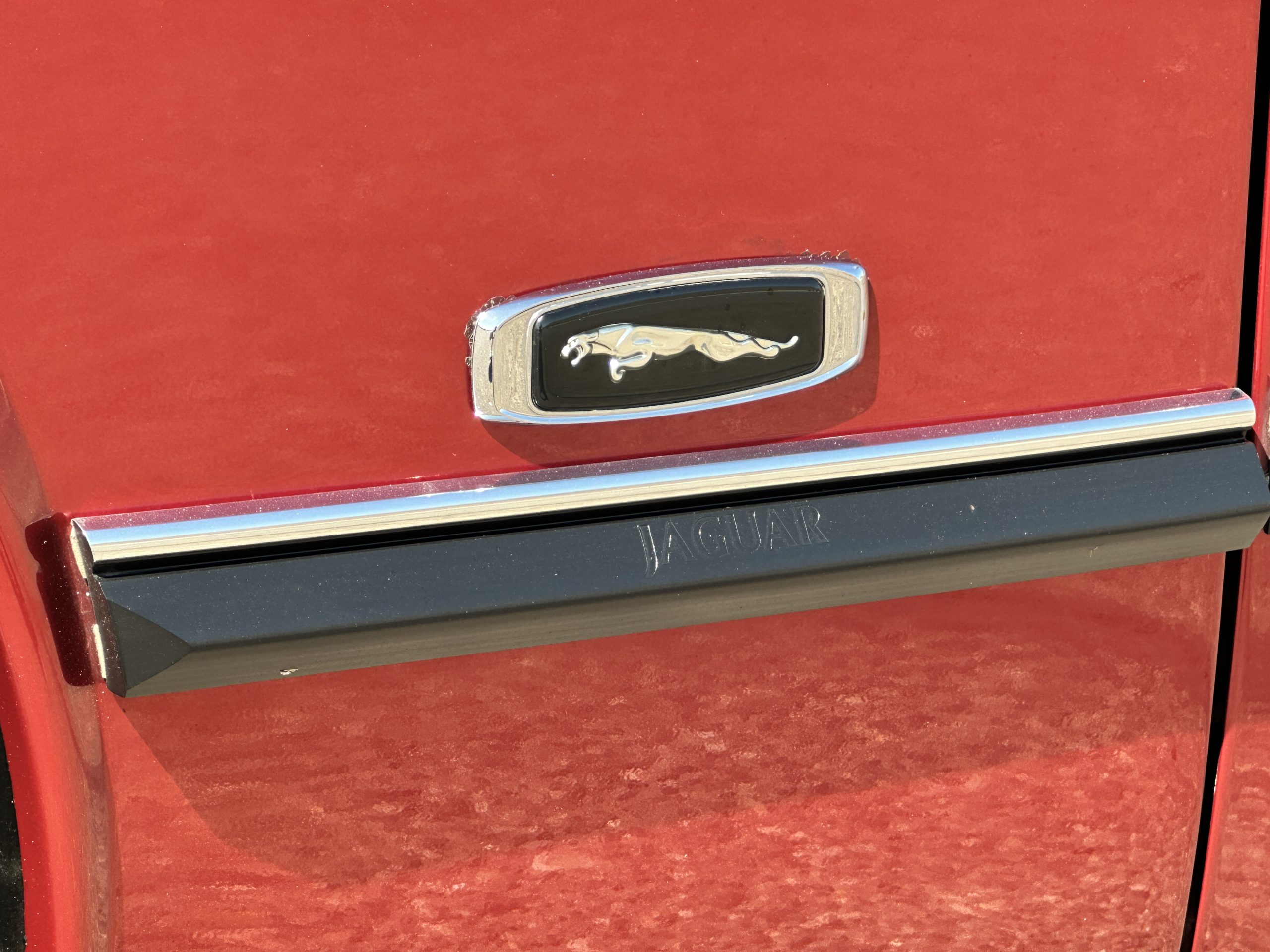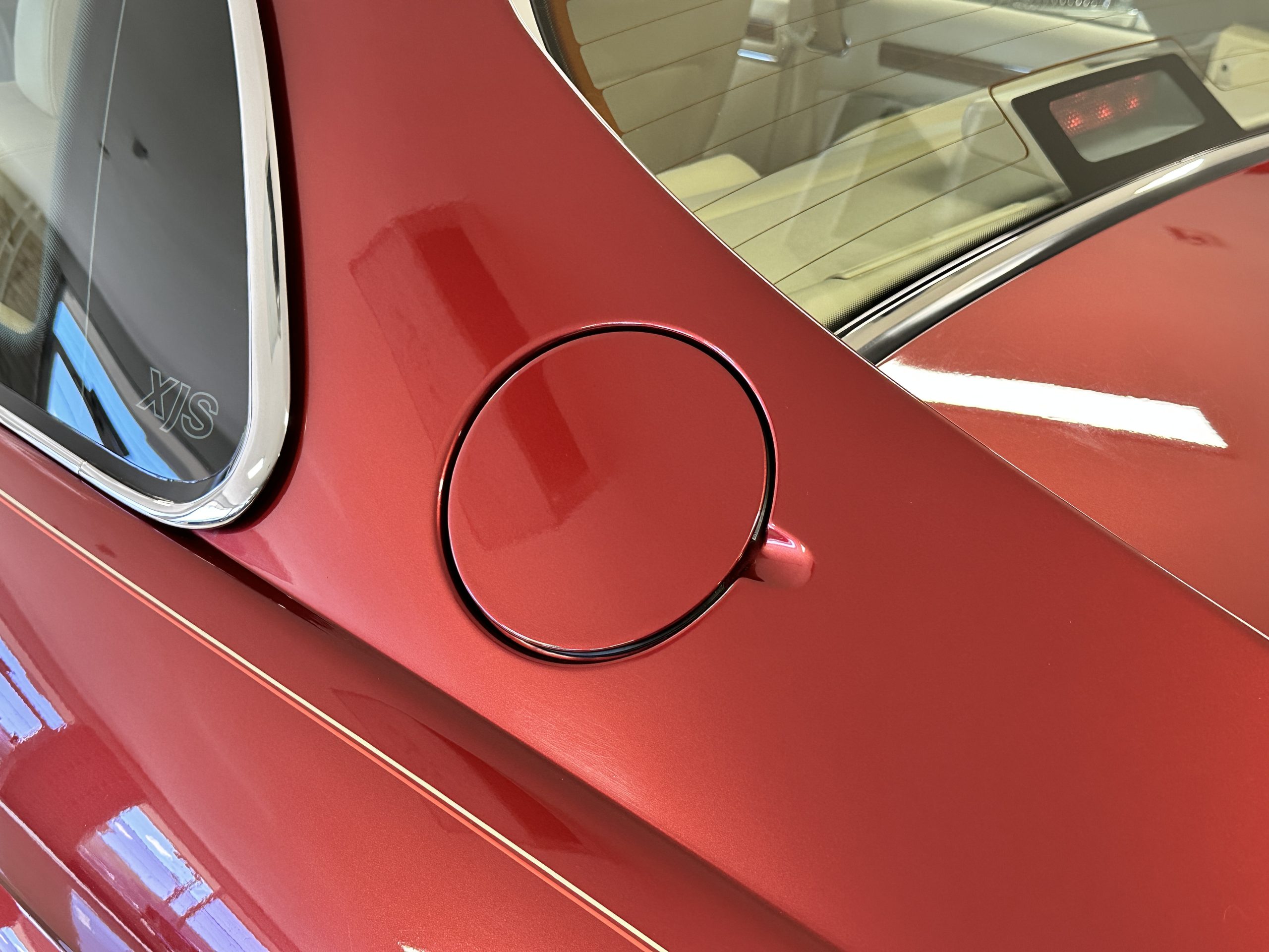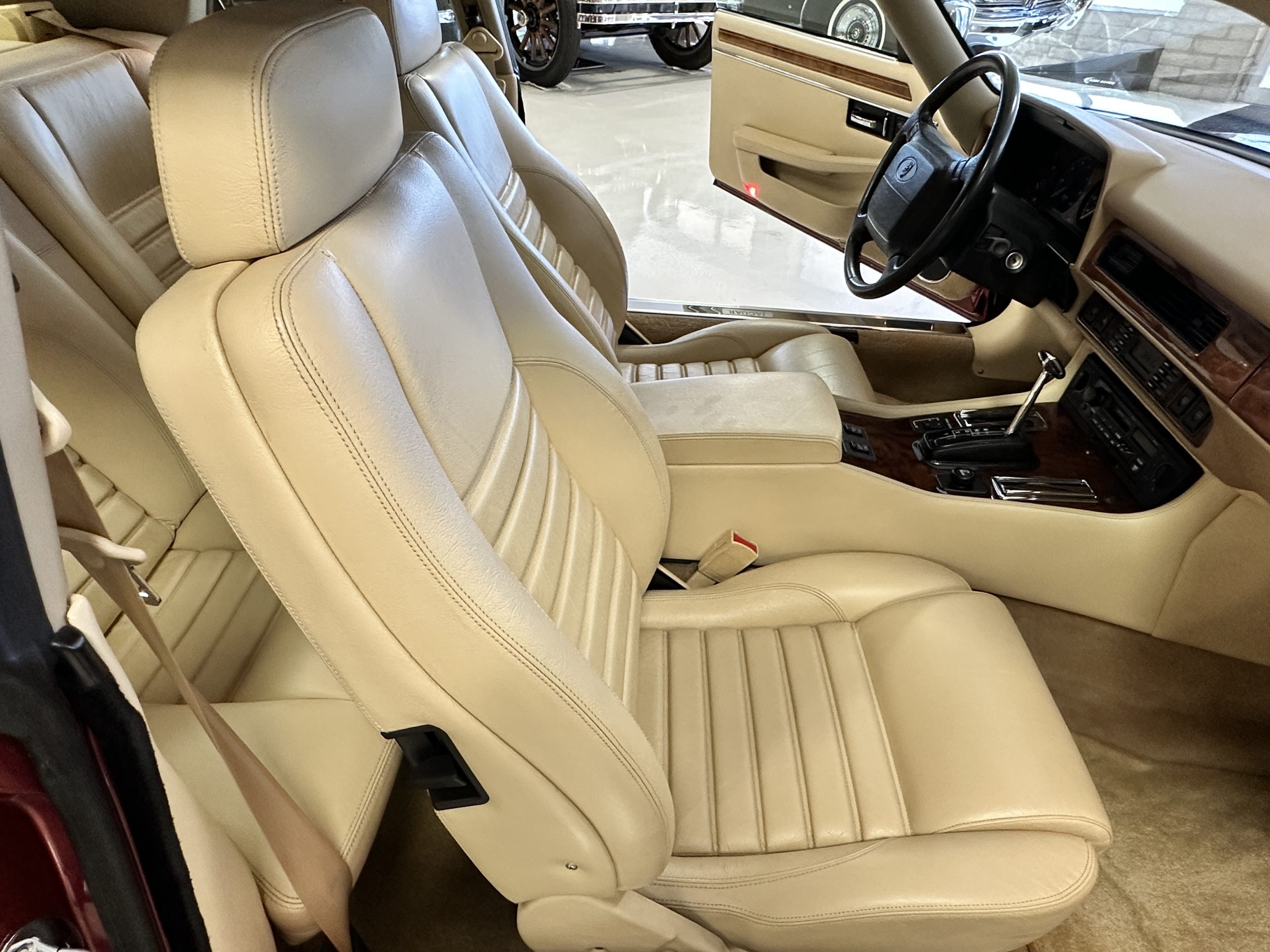 The gorgeous livery of this Jaguar is finished in Flamenco Metallic (Paint Code CFH) which has beautiful luster and shine which comes alive in daylight.  In the shade or evening light the paint is a darker Bordeaux yet in the sunlight the paint lights up brilliantly.  This era Jaguar was highly regarded for their gorgeous paint colors, and this is no exception.  The livery is nearly flawless in appearance with the exception of very few very small imperfections which are only noticeable upon close inspection. The livery is accented with red and tan pinstripes which really accentuate the sexy body lines of the XJS. The chrome and bright work show well throughout as do the cast aluminum wheels which are wrapped in new BF Goodrich T/A radial tires. The Flamenco color and finish really accentuates the stunning design of this gorgeous Jaguar XJS.