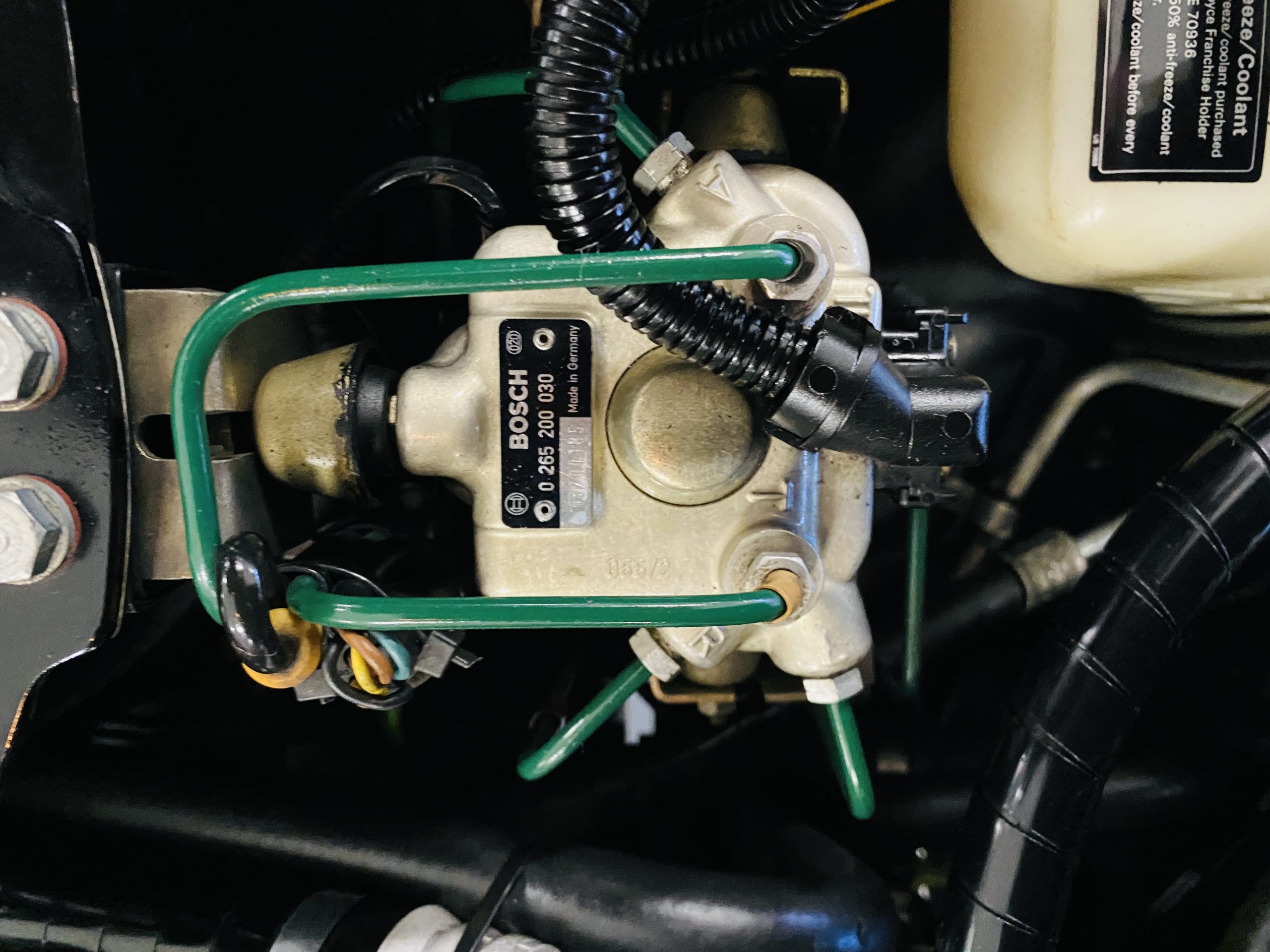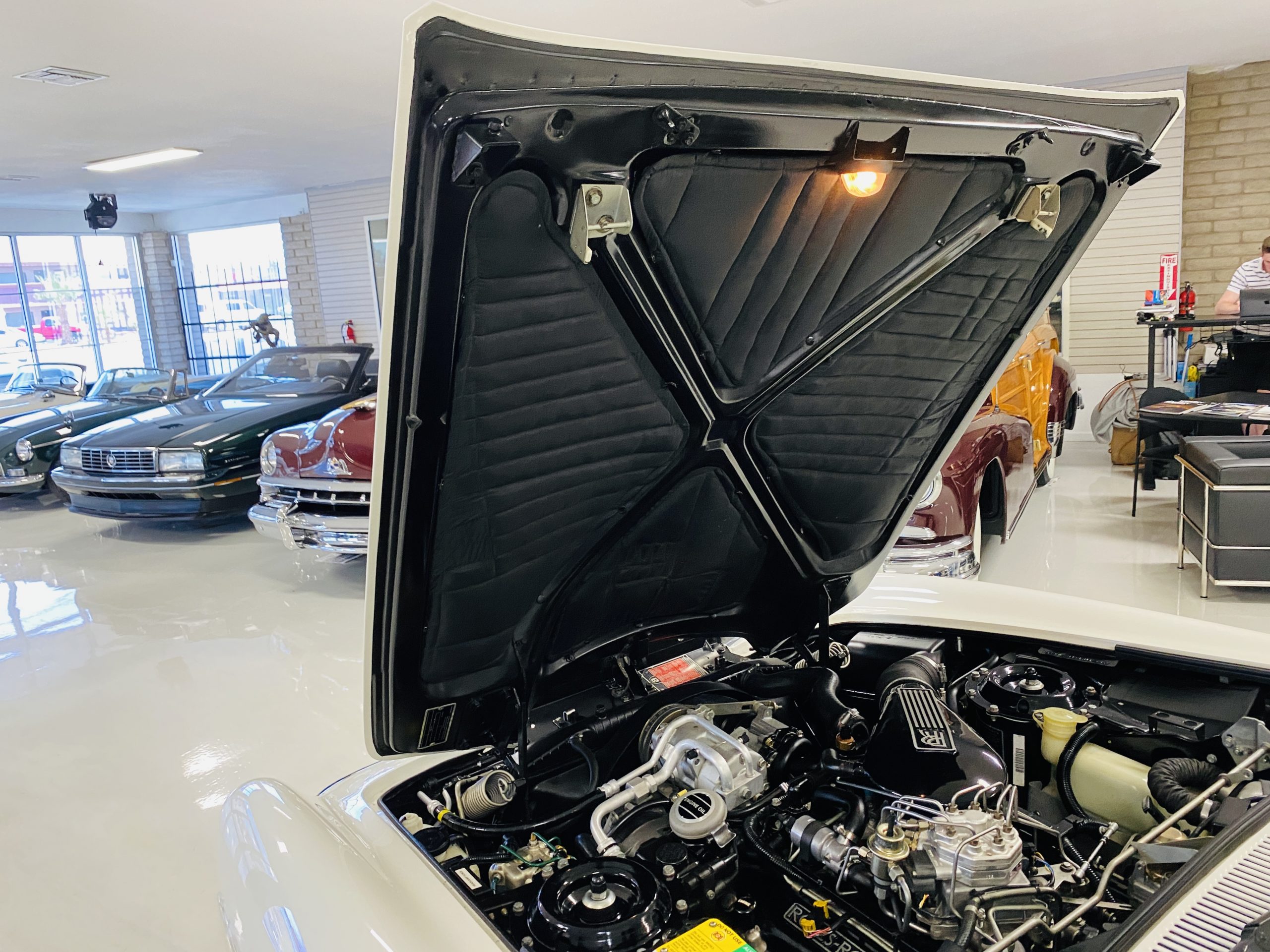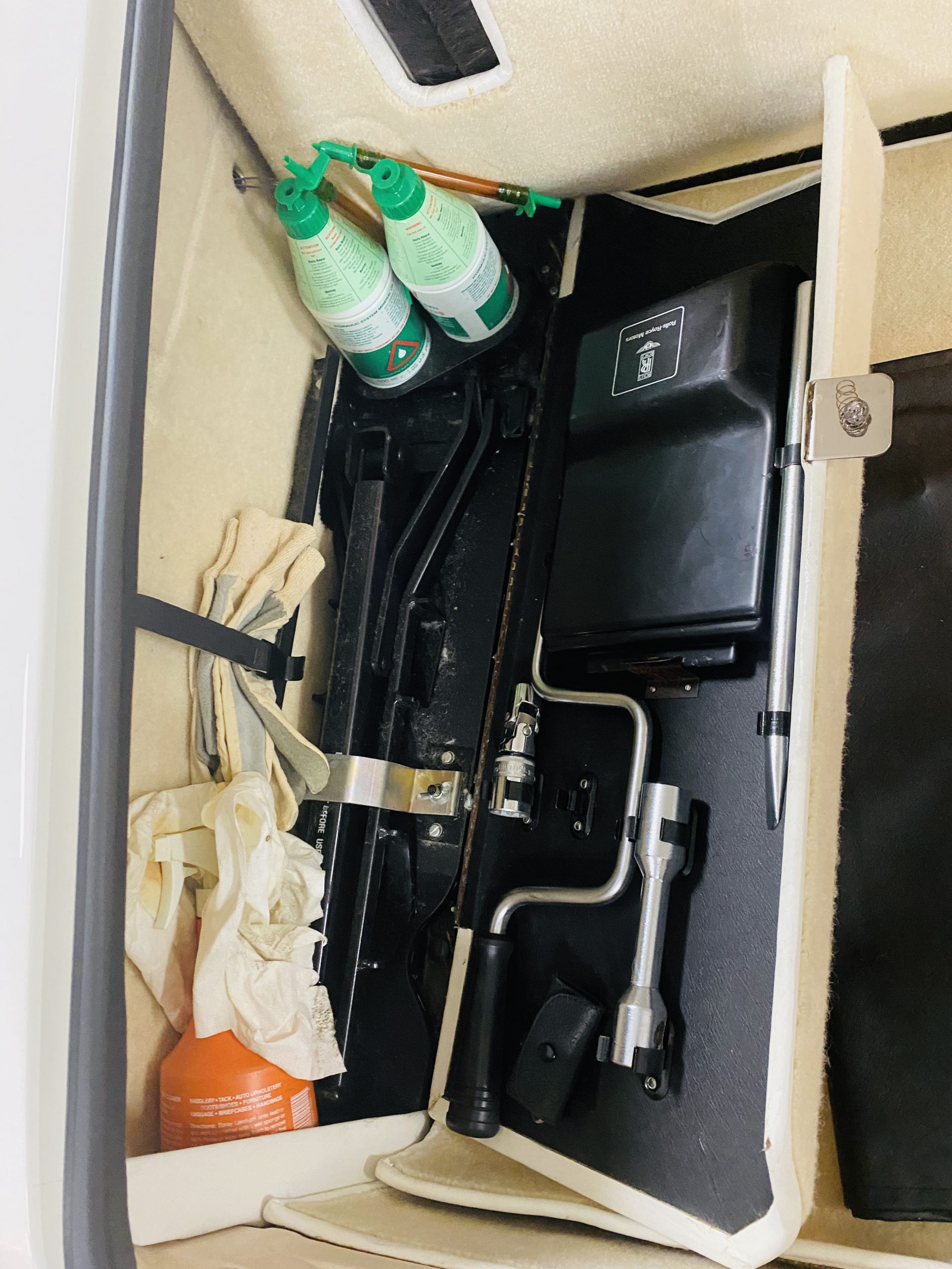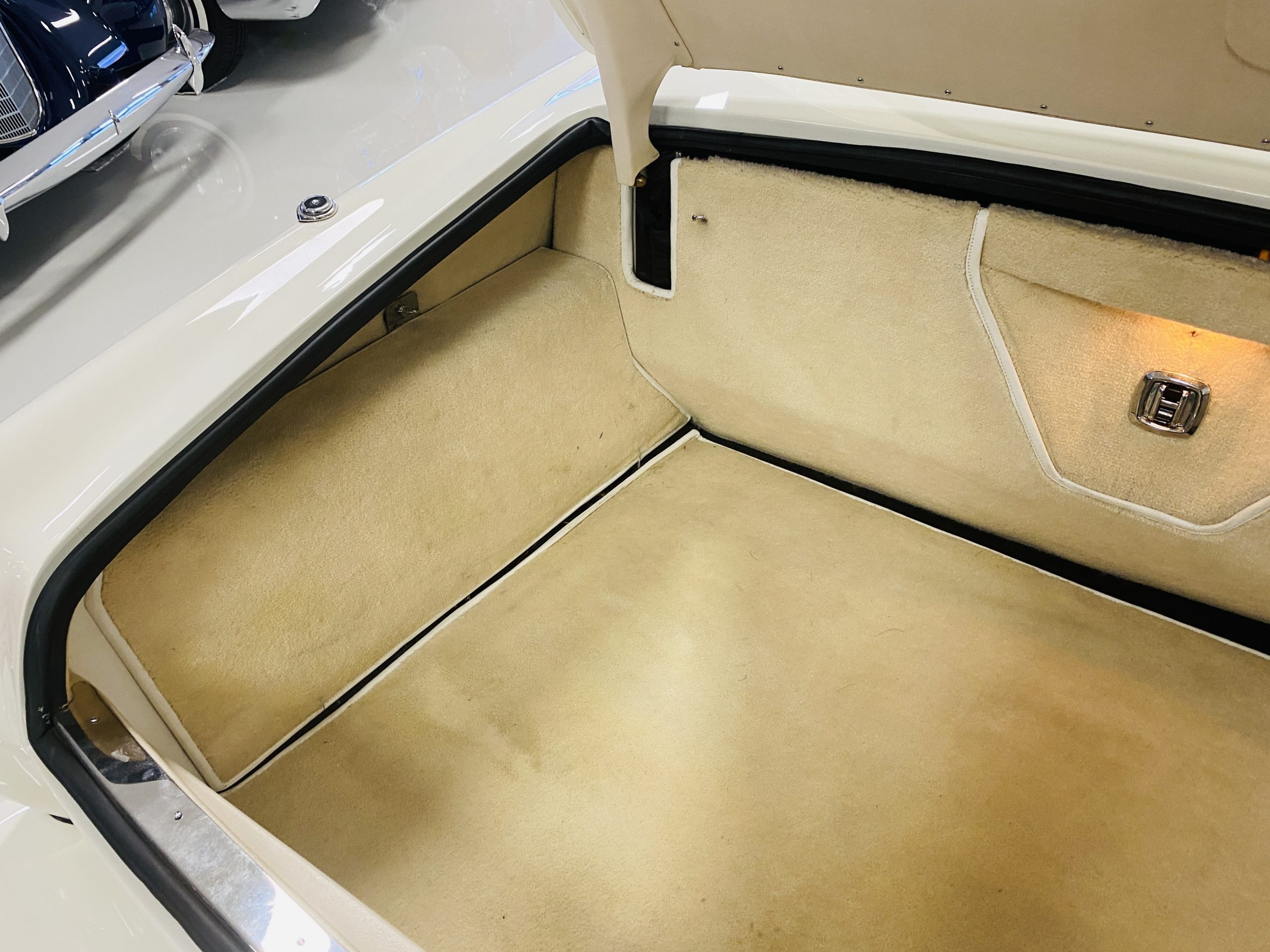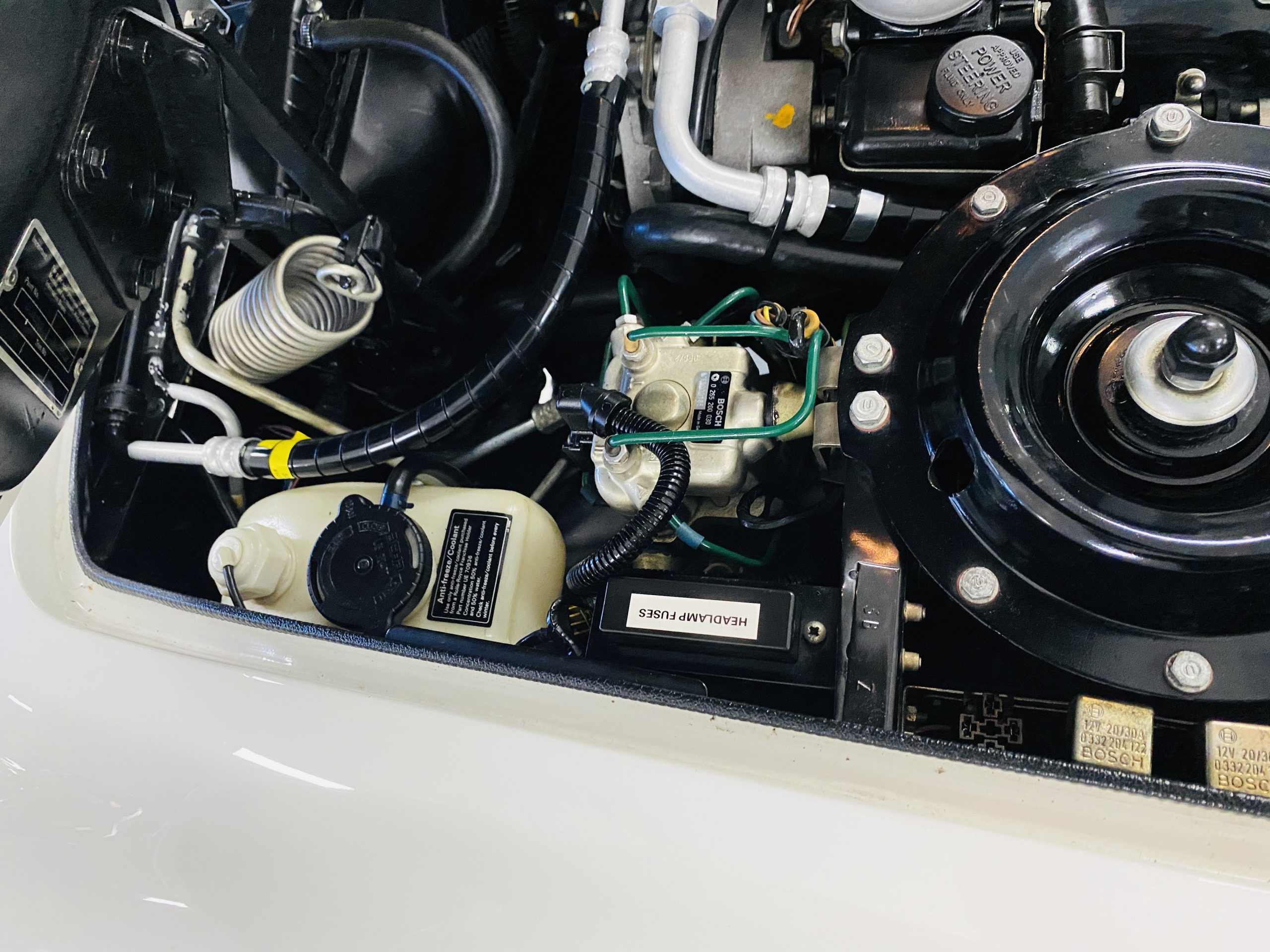 The livery is beautiful in its original white (Code RR.9520090) and magnolia (Code RR.95.20093) with white double coach stripes. The paint is stunning with its factory finish without orange peel and still looking as though it is new! The stainless steel and chrome are overall in excellent condition, with only normal use shown via small fine scratches in the stainless steel. The white Everflex convertible top is in excellent condition and the rear window is clear and also in great condition. Every part of the car reinforces that this has been faithfully garaged and cared for since new.