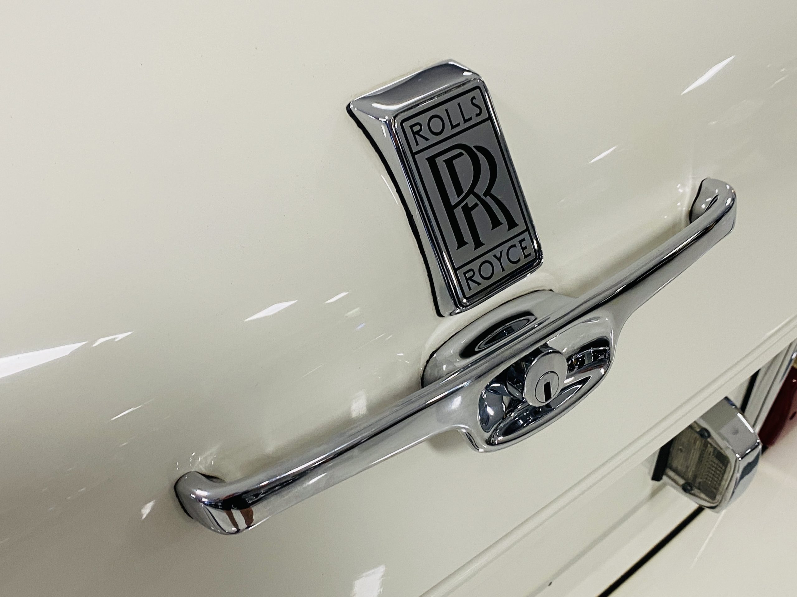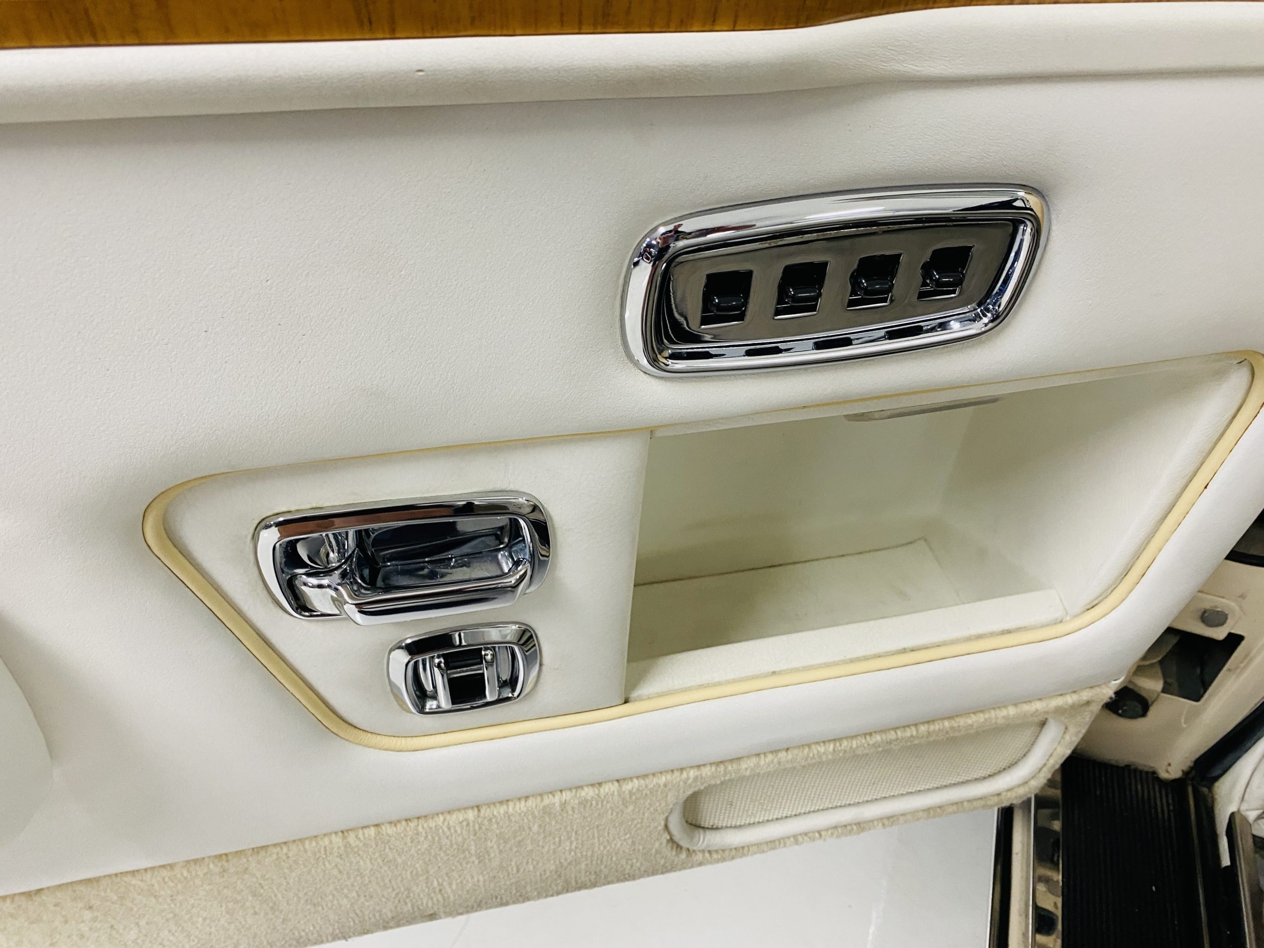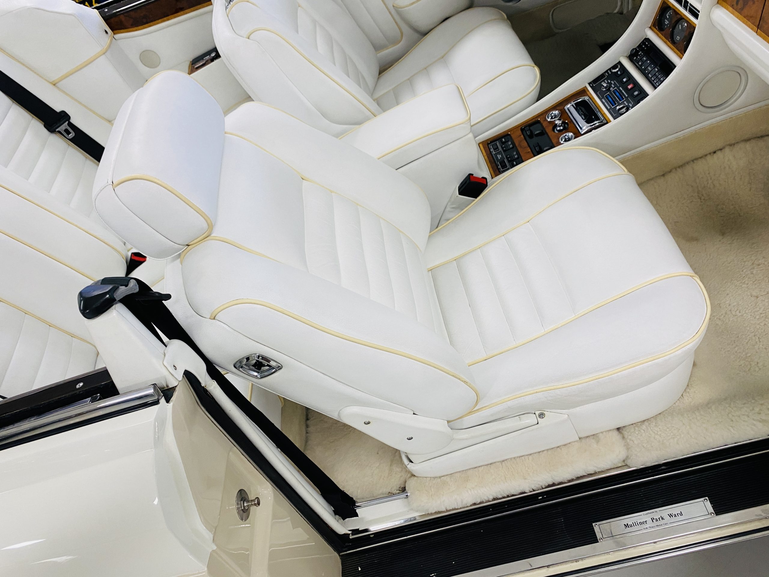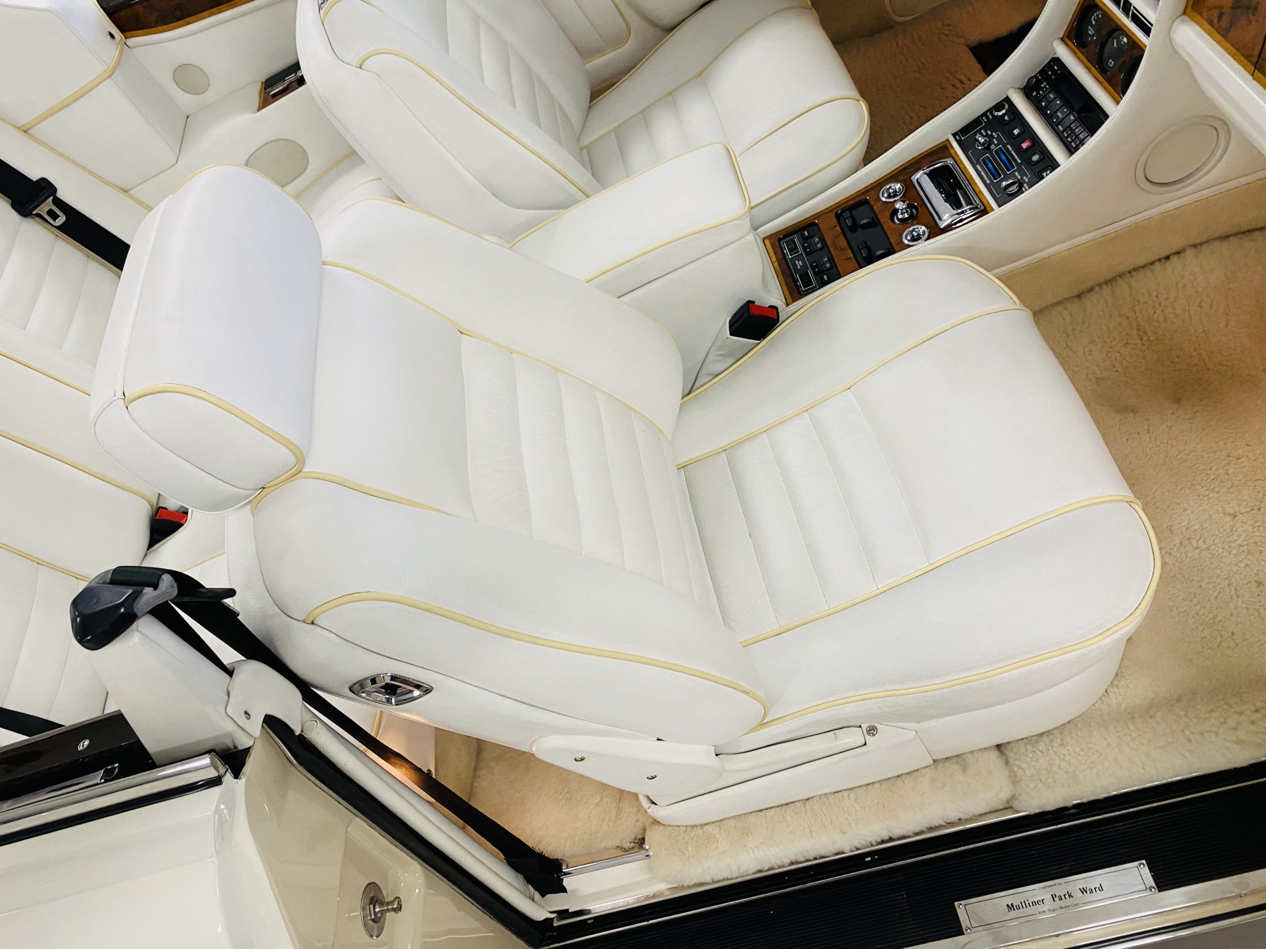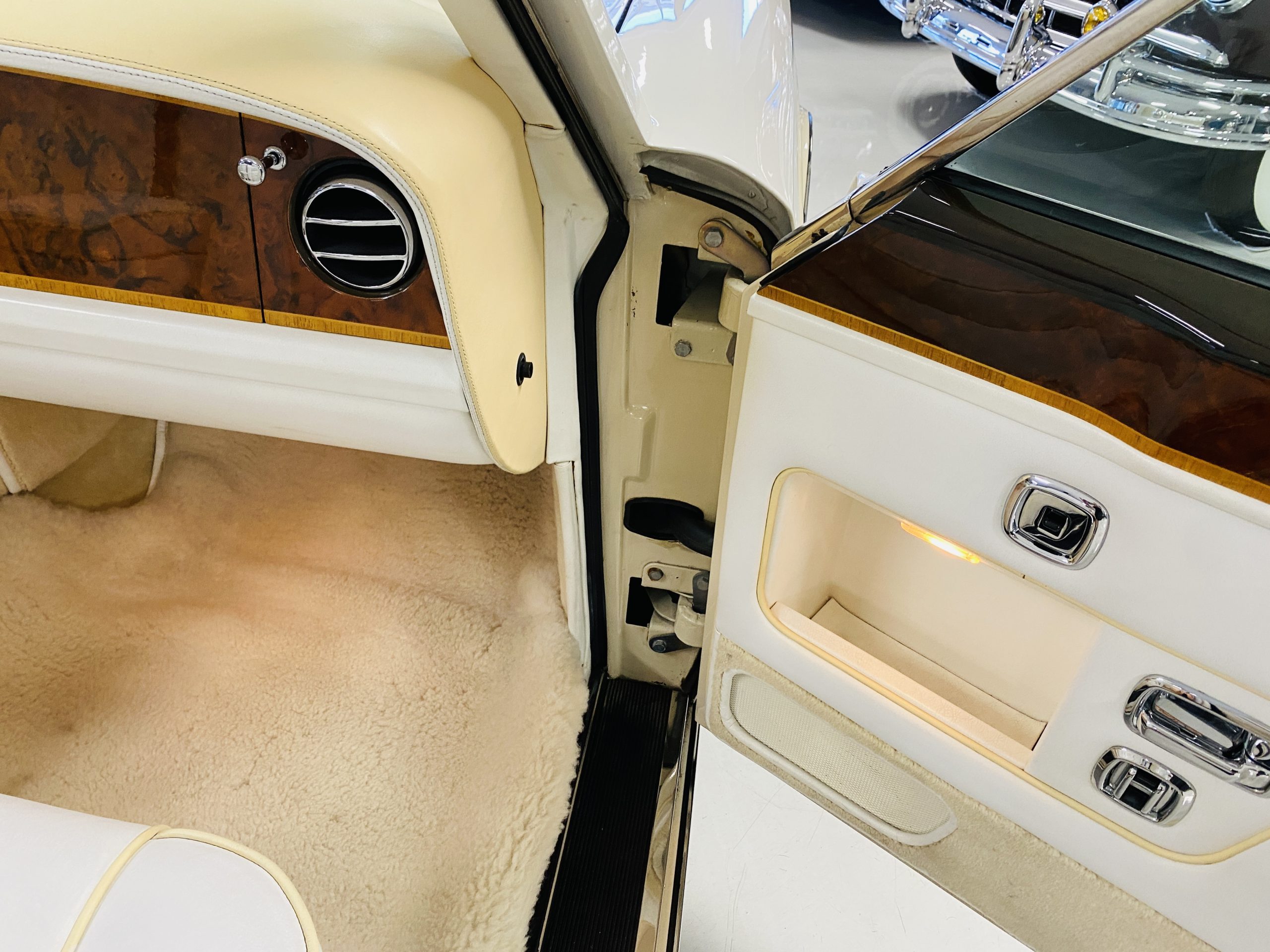 The white leather interior is complimented by magnolia piping and magnolia upper dash panel with triple tone wood veneer, including burl walnut, and two other contrasting veneers. The leather is in overall excellent condition with very minimal wear shown on the drivers seat, which one would expect after 10,400 miles. The leather is soft and supple and also shows that this Rolls has been loved and cared for. The magnolia Wilton wool carpets are nearly as new and are covered by the original white mouton sheepskin overlays which are in very nice condition.