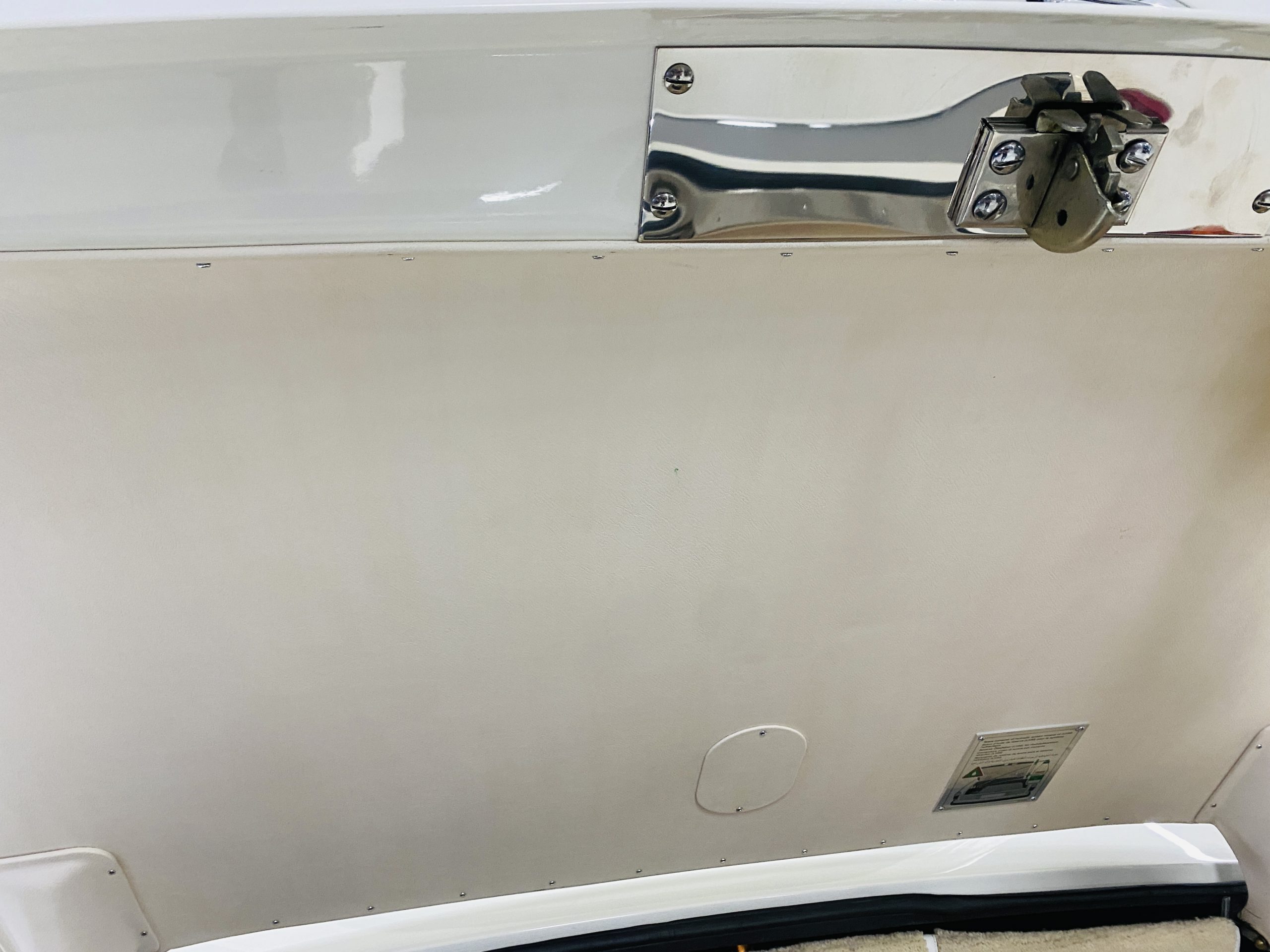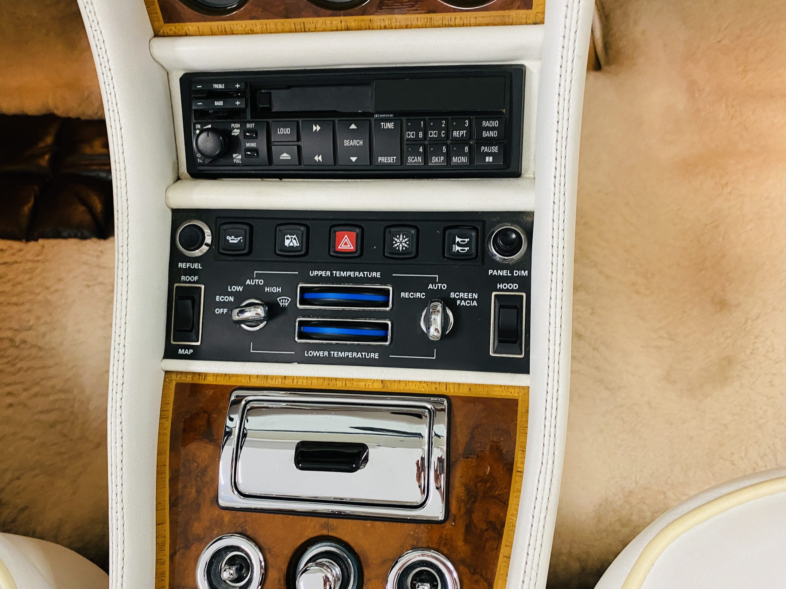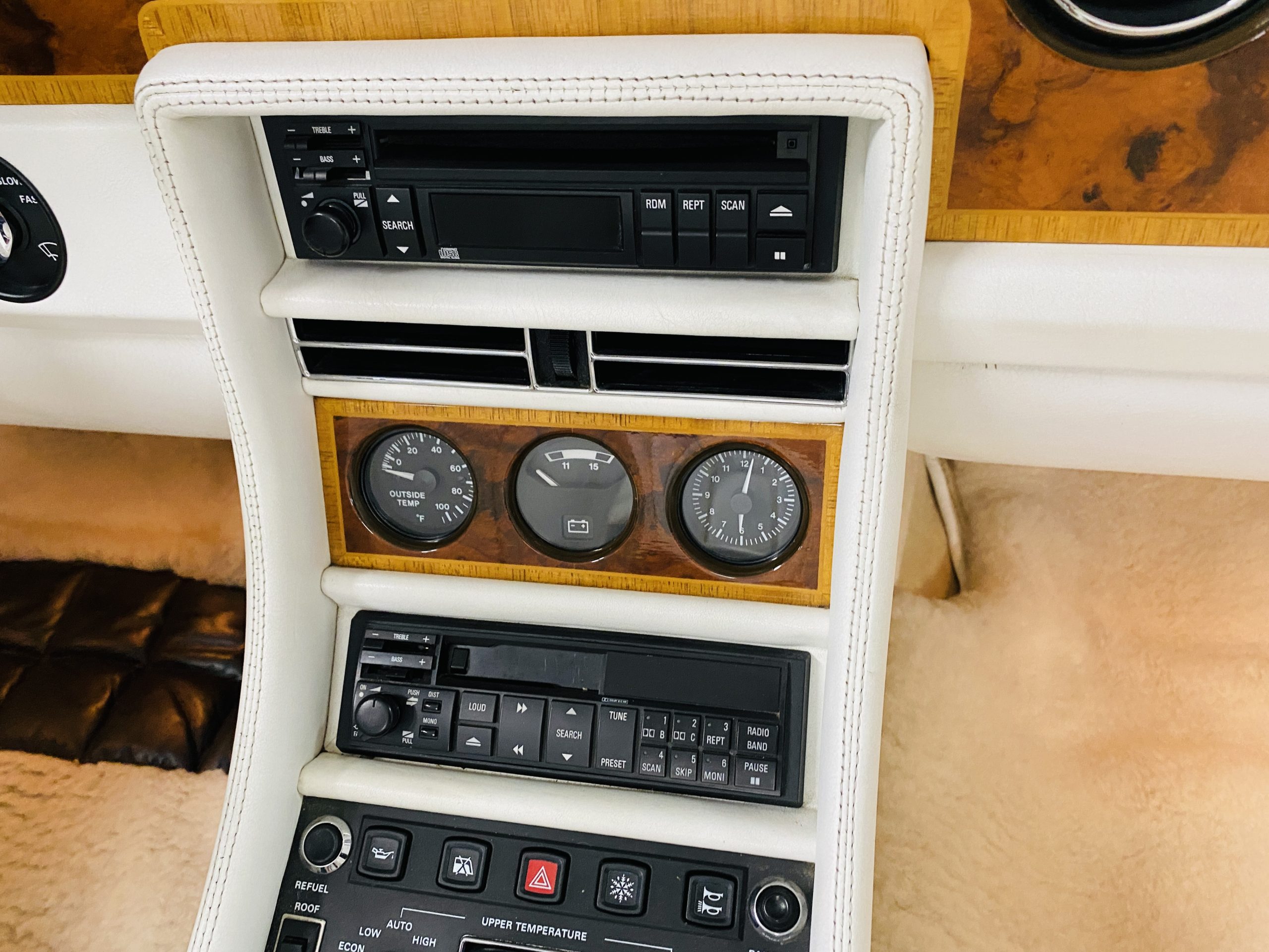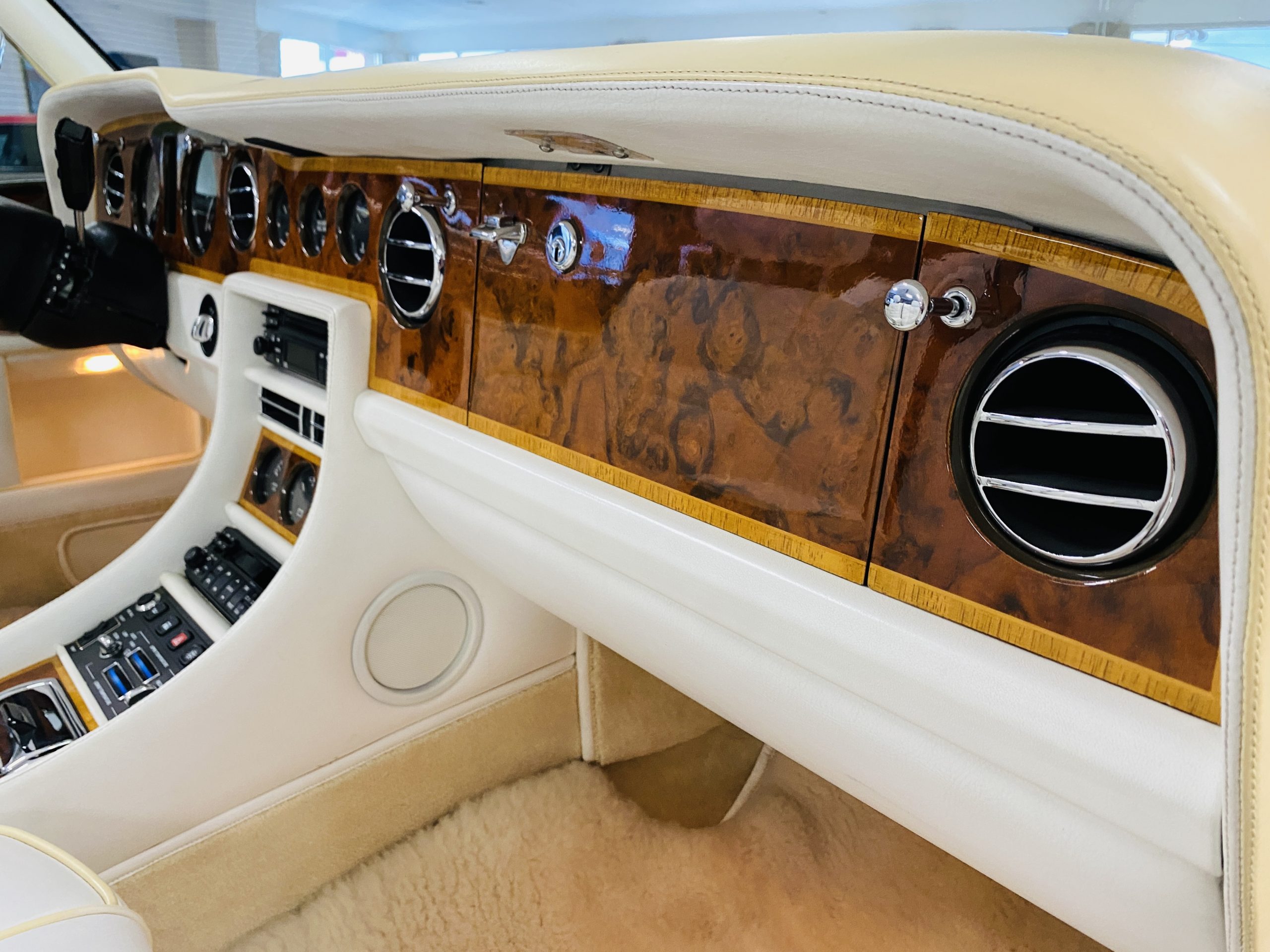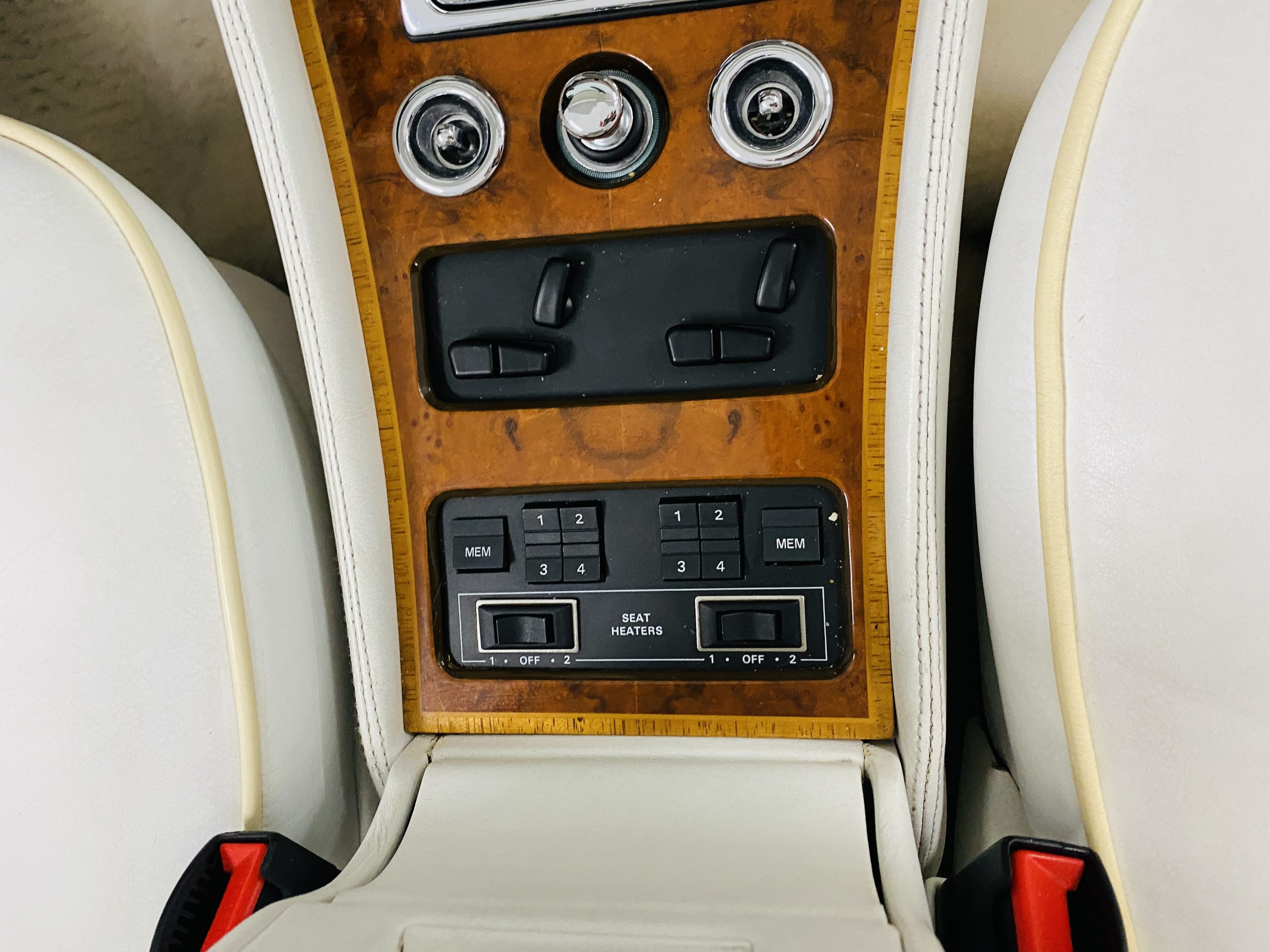 The white leather interior is complimented by magnolia piping and magnolia upper dash panel with triple tone wood veneer, including burl walnut, and two other contrasting veneers. The leather is in overall excellent condition with very minimal wear shown on the drivers seat, which one would expect after 10,400 miles. The leather is soft and supple and also shows that this Rolls has been loved and cared for. The magnolia Wilton wool carpets are nearly as new and are covered by the original white mouton sheepskin overlays which are in very nice condition.