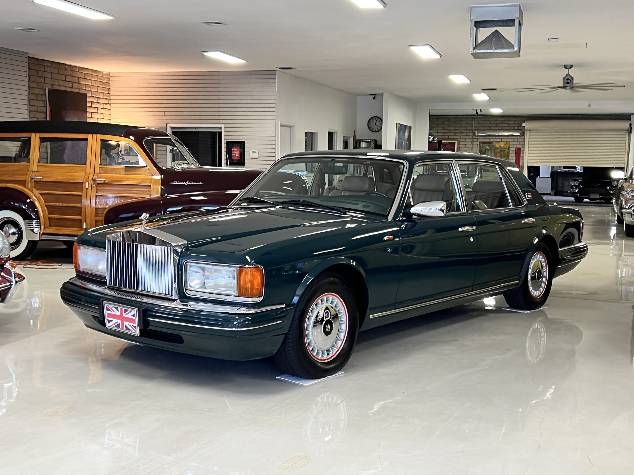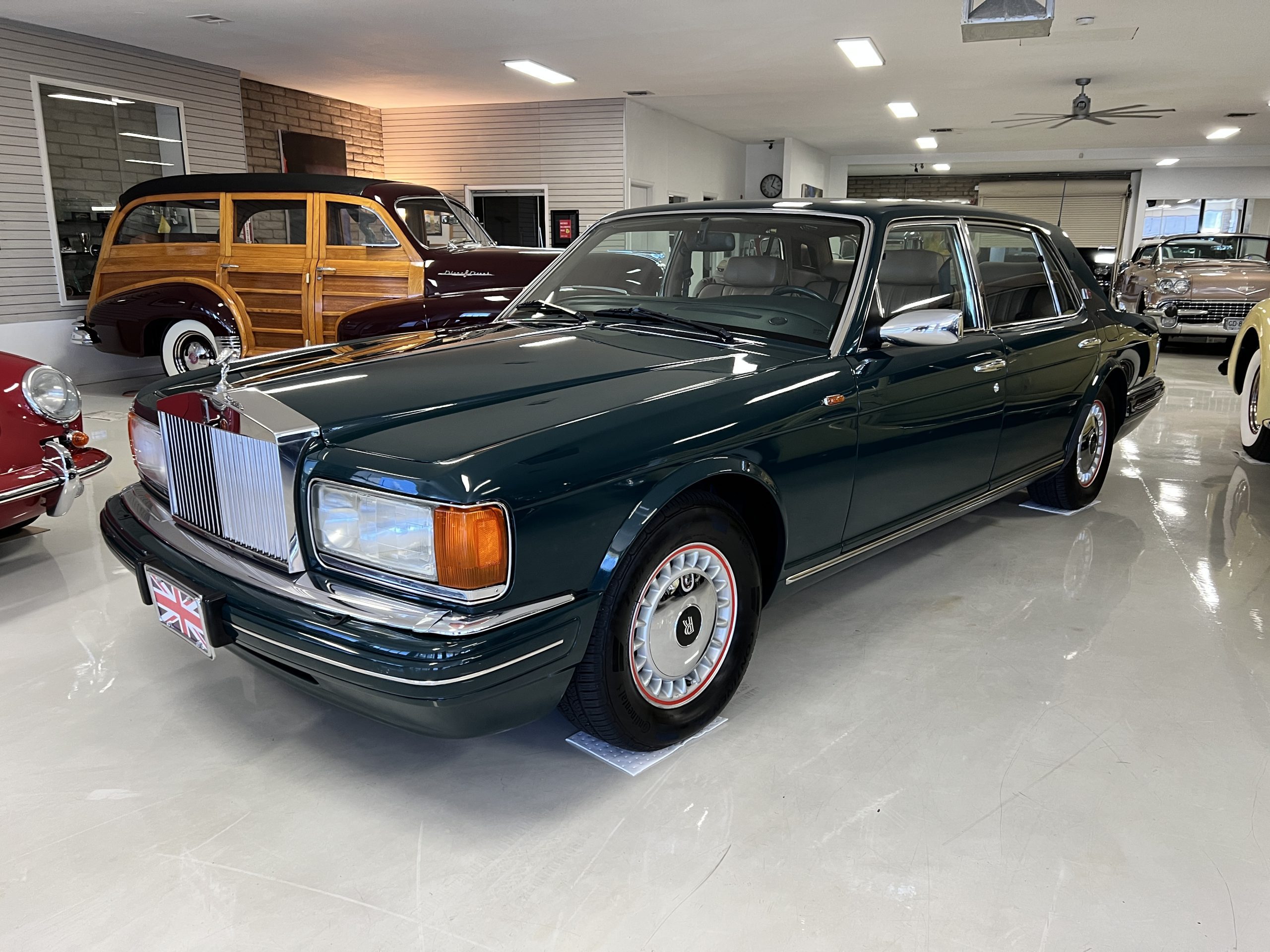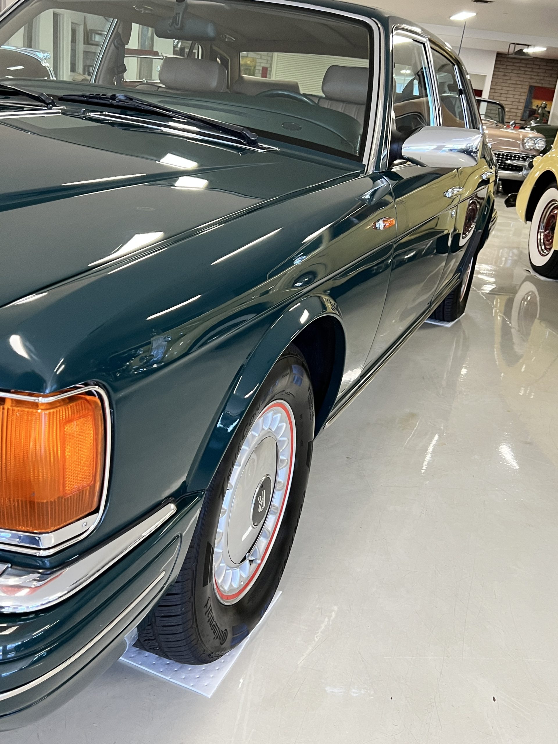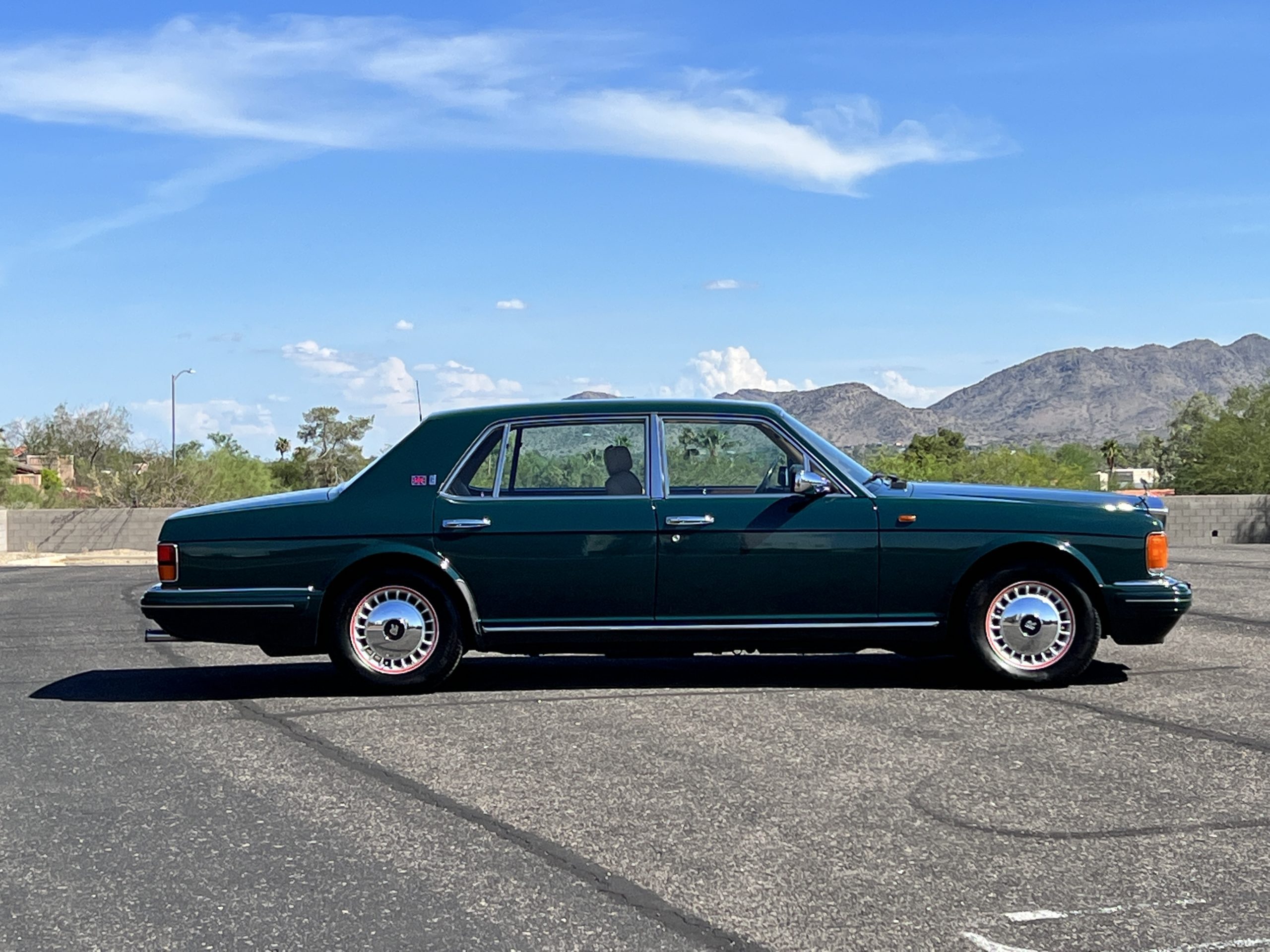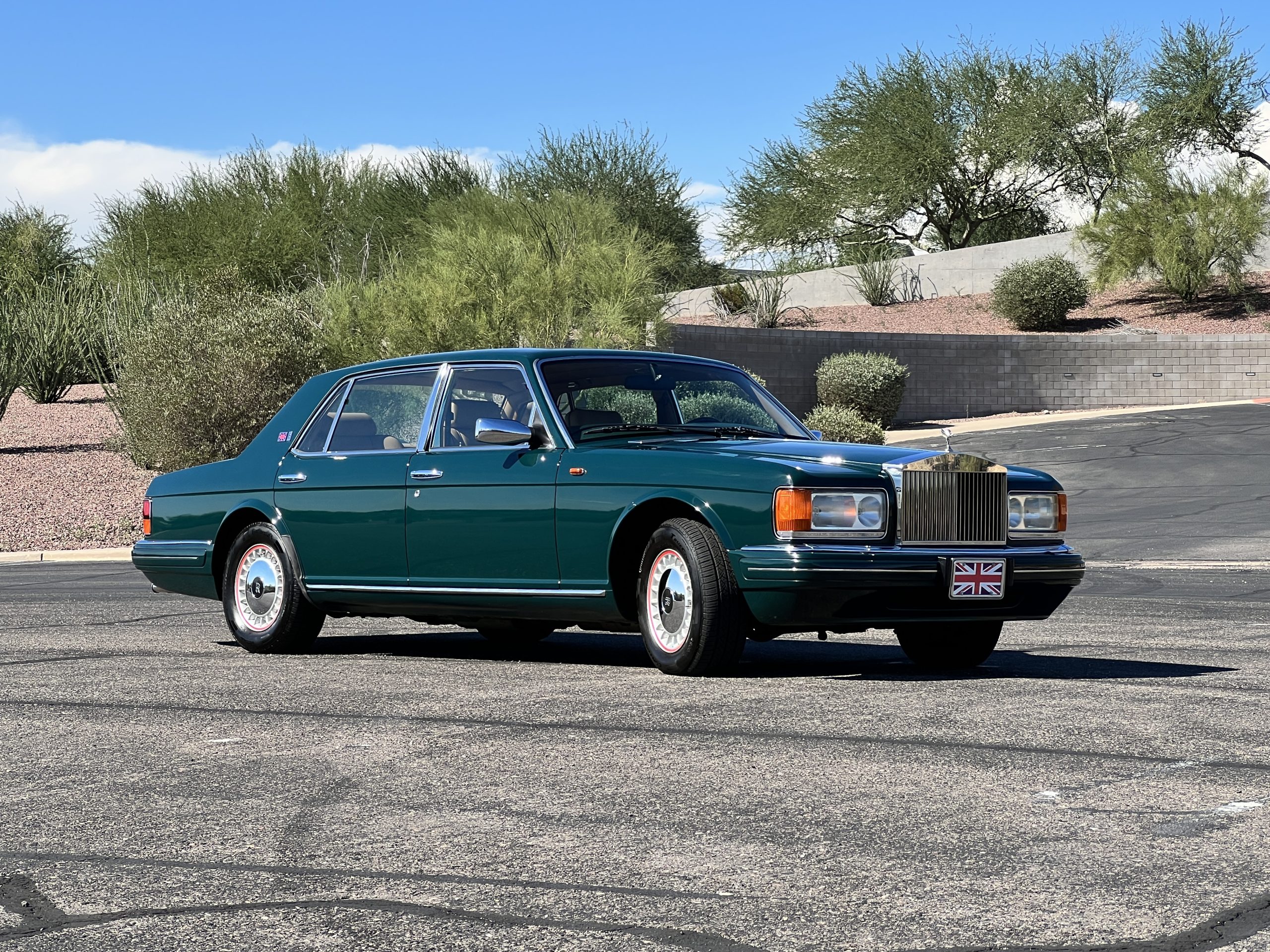The livery is stunning in Mulsanne (Racing Green) with the original Rolls-Royce alloy wheels that have red accent trim added. The paint is in very nice condition and is without dents or blemishes. Any touch up necessary to keep this Rolls looking great has been performed by its owners over the years. The stainless and chrome are also in excellent condition. The present owner has added UK flags in the C pilar which look sharp.