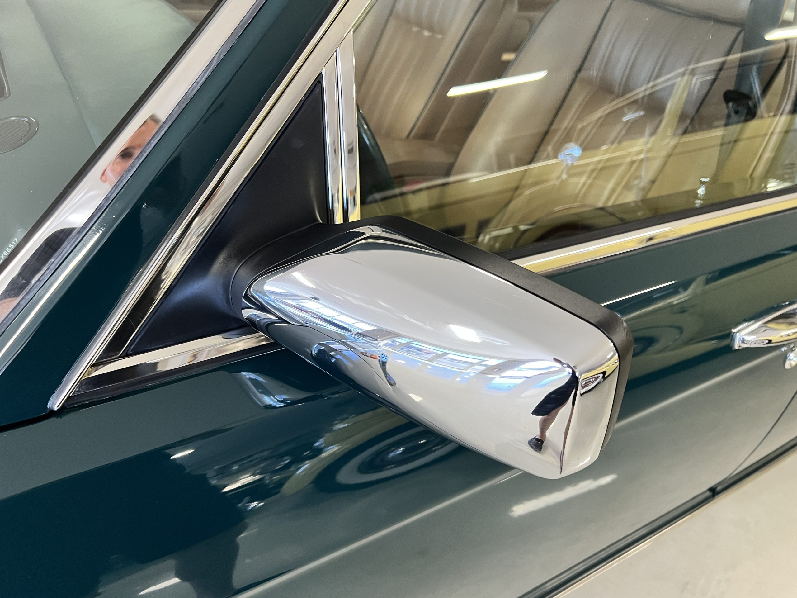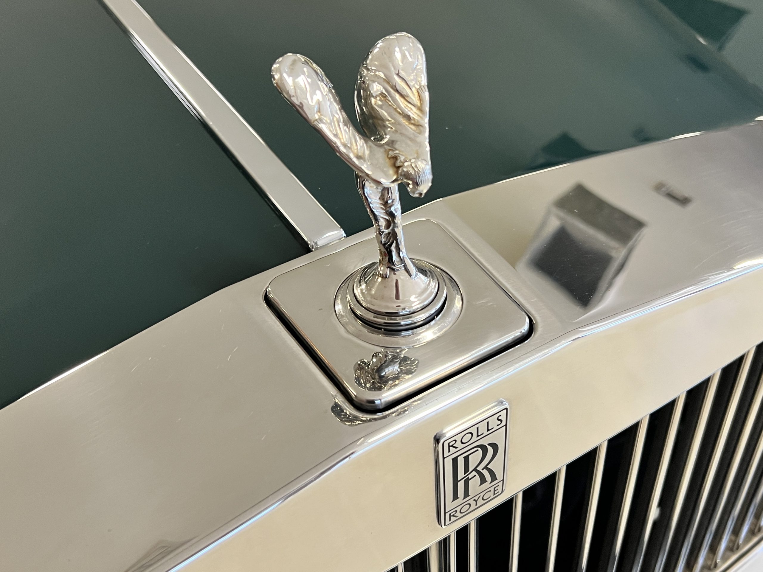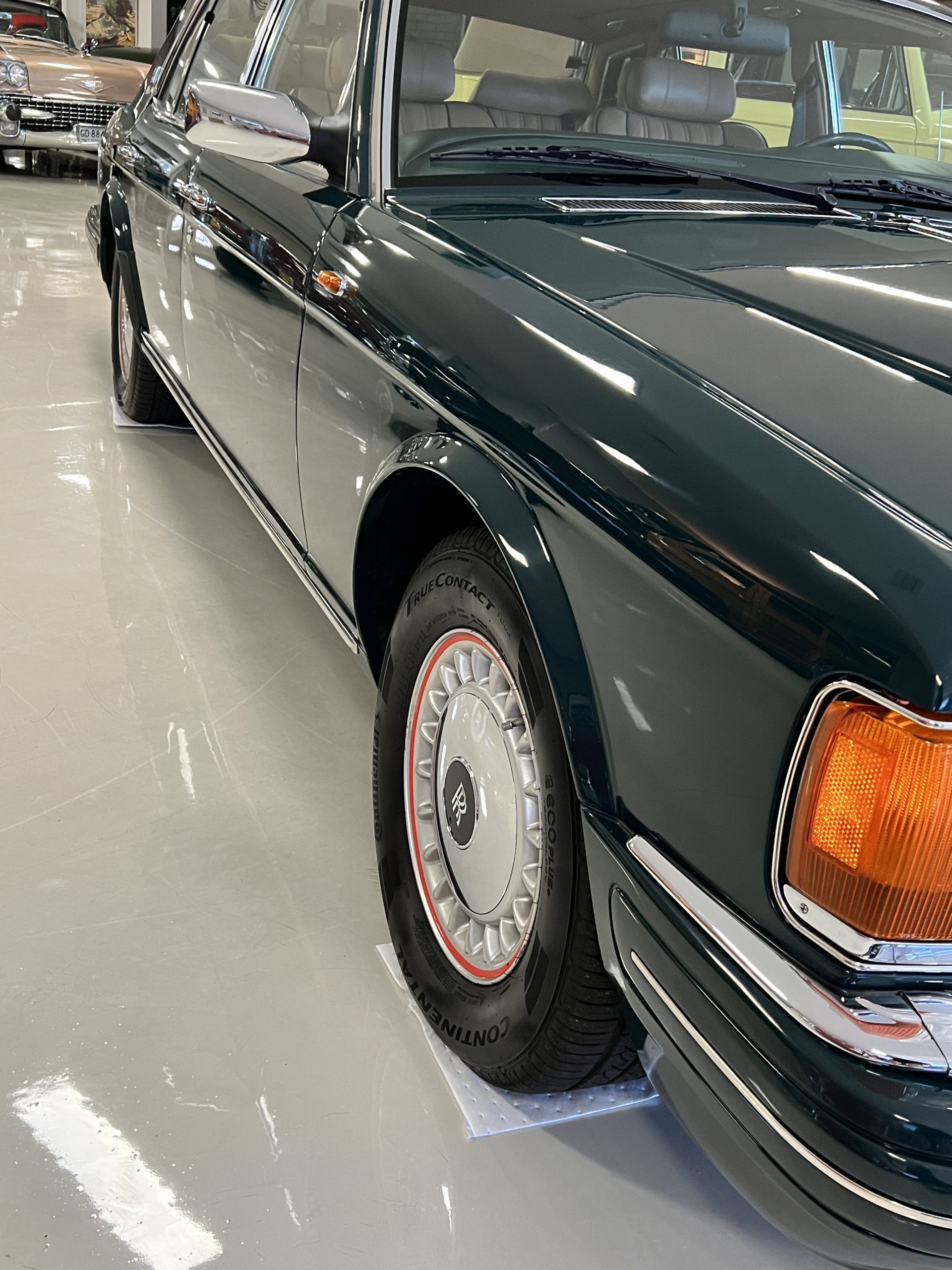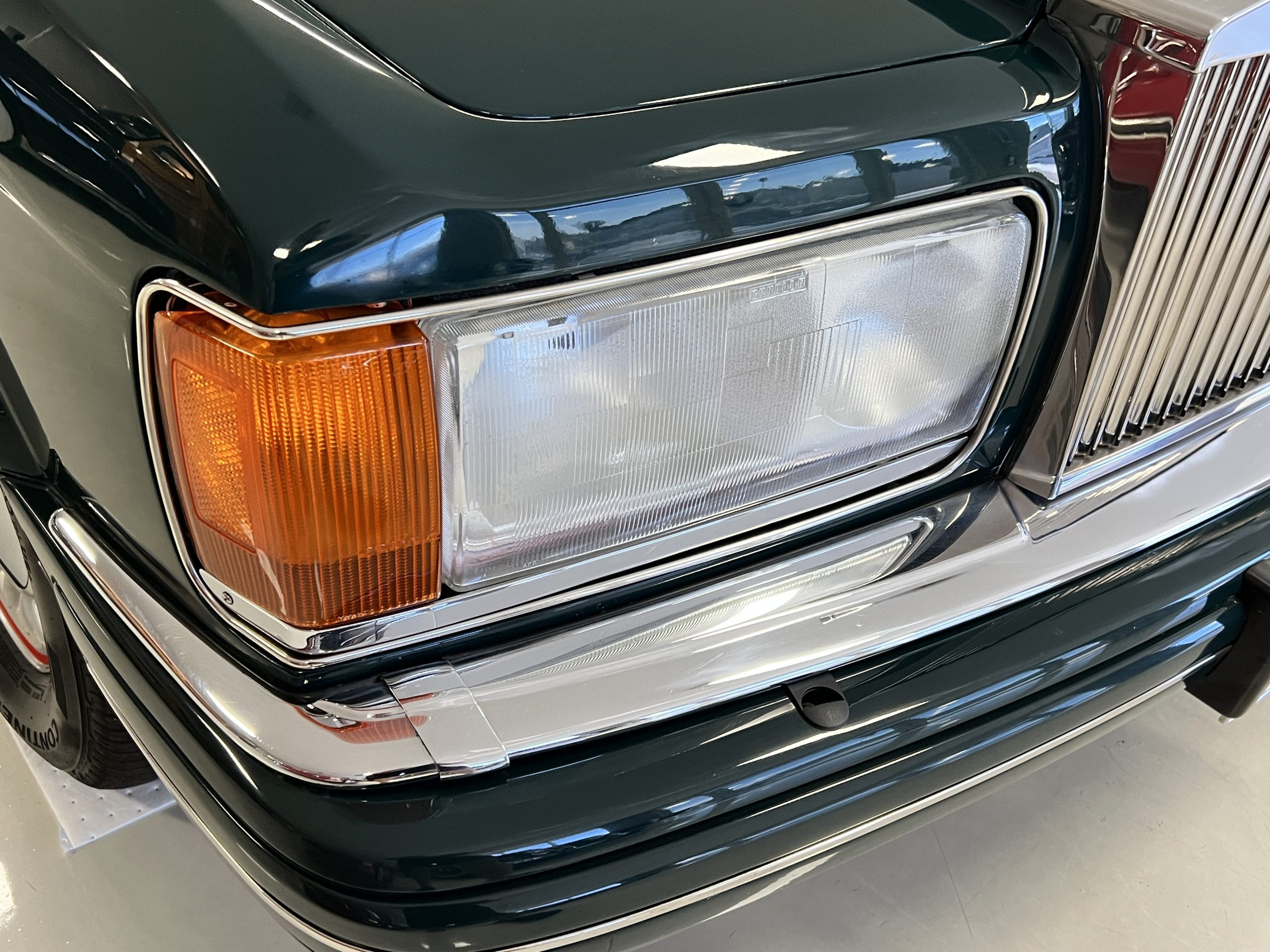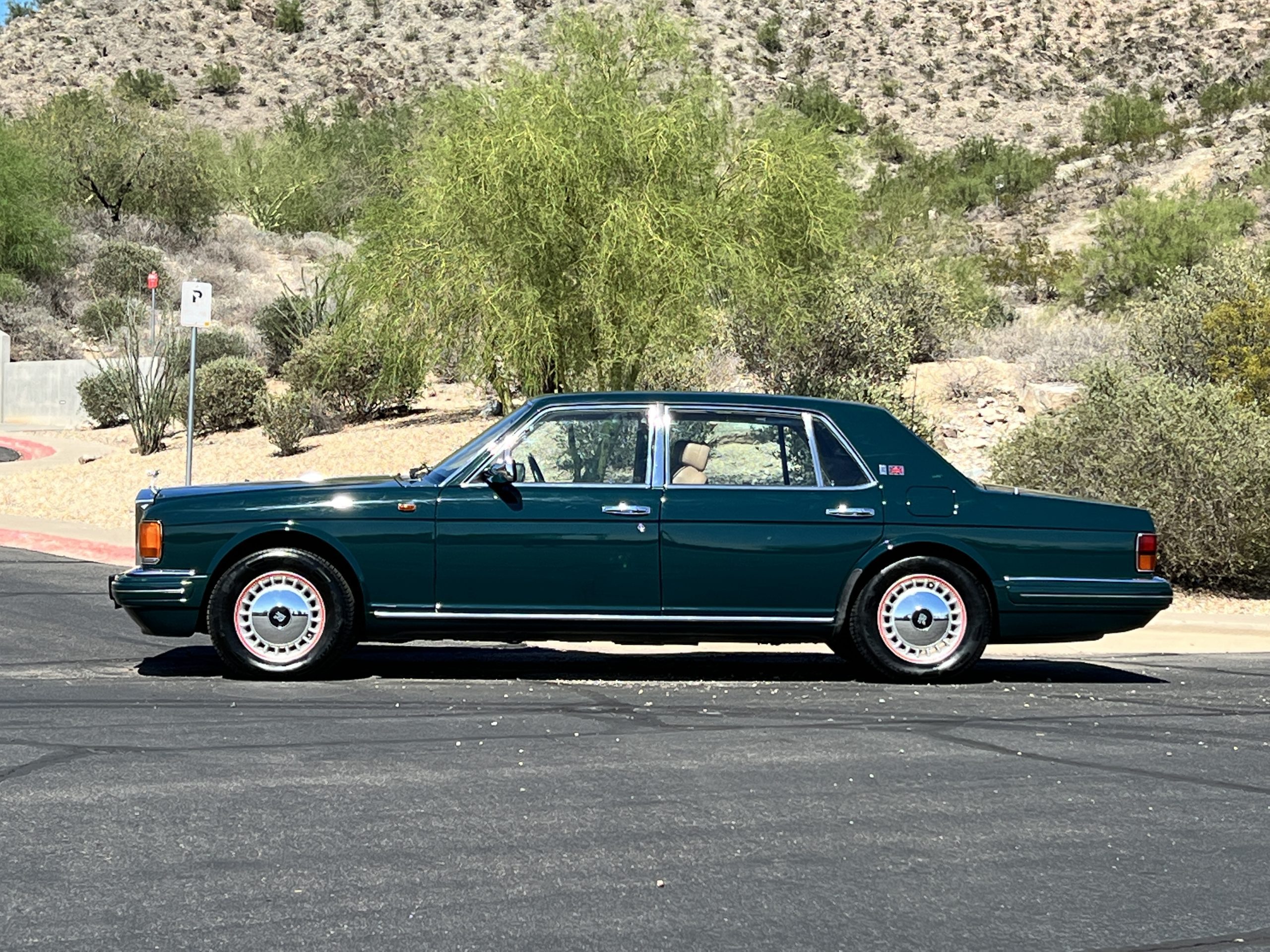The livery is stunning in Mulsanne (Racing Green) with the original Rolls-Royce alloy wheels that have red accent trim added. The paint is in very nice condition and is without dents or blemishes. Any touch up necessary to keep this Rolls looking great has been performed by its owners over the years. The stainless and chrome are also in excellent condition. The present owner has added UK flags in the C pilar which look sharp.