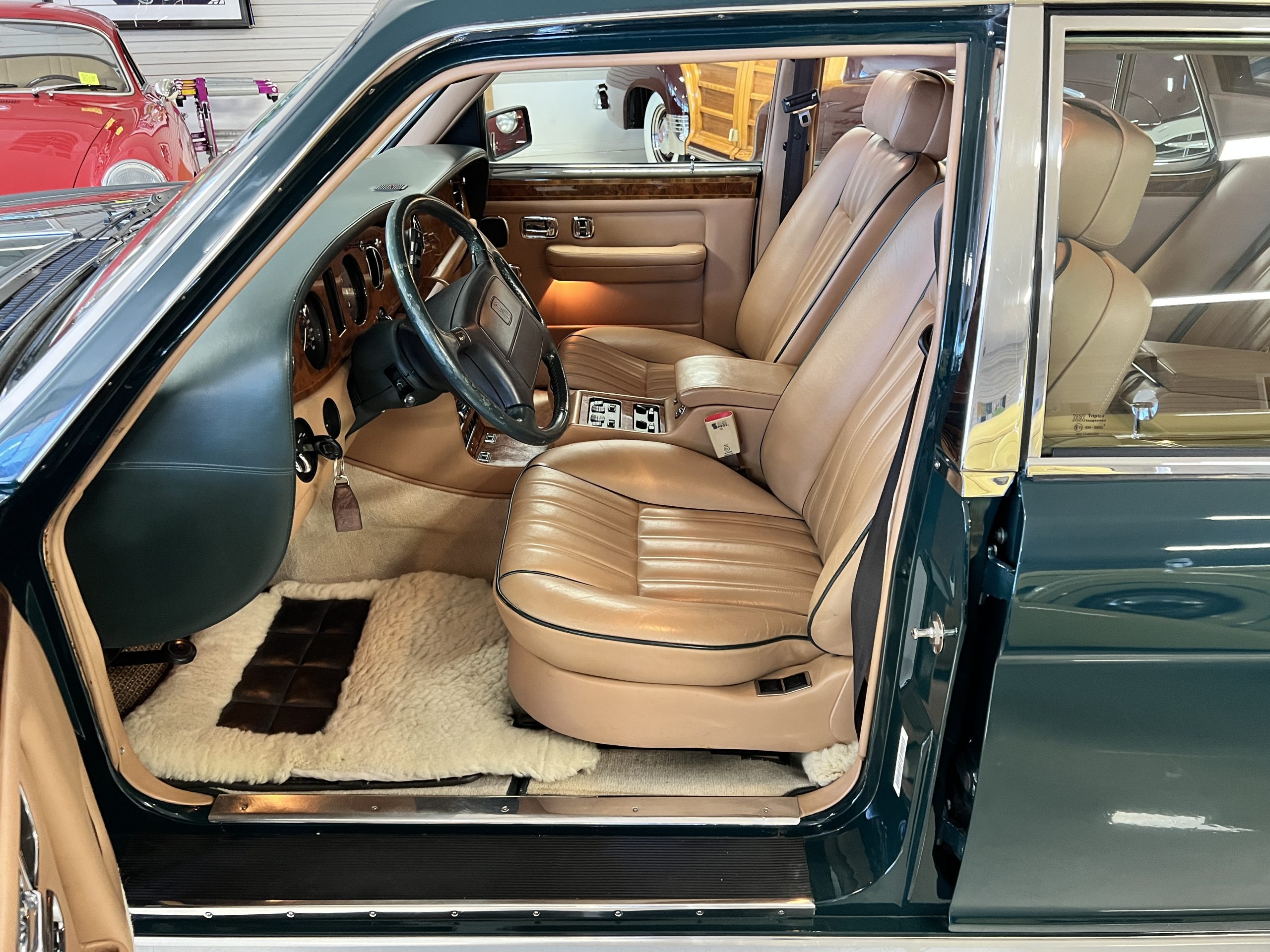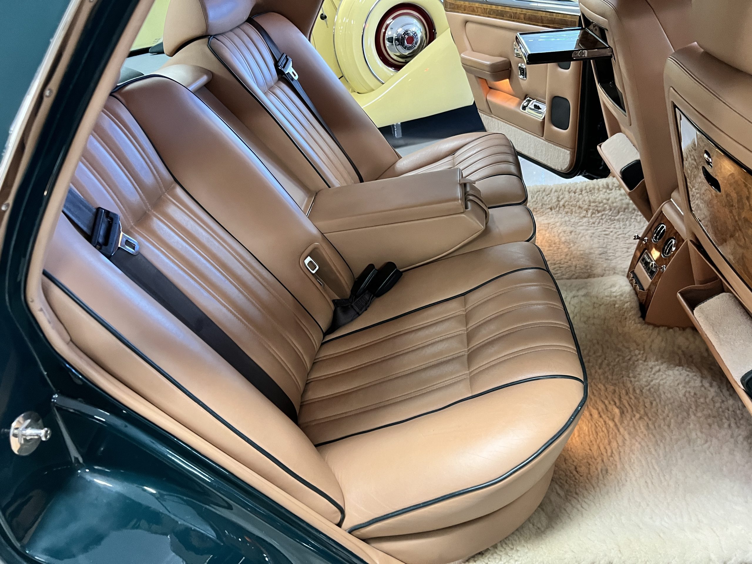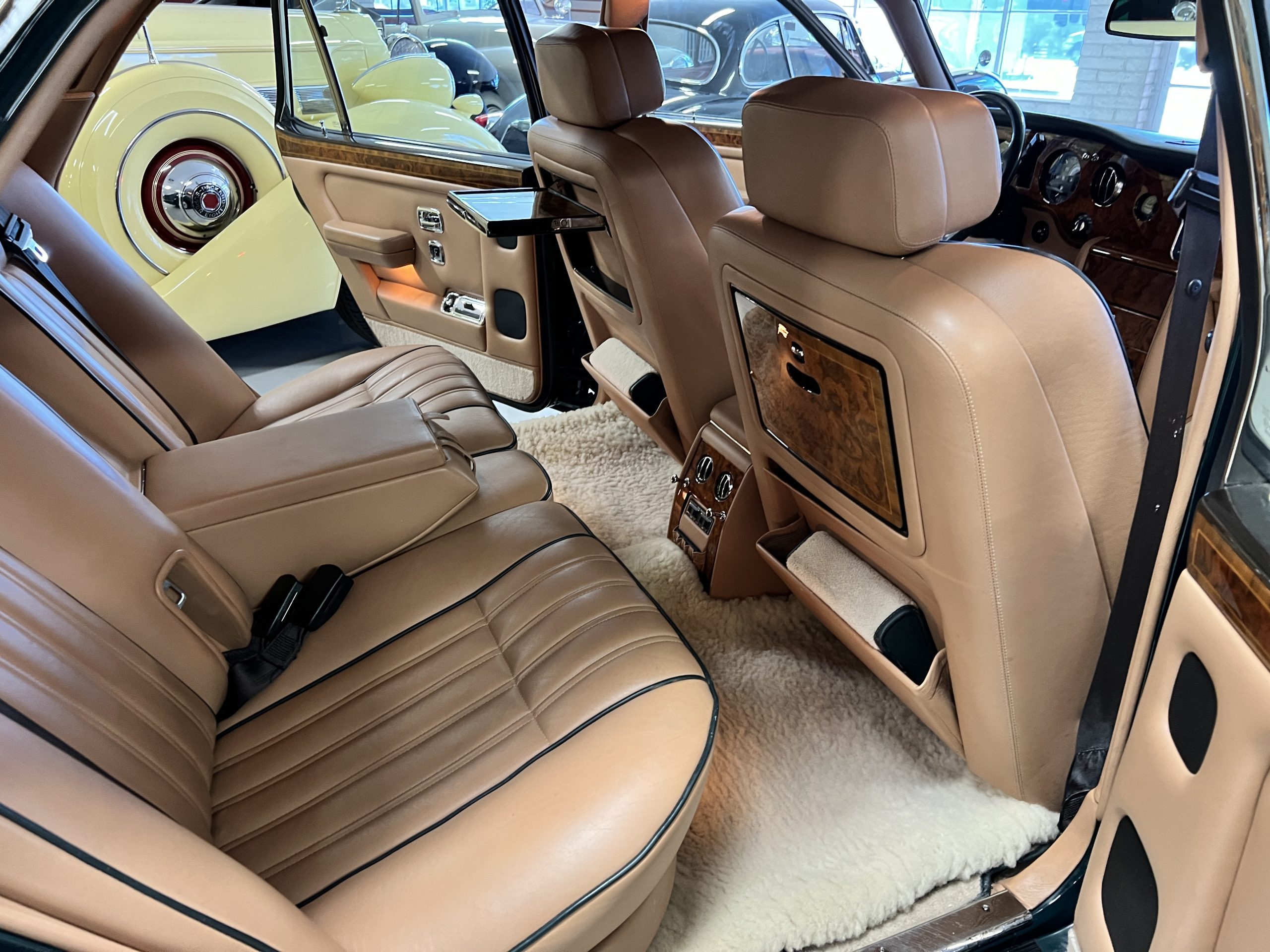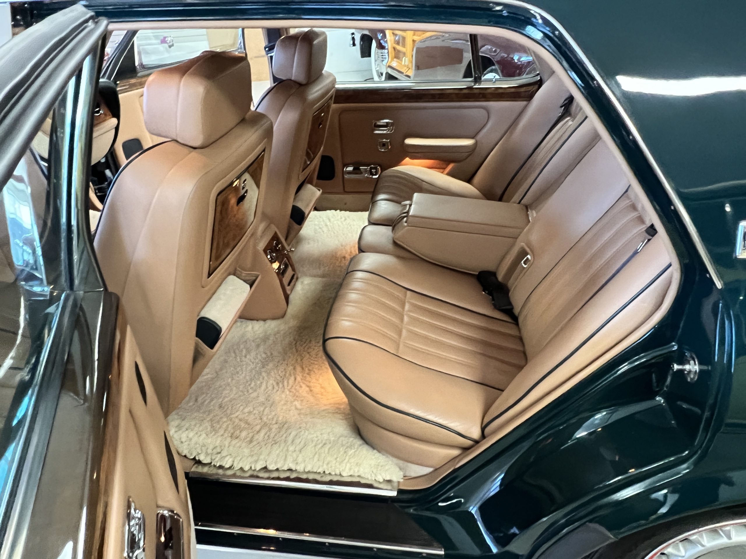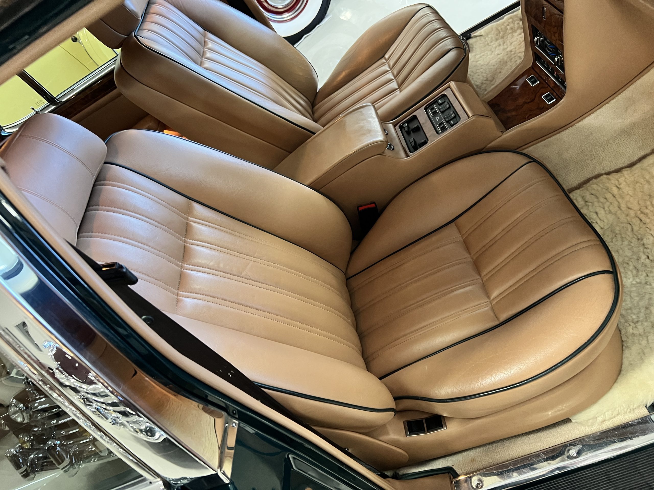 The interior is beautiful in its original Autumn leather with Spruce piping and accents. This was a special order combination with Cotswold carpet and sheepskin mouton carpet overlays. The leather presents itself well with some use showing on the drivers seat bolster and seat bottom. The steering wheel also shows wear from use over the years. These are noticeable upon close inspection. The burl wood accents have boxwood trim and is overall in good condition with many cracks present as shown in the photo gallery. Of course, the picnic trays and vanities are provided for the rear seat passengers. The stereo system has been updated with a more modern Alpine unit. In addition to the mouton overlays, this Rolls has a very nice set of Coco mats for everyday use.