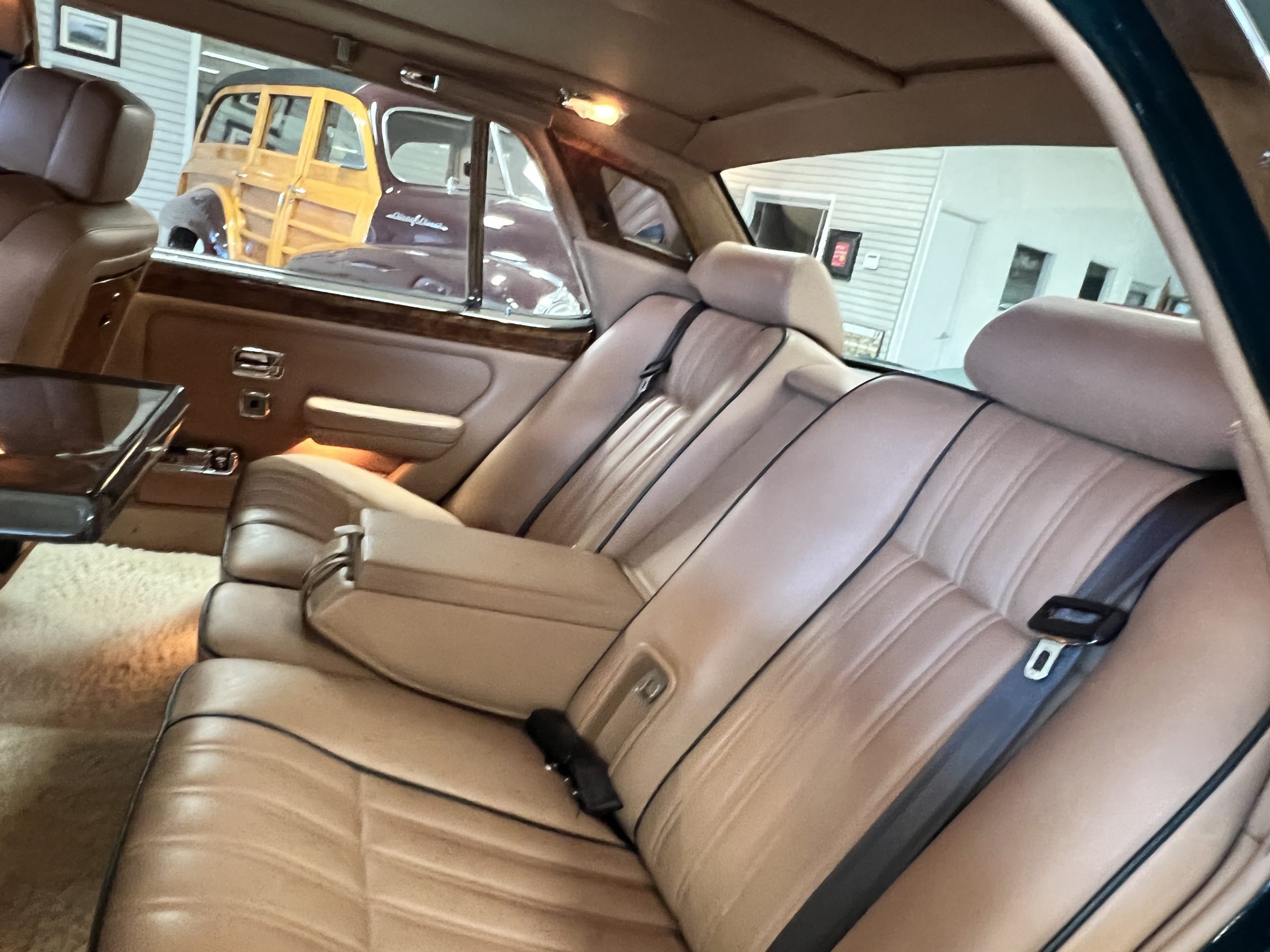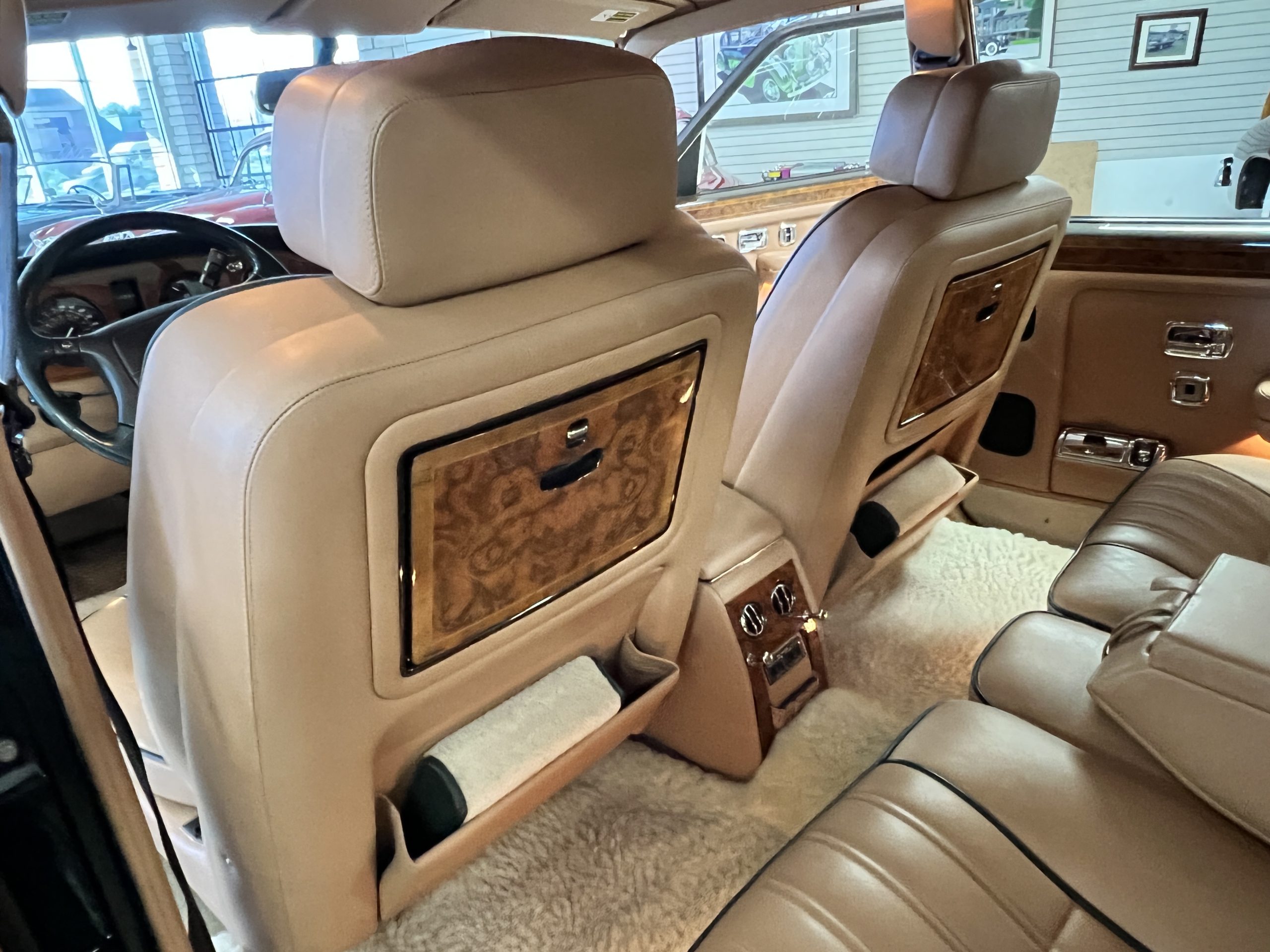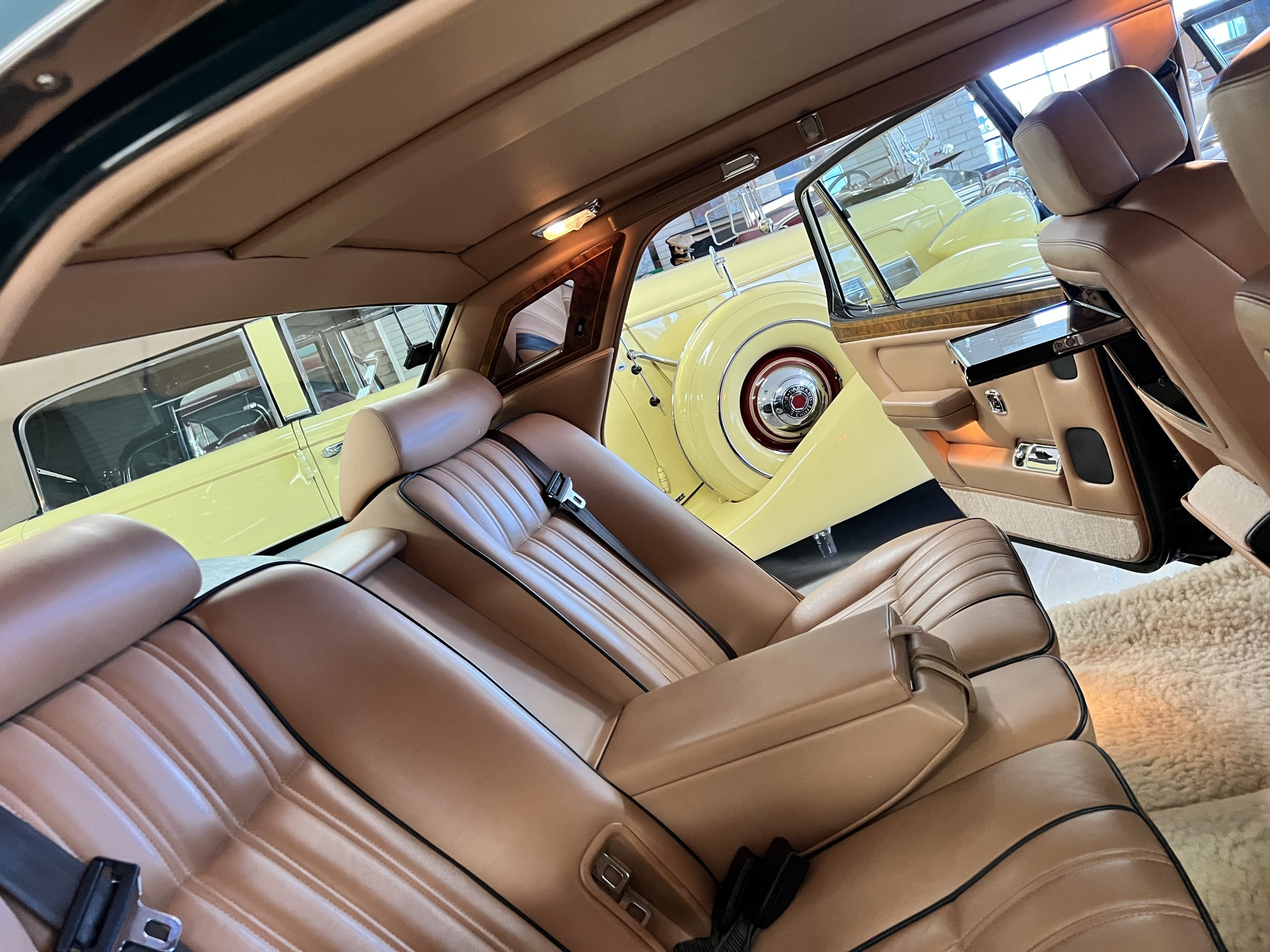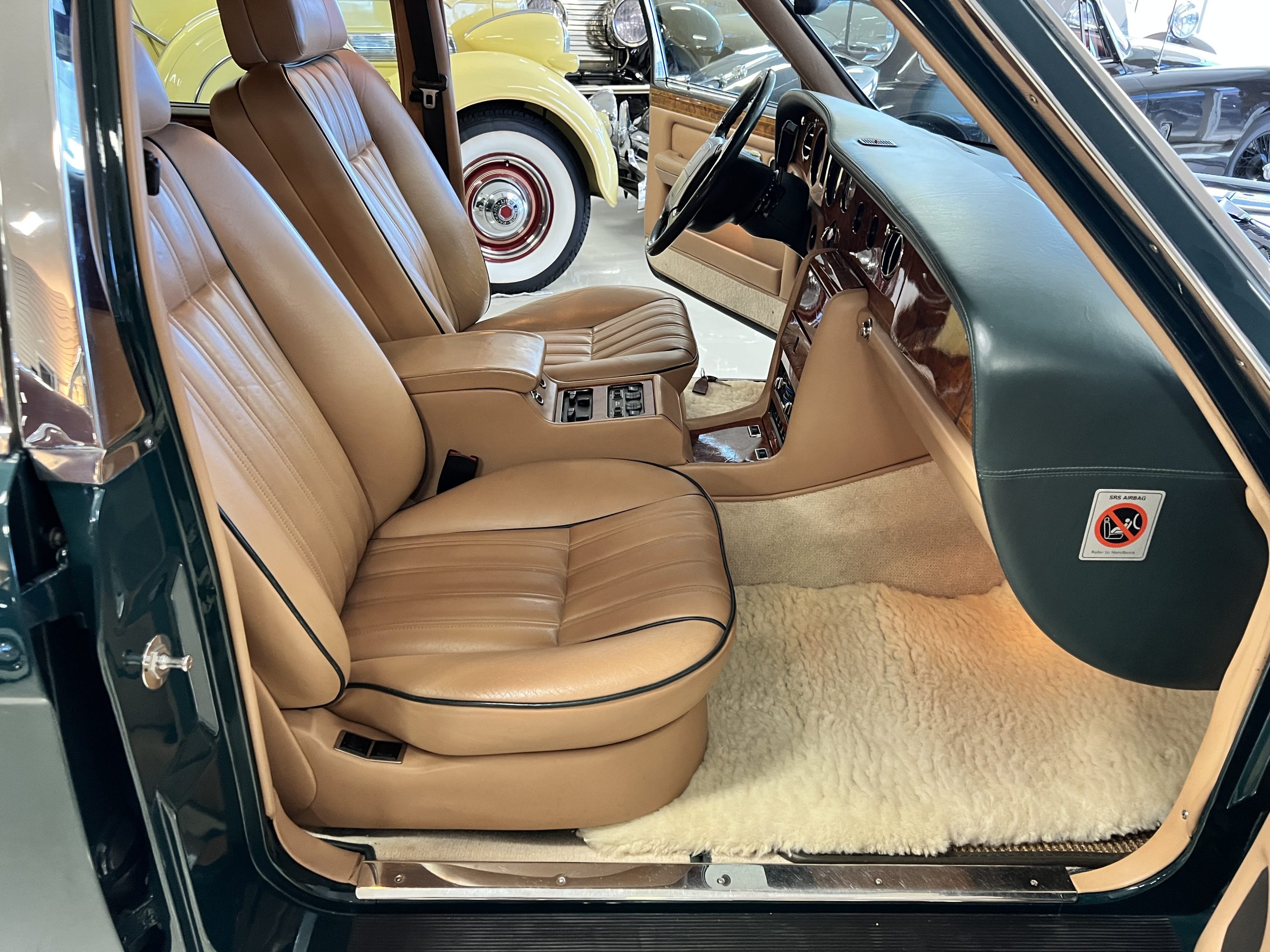 The interior is beautiful in its original Autumn leather with Spruce piping and accents. This was a special order combination with Cotswold carpet and sheepskin mouton carpet overlays. The leather presents itself well with some use showing on the drivers seat bolster and seat bottom. The steering wheel also shows wear from use over the years. These are noticeable upon close inspection. The burl wood accents have boxwood trim and is overall in good condition with many cracks present as shown in the photo gallery. Of course, the picnic trays and vanities are provided for the rear seat passengers. The stereo system has been updated with a more modern Alpine unit. In addition to the mouton overlays, this Rolls has a very nice set of Coco mats for everyday use.