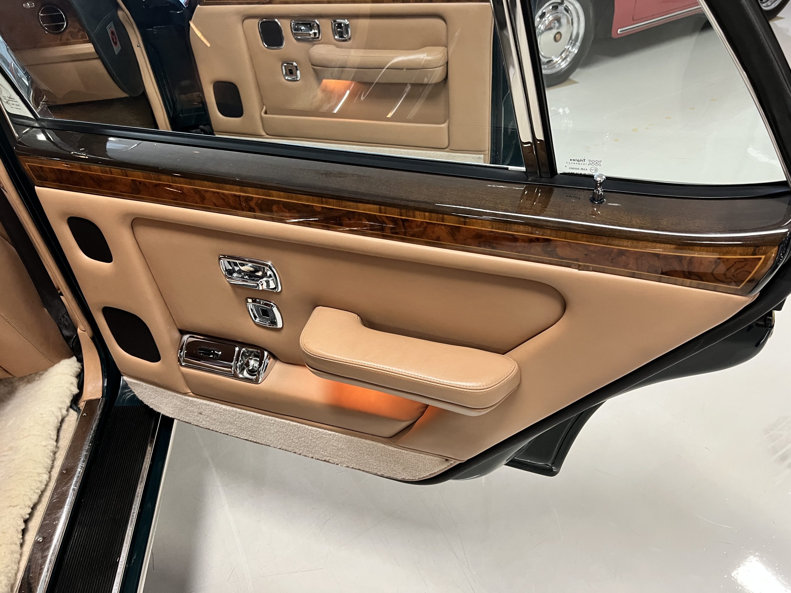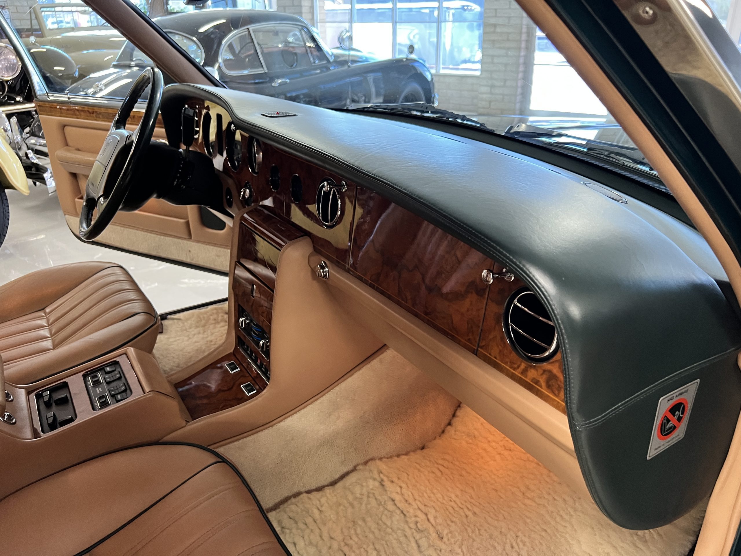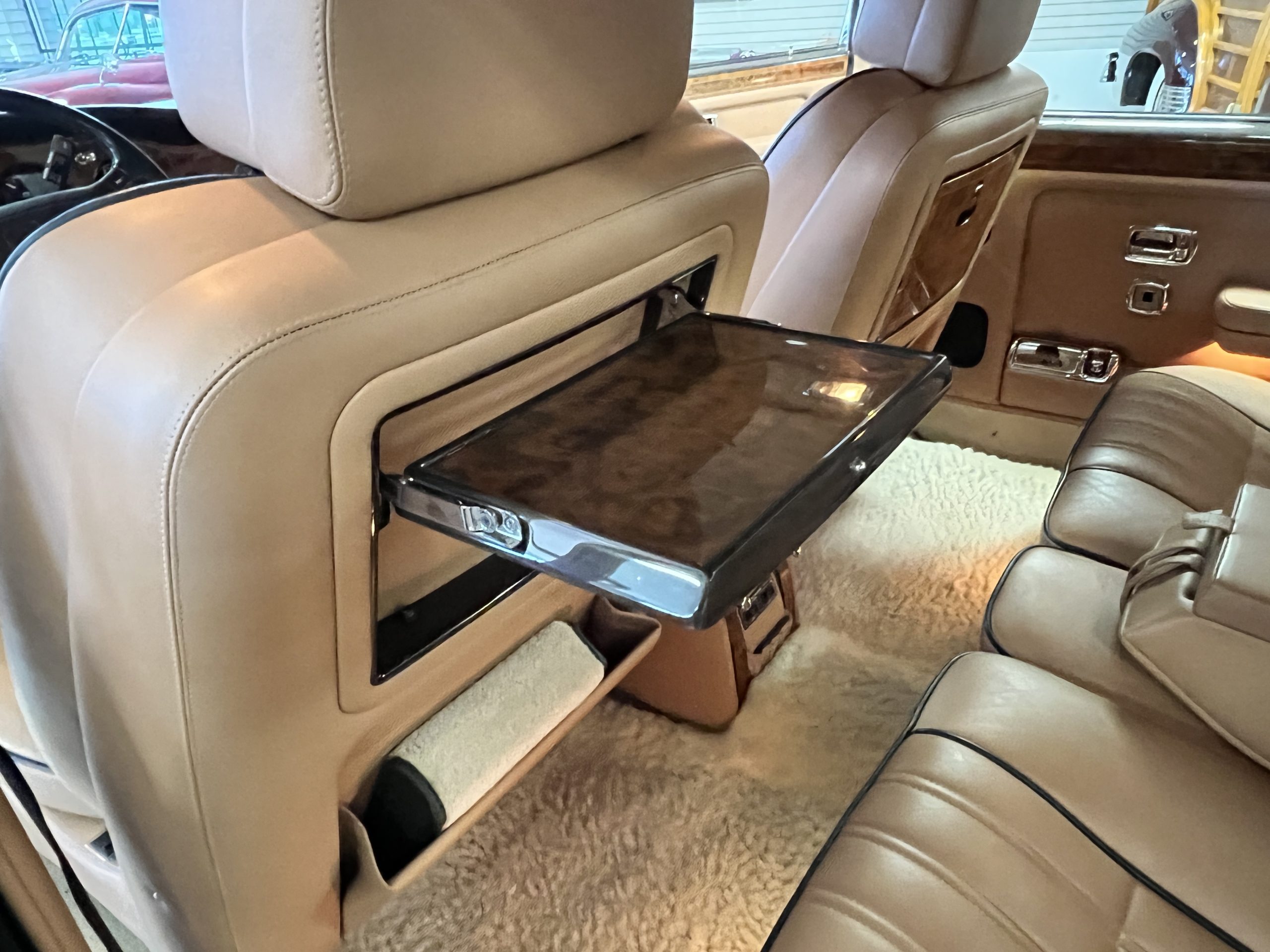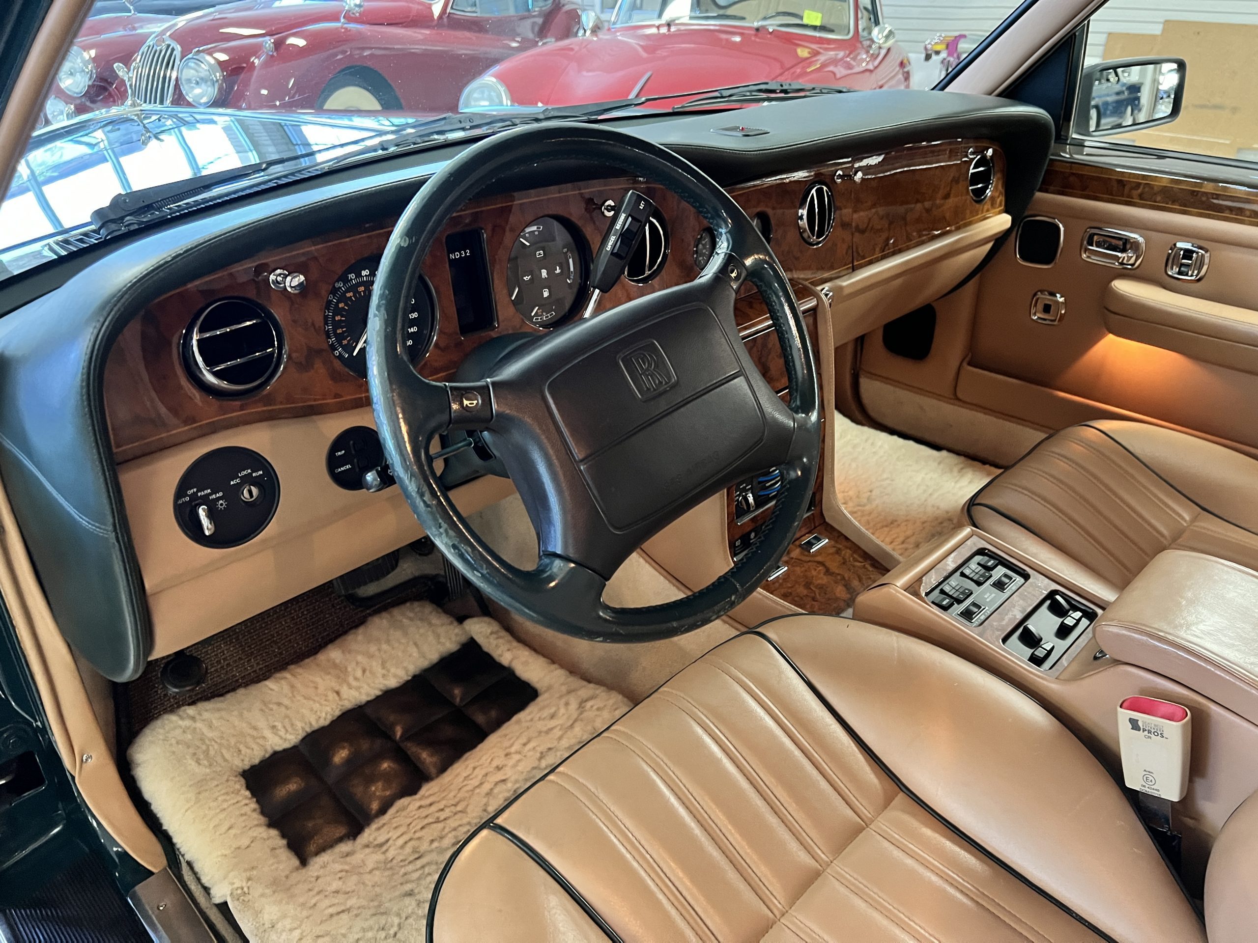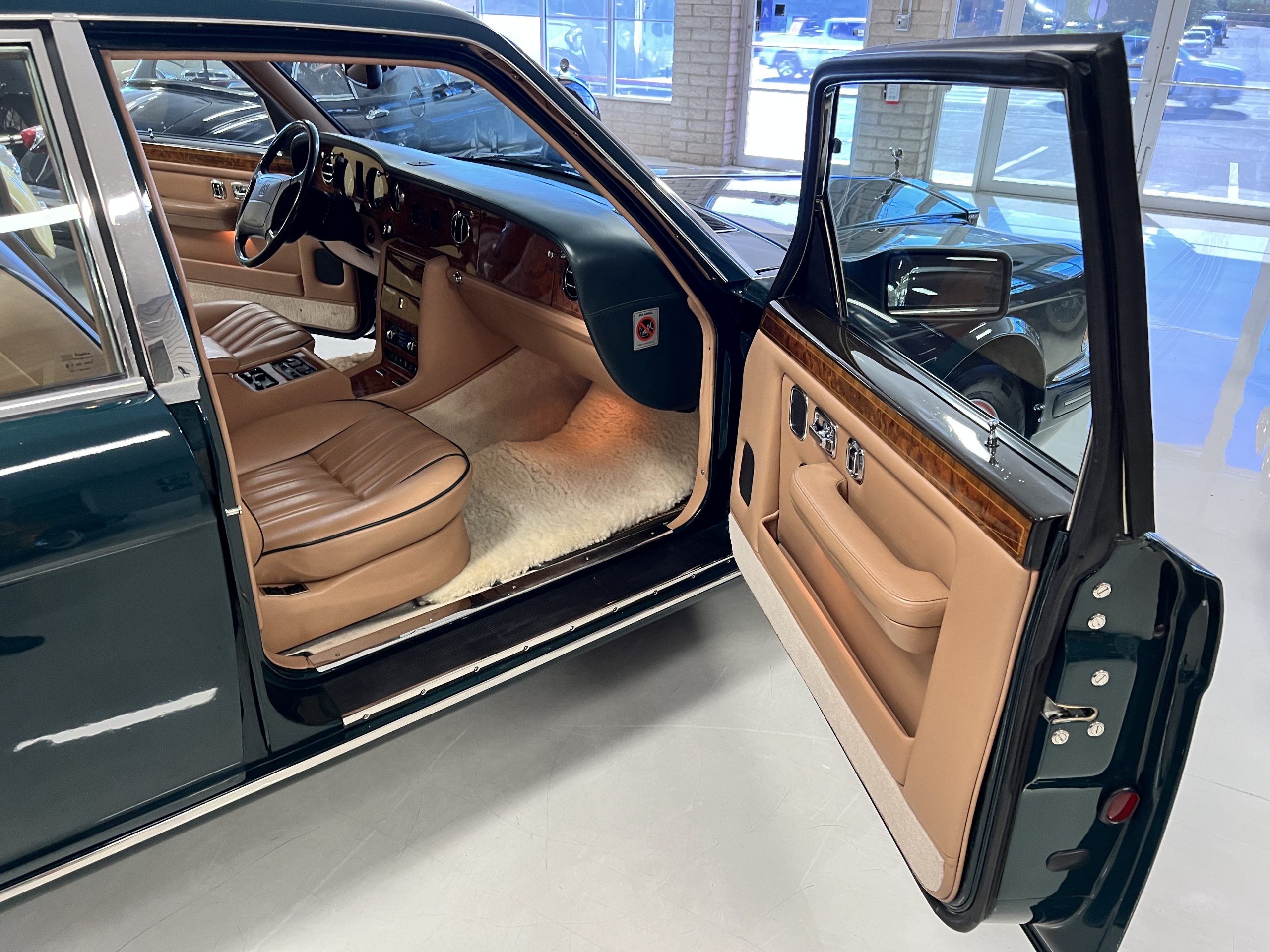 The interior is beautiful in its original Autumn leather with Spruce piping and accents. This was a special order combination with Cotswold carpet and sheepskin mouton carpet overlays. The leather presents itself well with some use showing on the drivers seat bolster and seat bottom. The steering wheel also shows wear from use over the years. These are noticeable upon close inspection. The burl wood accents have boxwood trim and is overall in good condition with many cracks present as shown in the photo gallery. Of course, the picnic trays and vanities are provided for the rear seat passengers. The stereo system has been updated with a more modern Alpine unit. In addition to the mouton overlays, this Rolls has a very nice set of Coco mats for everyday use.