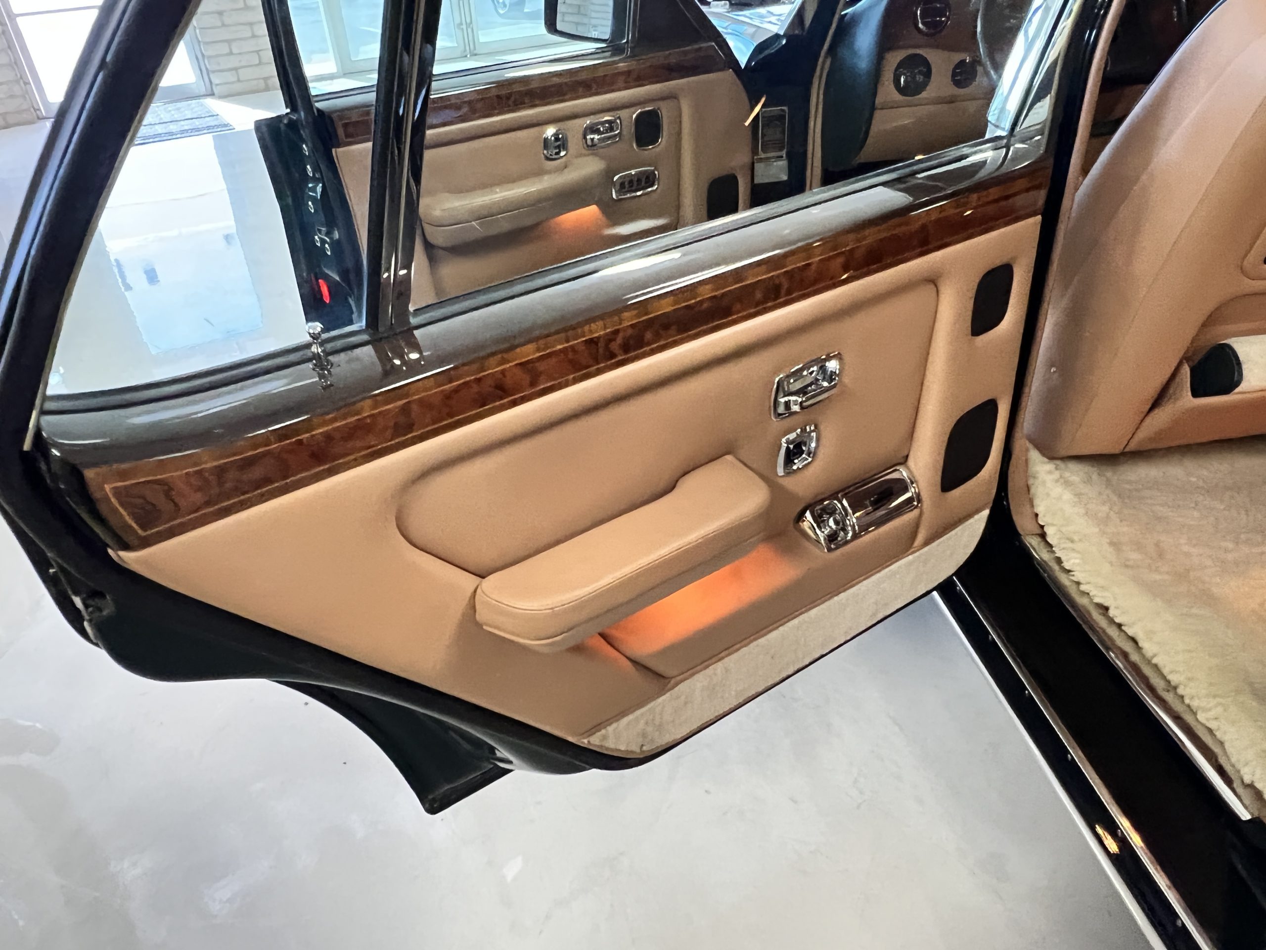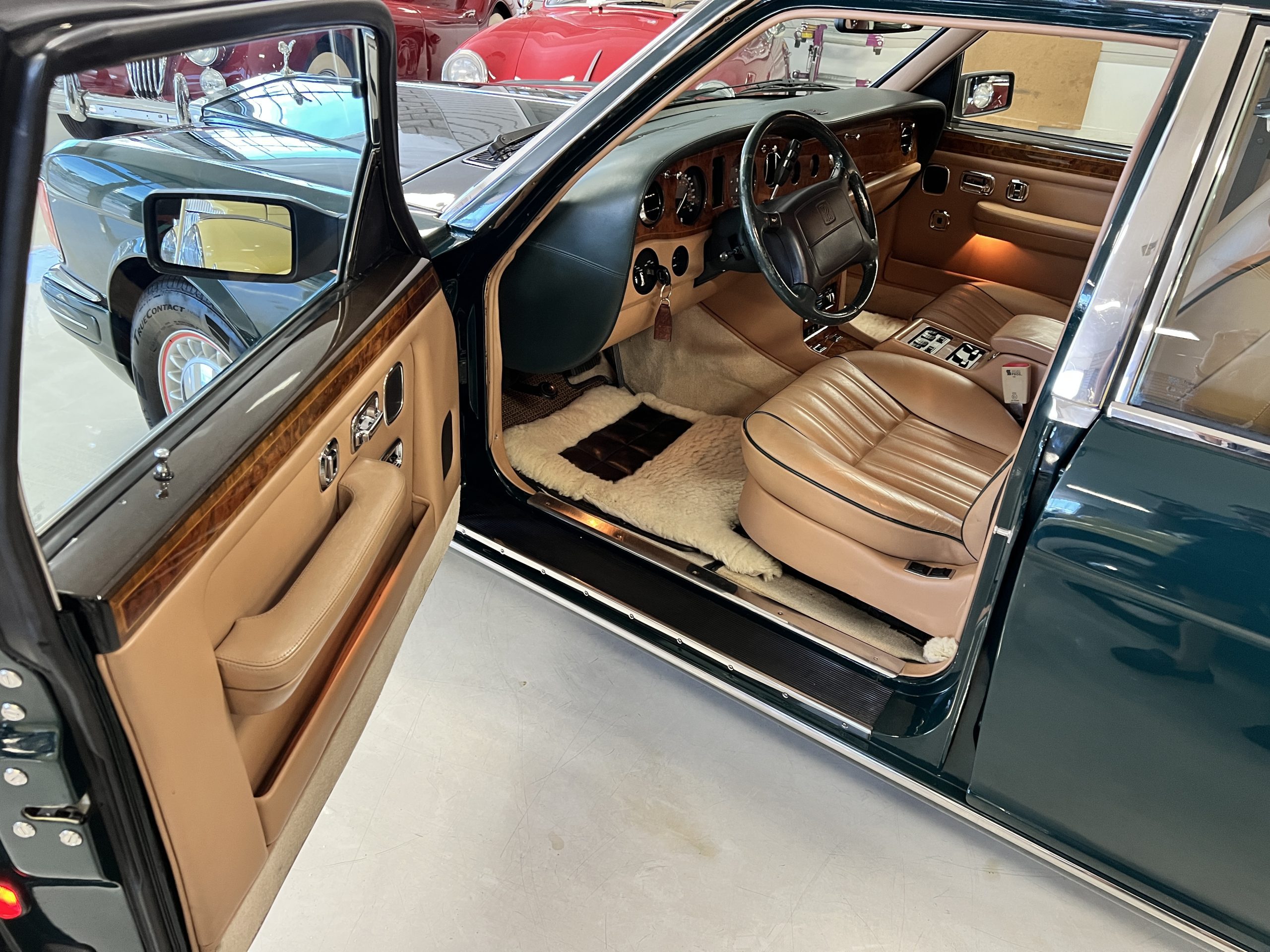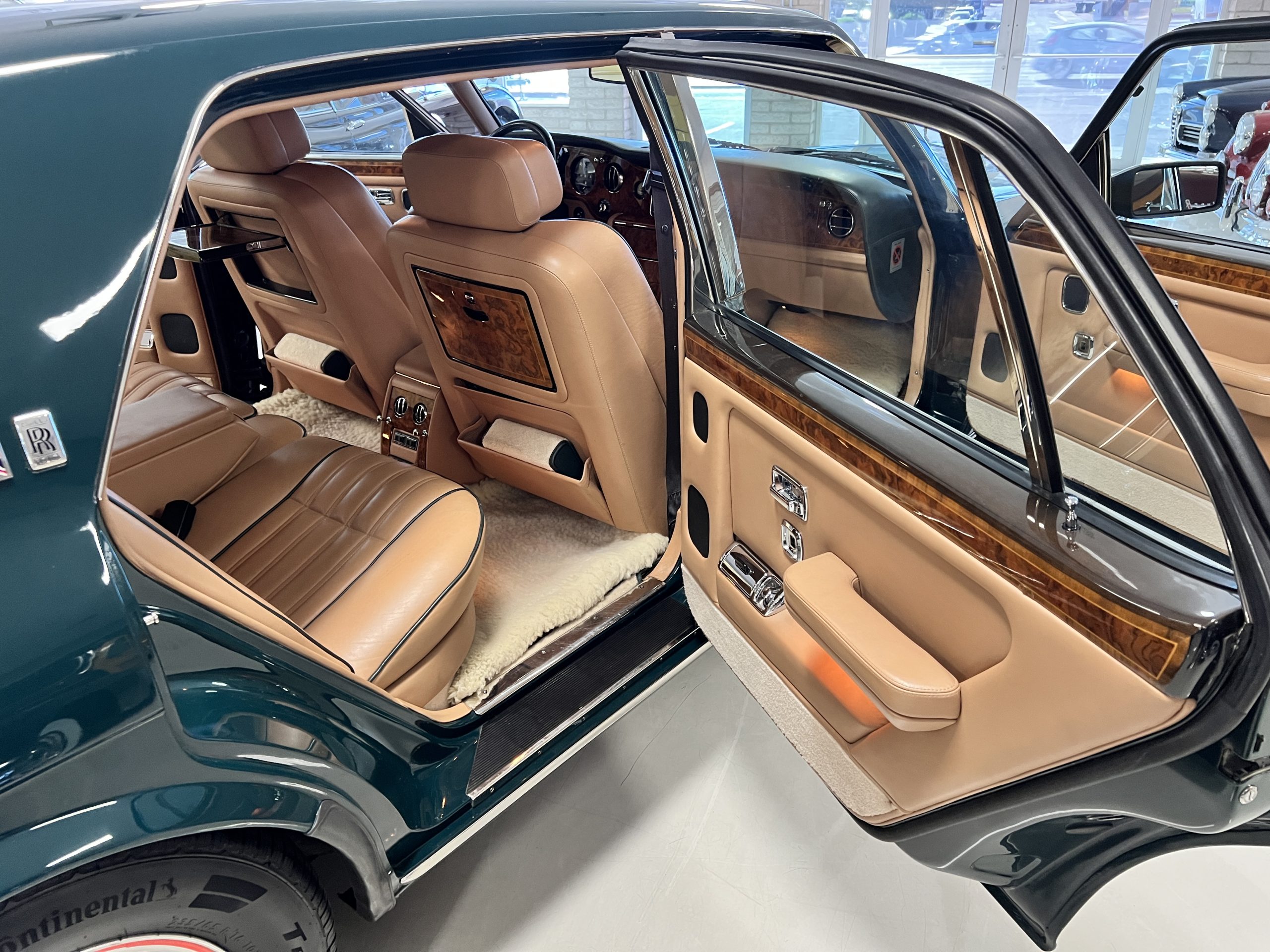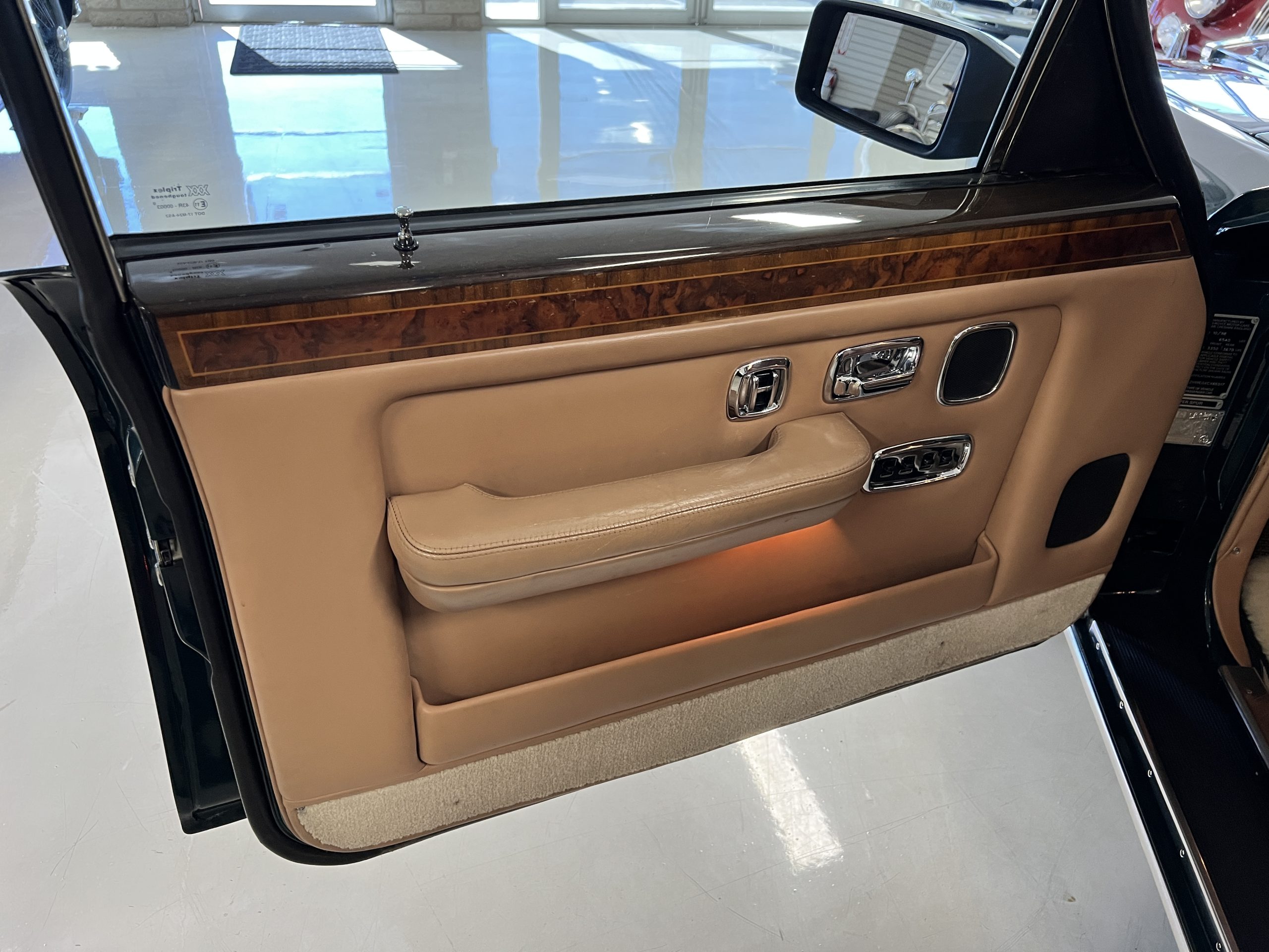 The interior is beautiful in its original Autumn leather with Spruce piping and accents. This was a special order combination with Cotswold carpet and sheepskin mouton carpet overlays. The leather presents itself well with some use showing on the drivers seat bolster and seat bottom. The steering wheel also shows wear from use over the years. These are noticeable upon close inspection. The burl wood accents have boxwood trim and is overall in good condition with many cracks present as shown in the photo gallery. Of course, the picnic trays and vanities are provided for the rear seat passengers. The stereo system has been updated with a more modern Alpine unit. In addition to the mouton overlays, this Rolls has a very nice set of Coco mats for everyday use.