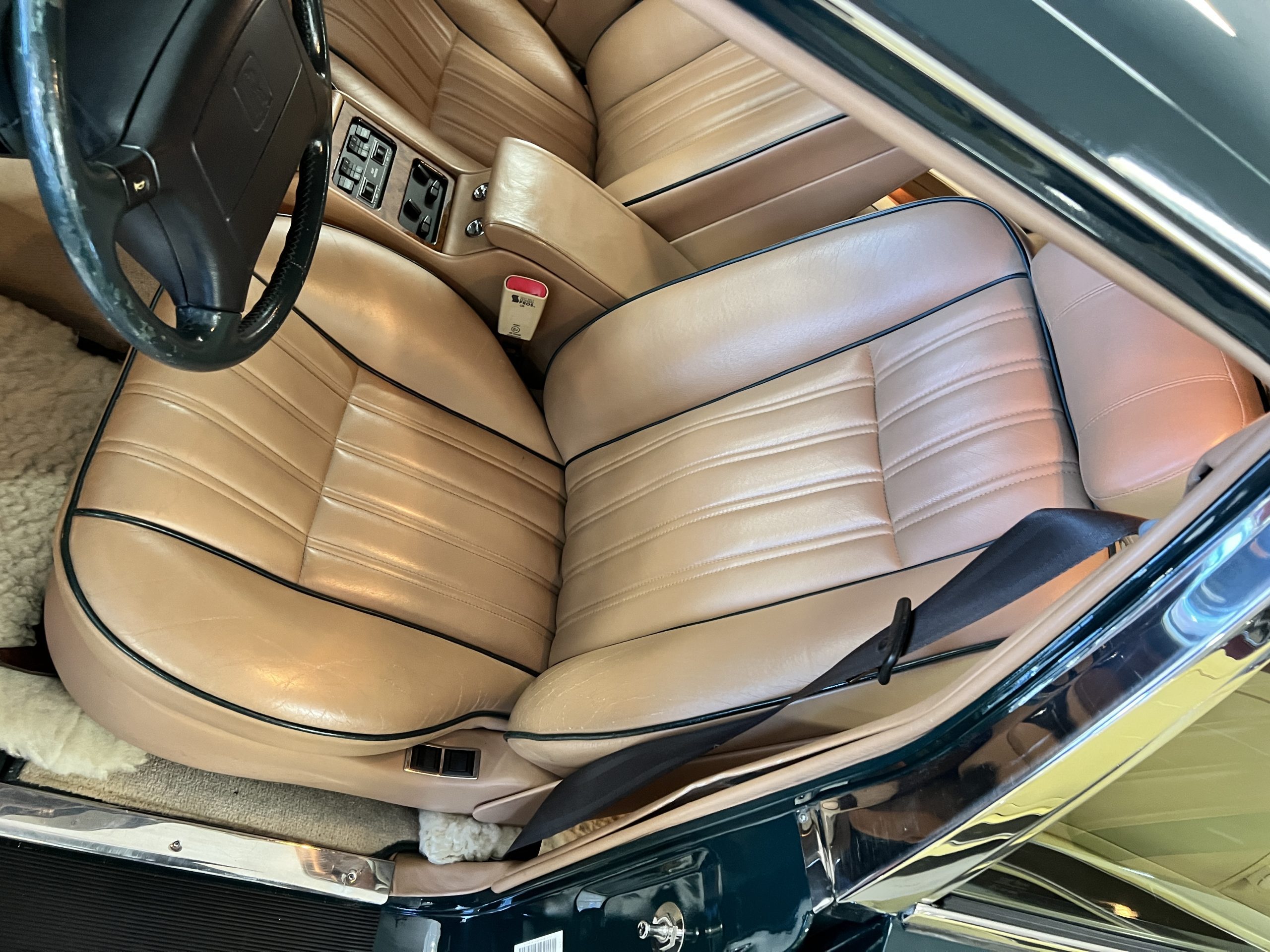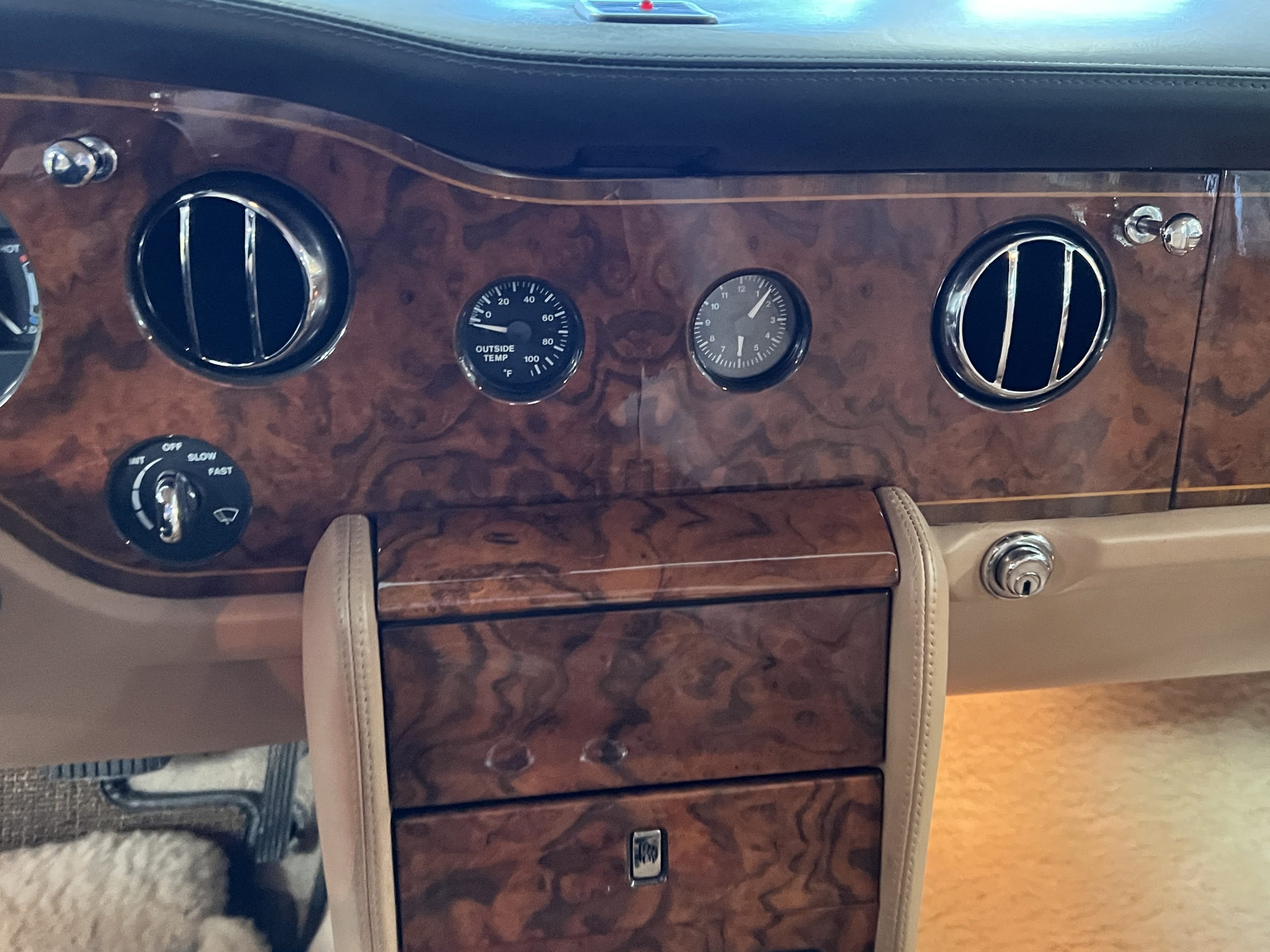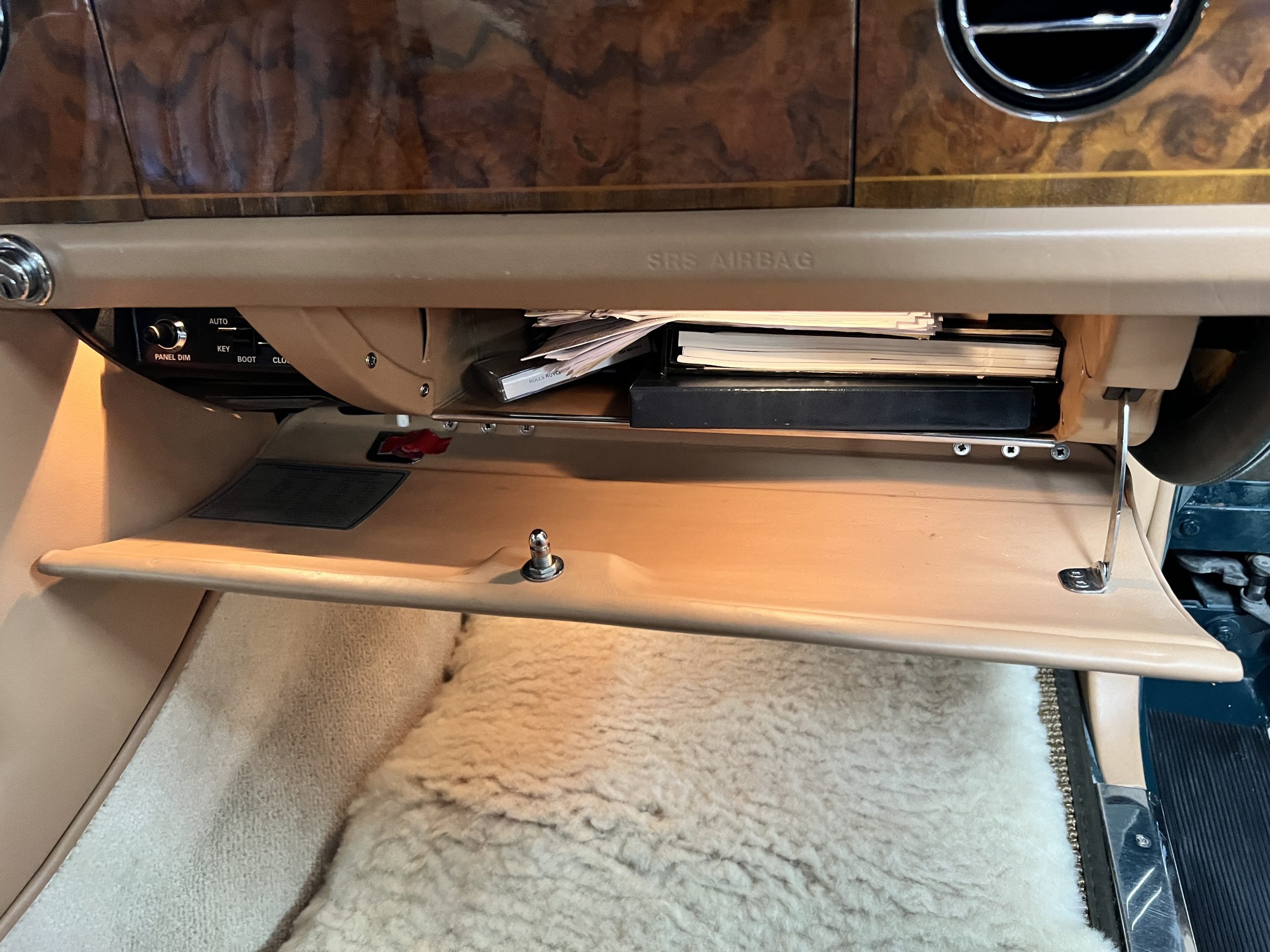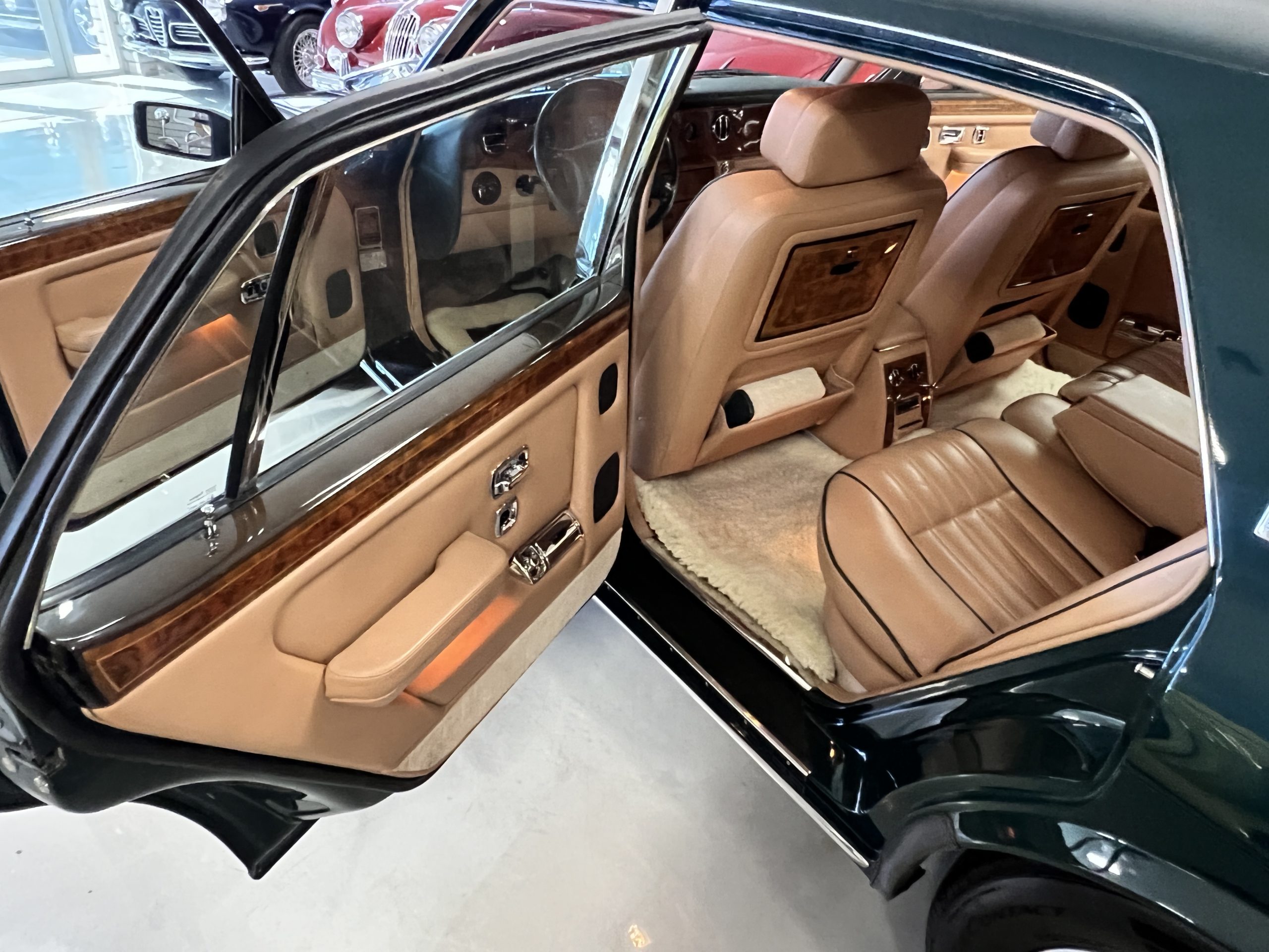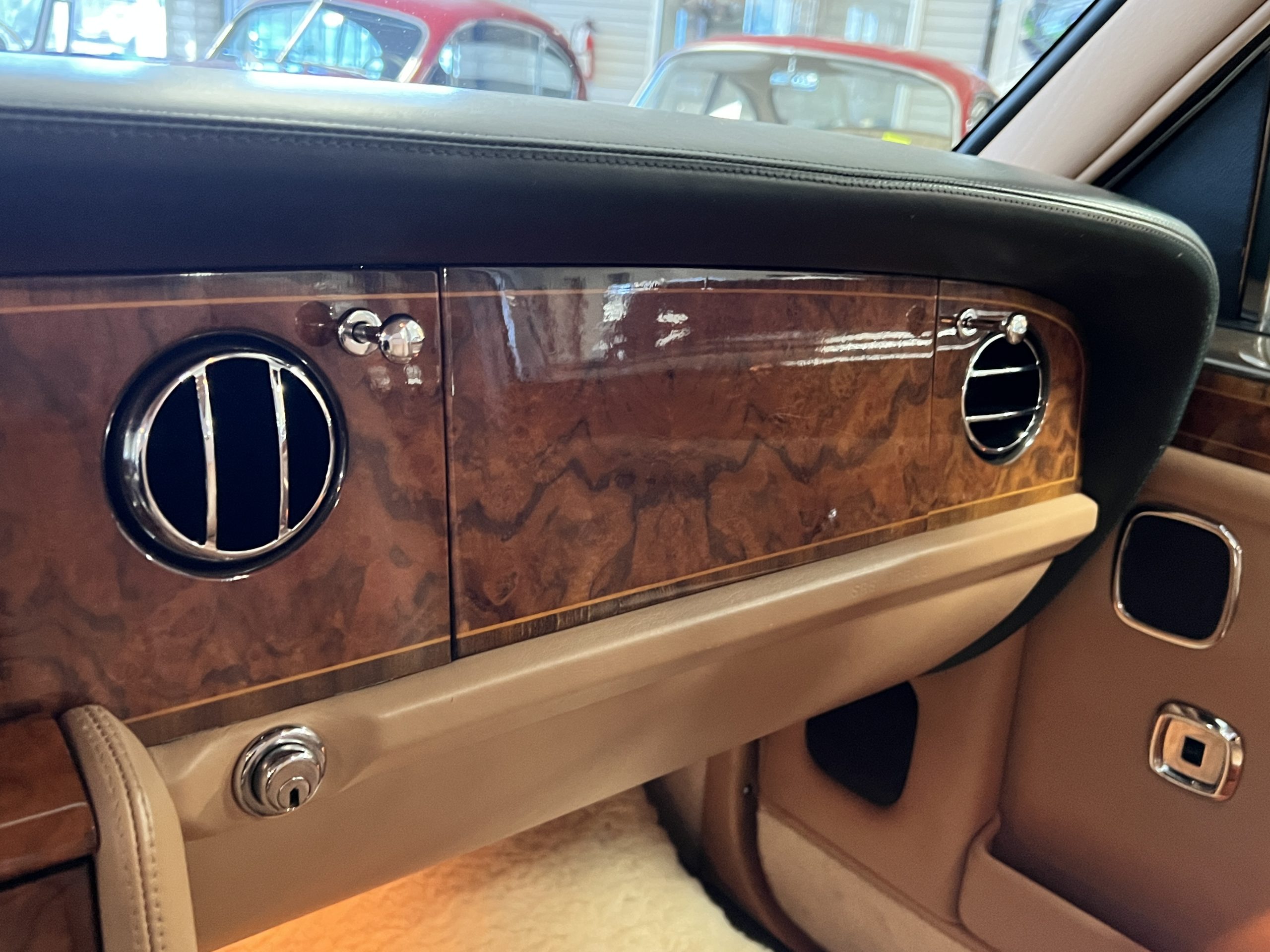 The interior is beautiful in its original Autumn leather with Spruce piping and accents. This was a special order combination with Cotswold carpet and sheepskin mouton carpet overlays. The leather presents itself well with some use showing on the drivers seat bolster and seat bottom. The steering wheel also shows wear from use over the years. These are noticeable upon close inspection. The burl wood accents have boxwood trim and is overall in good condition with many cracks present as shown in the photo gallery. Of course, the picnic trays and vanities are provided for the rear seat passengers. The stereo system has been updated with a more modern Alpine unit. In addition to the mouton overlays, this Rolls has a very nice set of Coco mats for everyday use.
