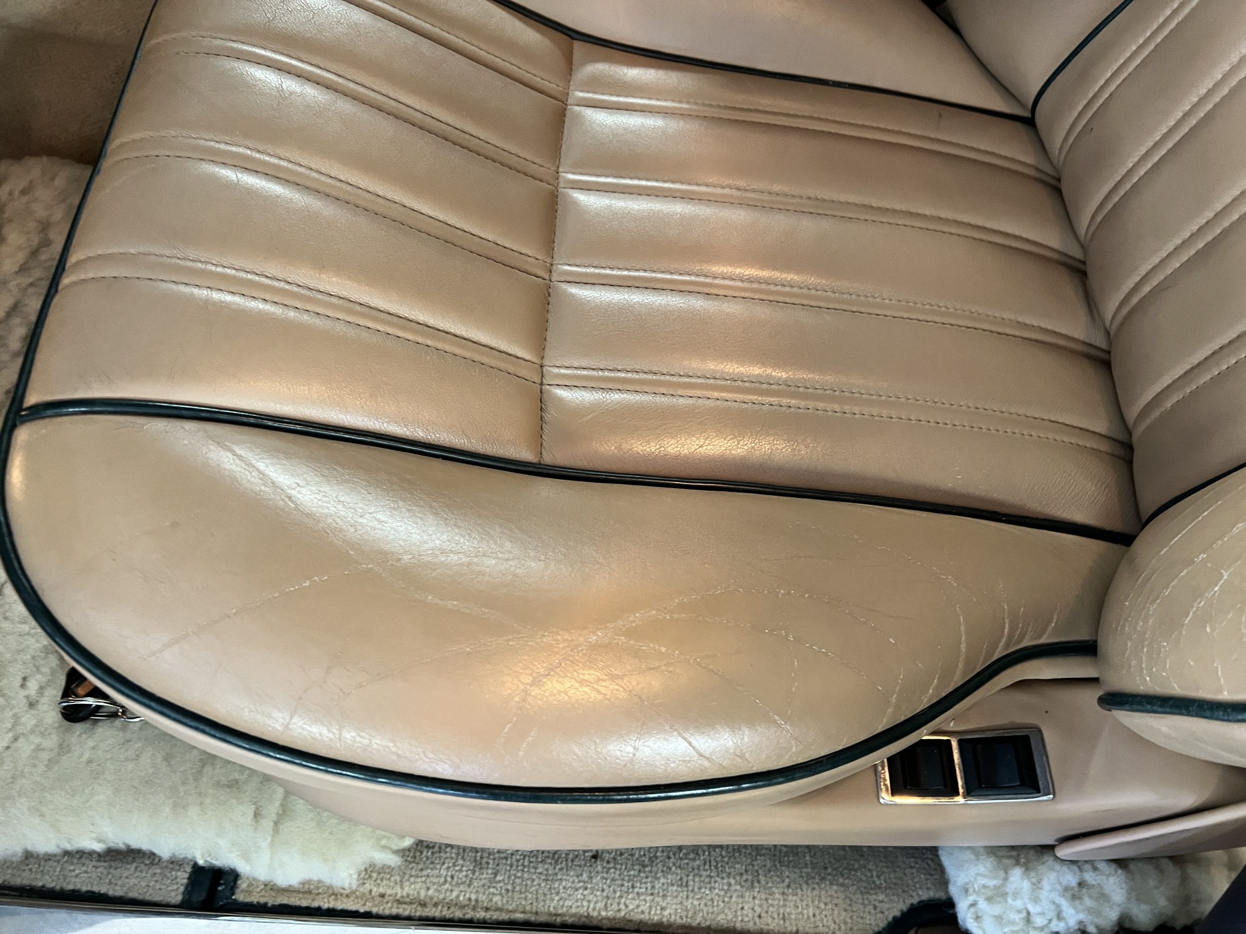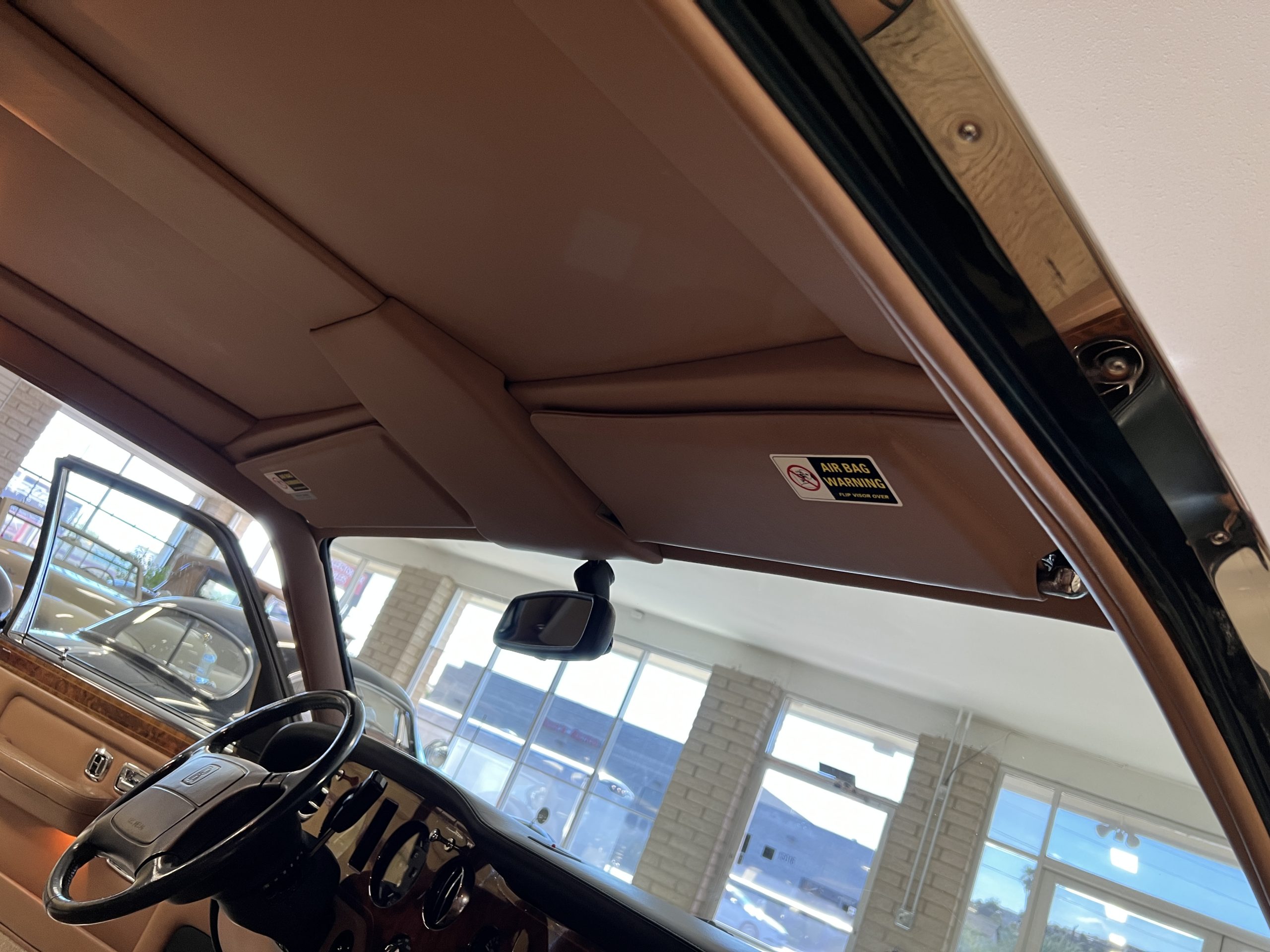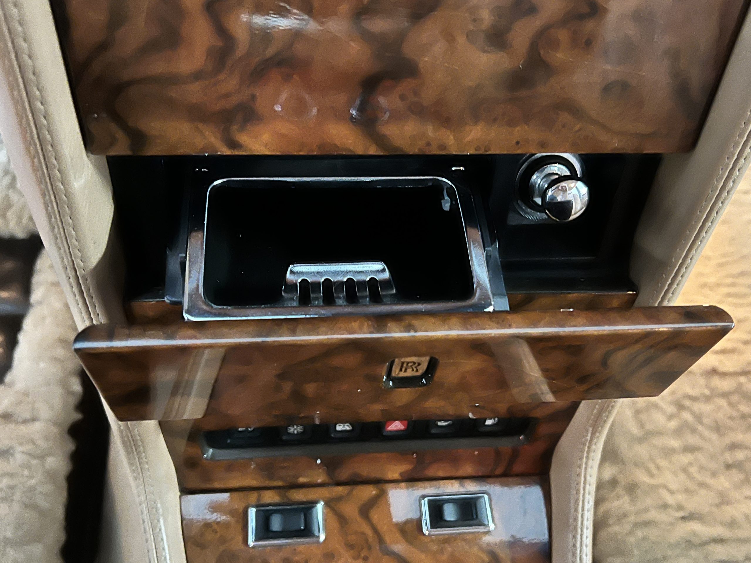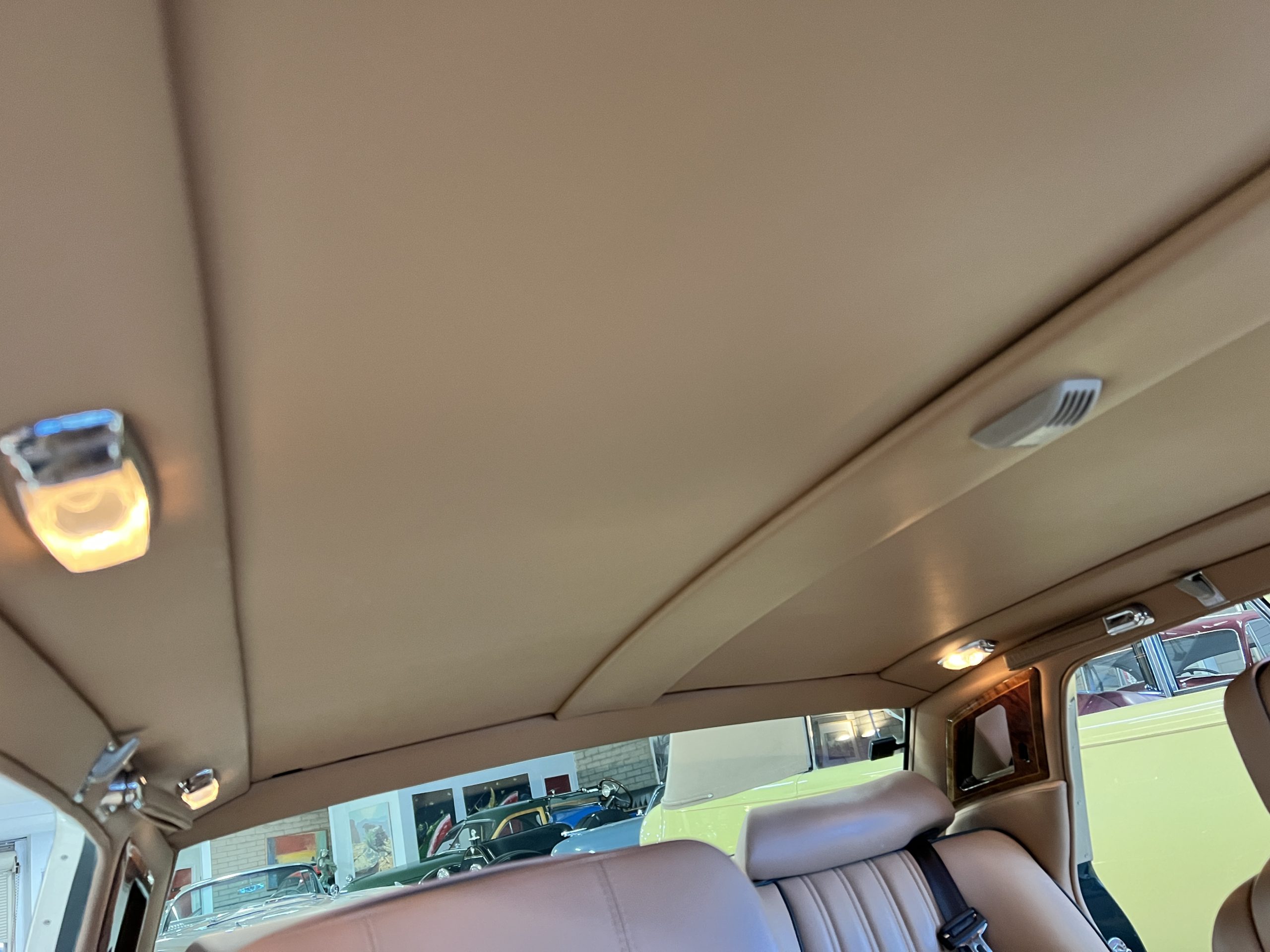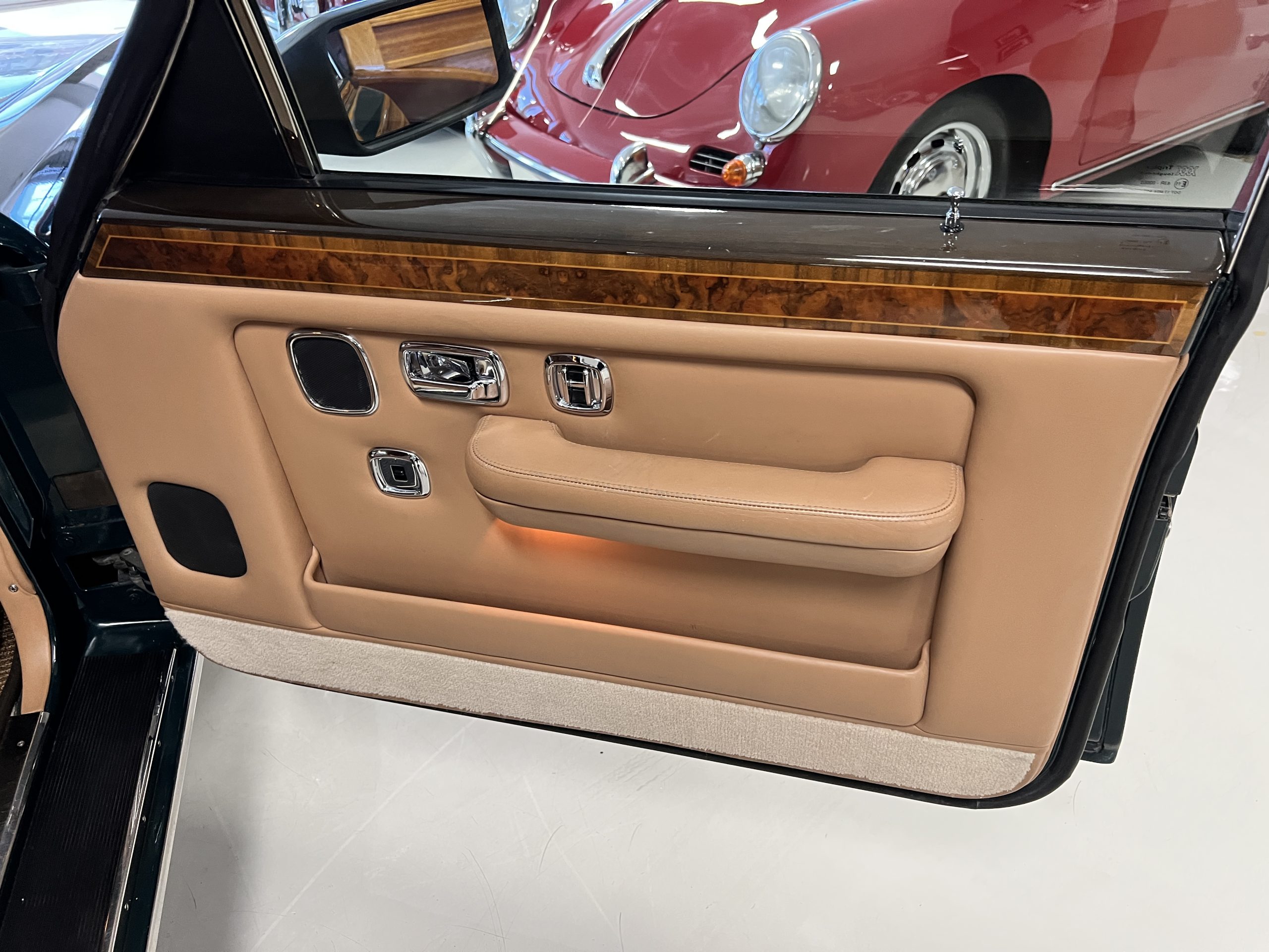 The interior is beautiful in its original Autumn leather with Spruce piping and accents. This was a special order combination with Cotswold carpet and sheepskin mouton carpet overlays. The leather presents itself well with some use showing on the drivers seat bolster and seat bottom. The steering wheel also shows wear from use over the years. These are noticeable upon close inspection. The burl wood accents have boxwood trim and is overall in good condition with many cracks present as shown in the photo gallery. Of course, the picnic trays and vanities are provided for the rear seat passengers. The stereo system has been updated with a more modern Alpine unit. In addition to the mouton overlays, this Rolls has a very nice set of Coco mats for everyday use.