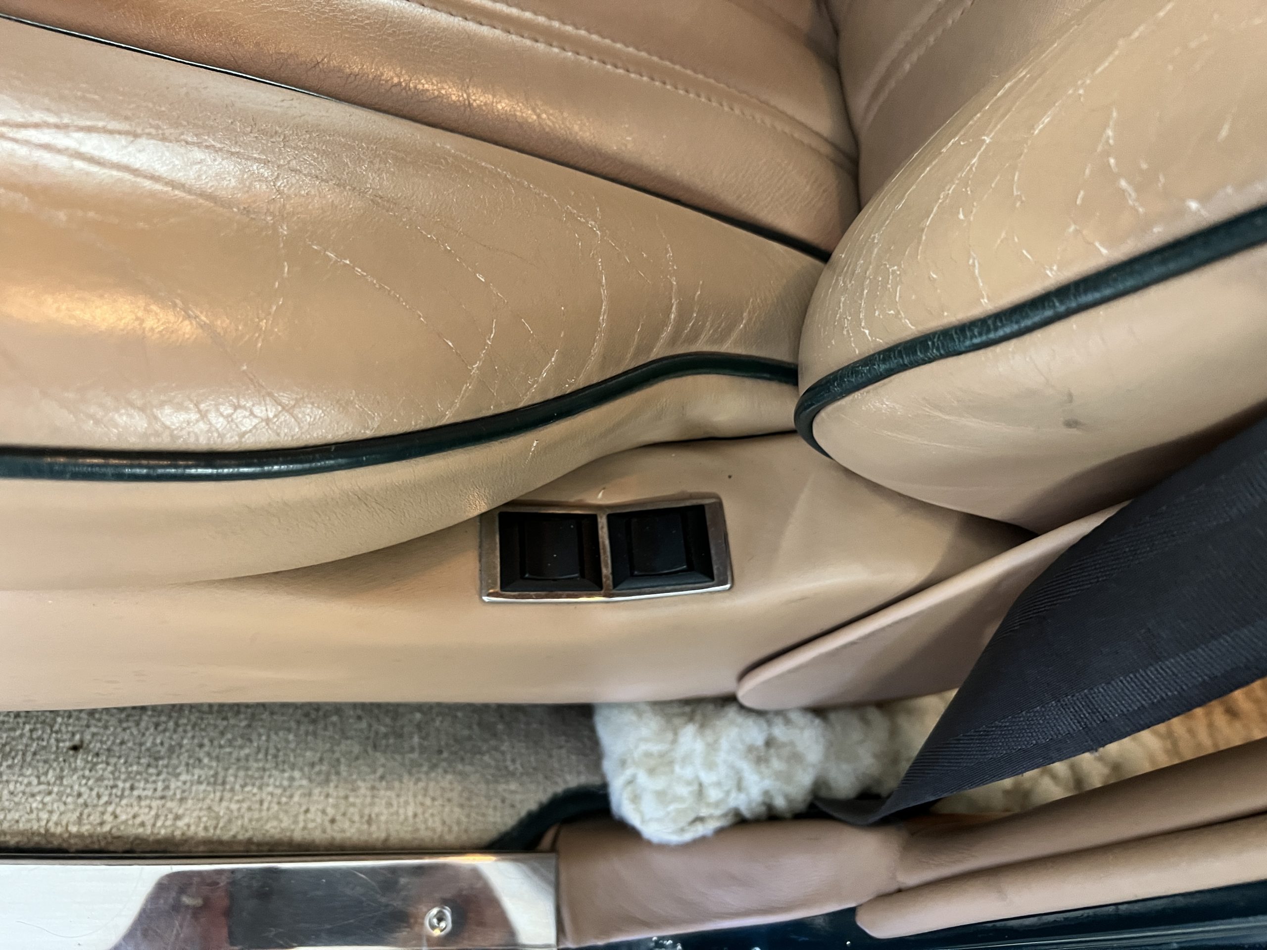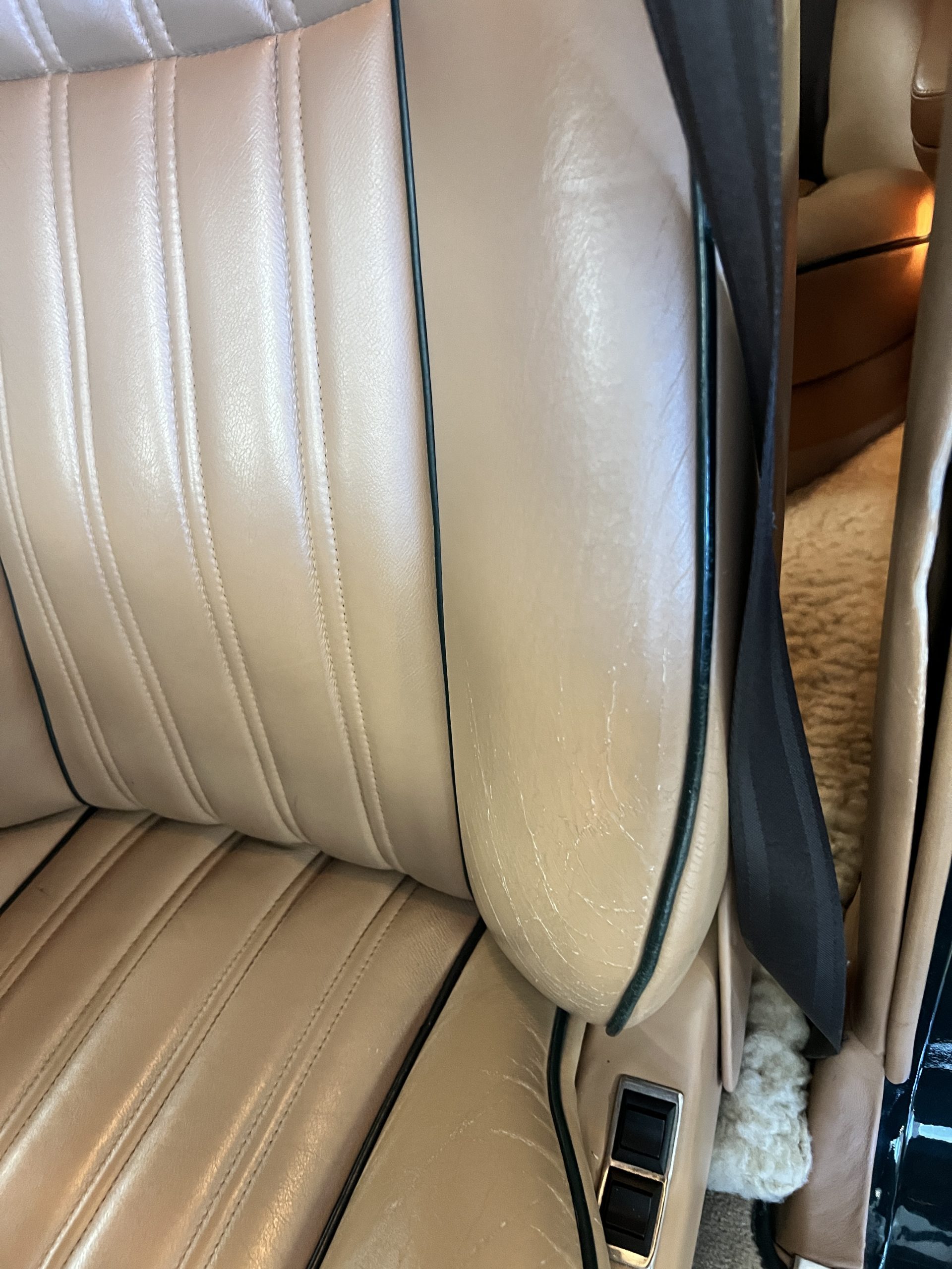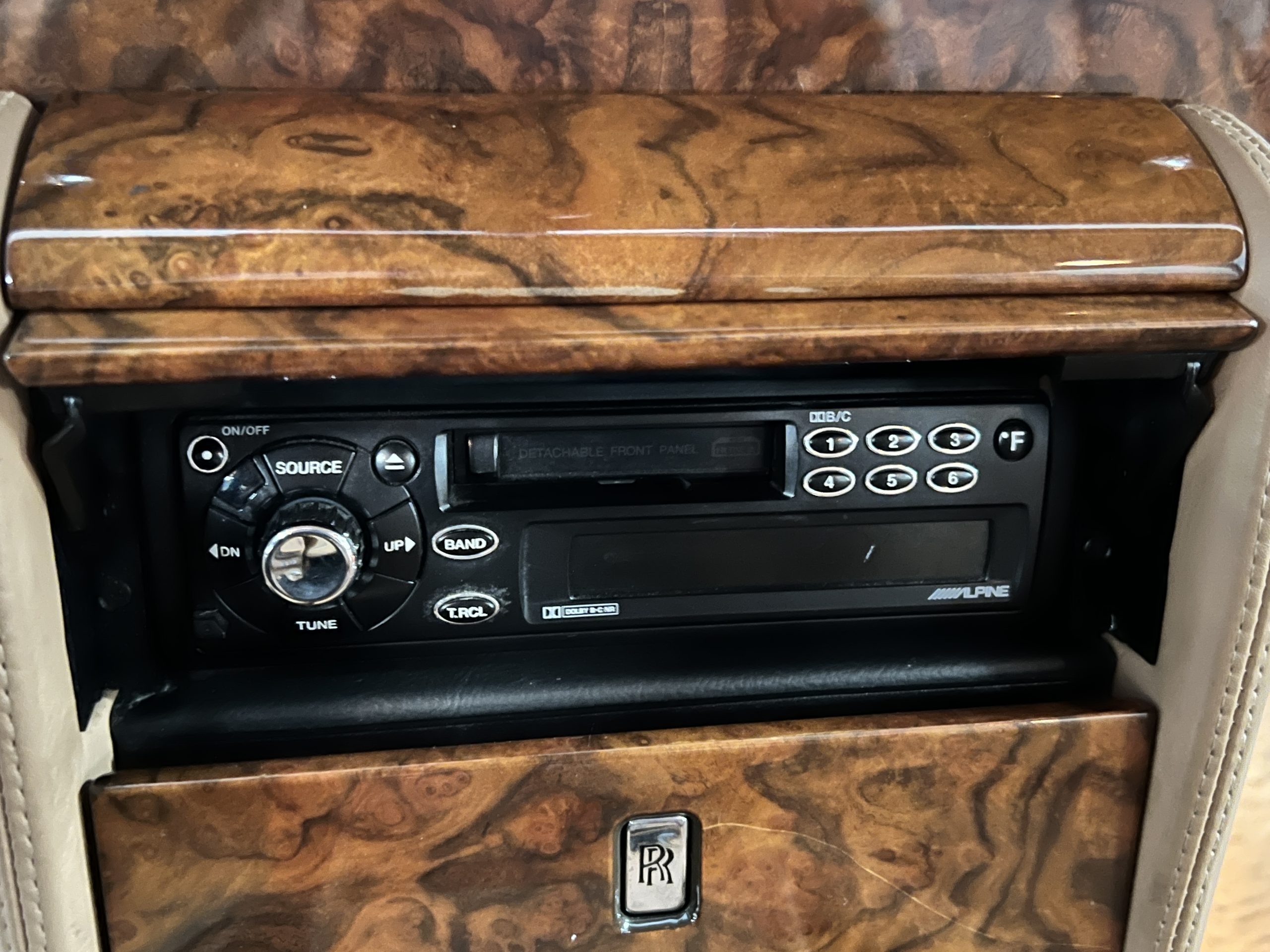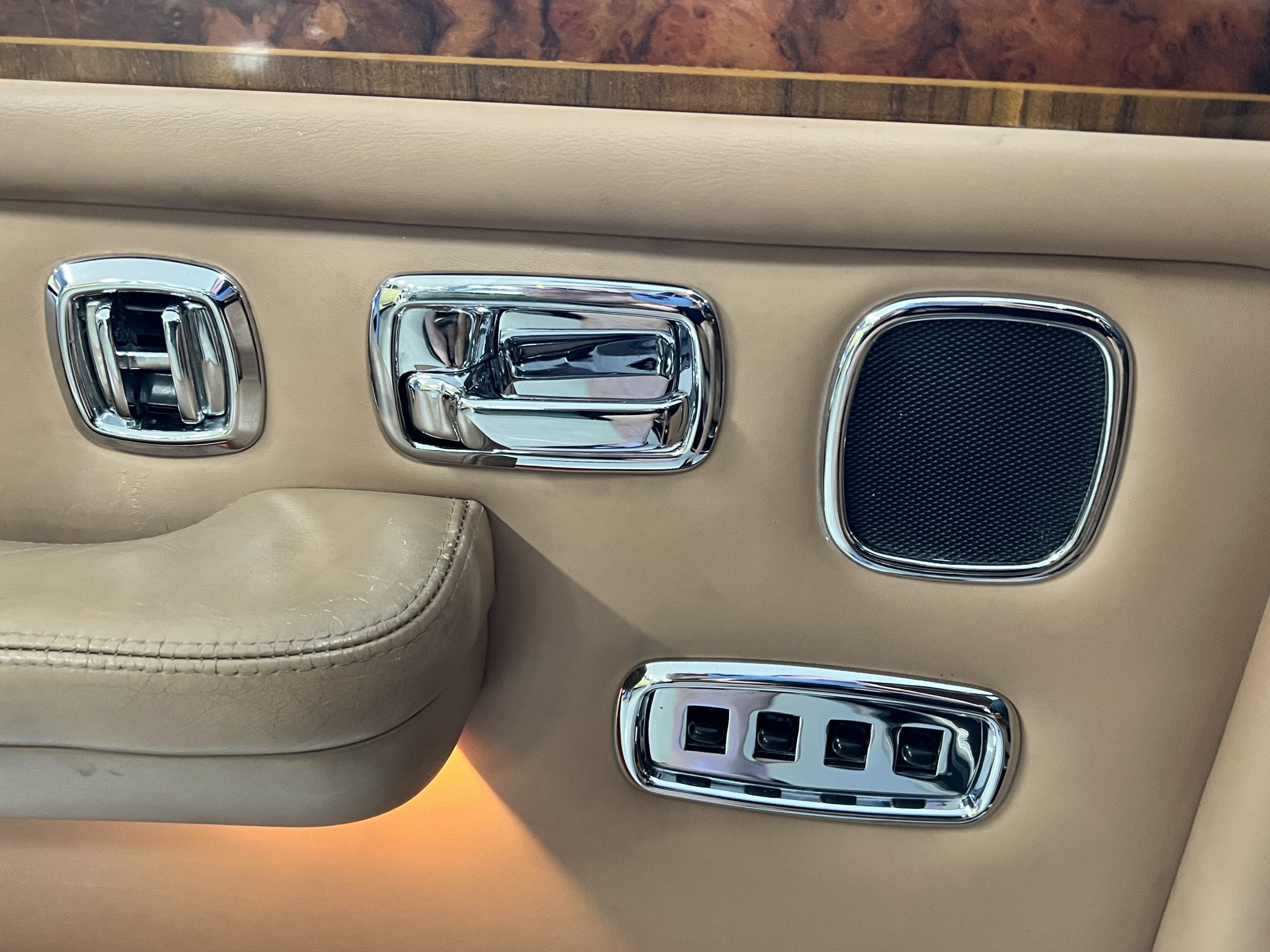 The interior is beautiful in its original Autumn leather with Spruce piping and accents. This was a special order combination with Cotswold carpet and sheepskin mouton carpet overlays. The leather presents itself well with some use showing on the drivers seat bolster and seat bottom. The steering wheel also shows wear from use over the years. These are noticeable upon close inspection. The burl wood accents have boxwood trim and is overall in good condition with many cracks present as shown in the photo gallery. Of course, the picnic trays and vanities are provided for the rear seat passengers. The stereo system has been updated with a more modern Alpine unit. In addition to the mouton overlays, this Rolls has a very nice set of Coco mats for everyday use.