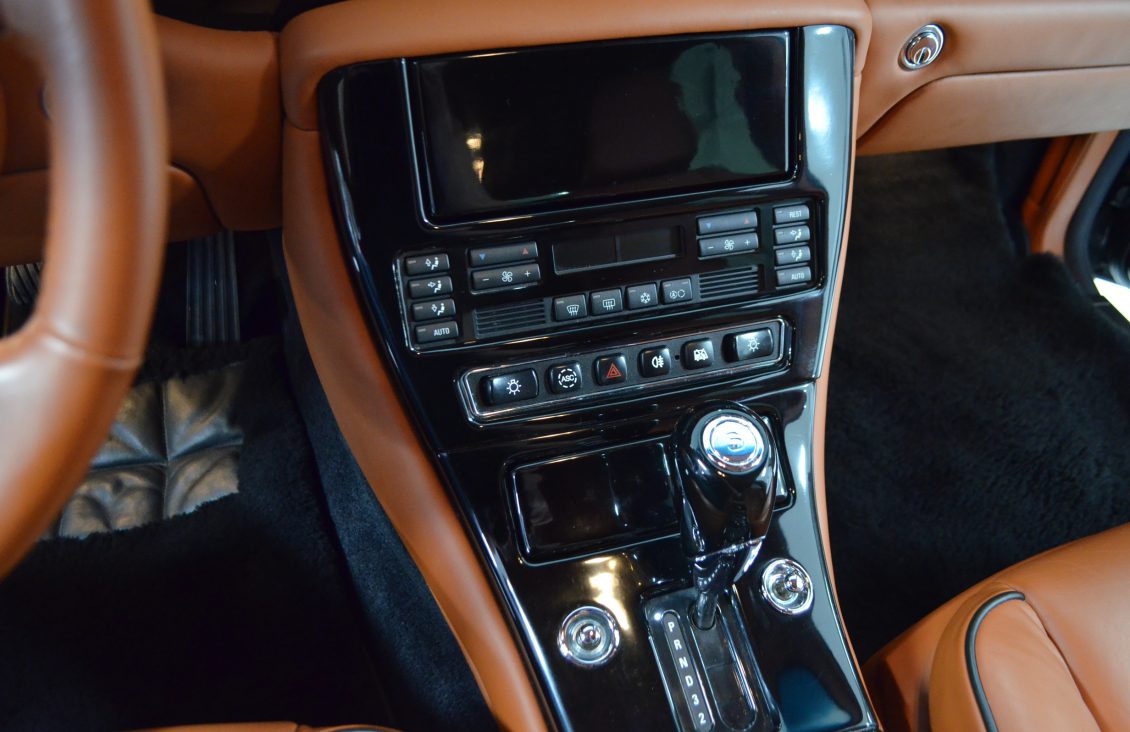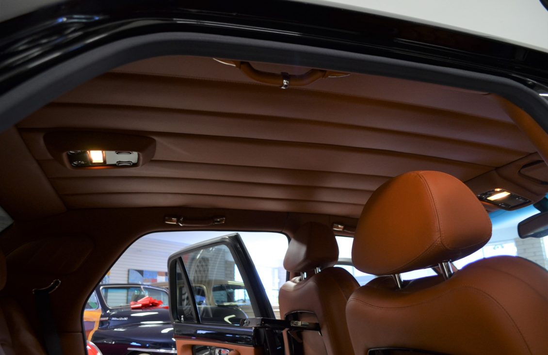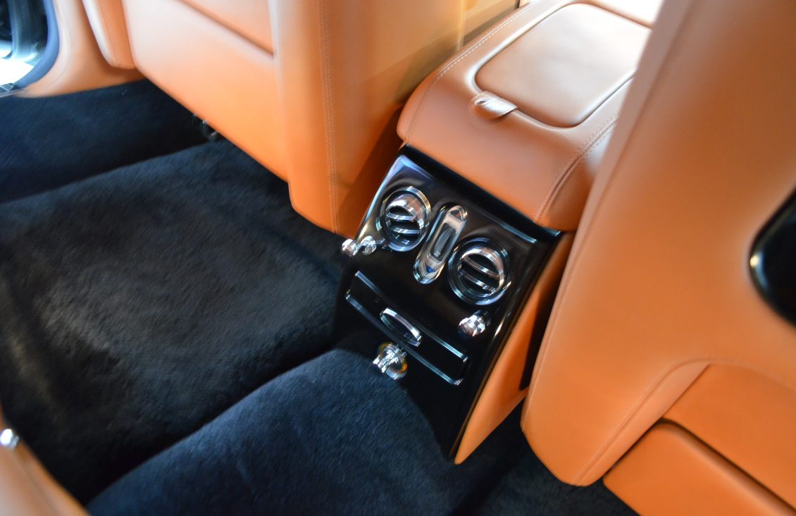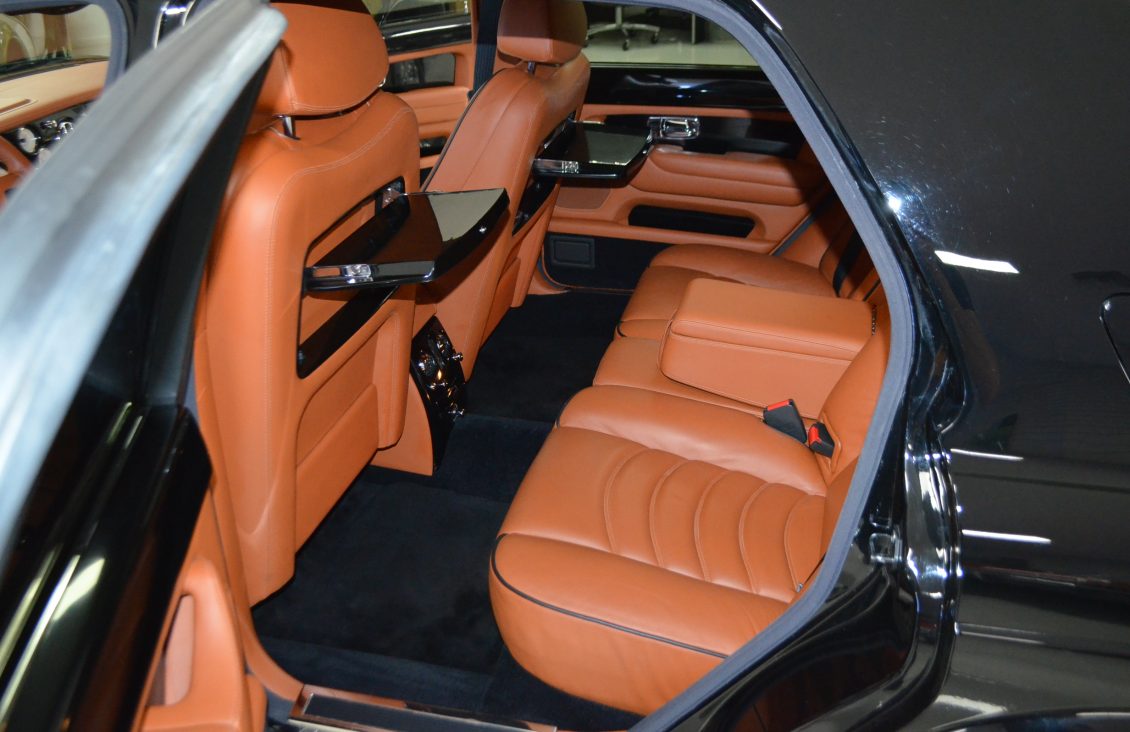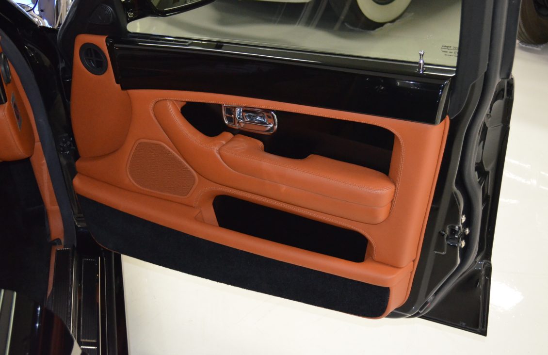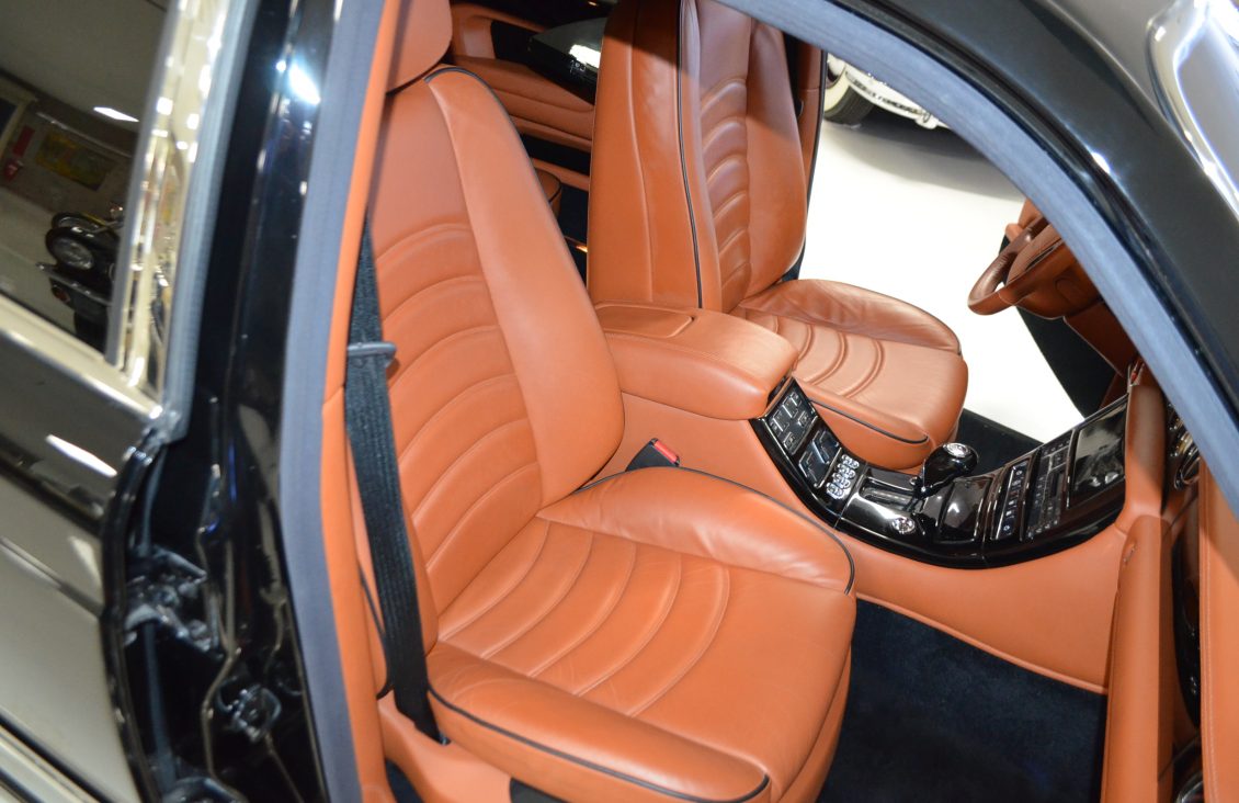 The interior is perhaps even more impressive and much more rare. The Saddle tan leather is nearly perfect in all respects. This is the only Arnage known that was ordered with the Continental R seats, which make it unique and stunning. The leather is contrasted with piano black Ebony wood throughout that is simply gorgeous. It is a very rare option for a Rolls or Bentley. The last time we saw this feature was in the Rockefellers Rolls-Royce Phantom V James Young Sedanca.