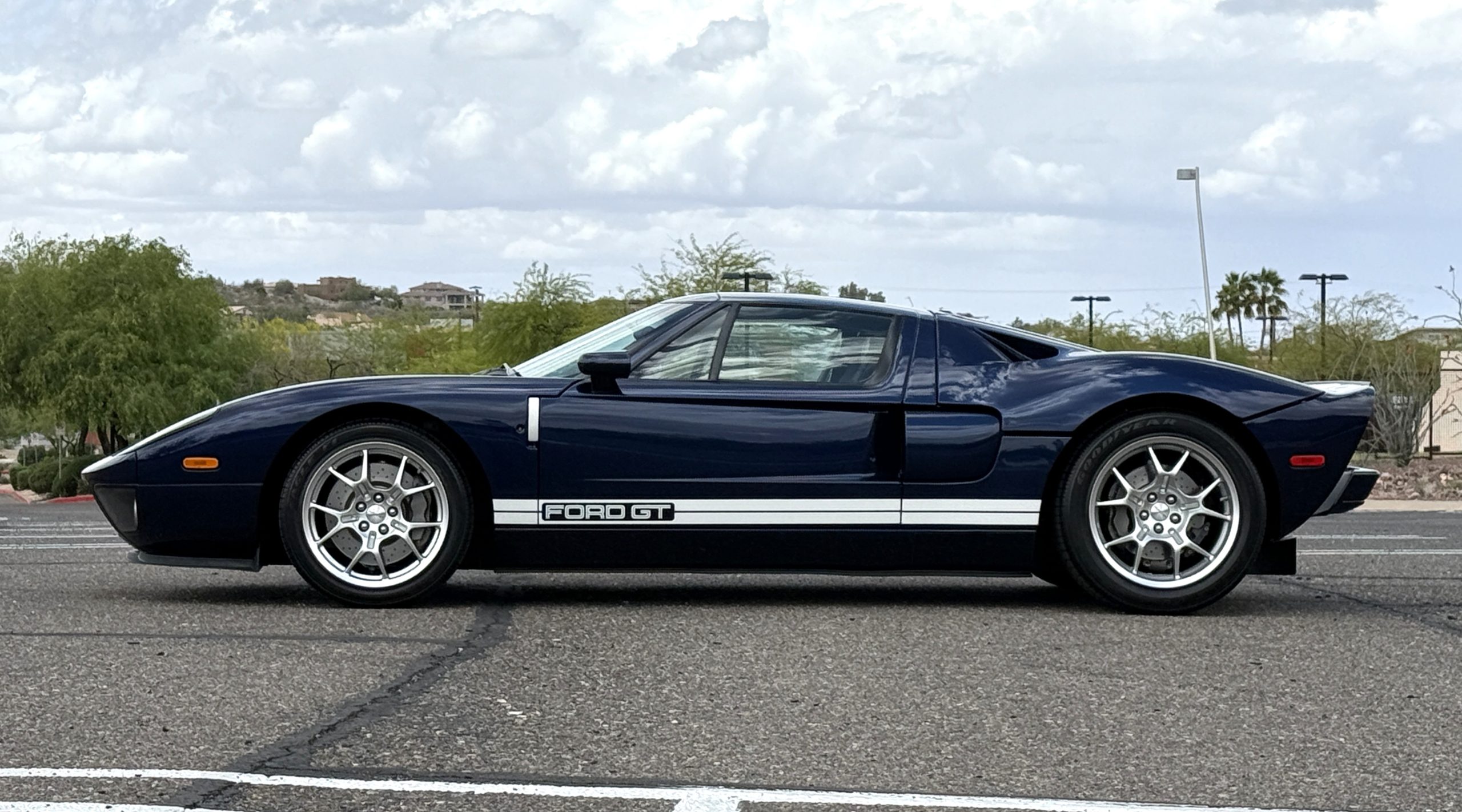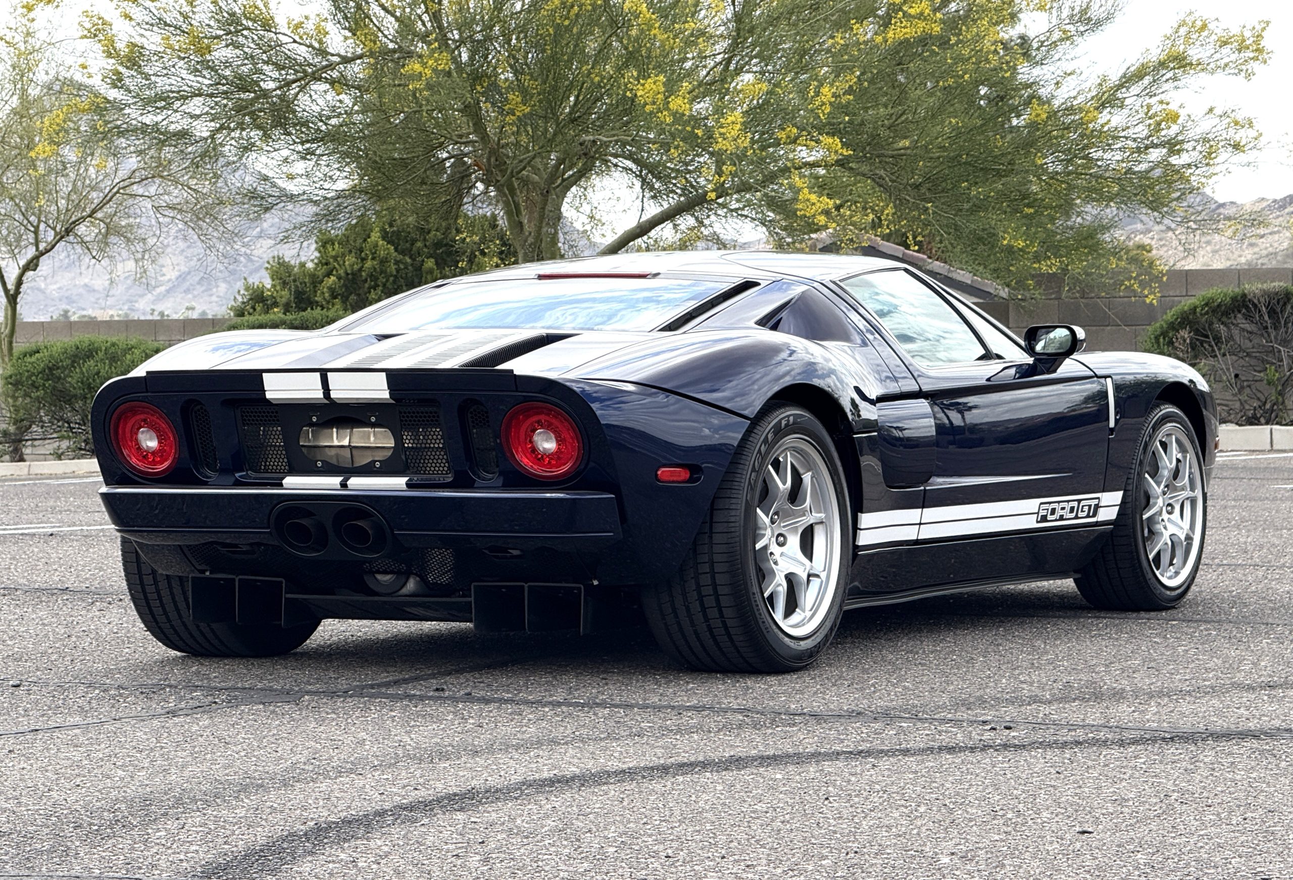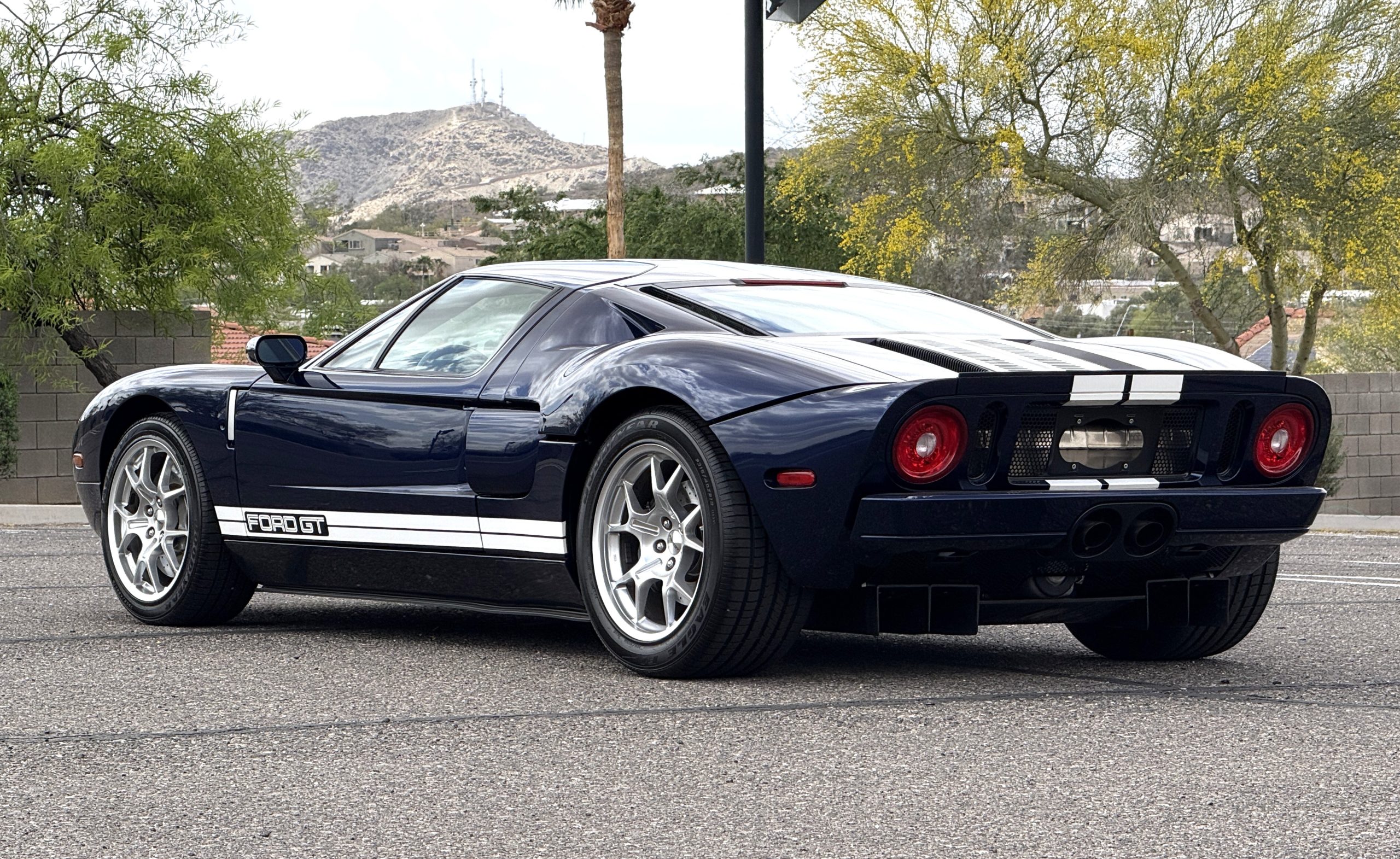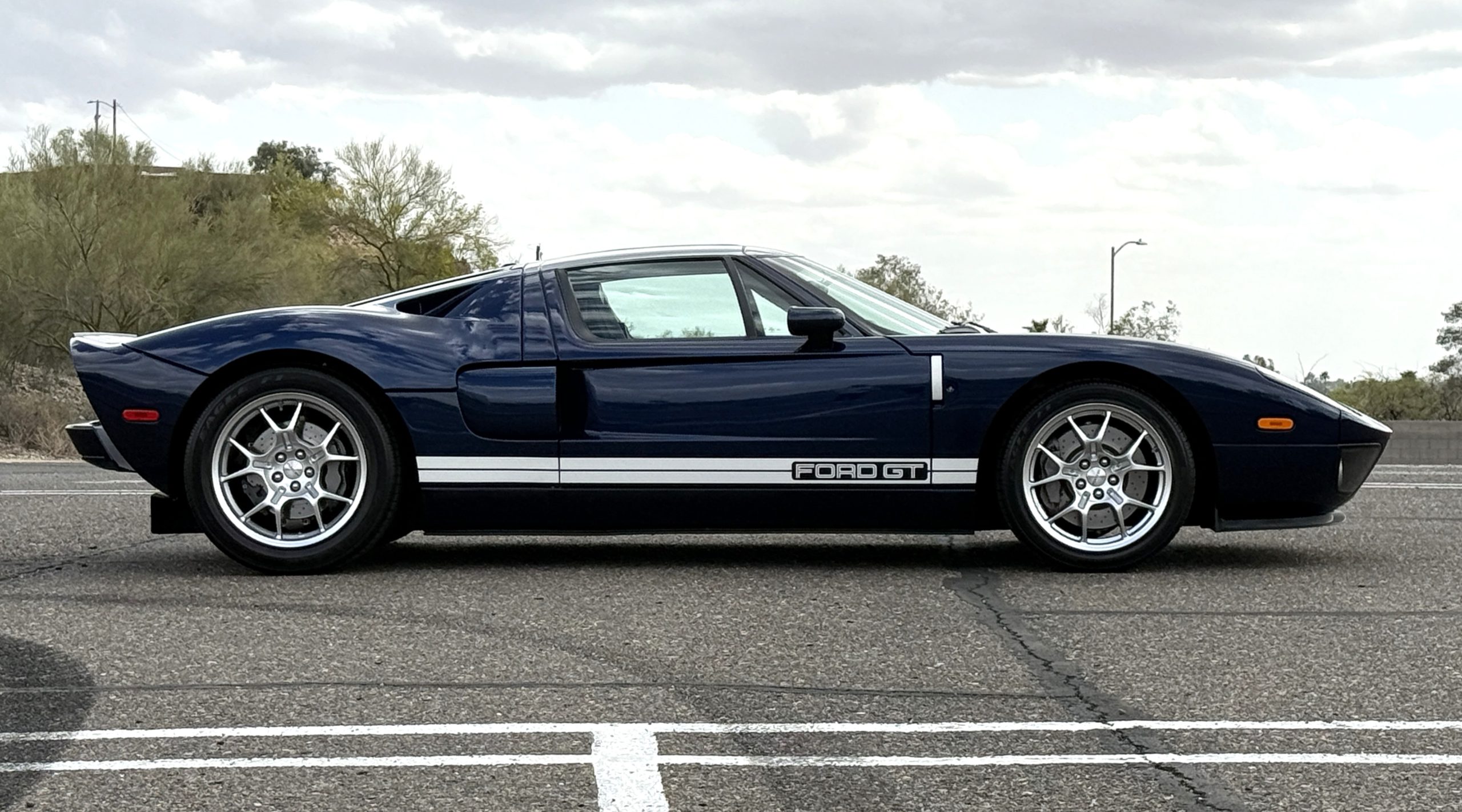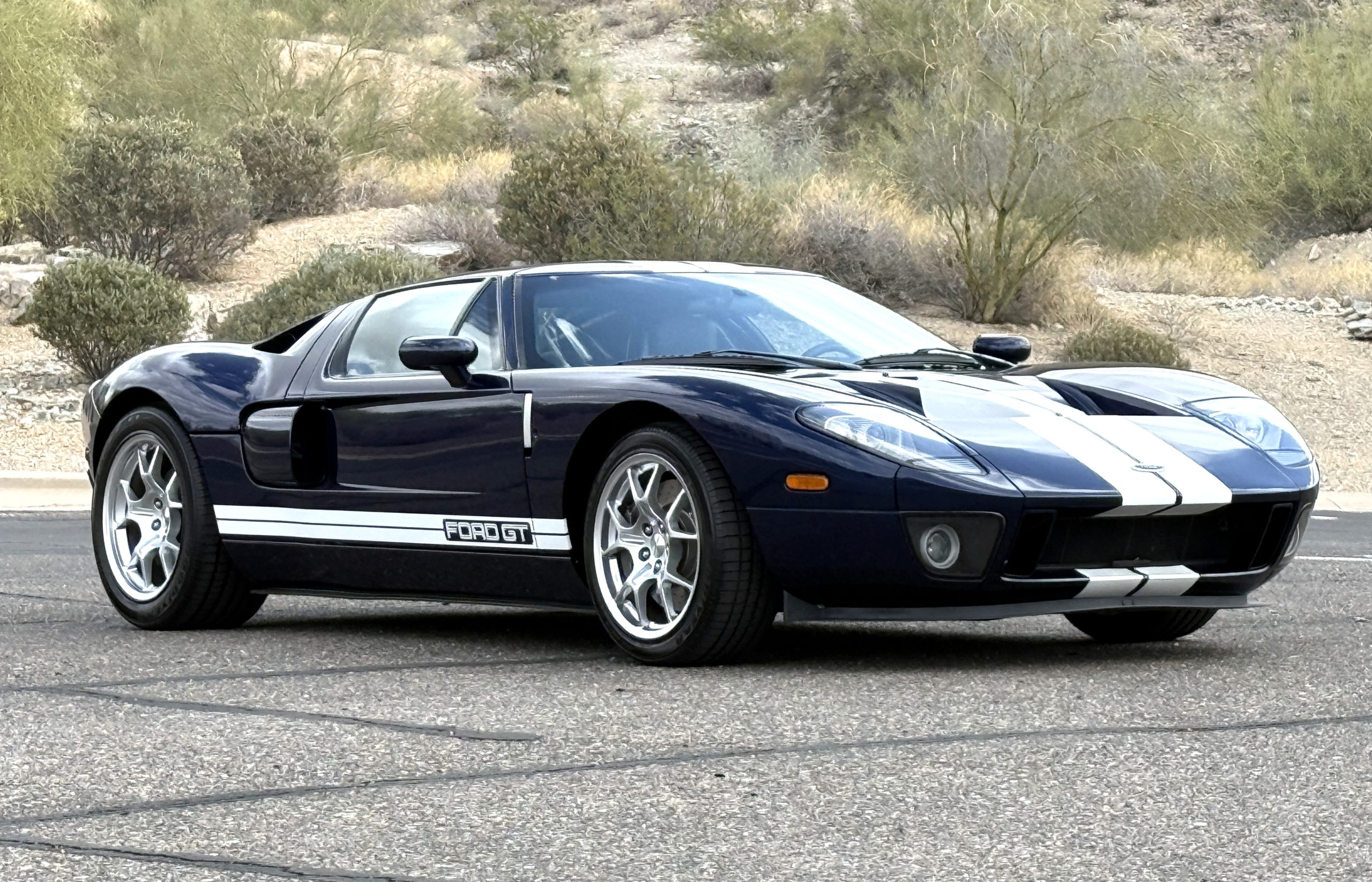 This 2005 Ford GT is one of 2,022 built for the model year, and it was first delivered to Berge Ford in Mesa, Arizona. The car was purchased new by the owner, and it has 11k miles following registration history in the state. It was specified in Midnight Blue over Ebony leather and was factory optioned with painted white stripes, forged aluminum BBS wheels, gray-painted brake calipers, and a McIntosh stereo system. Power is supplied by a supercharged 5.4-liter V8 linked with a six-speed manual gearbox and a helical limited-slip differential. Additional equipment includes Brembo brakes, HID headlights, a front splitter, a rear diffuser, and air conditioning. This Ford GT is now offered on dealer consignment with a window sticker, the owner’s manual, service records, a clean Carfax report, and a clean Arizona title.
