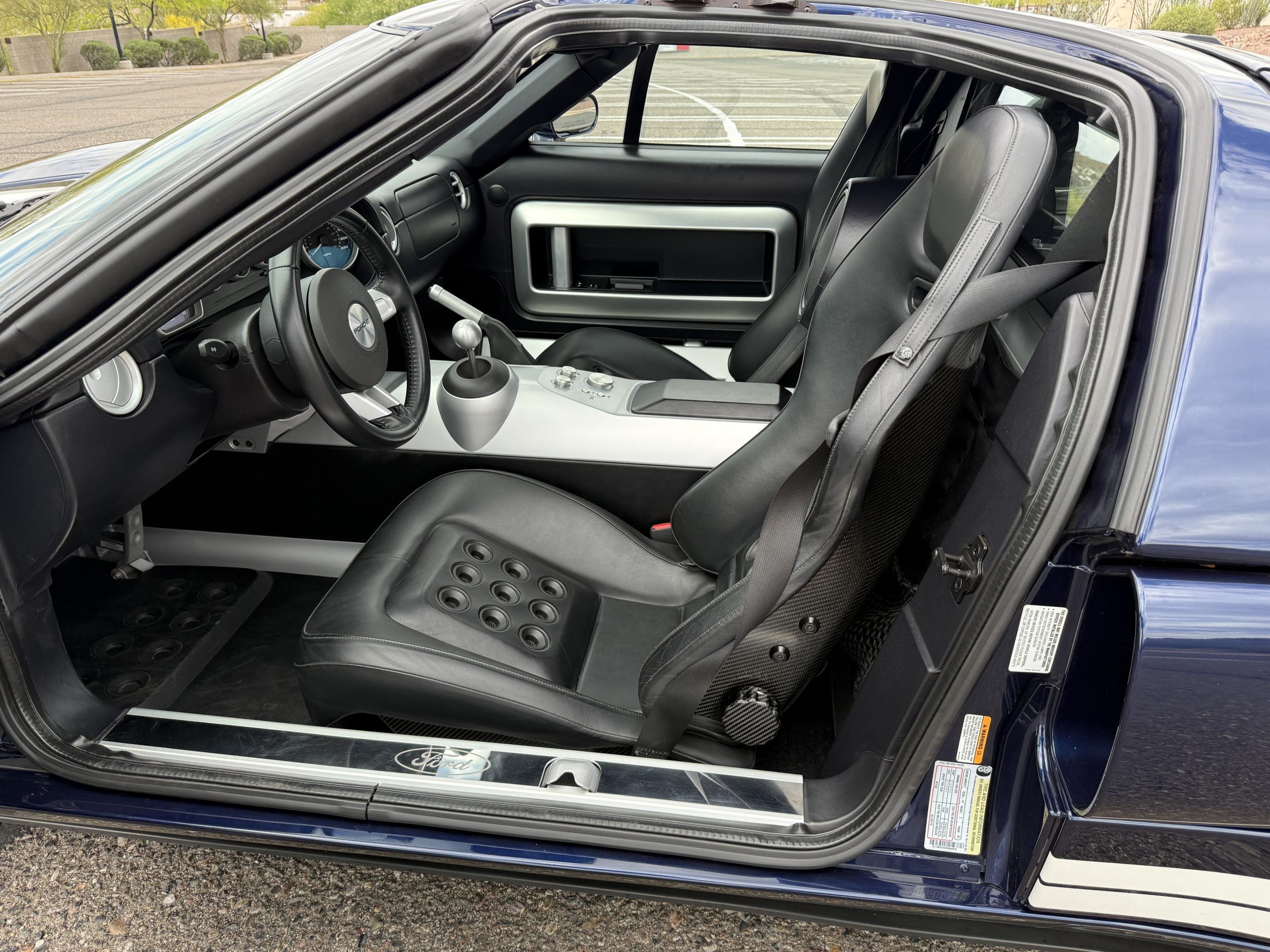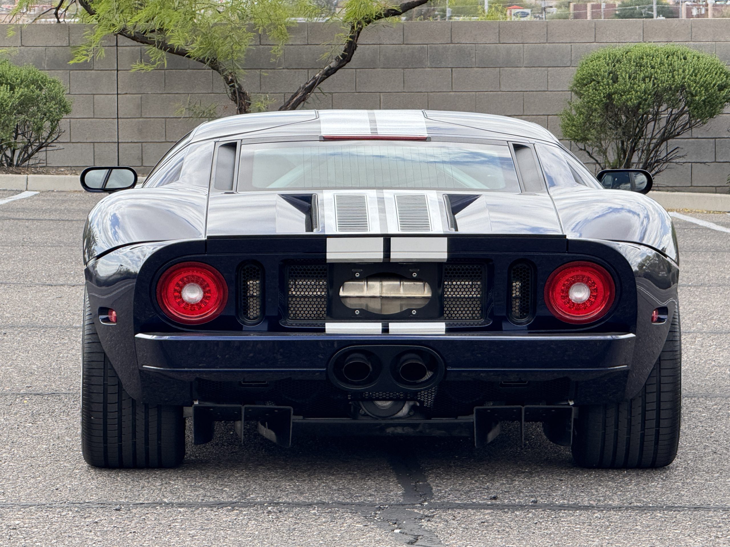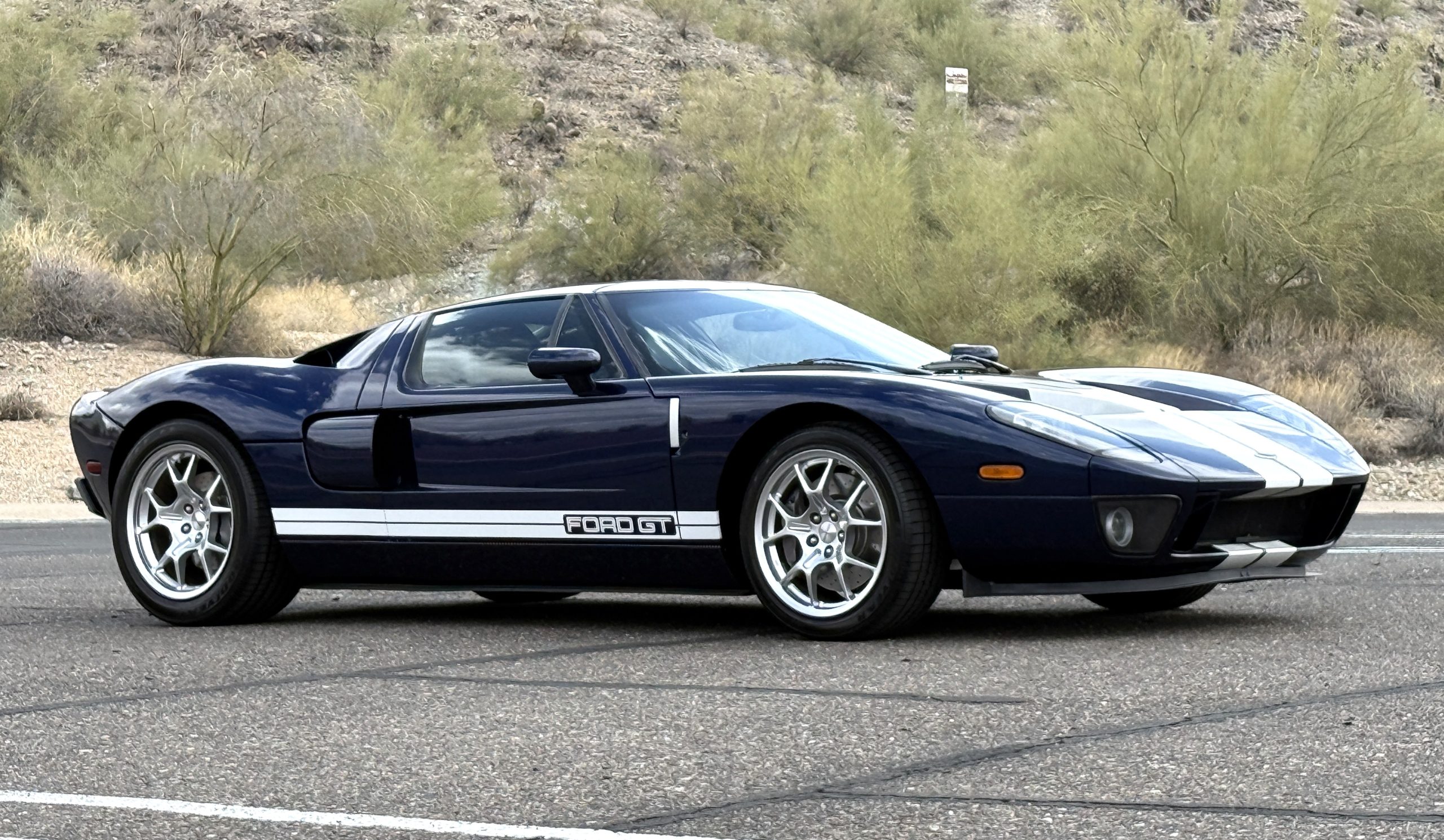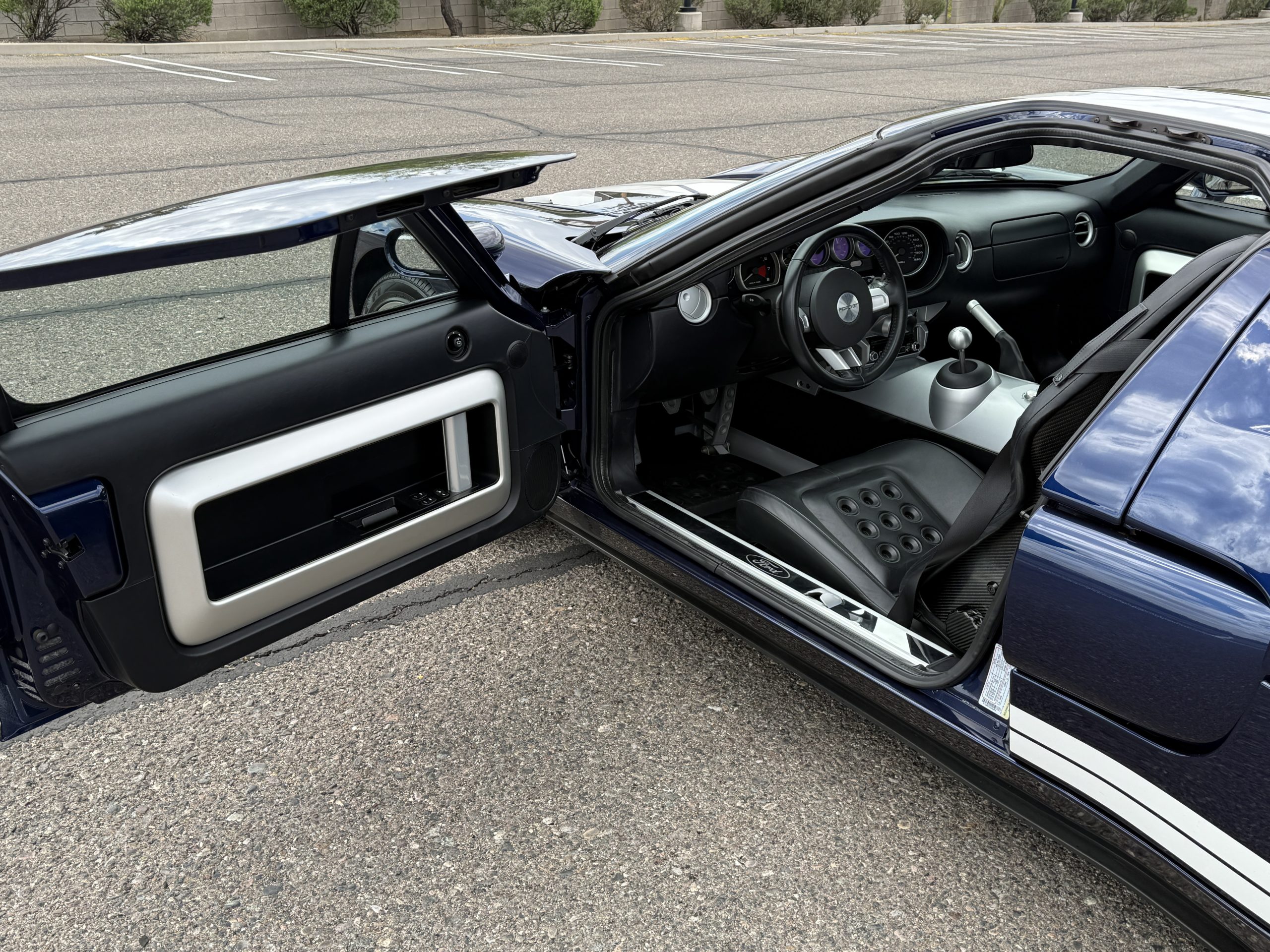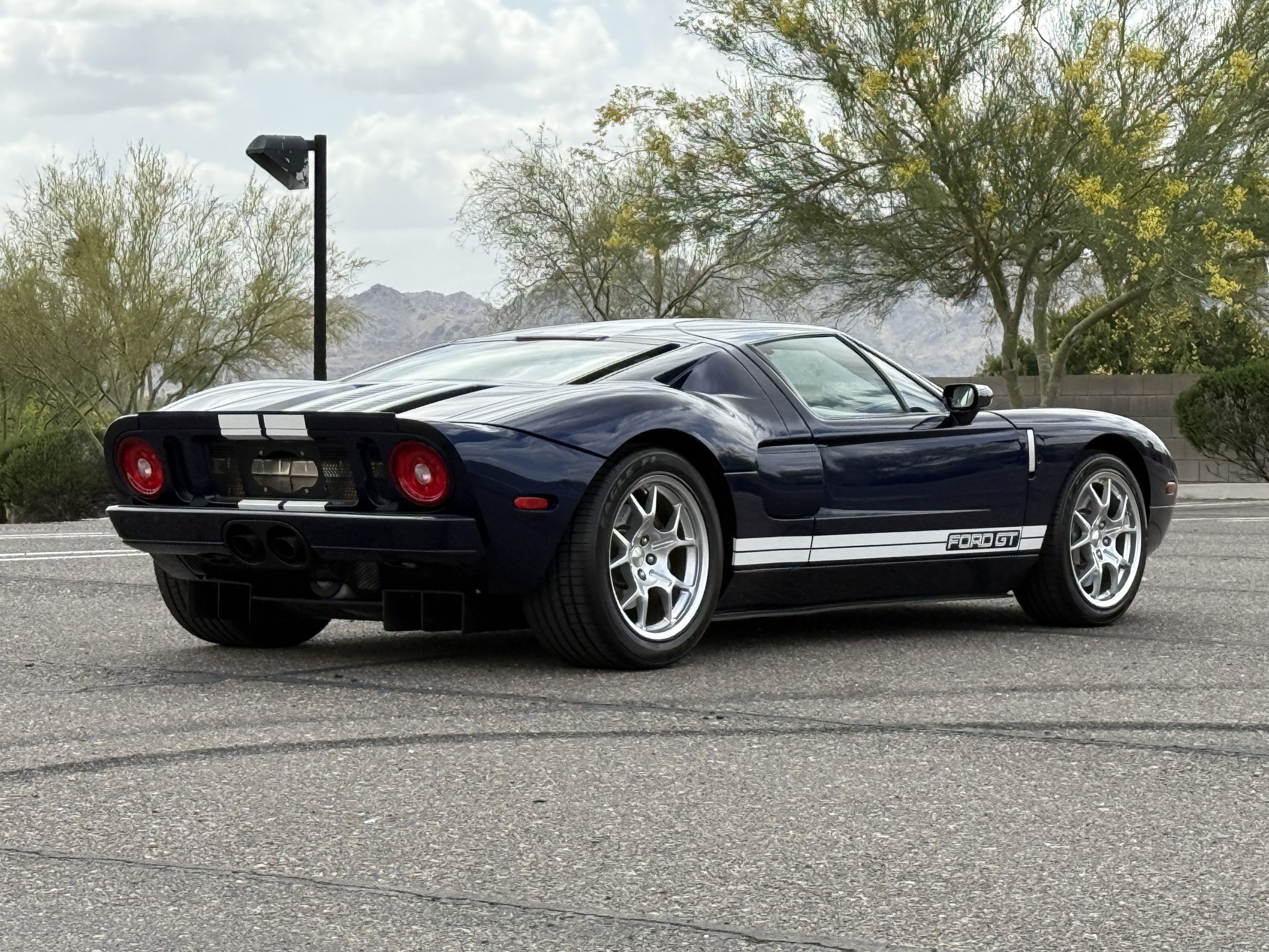 This 2005 Ford GT is one of 2,022 built for the model year, and it was first delivered to Berge Ford in Mesa, Arizona. The car was purchased new by the owner, and it has 11k miles following registration history in the state. It was specified in Midnight Blue over Ebony leather and was factory optioned with painted white stripes, forged aluminum BBS wheels, gray-painted brake calipers, and a McIntosh stereo system. Power is supplied by a supercharged 5.4-liter V8 linked with a six-speed manual gearbox and a helical limited-slip differential. Additional equipment includes Brembo brakes, HID headlights, a front splitter, a rear diffuser, and air conditioning. This Ford GT is now offered on dealer consignment with a window sticker, the owner’s manual, service records, a clean Carfax report, and a clean Arizona title.