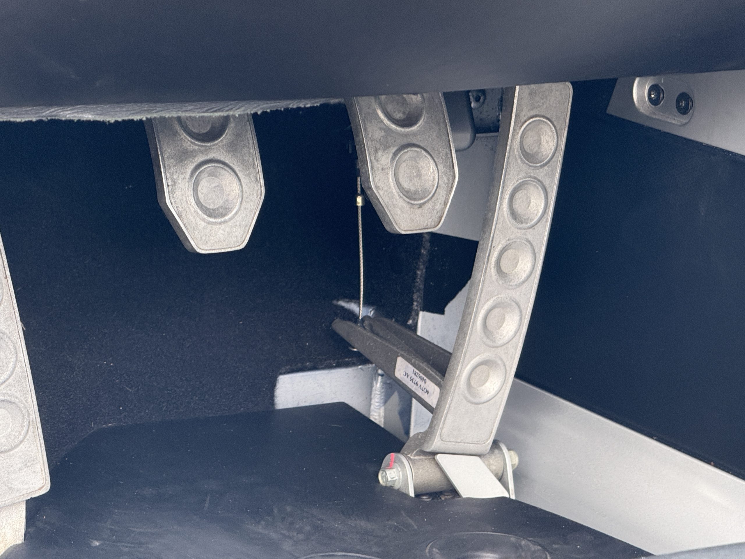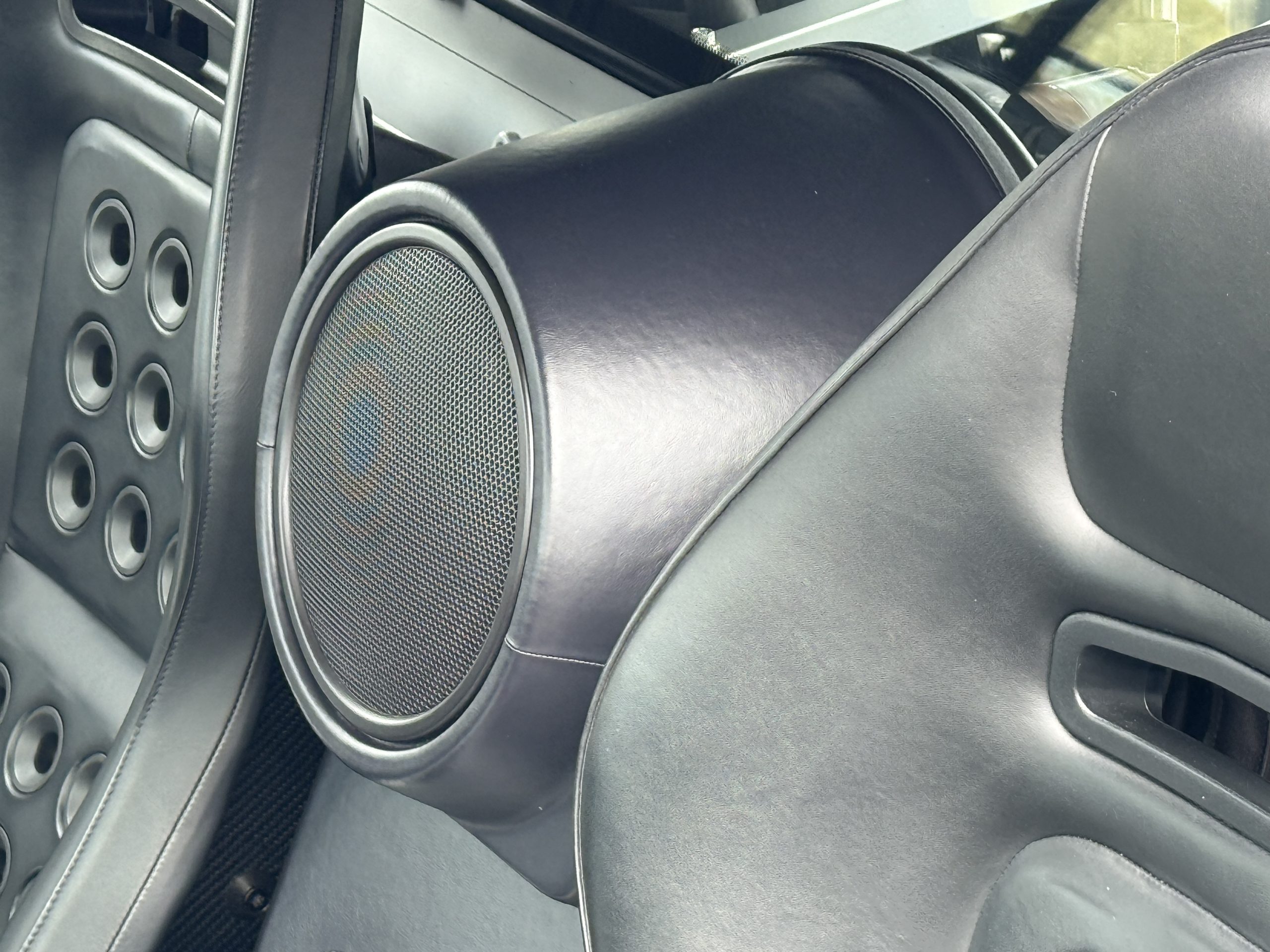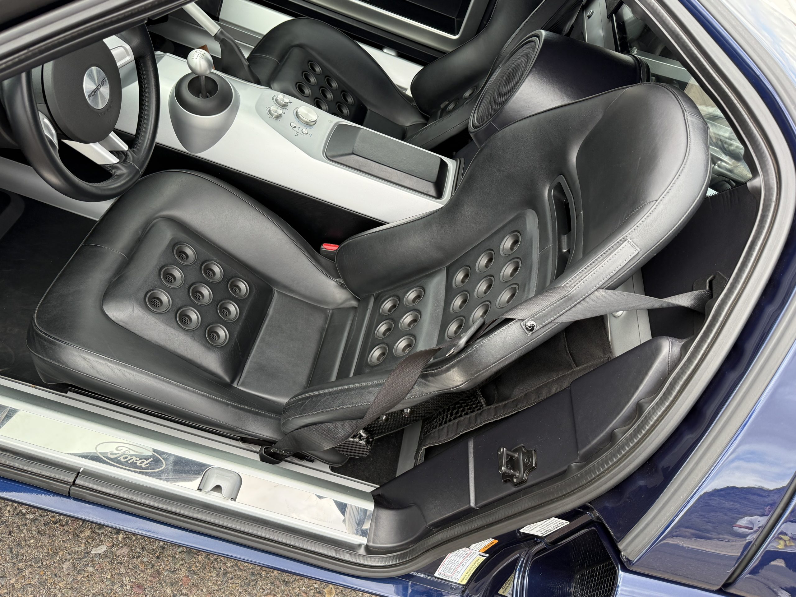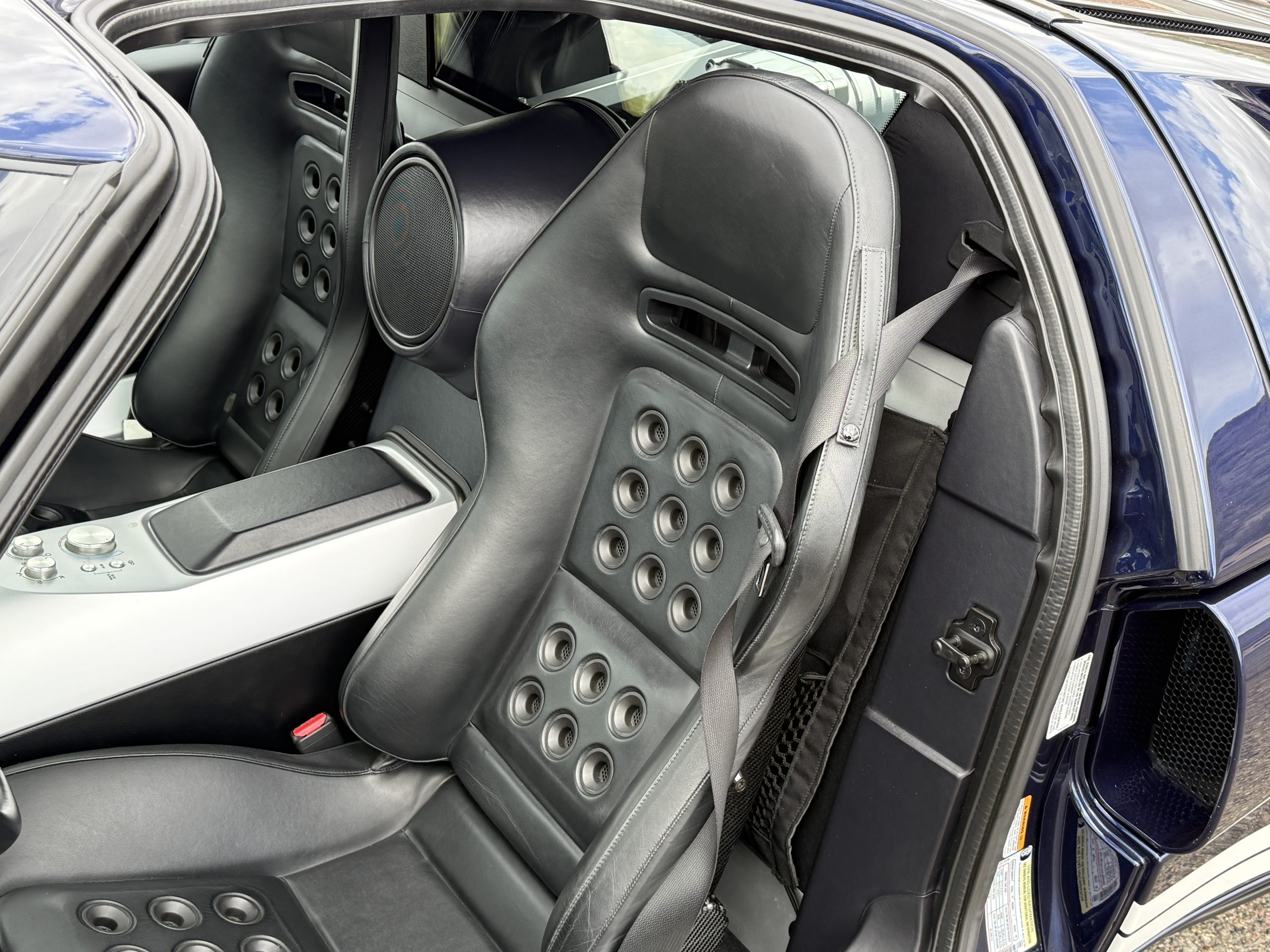 The cockpit is trimmed in Ebony leather, and rubber mats cover bare aluminum floors. Manually adjusted seats were designed by Sparco and feature carbon-fiber shells with GT40-style ventilation grommets and harness slots. The console on the center tunnel houses rotary climate controls, and amenities include a McIntosh CD stereo, air conditioning, remote keyless entry, and push-button ignition.