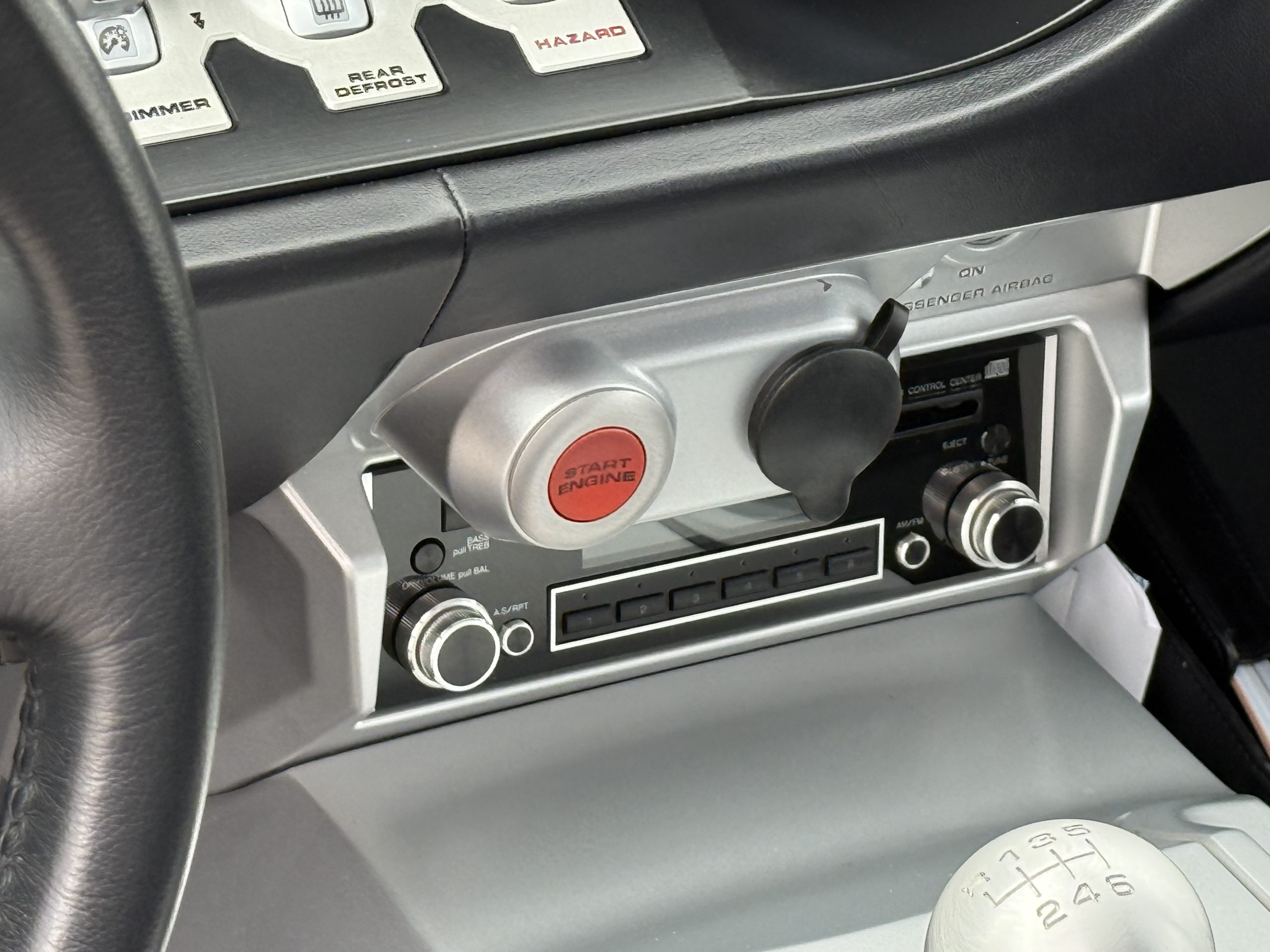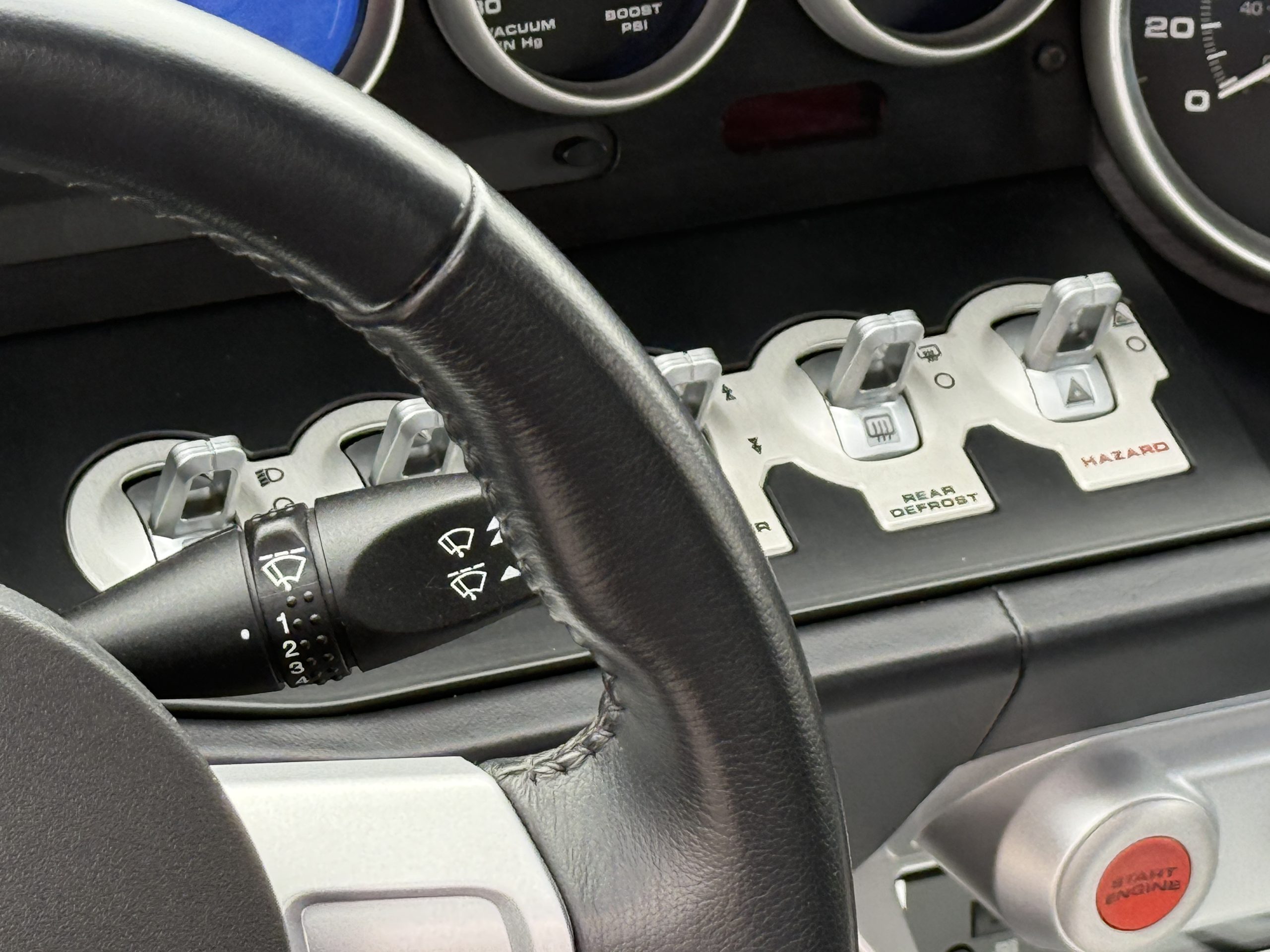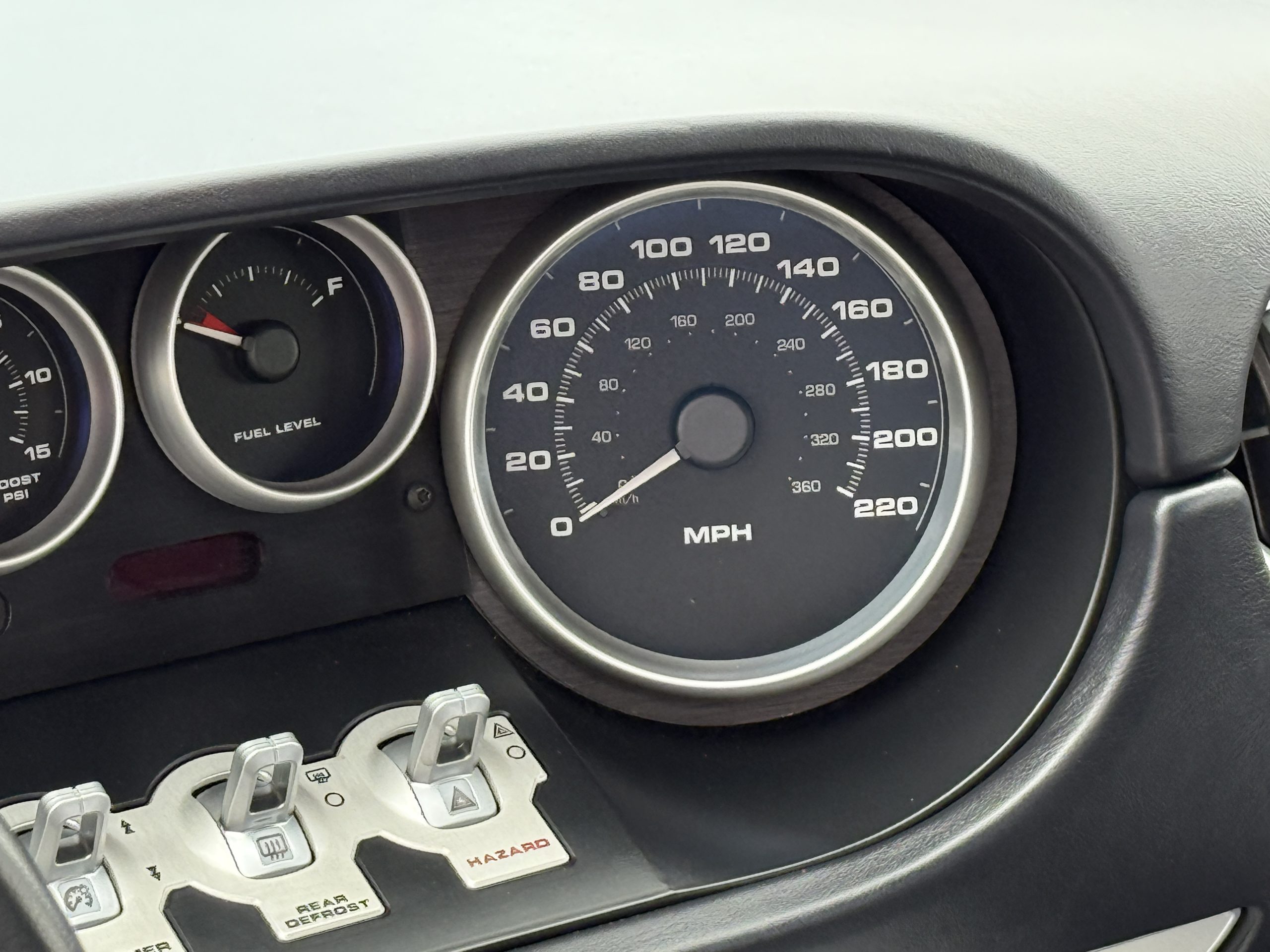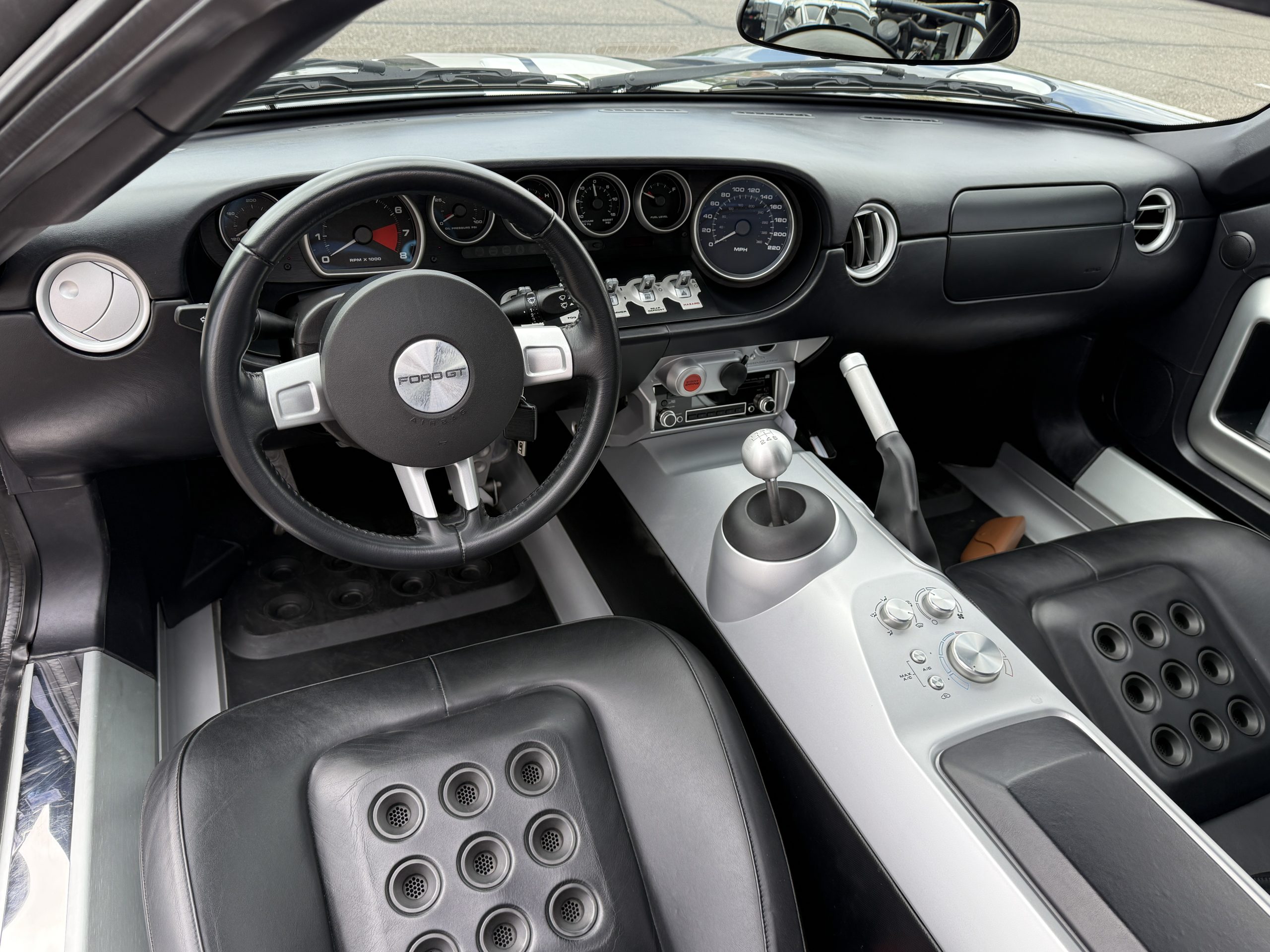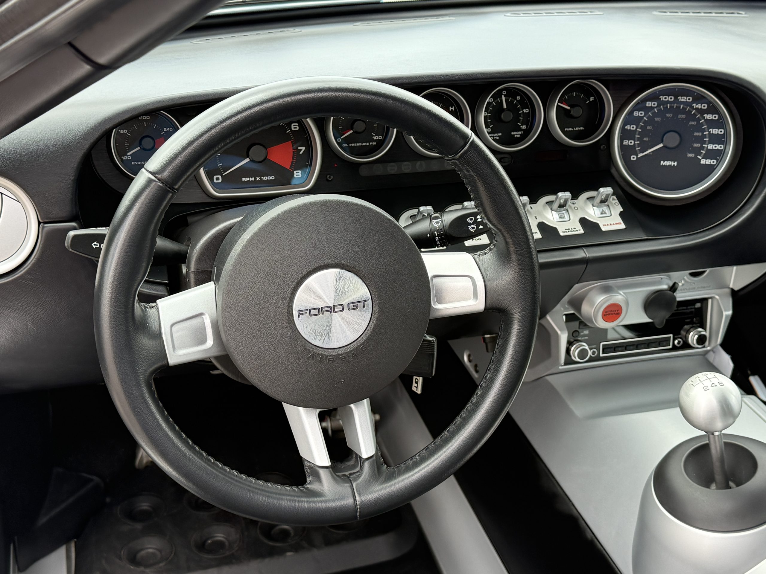 The leather-wrapped steering wheel is affixed to a tilting and telescoping column ahead of the GT40-inspired instrument array consisting of a central tachometer with a 6,500-rpm redline and an offset 220-mph speedometer. Toggle-switch controls are positioned under additional gauges for coolant temperature, oil pressure, voltage, boost, and fuel level. The digital odometer indicates 11k miles.