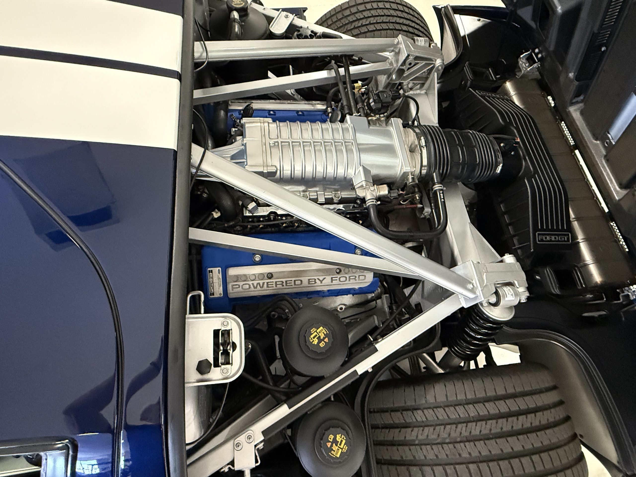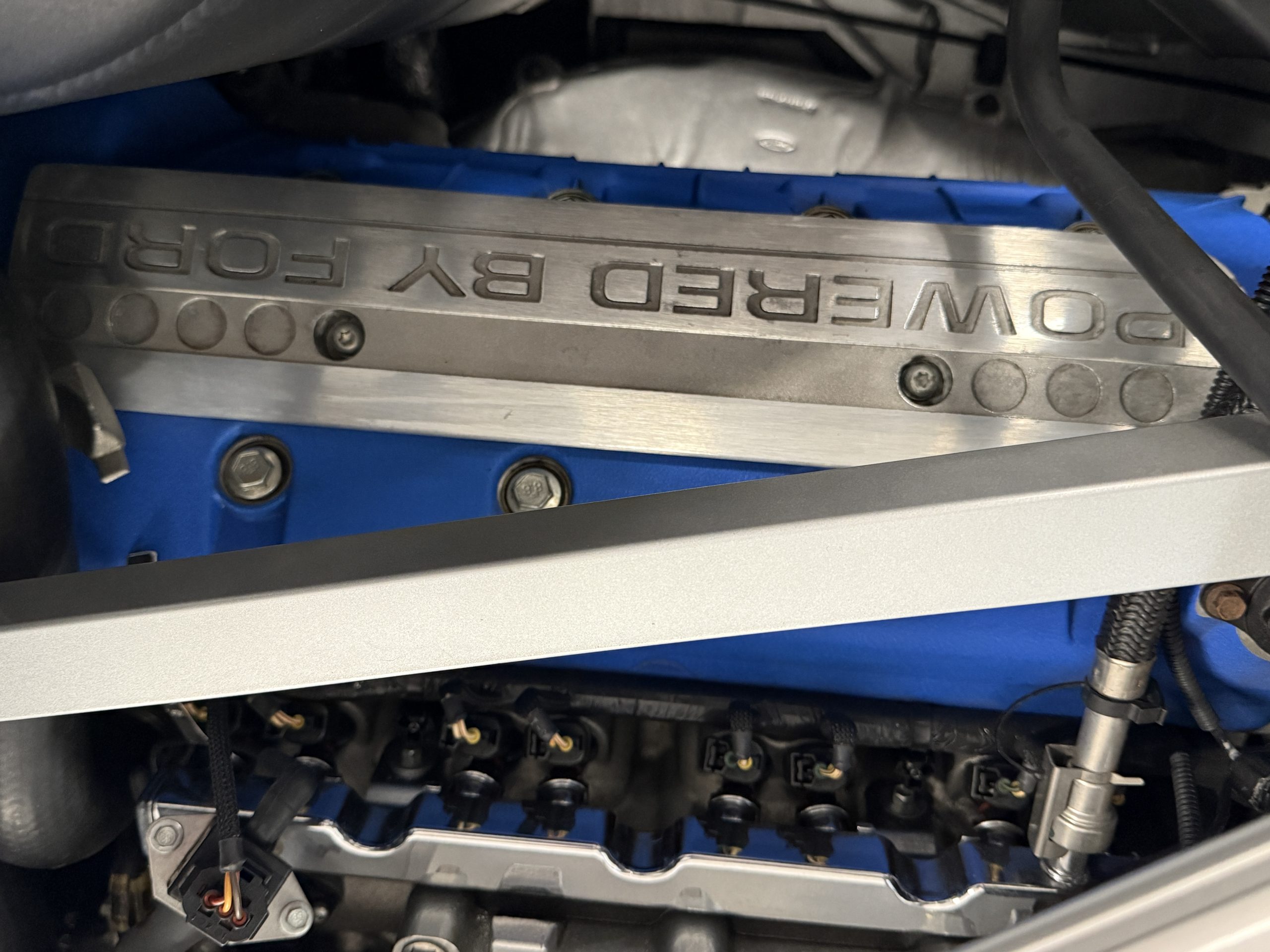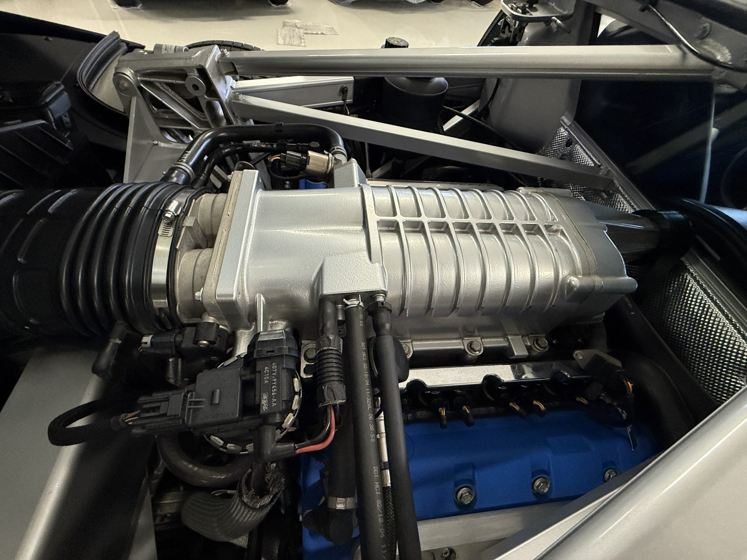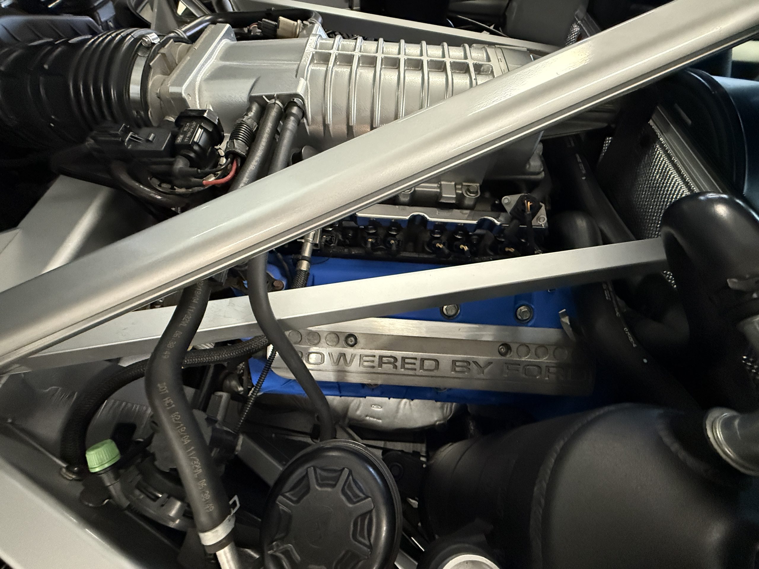 The mid-mounted 5.4-liter DOHC V8 features an aluminum block, cylinder heads, and pistons in addition to a Lysholm screw-type supercharger, a dry-sump lubrication system, and a water-to-air intercooler. Factory-rated output was 550 horsepower and 500 lb-ft of torque, which is sent to the rear wheels through a Ricardo six-speed manual transaxle and a helical limited-slip differential. The battery was replaced in August 2022, and the oil was most recently changed in March 2023.