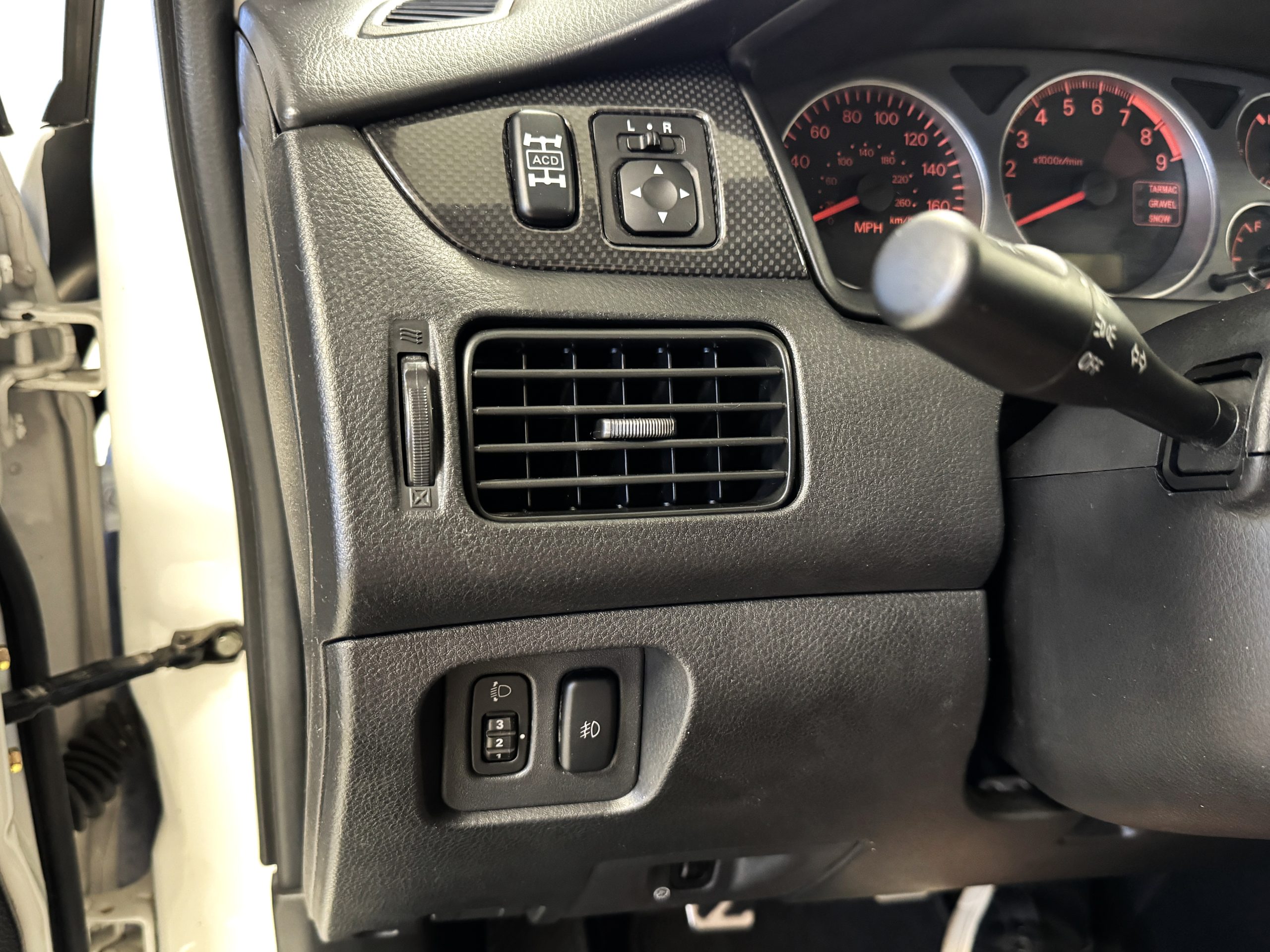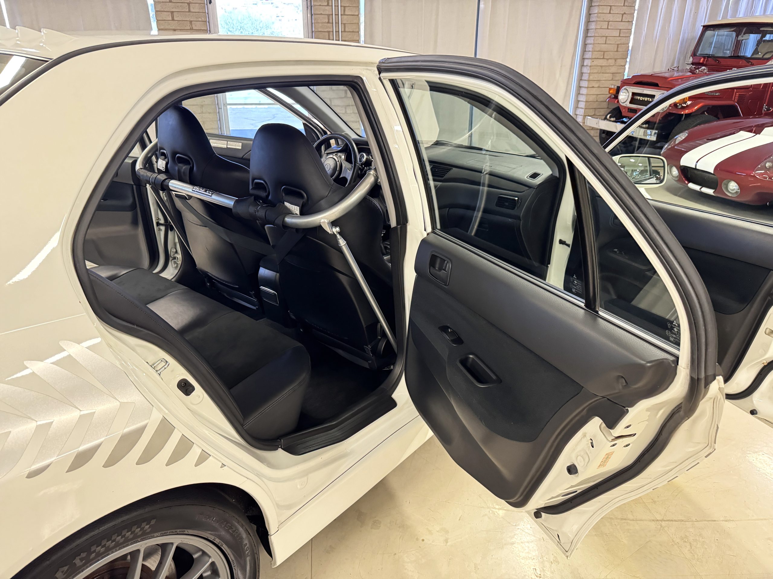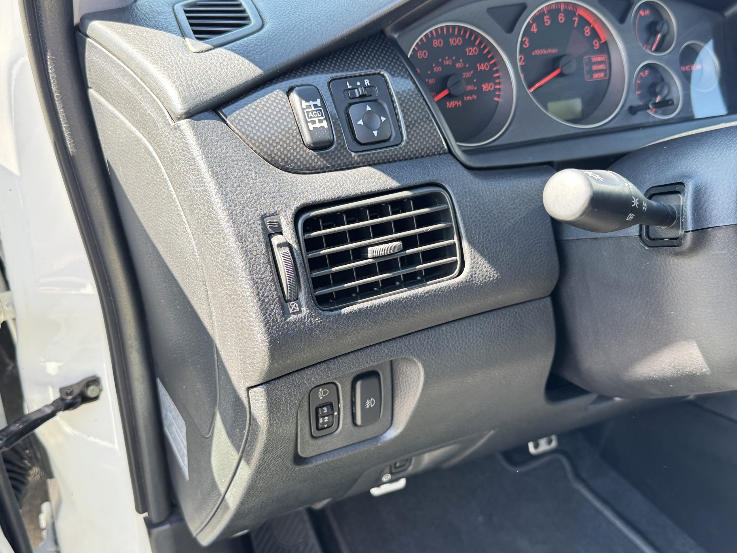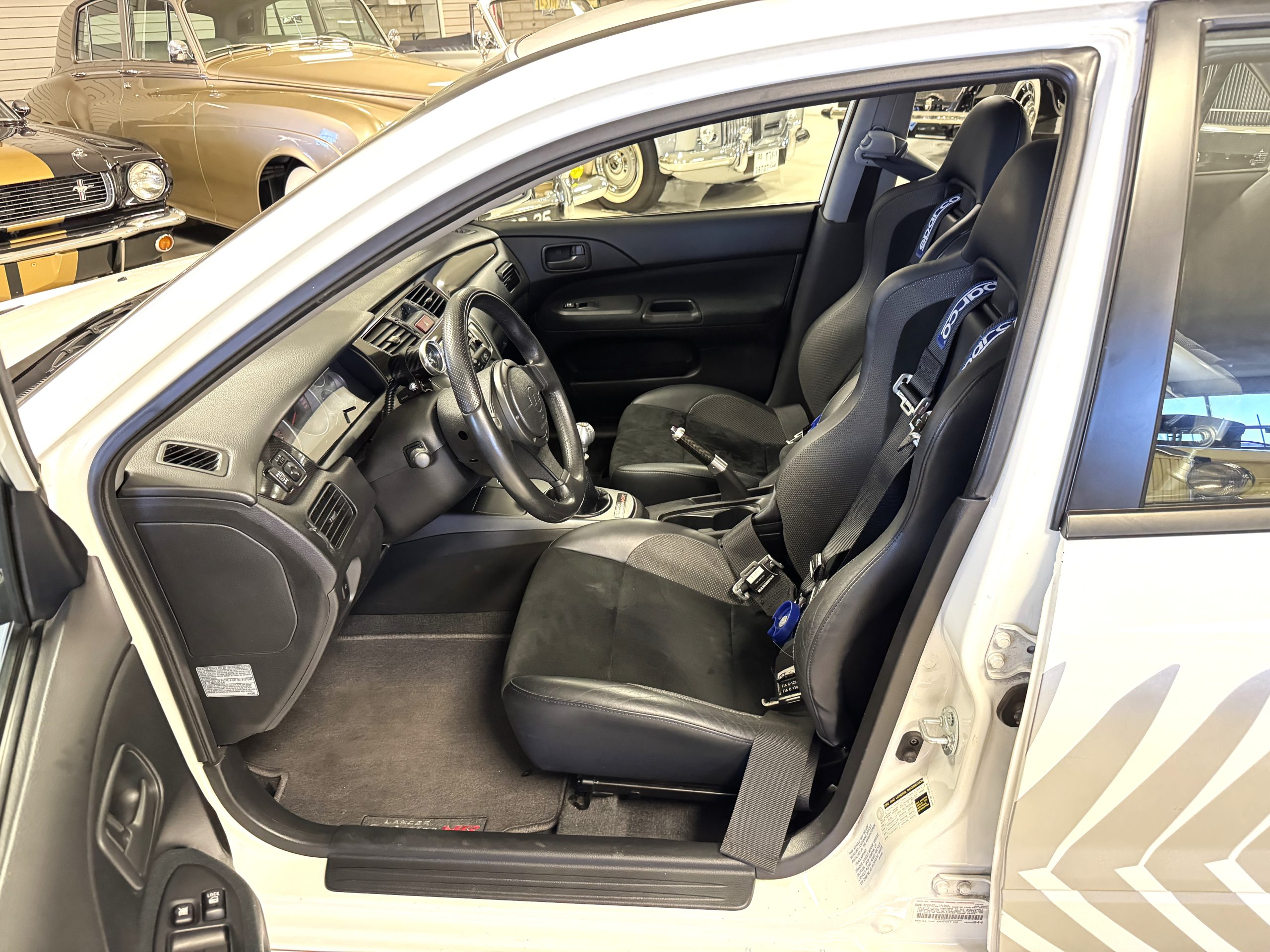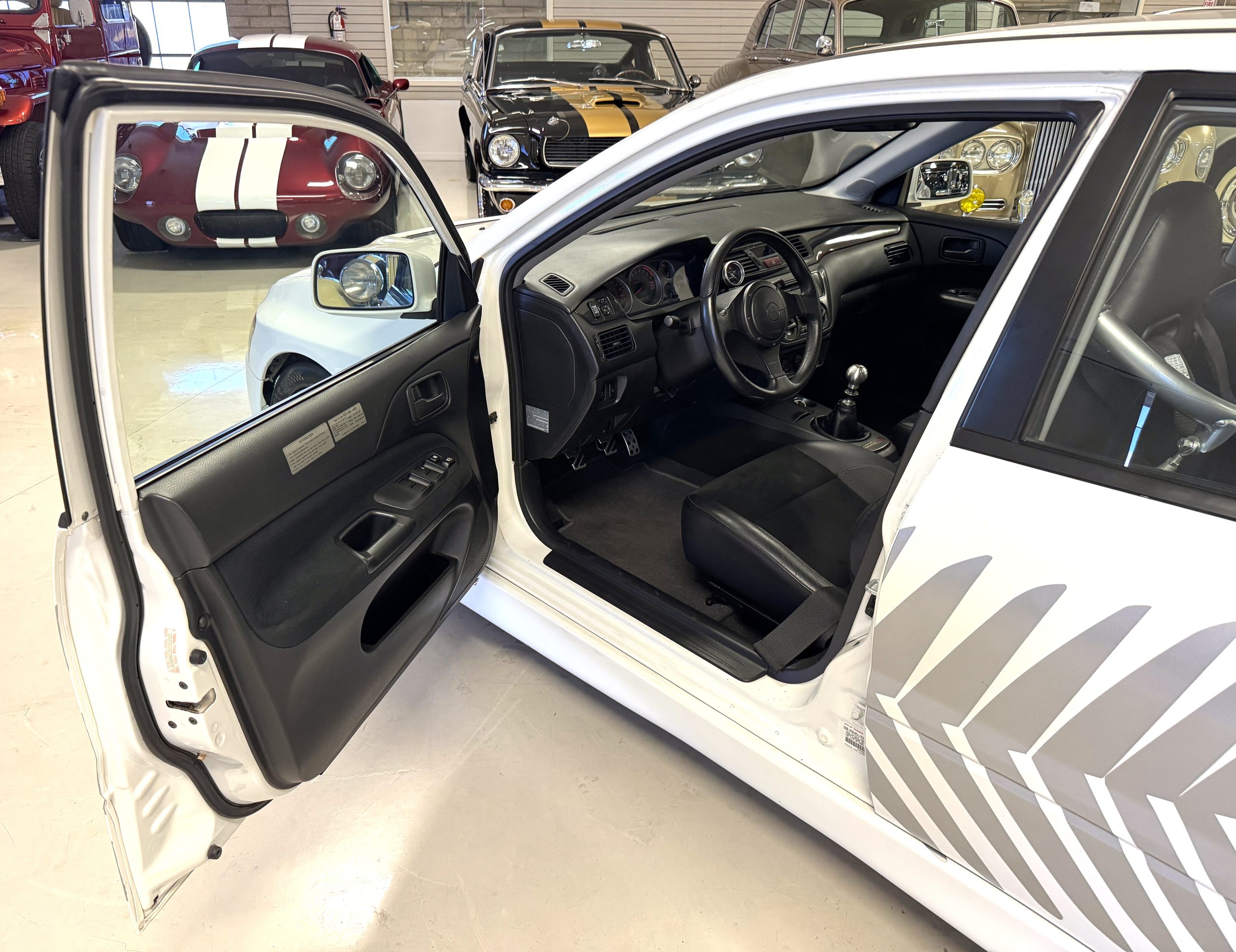 The exterior of the Lancer Evolution remains in its original Wicked White finish, with gray feather pattern racing stripes and a distinctive block shadow “47” accents, presenting in very good overall condition with minimal wear consistent with careful use. The power windows, locks and mirrors with remote keyless entry system add modern usability to this model. Notable enhancements include a carbon fiber front lip, vortex generator, boost gauge kit and zero lift kit, paired with 17-inch BBS forged alloy wheels mounted with fresh tires. The paint, trim, and carbon fiber components are in excellent order, and the car retains its aggressive, purposeful appearance while maintaining roadworthiness.