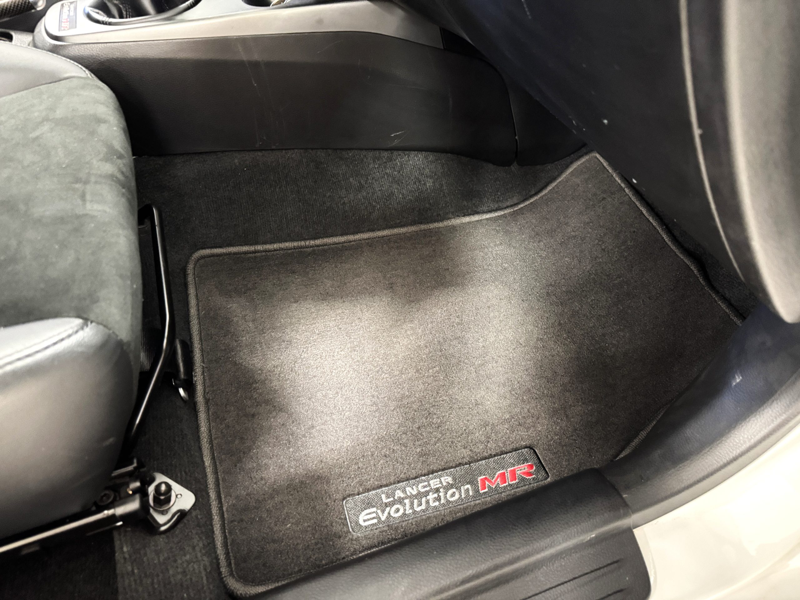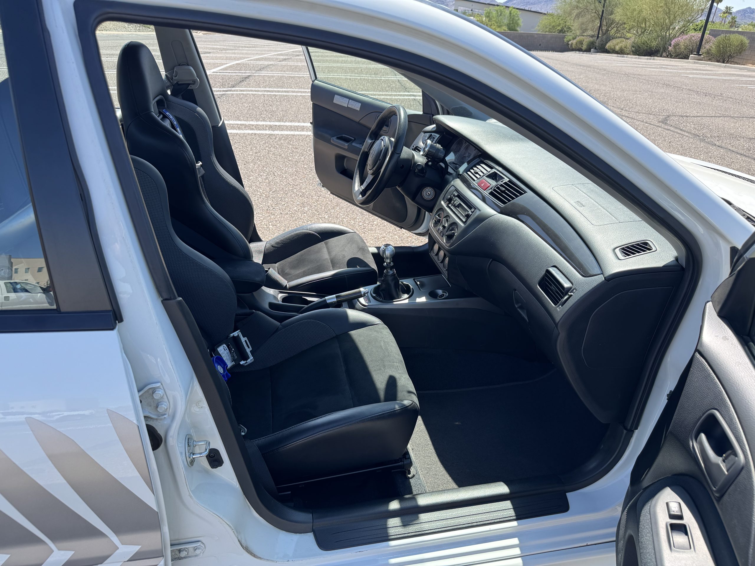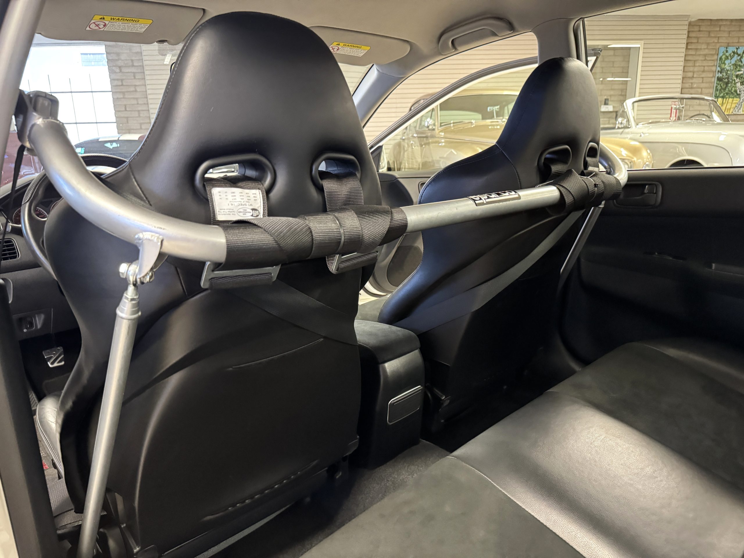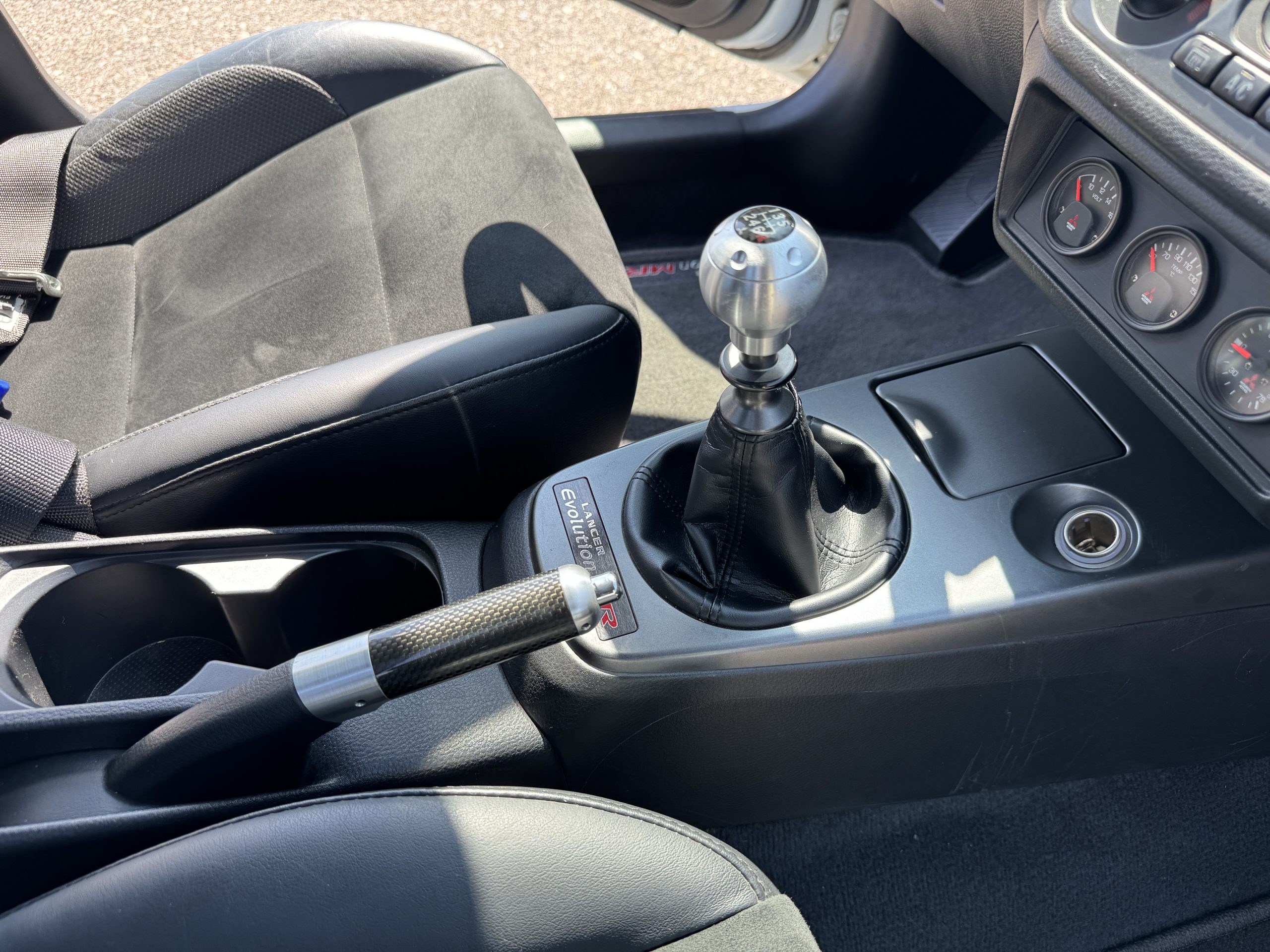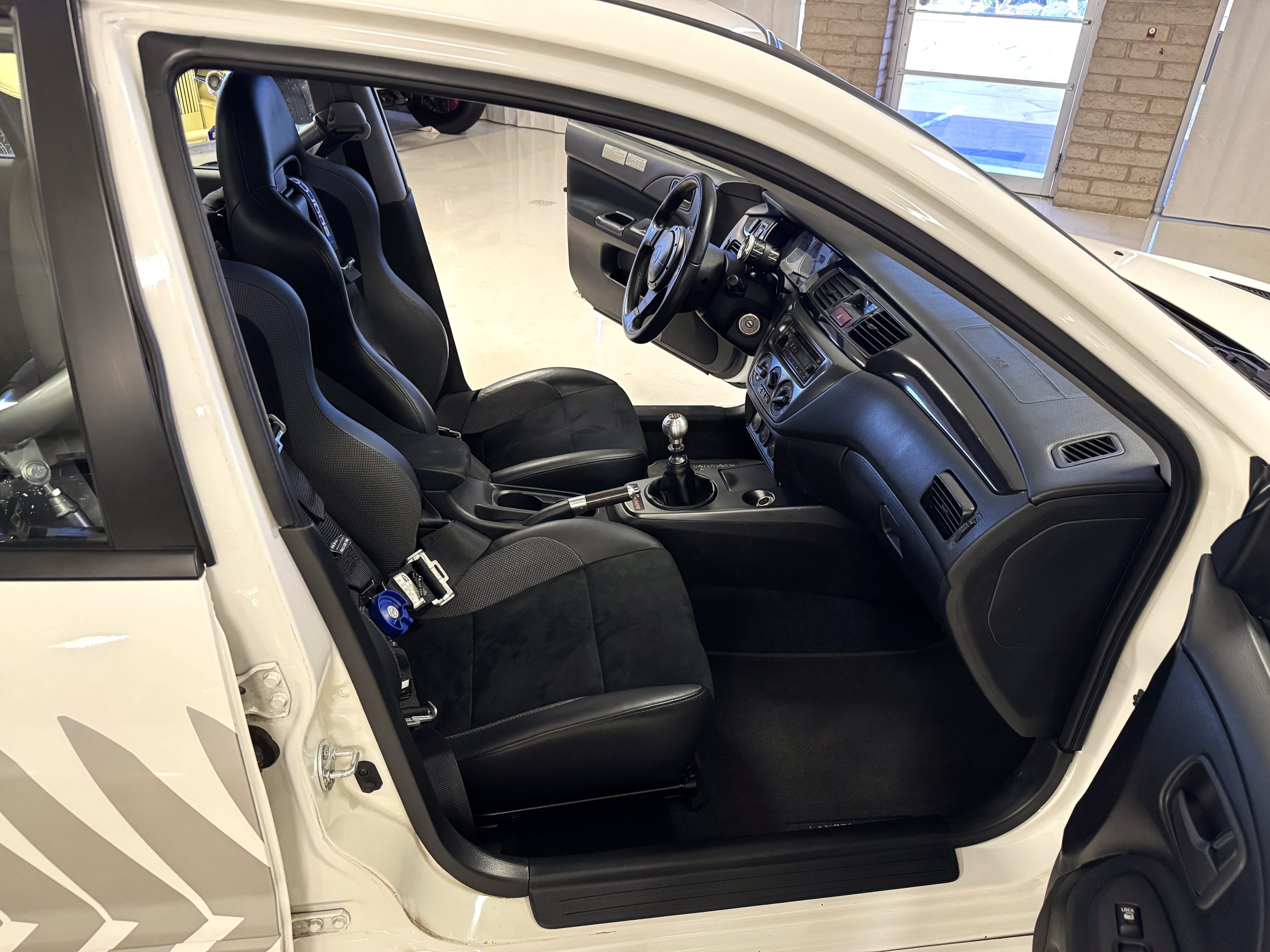 The exterior of the Lancer Evolution remains in its original Wicked White finish, with gray feather pattern racing stripes and a distinctive block shadow “47” accents, presenting in very good overall condition with minimal wear consistent with careful use. The power windows, locks and mirrors with remote keyless entry system add modern usability to this model. Notable enhancements include a carbon fiber front lip, vortex generator, boost gauge kit and zero lift kit, paired with 17-inch BBS forged alloy wheels mounted with fresh tires. The paint, trim, and carbon fiber components are in excellent order, and the car retains its aggressive, purposeful appearance while maintaining roadworthiness.
