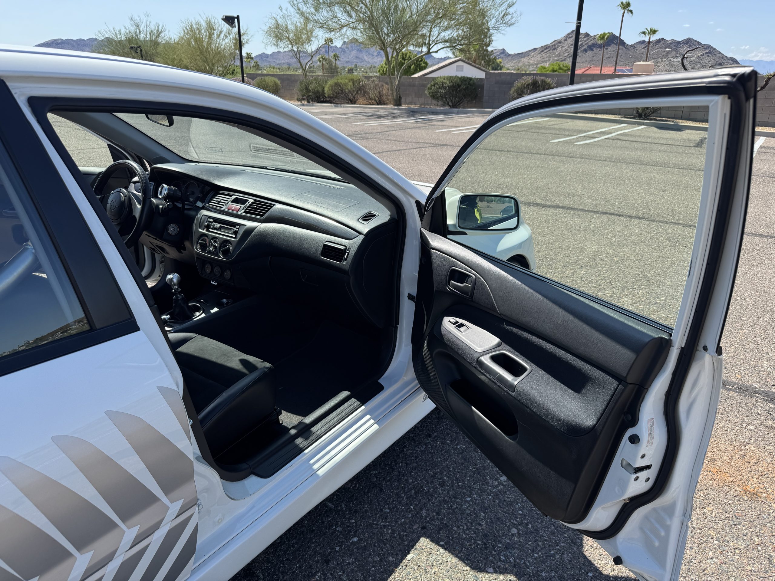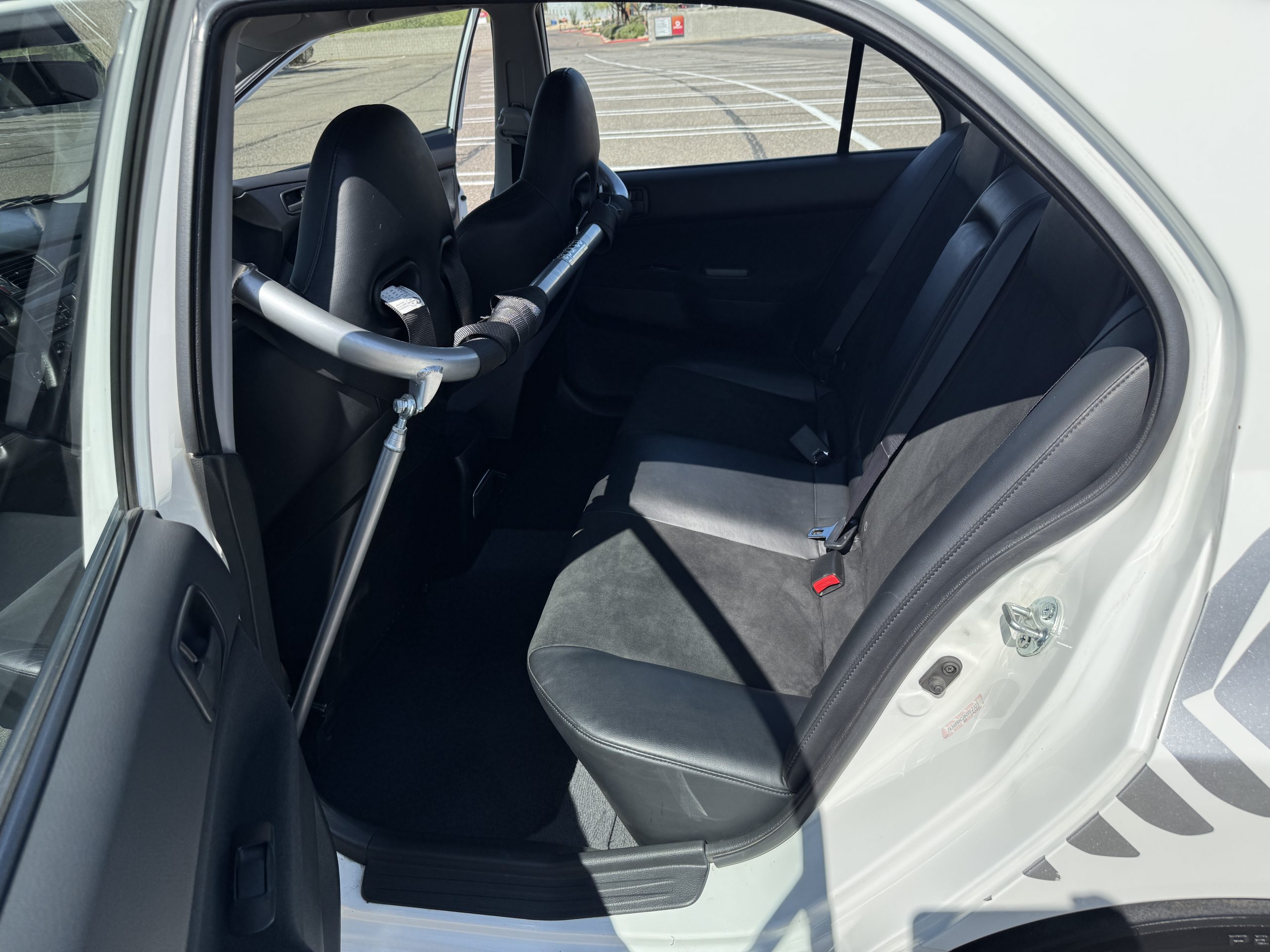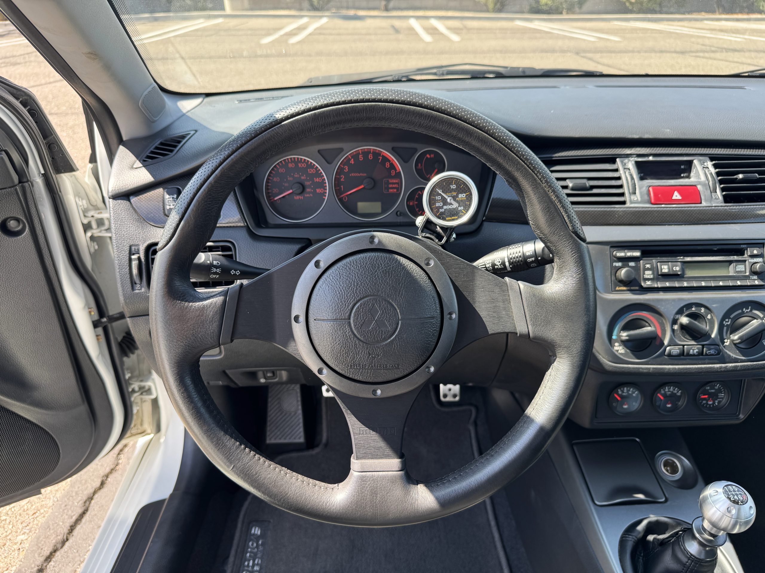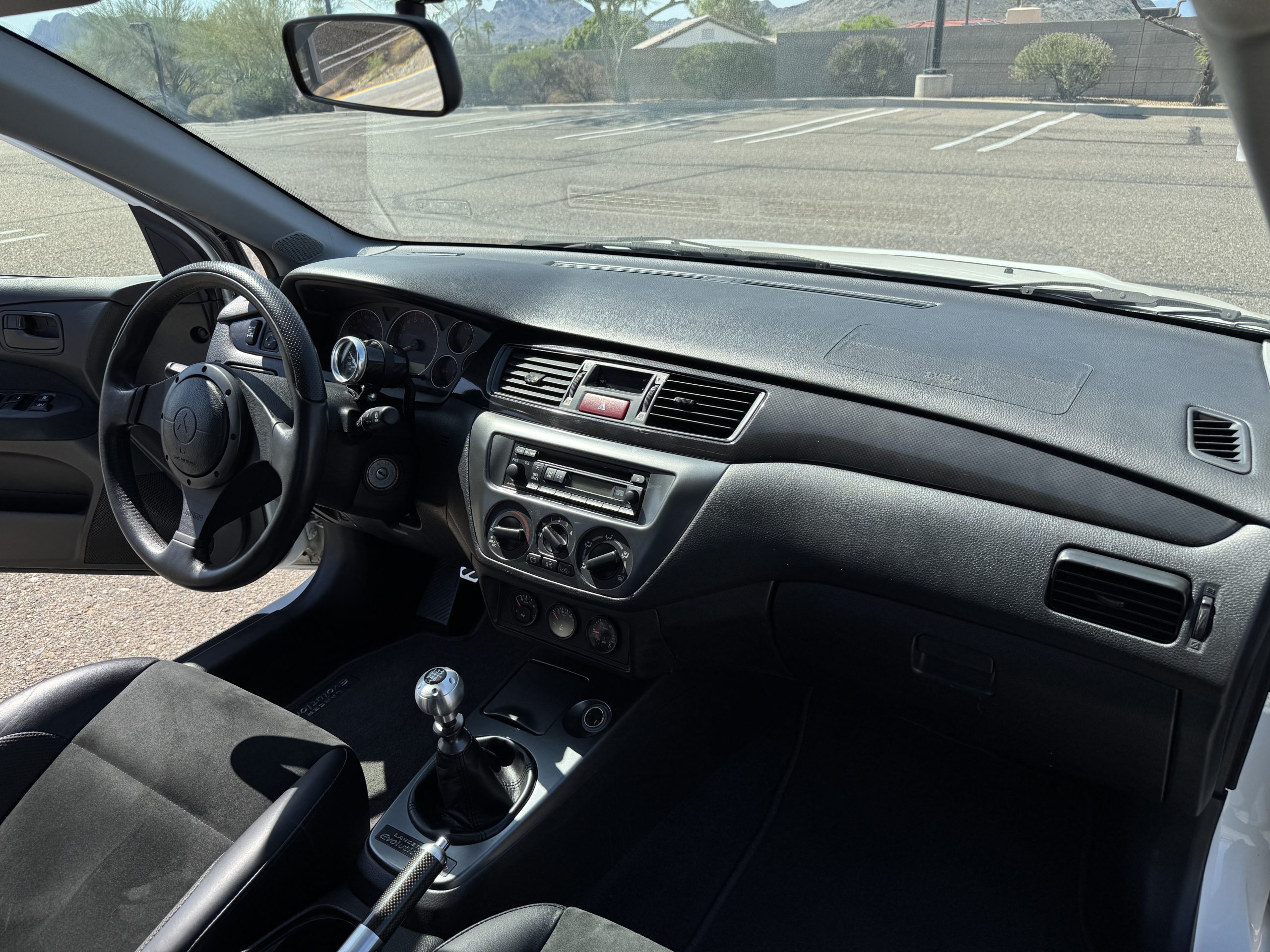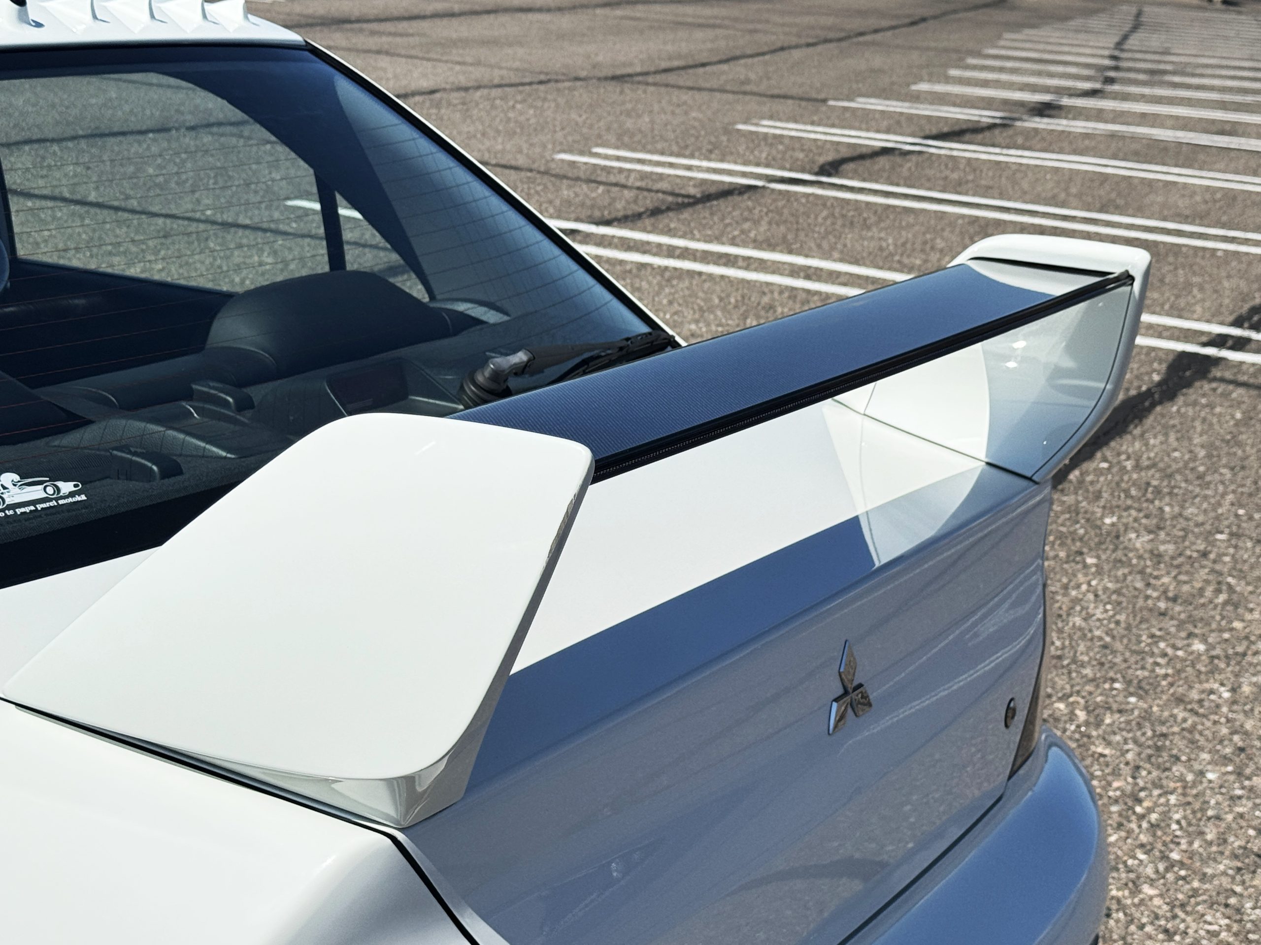 The exterior of the Lancer Evolution remains in its original Wicked White finish, with gray feather pattern racing stripes and a distinctive block shadow “47” accents, presenting in very good overall condition with minimal wear consistent with careful use. The power windows, locks and mirrors with remote keyless entry system add modern usability to this model. Notable enhancements include a carbon fiber front lip, vortex generator, boost gauge kit and zero lift kit, paired with 17-inch BBS forged alloy wheels mounted with fresh tires. The paint, trim, and carbon fiber components are in excellent order, and the car retains its aggressive, purposeful appearance while maintaining roadworthiness.